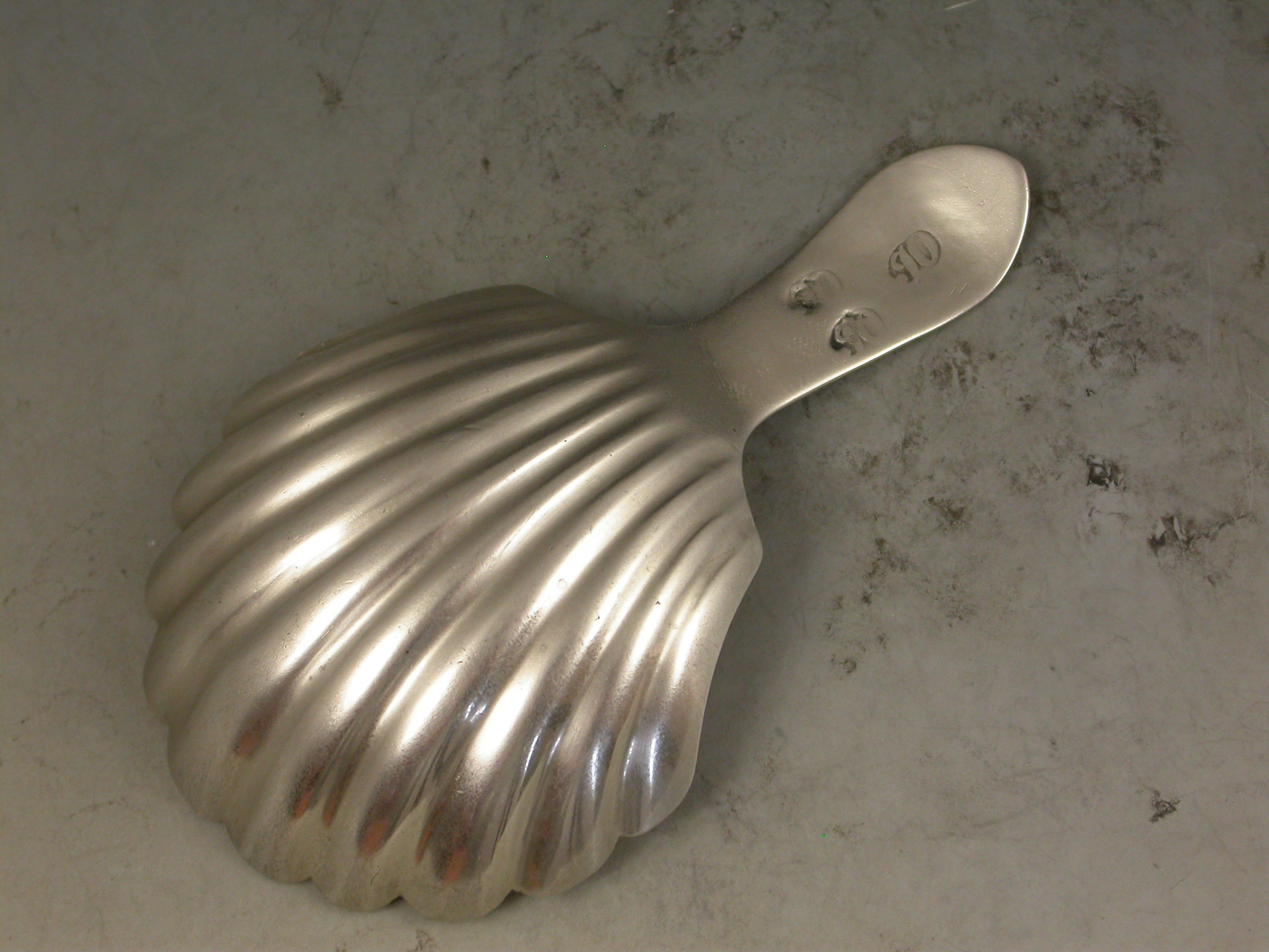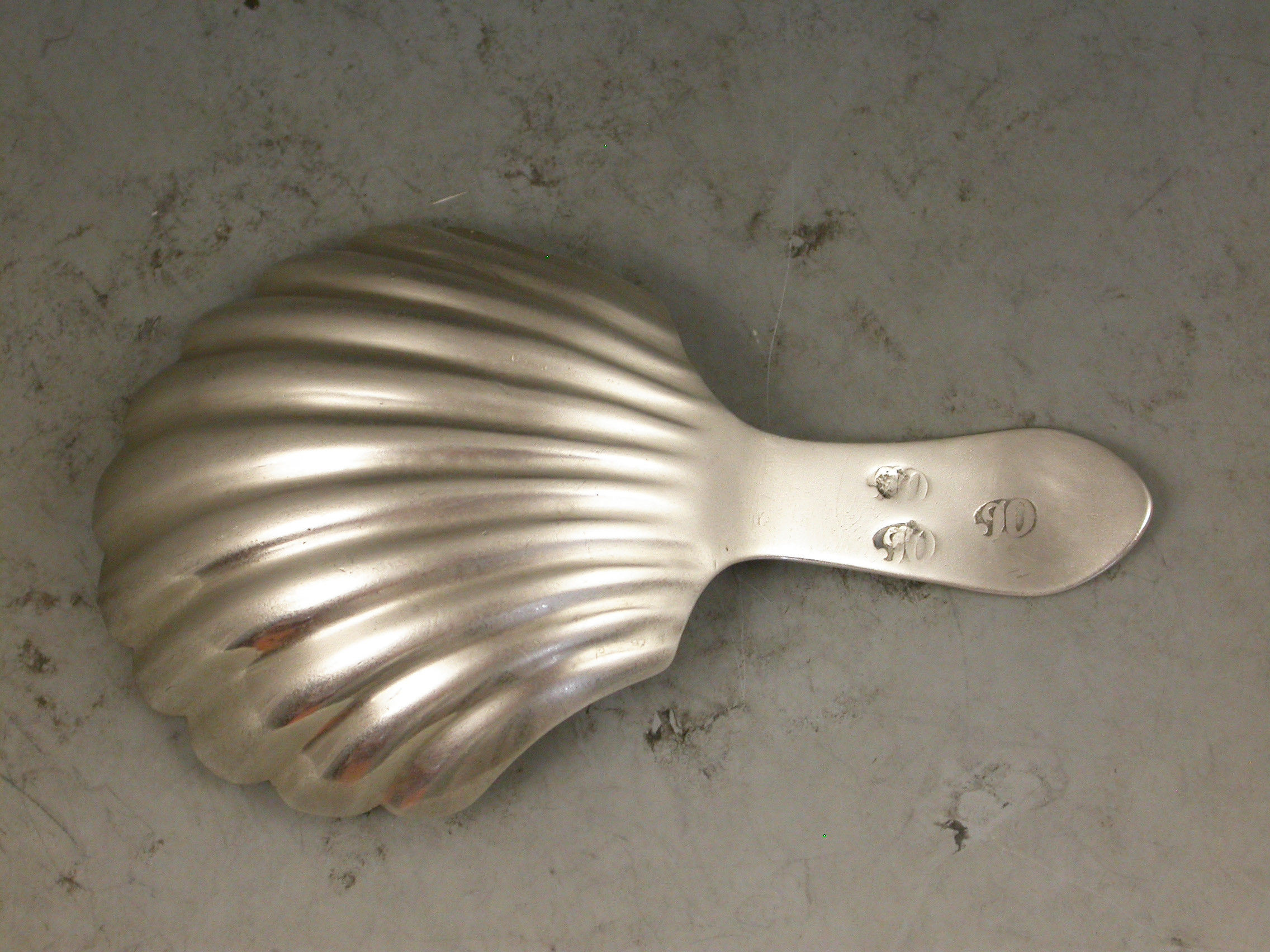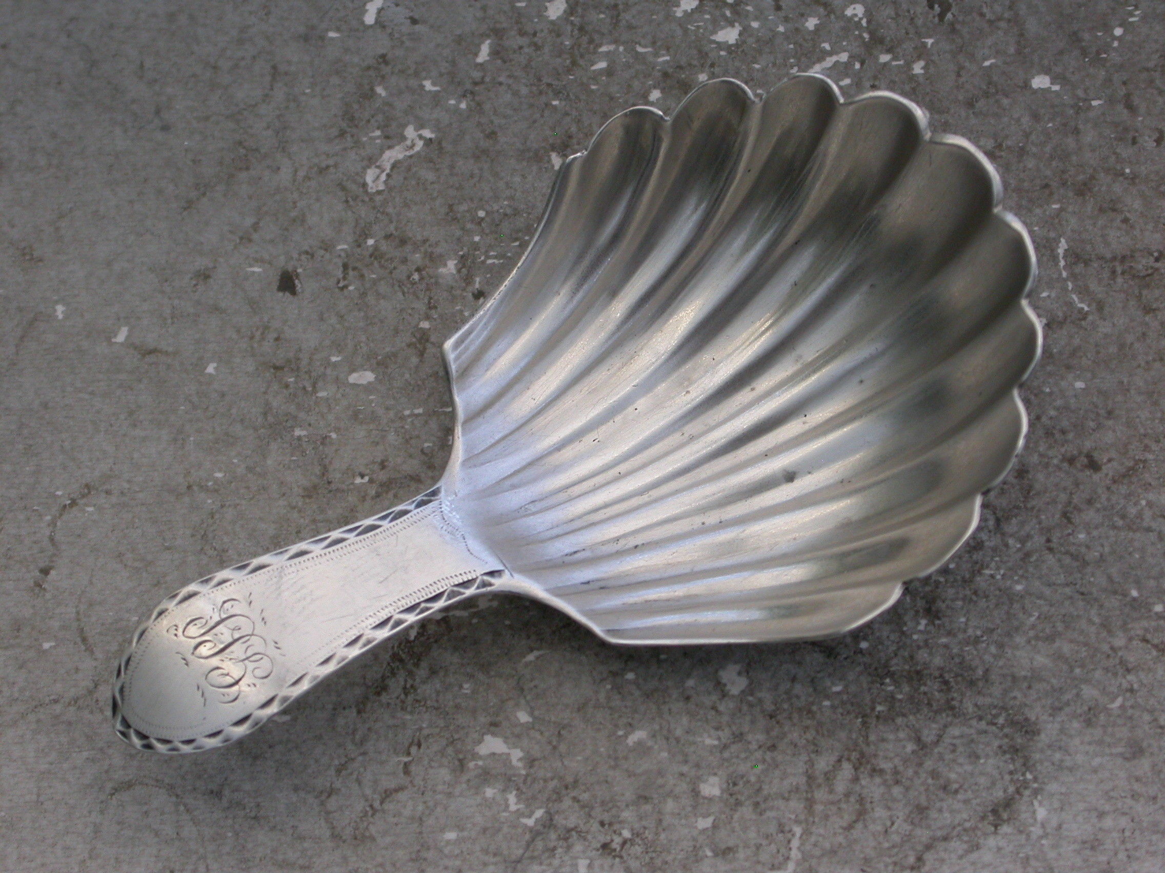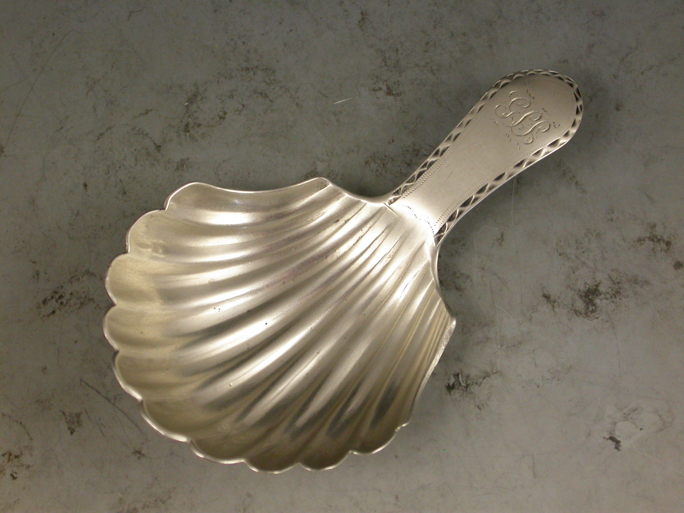 A rare George III Scottish Provincial silver Caddy Spoon with a large fluted scallop shell bowl and bright-cut engraved Celtic point type handle engraved with initials.
