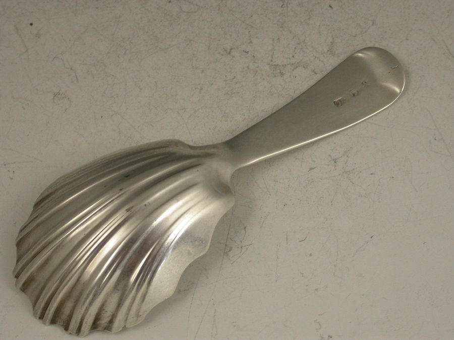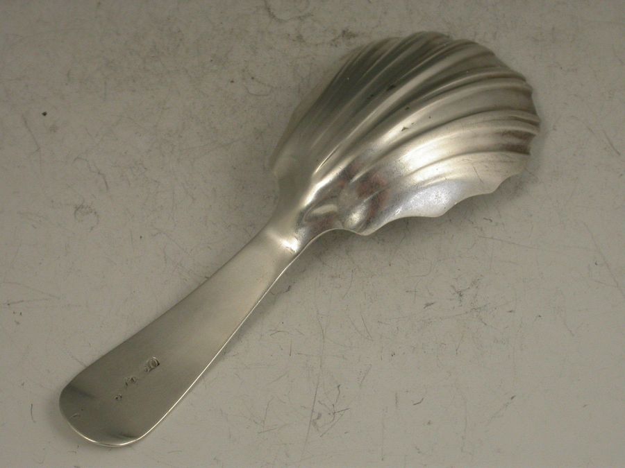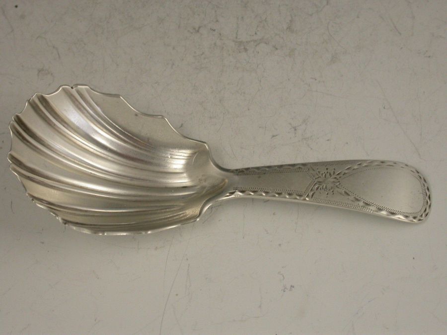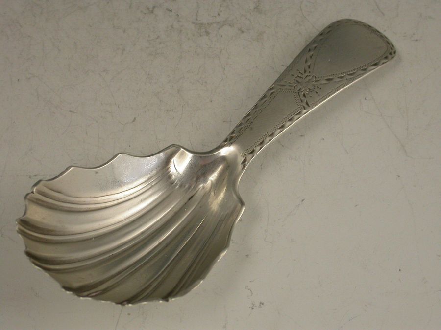 A rare George III Scottish Provincial silver Caddy Spoon with bright cut engraved Old English type handle and fluted shell shaped bowl.