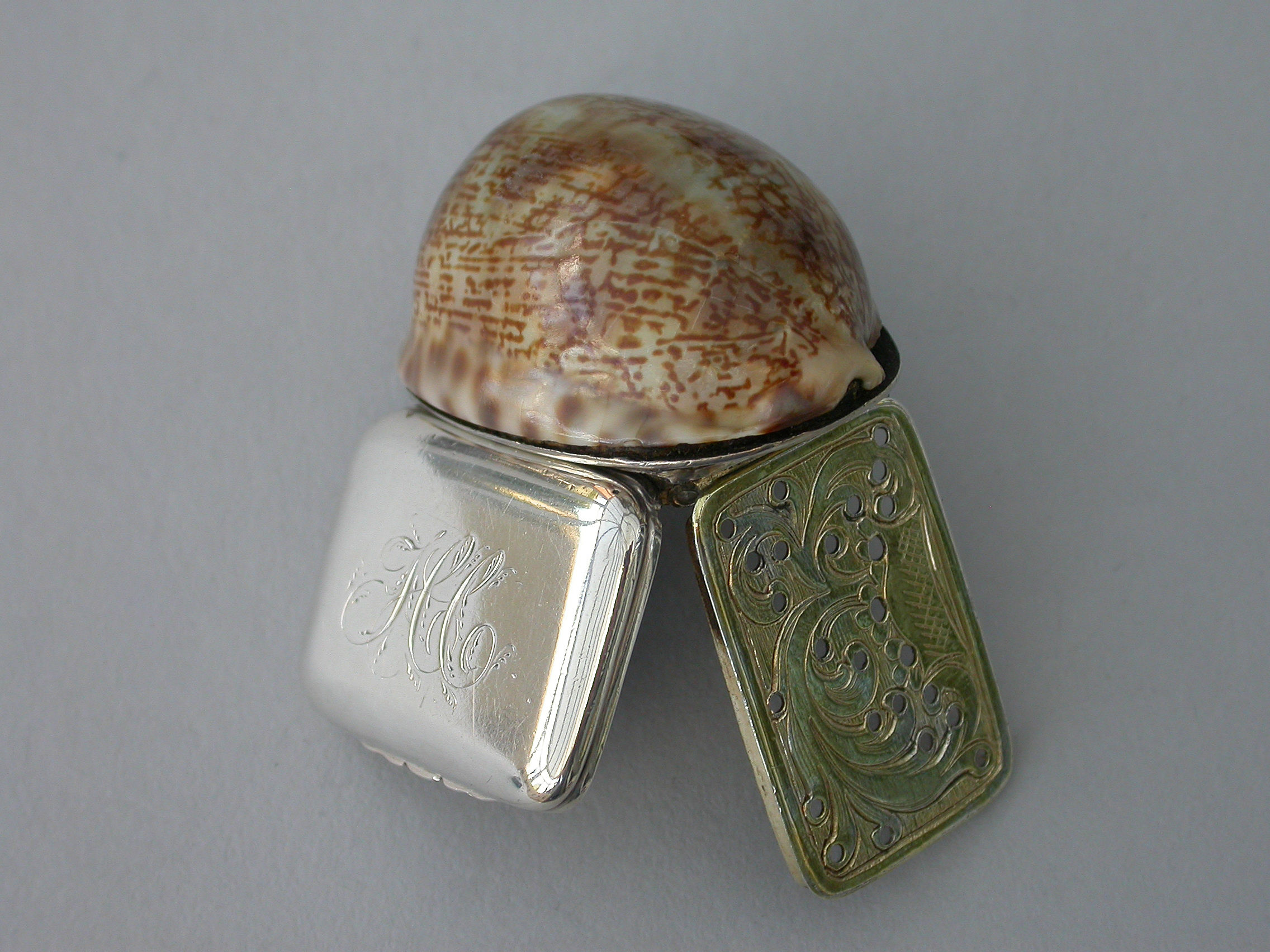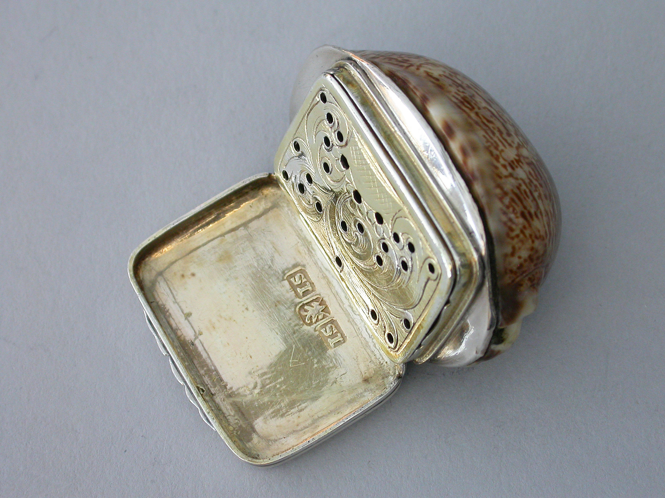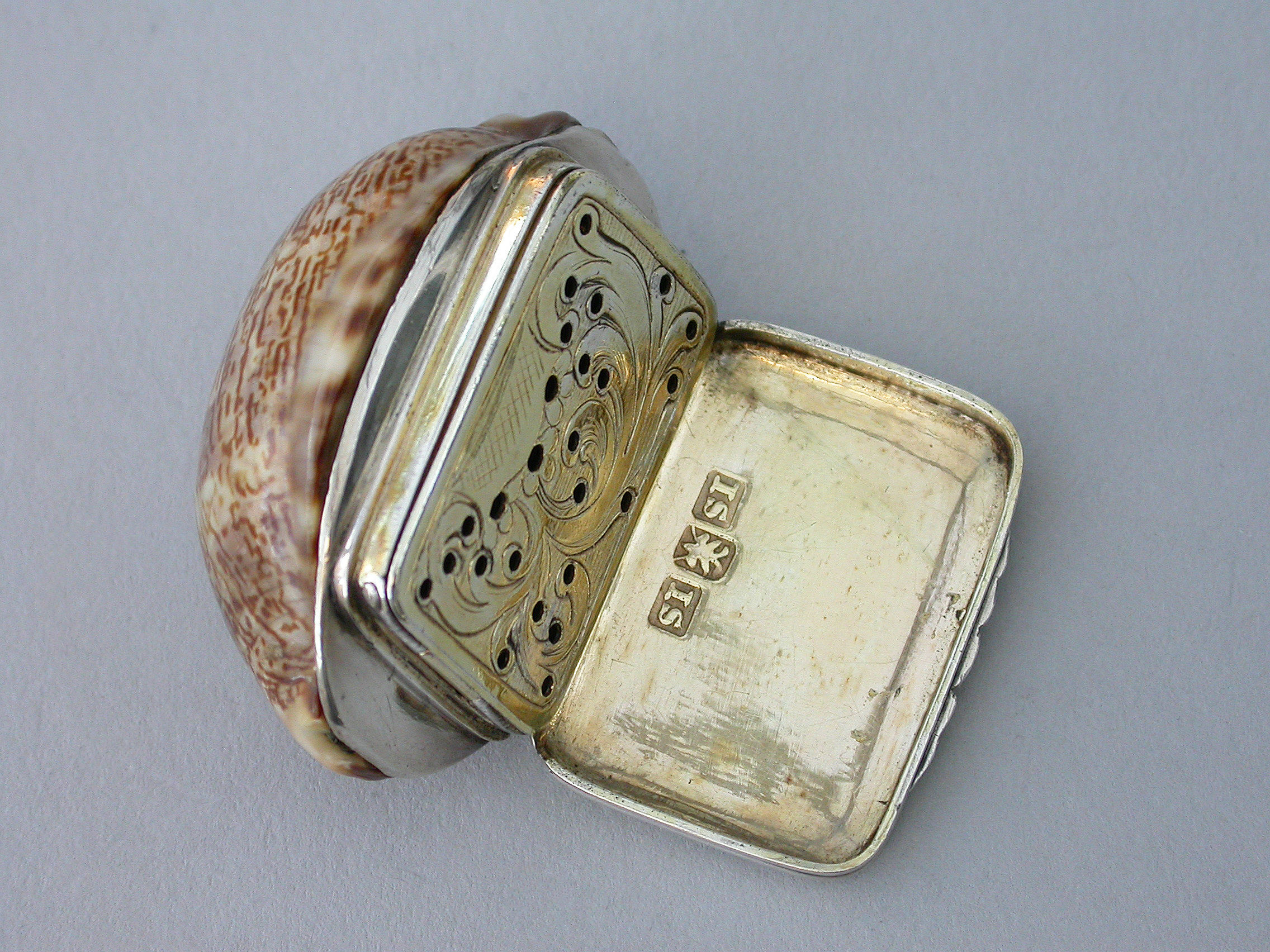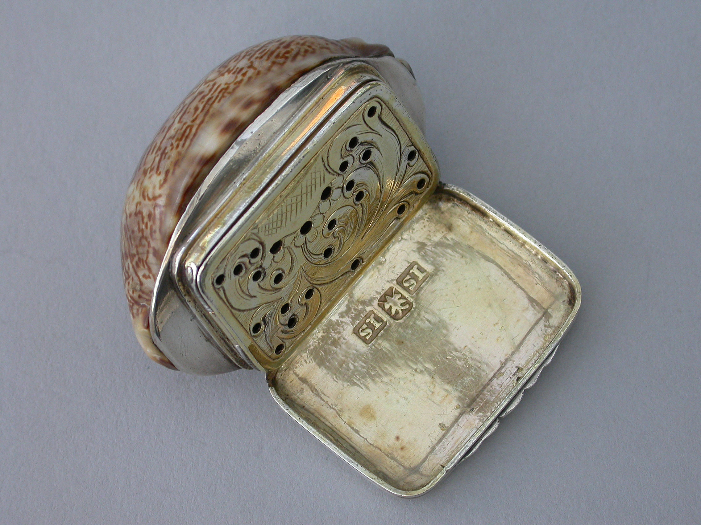 An extremely rare George III Scottish Provincial silver mounted cowrie shell Vinaigrette, the plain silver lid engraved with contemporary script initials, the silver gilt interior with plainly pierced and foliate engraved grille.