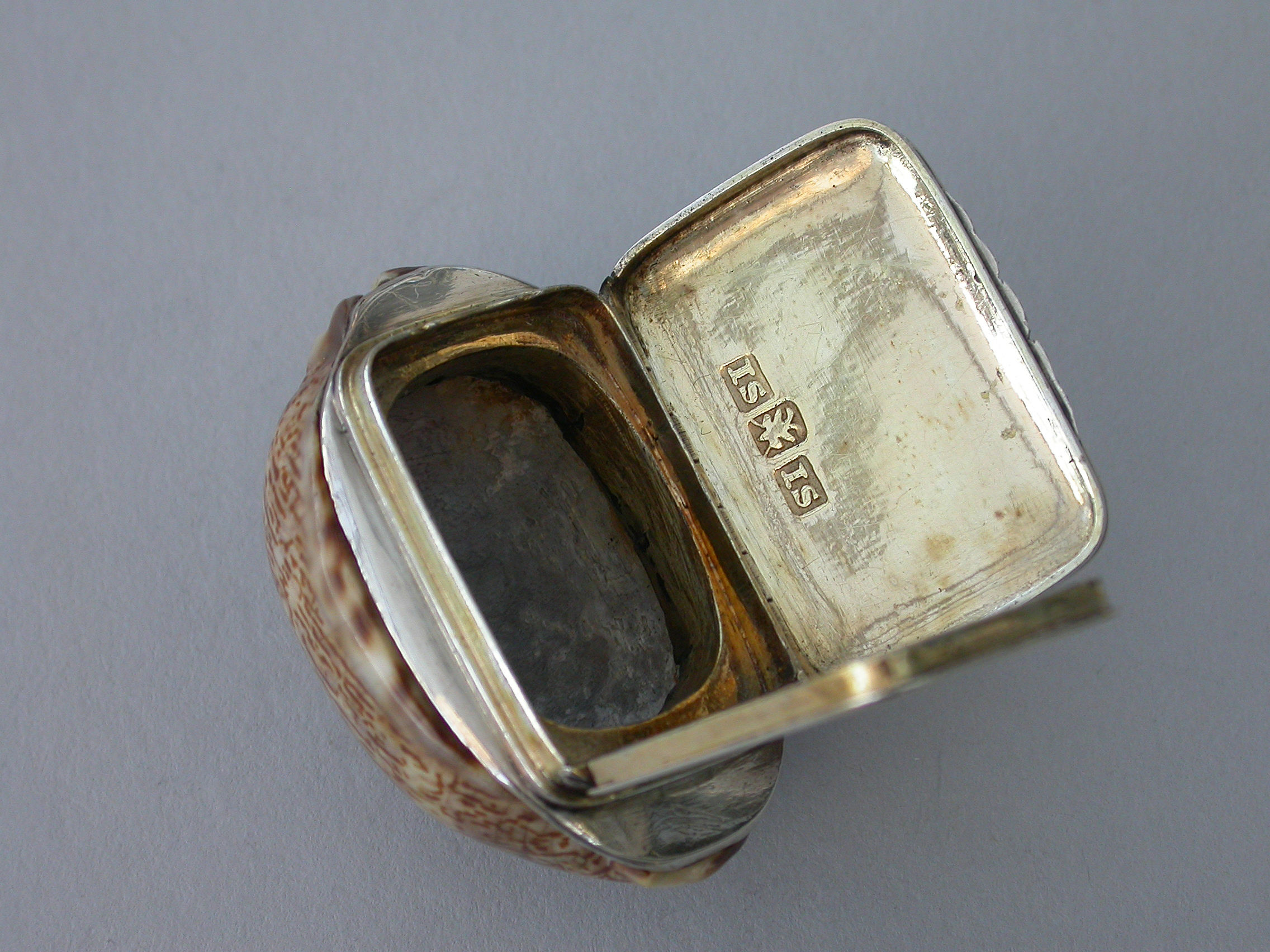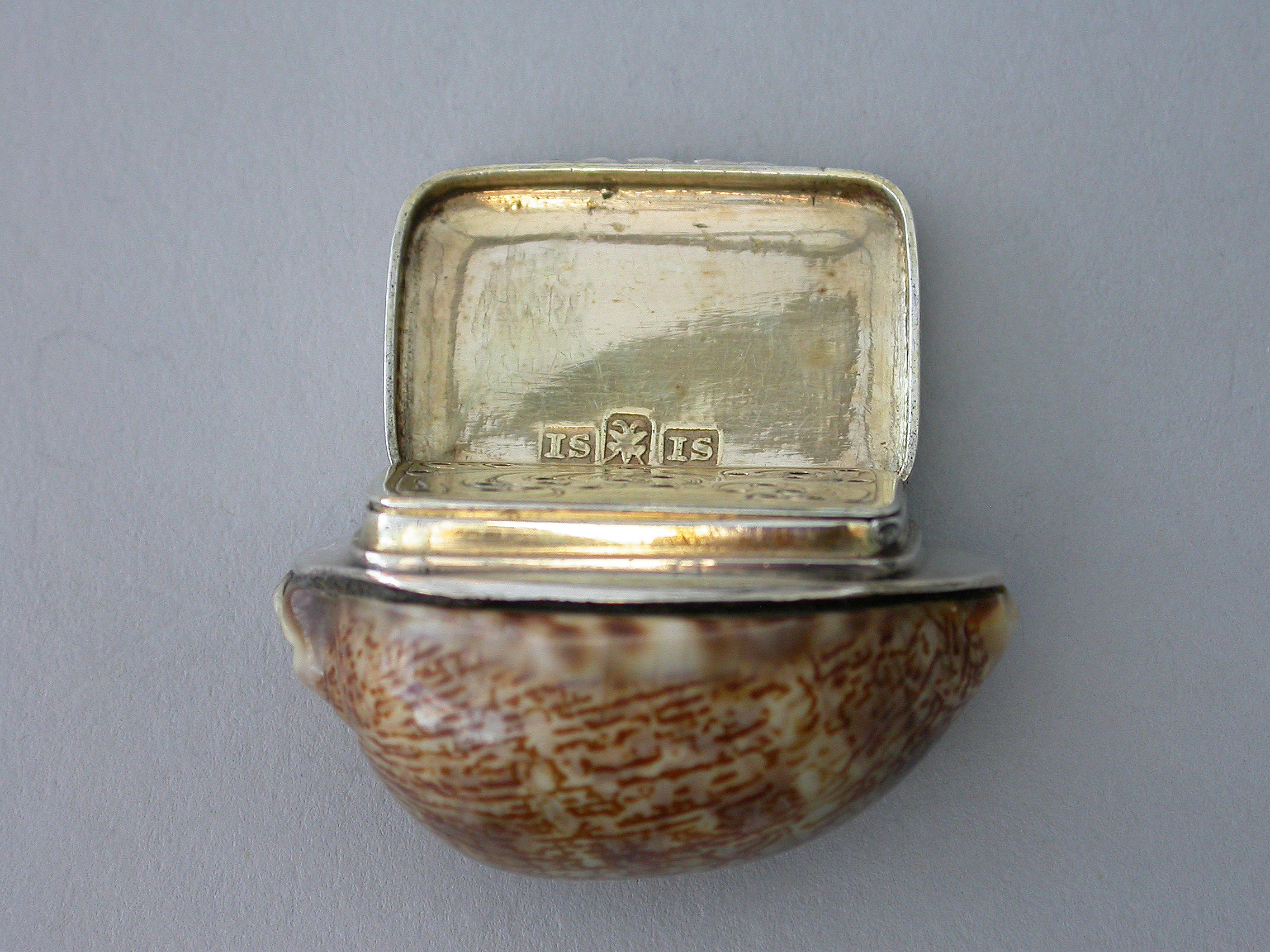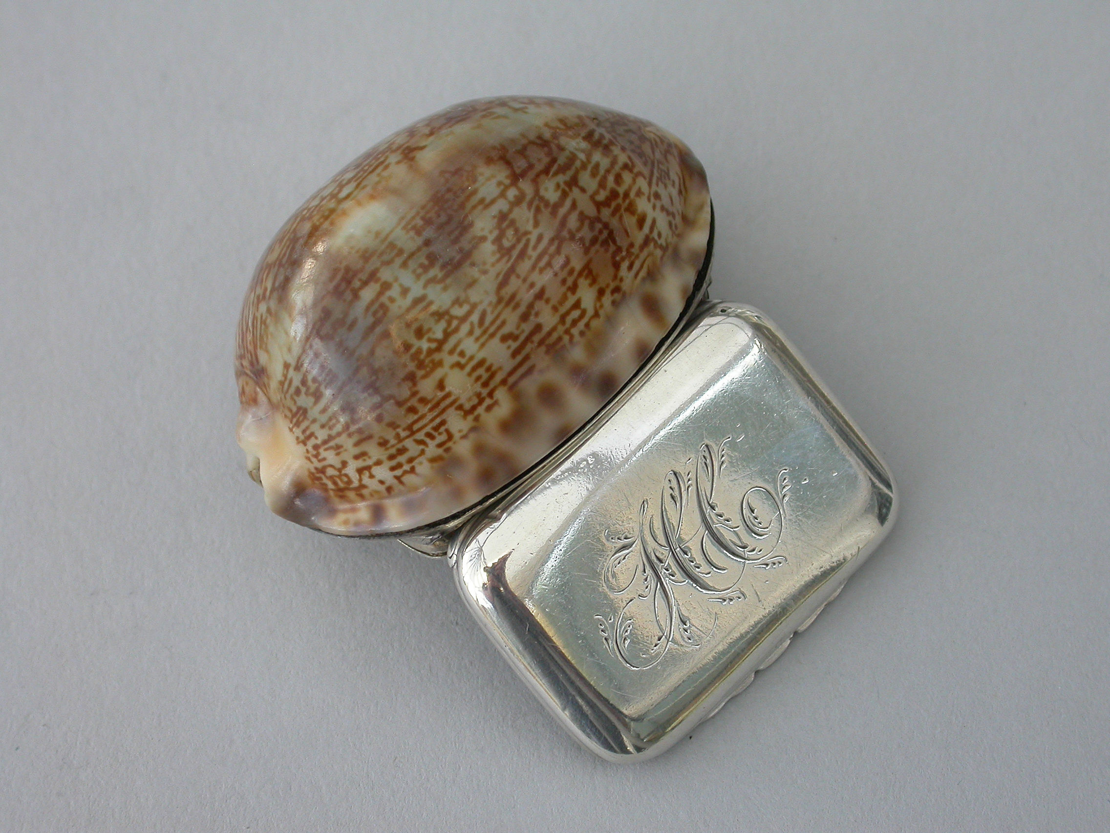 An extremely rare George III Scottish Provincial silver mounted cowrie shell Vinaigrette, the plain silver lid engraved with contemporary script initials, the silver gilt interior with plainly pierced and foliate engraved grille.
