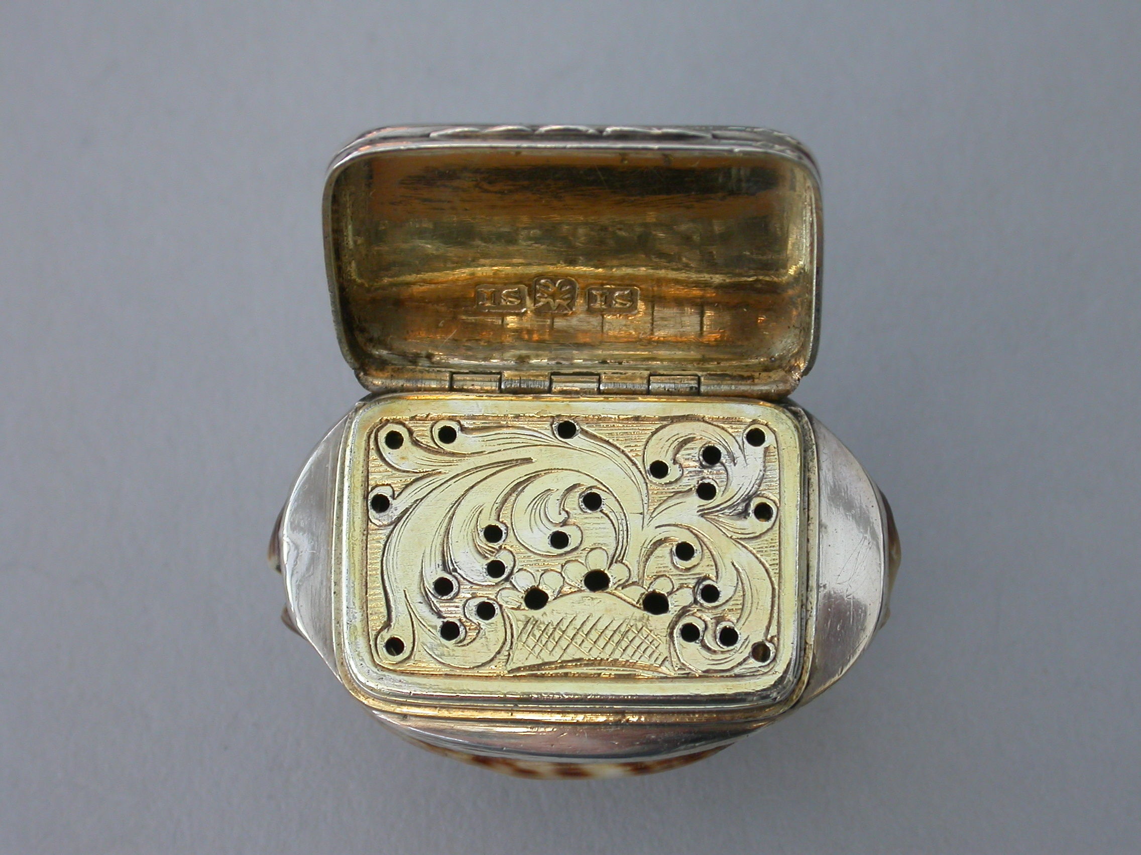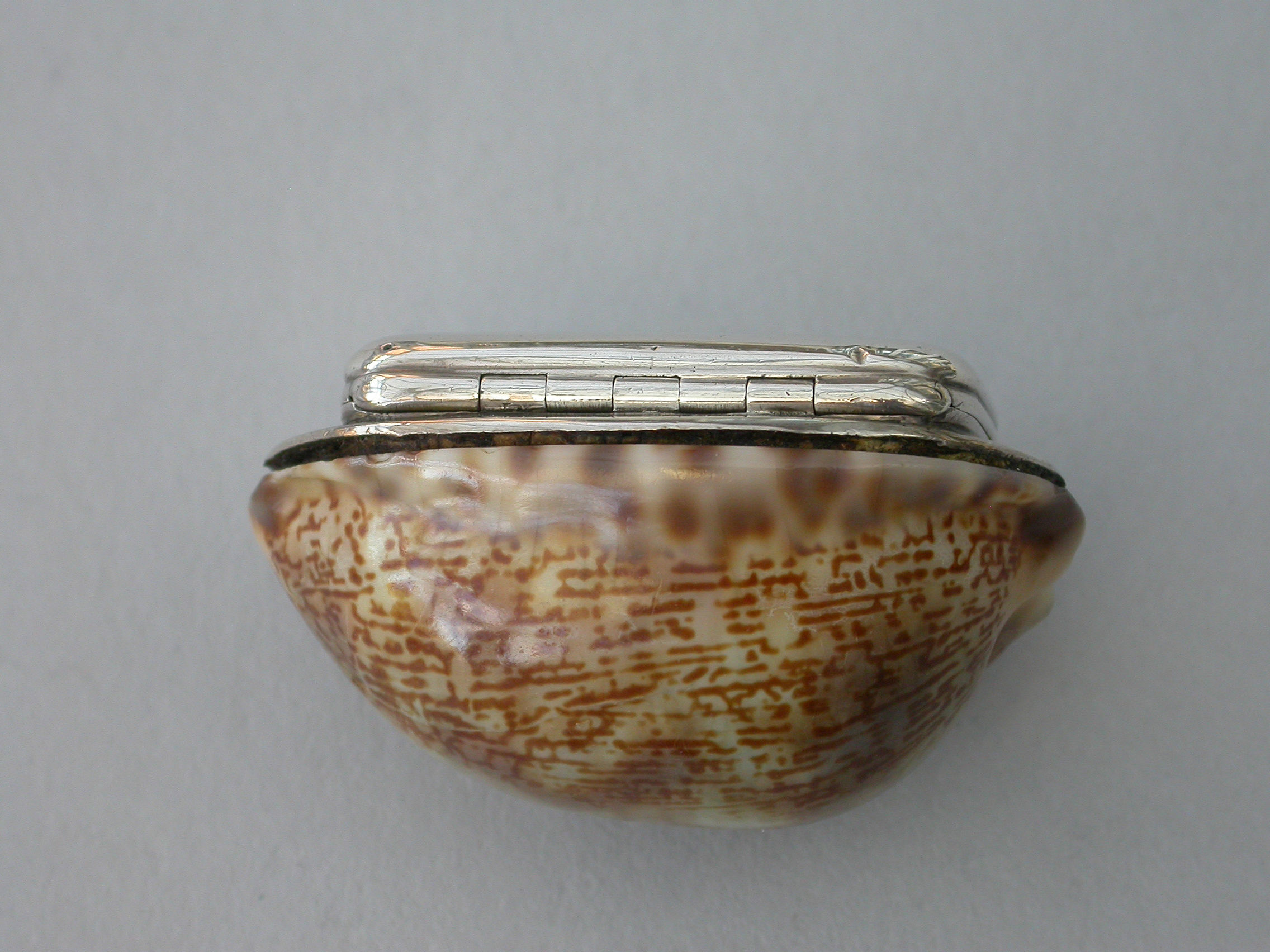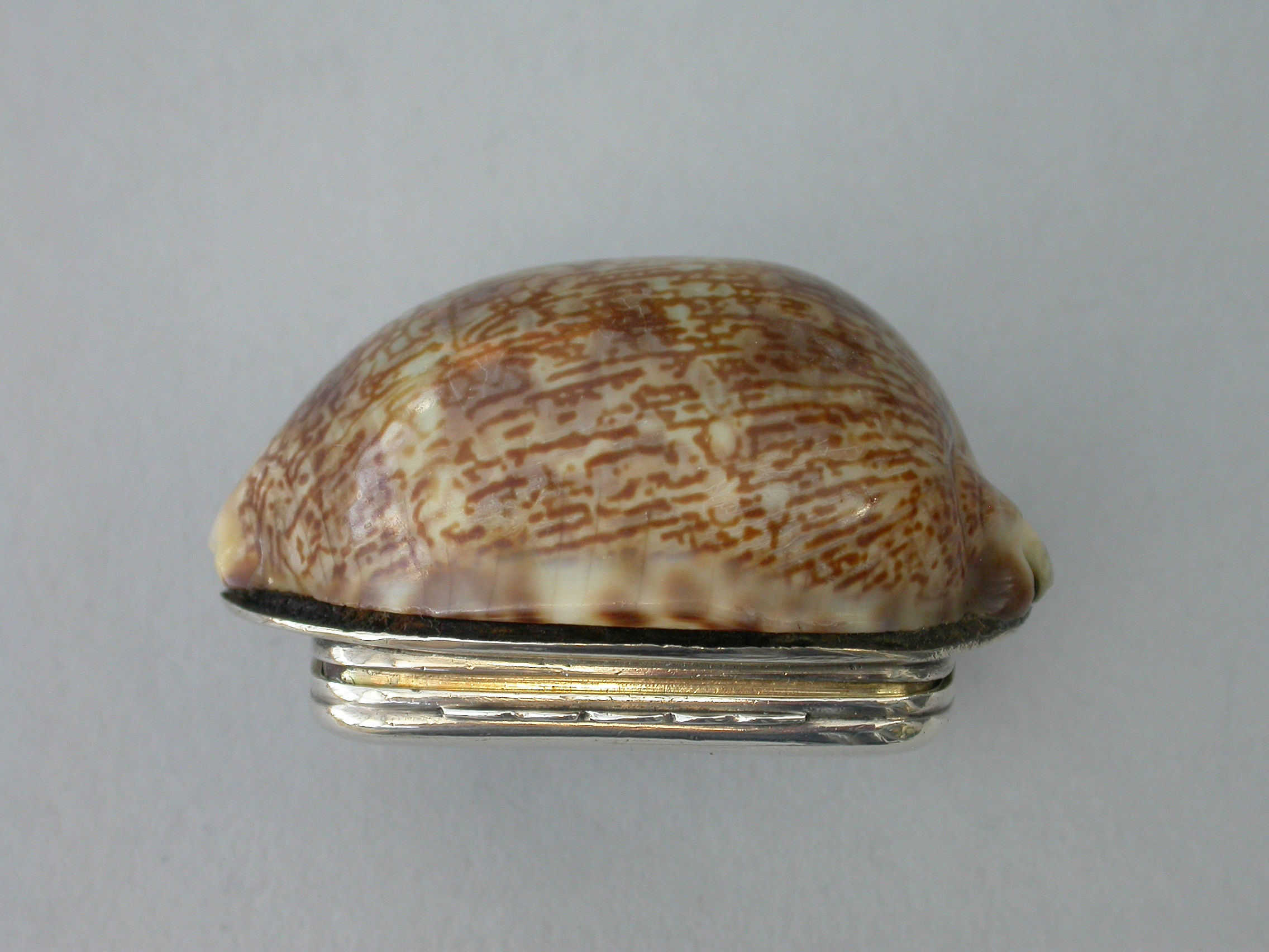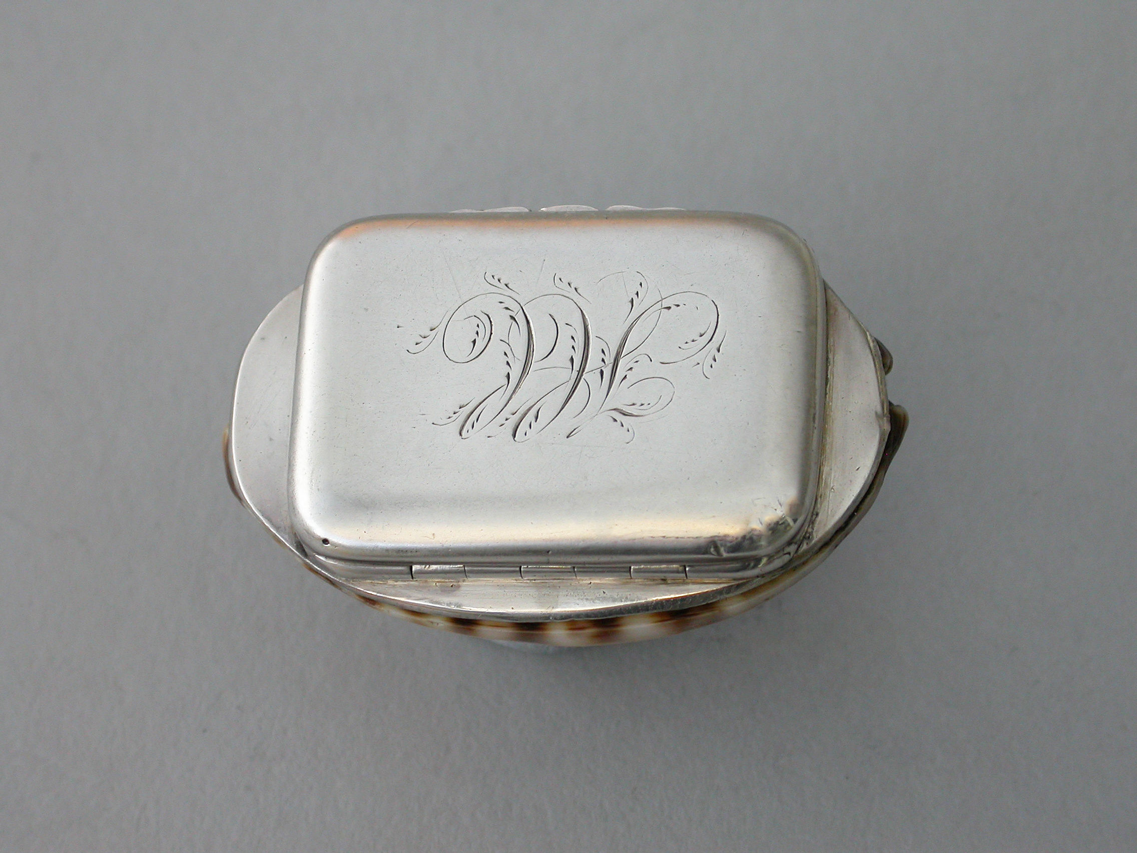 An extremely rare George III Scottish Provincial silver mounted cowrie shell Vinaigrette, the plain silver lid engraved with contemporary script initials, the silver gilt interior with plainly pierced and foliate engraved grille.