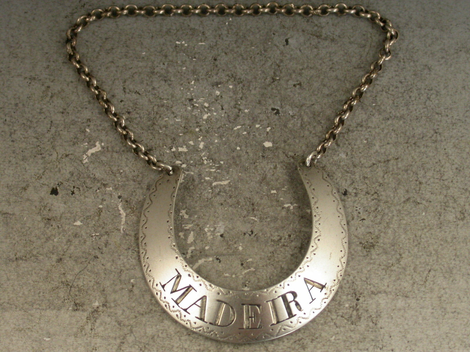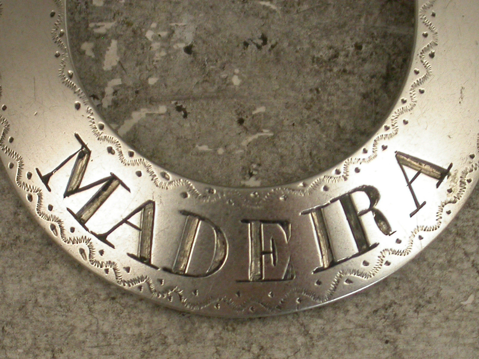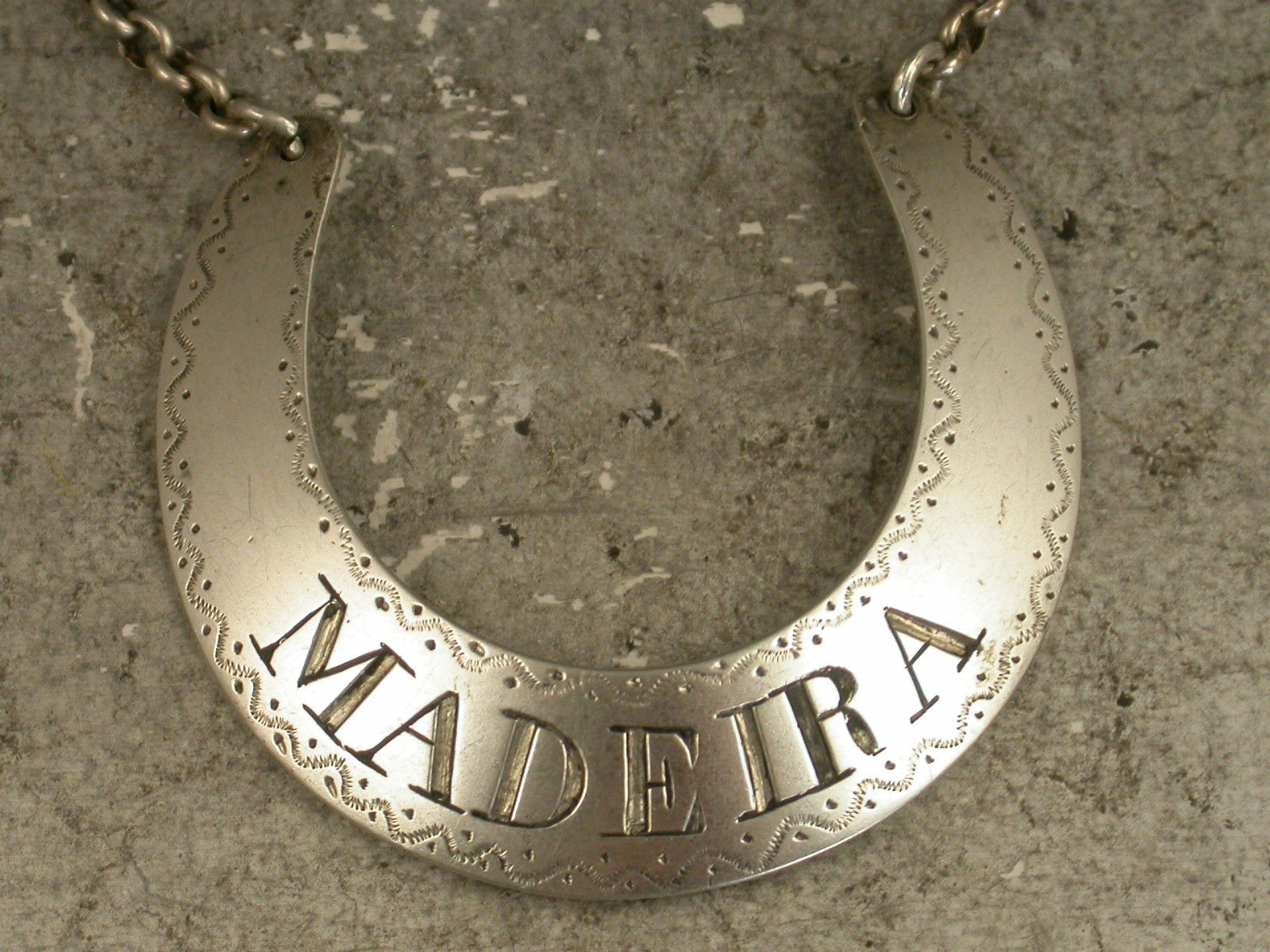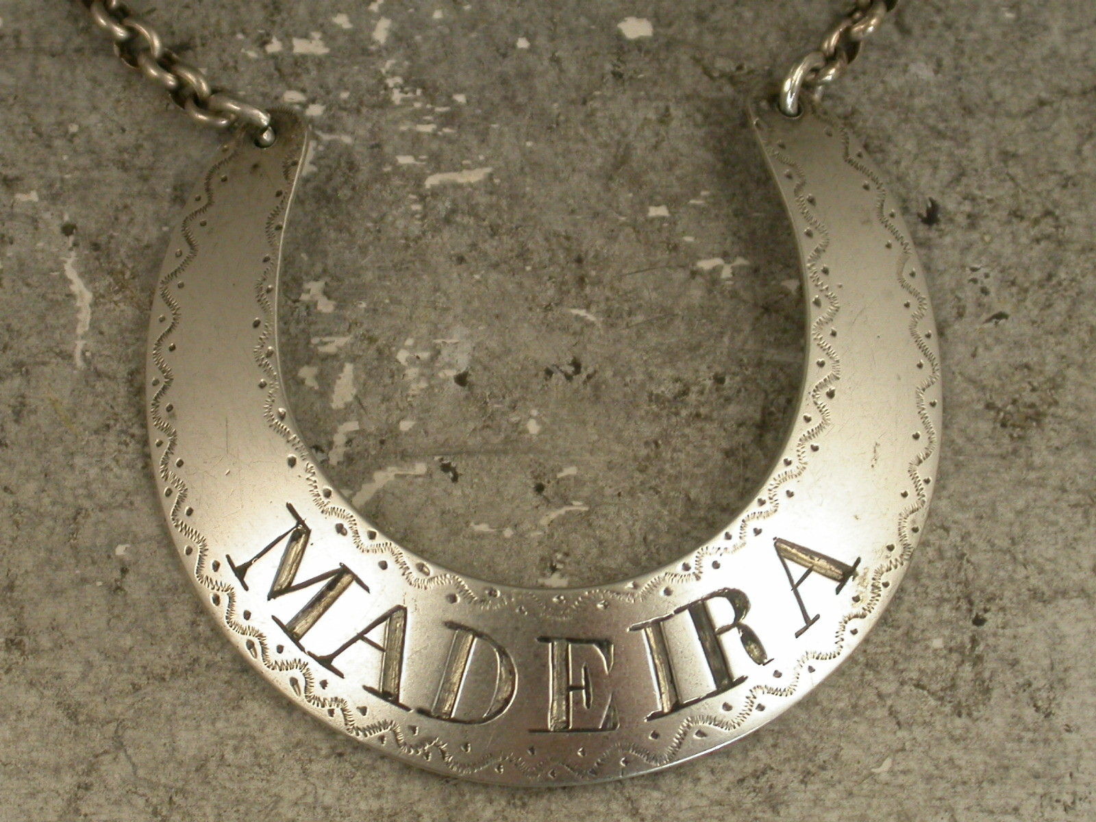 A rare George III Scottish Provincial silver Wine Label of rounded crescent form with prick-dot and wriggle work engraved border, incised for Madeira.