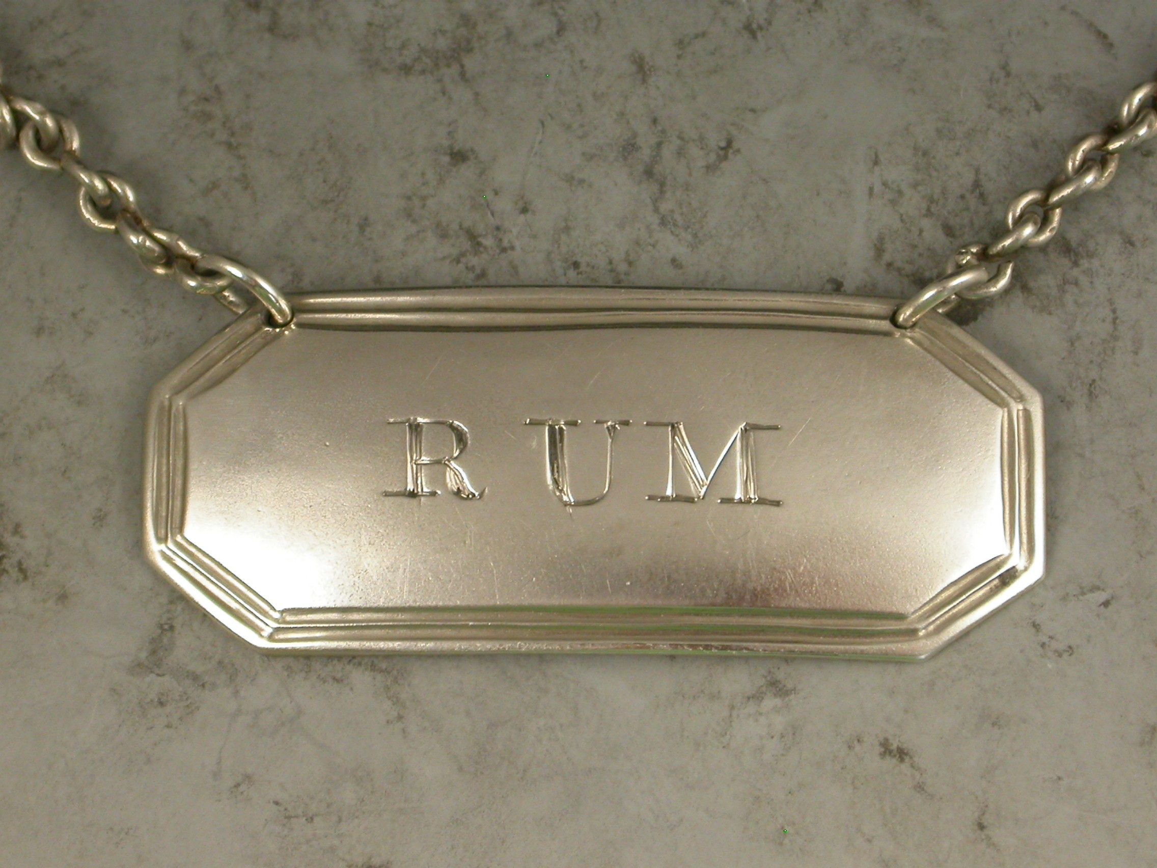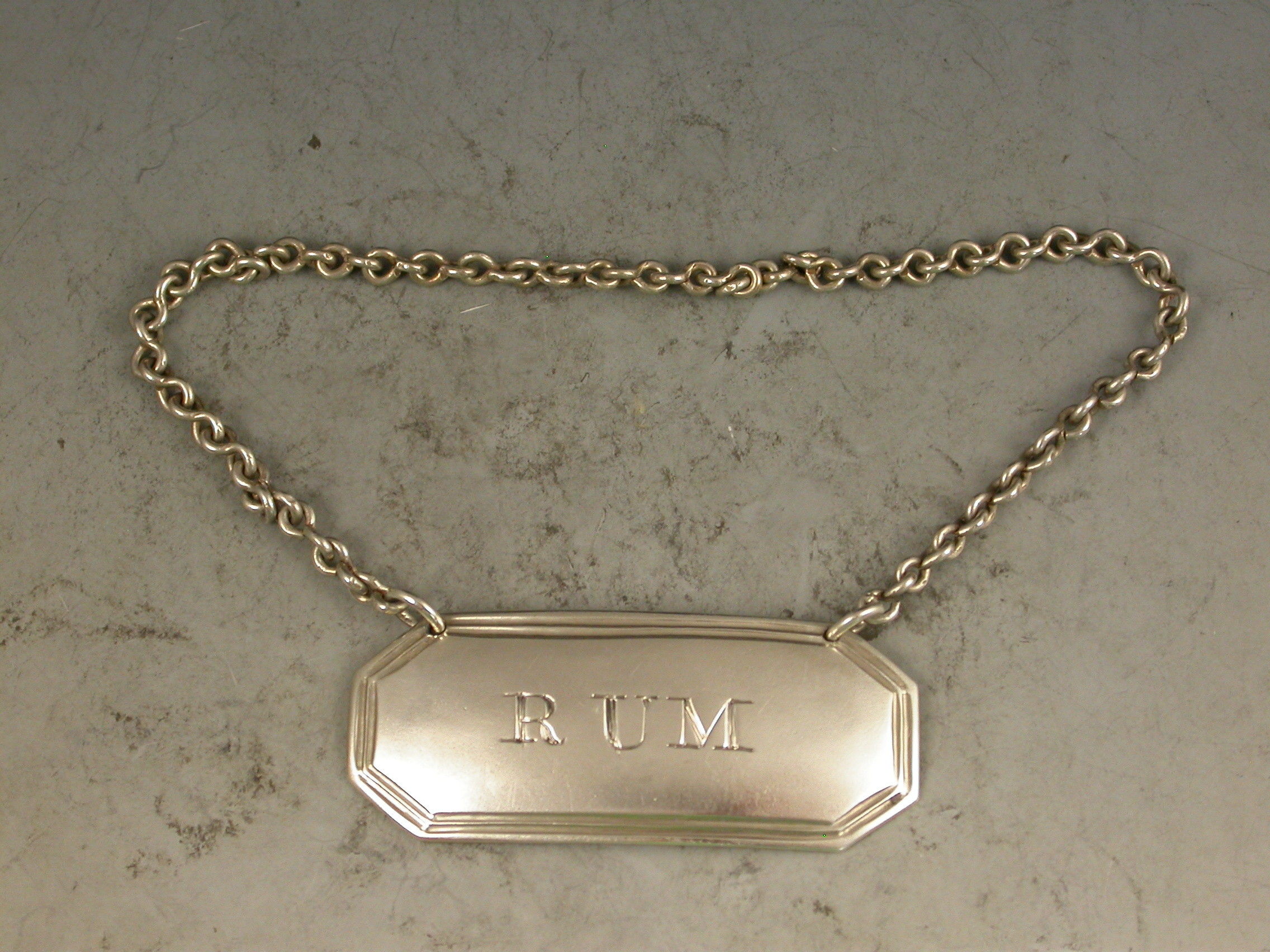 A rare George III Scottish Provincial silver Wine Label of cut-cornered rectangular form with double reeded border, incised for Rum.