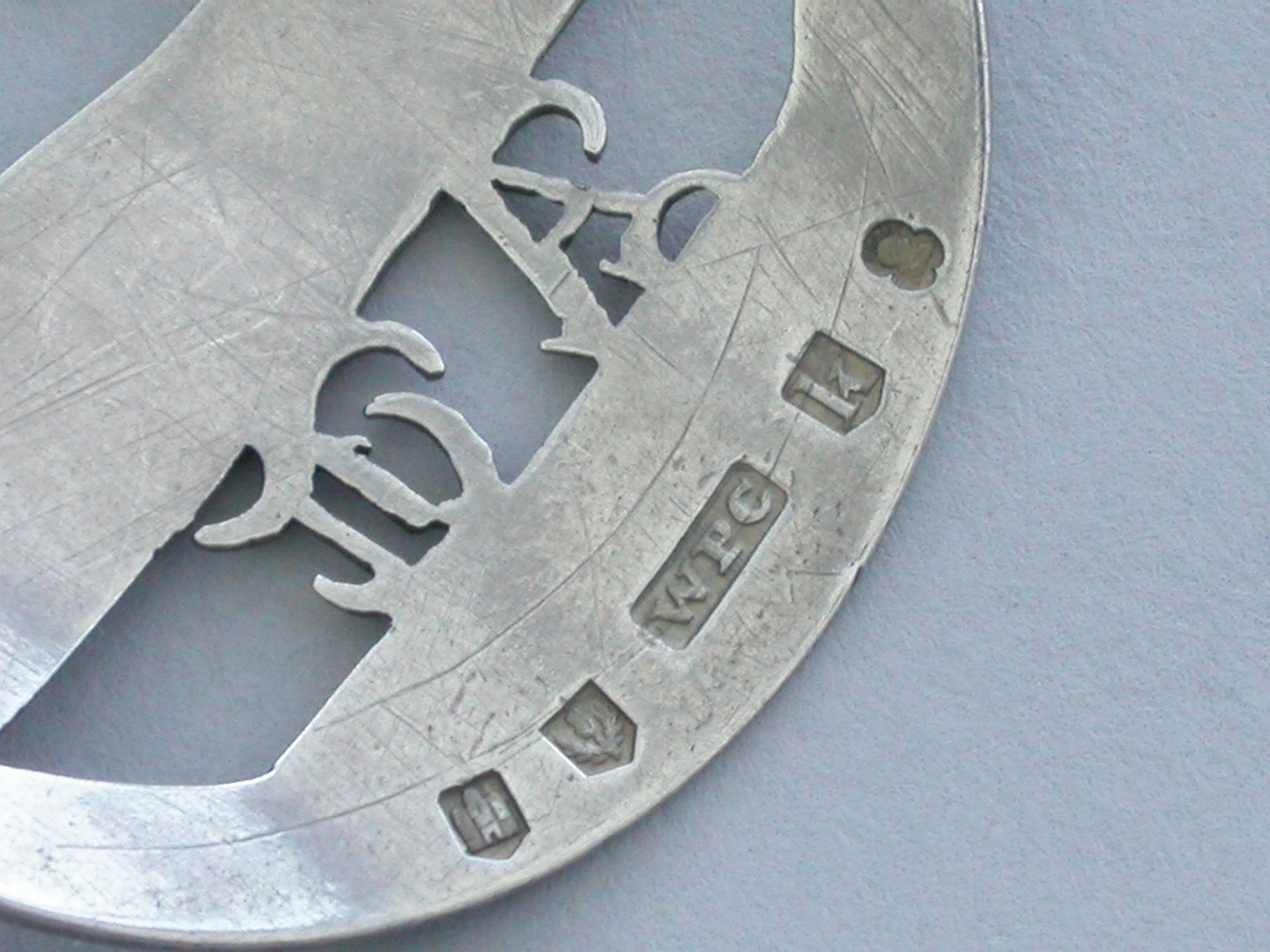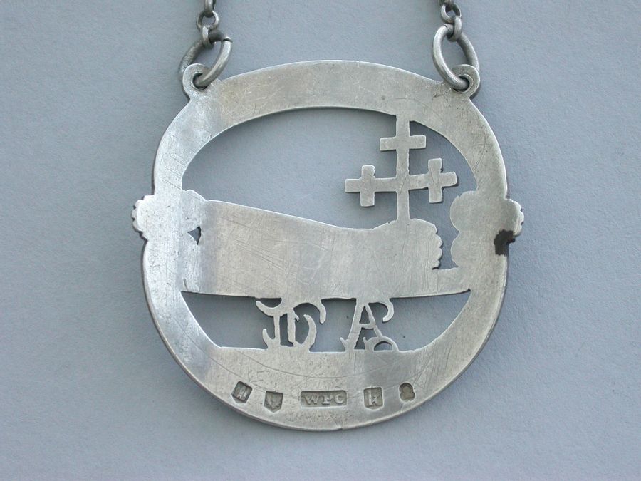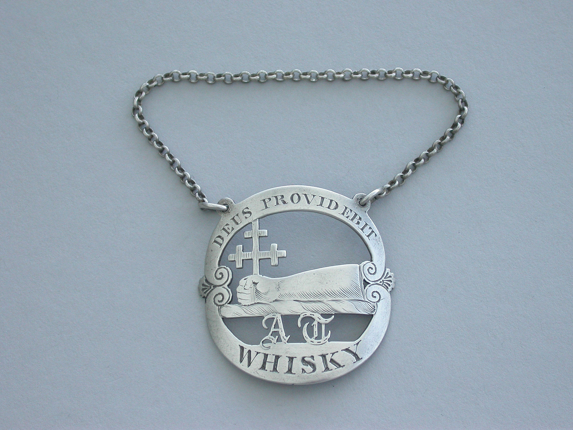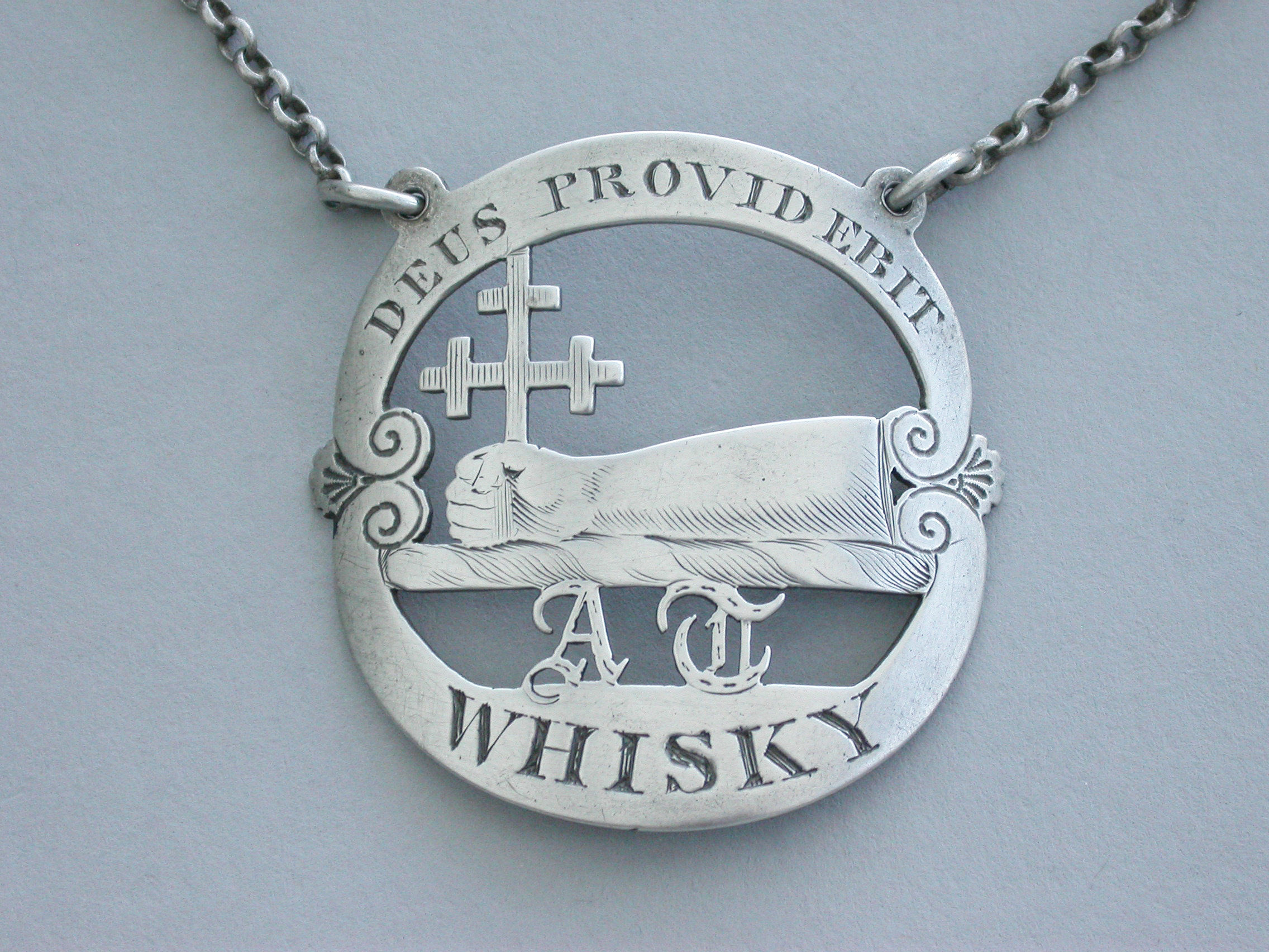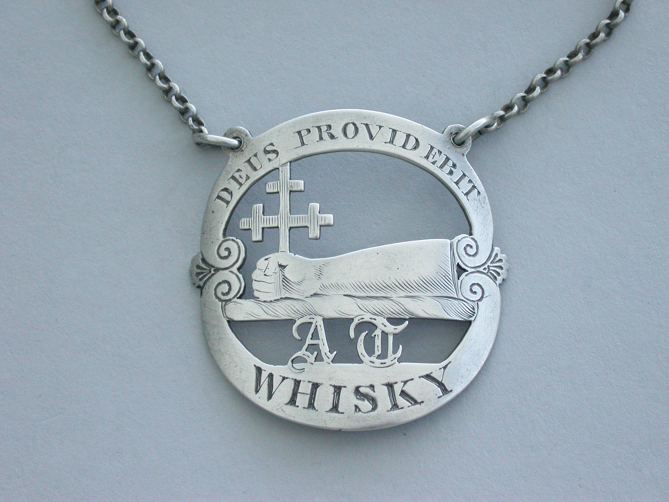 A rare George III Scottish silver Armorial Wine Label of shaped circular form pierced with the crest of the Thomson family of Scotland above the initials 'AT' and within a garter engraved with a motto and the title for Whisky.
