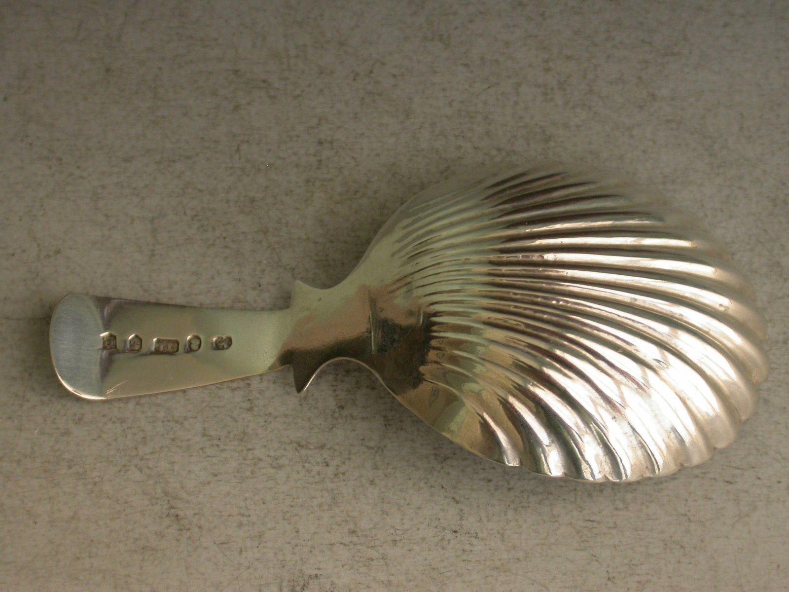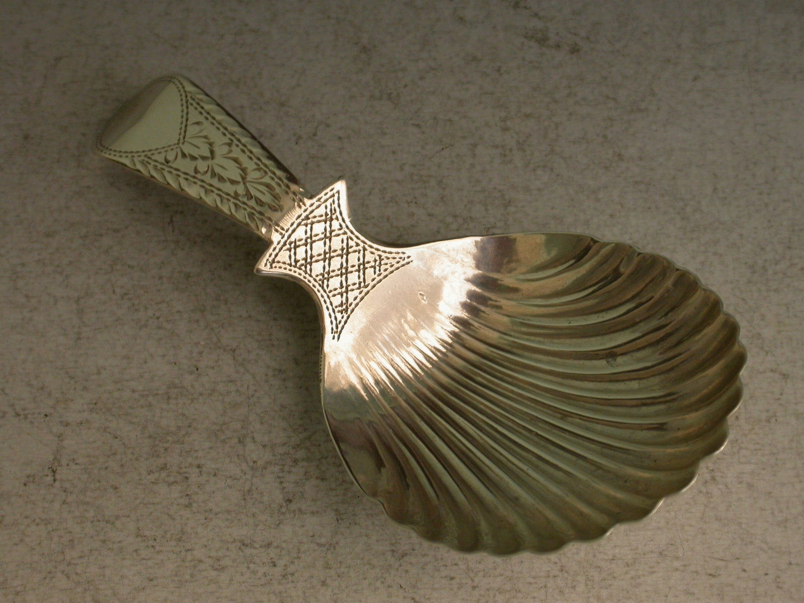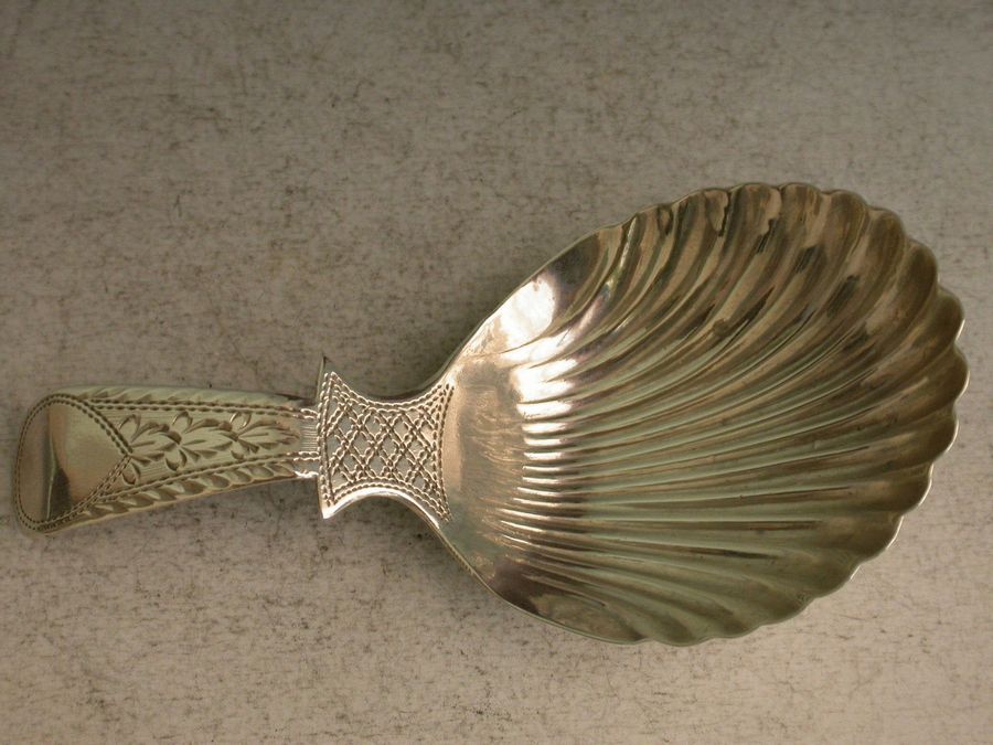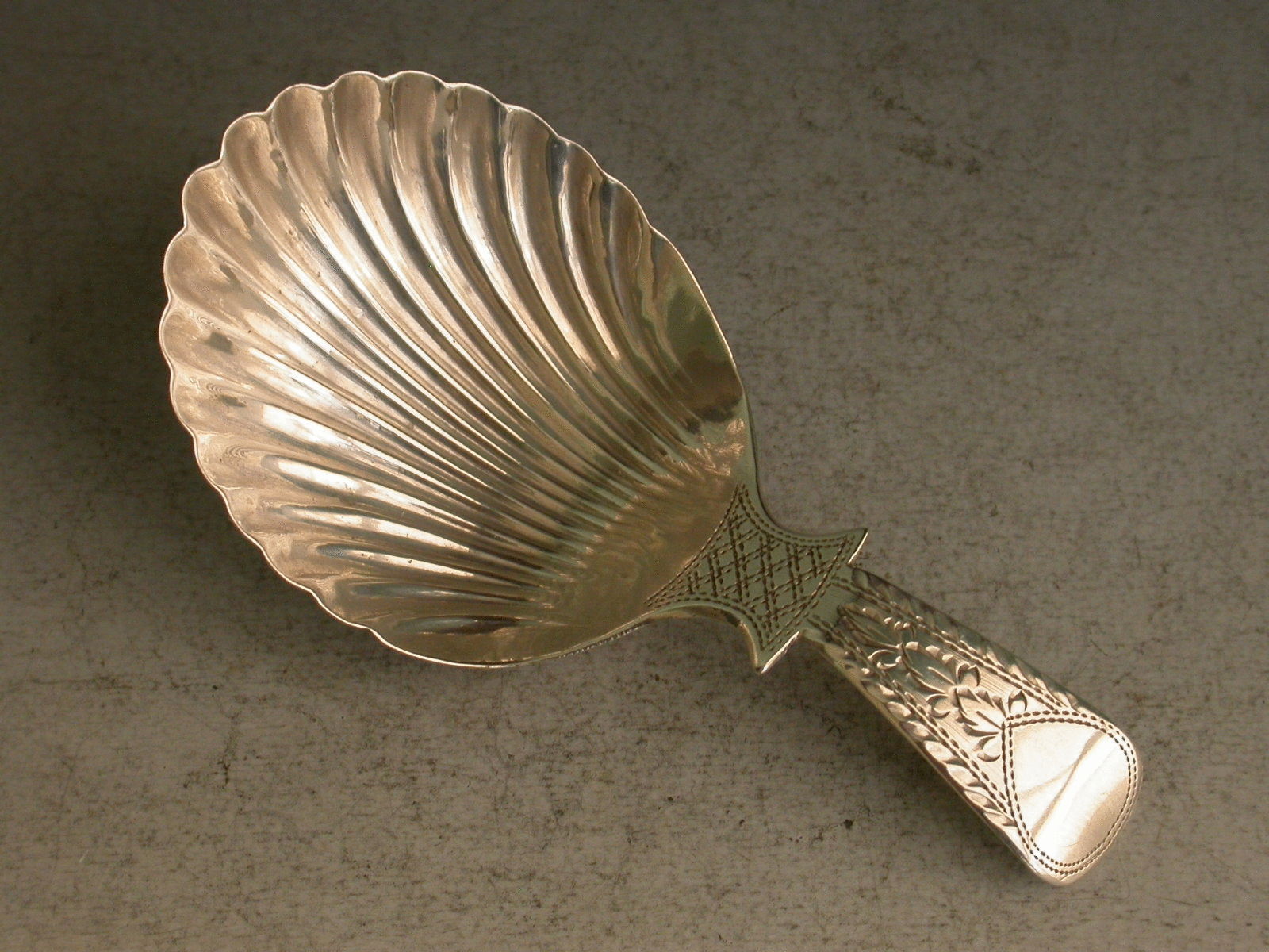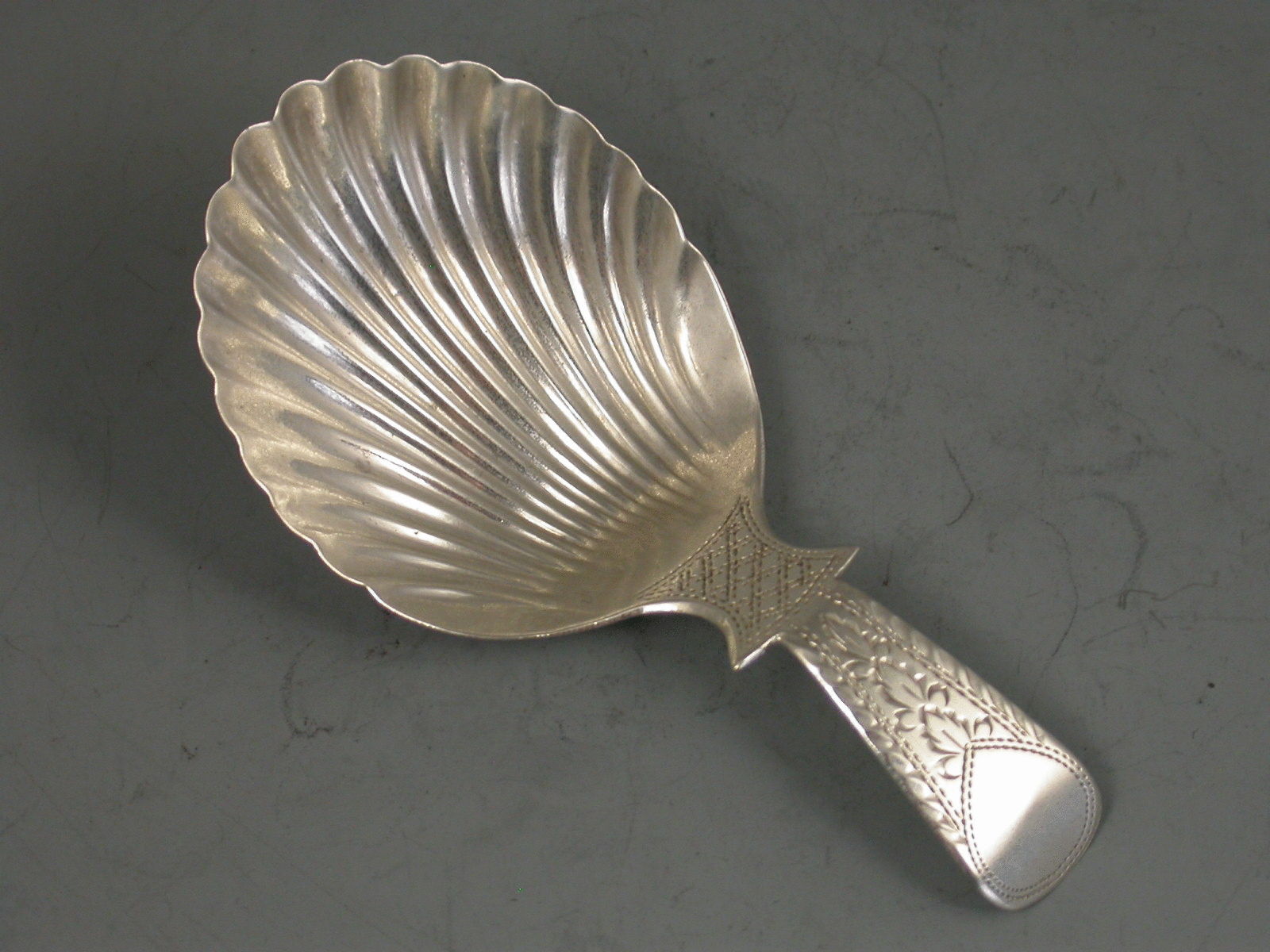 A good George III silver Caddy Spoon with oval fluted shell shaped bowl and bright cut engraved Old English handle with shoulders.