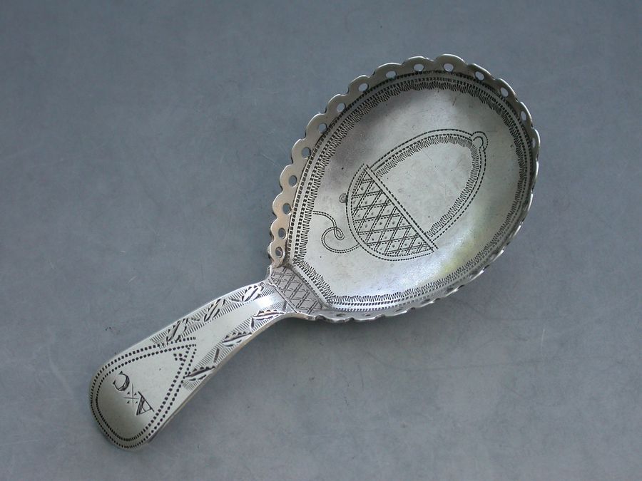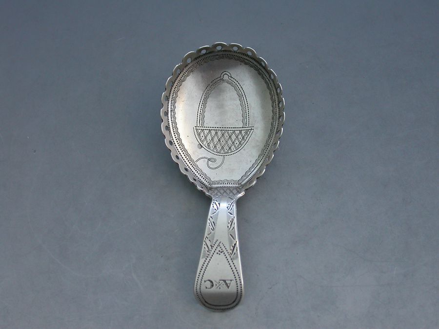 A fine George III silver Caddy Spoon, the oval bowl with pierced gallery border and engraved with an acorn. The Old English type handle also with bright cut engraved decoration and contemporary initials.