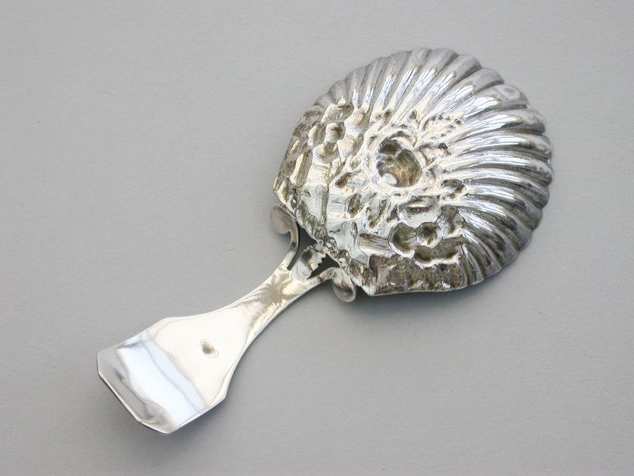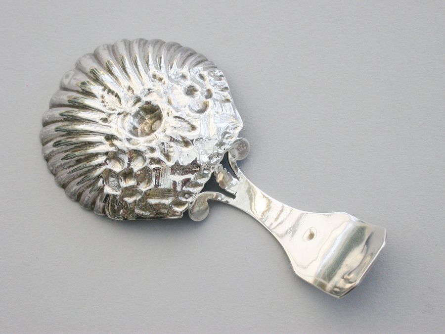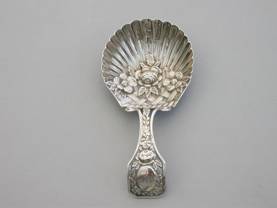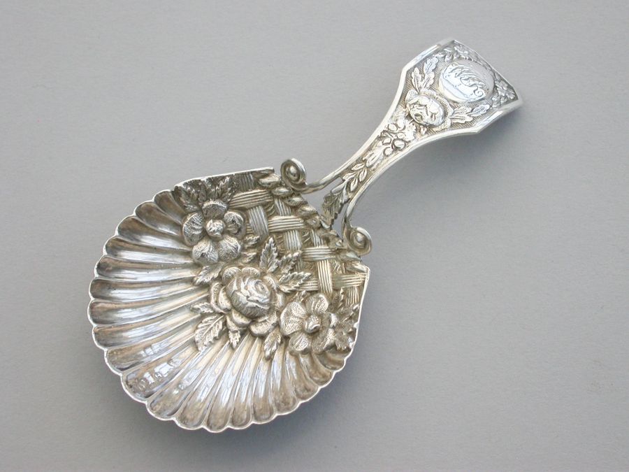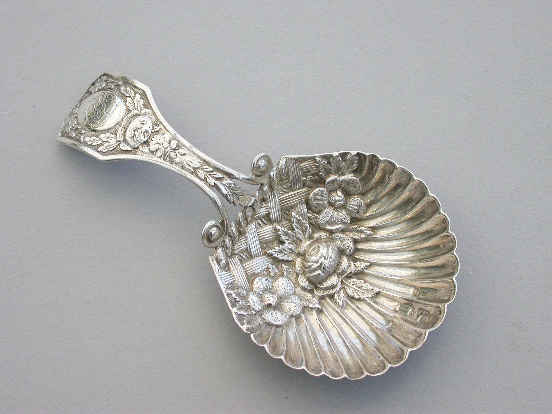 A rare George III silver Caddy Spoon, the shell bowl chased and embossed with a finely detailed basket of flowers, the bi-furcated handle chased with foliate fronds and a flower head. A cartouche engraved with contemporary initials.