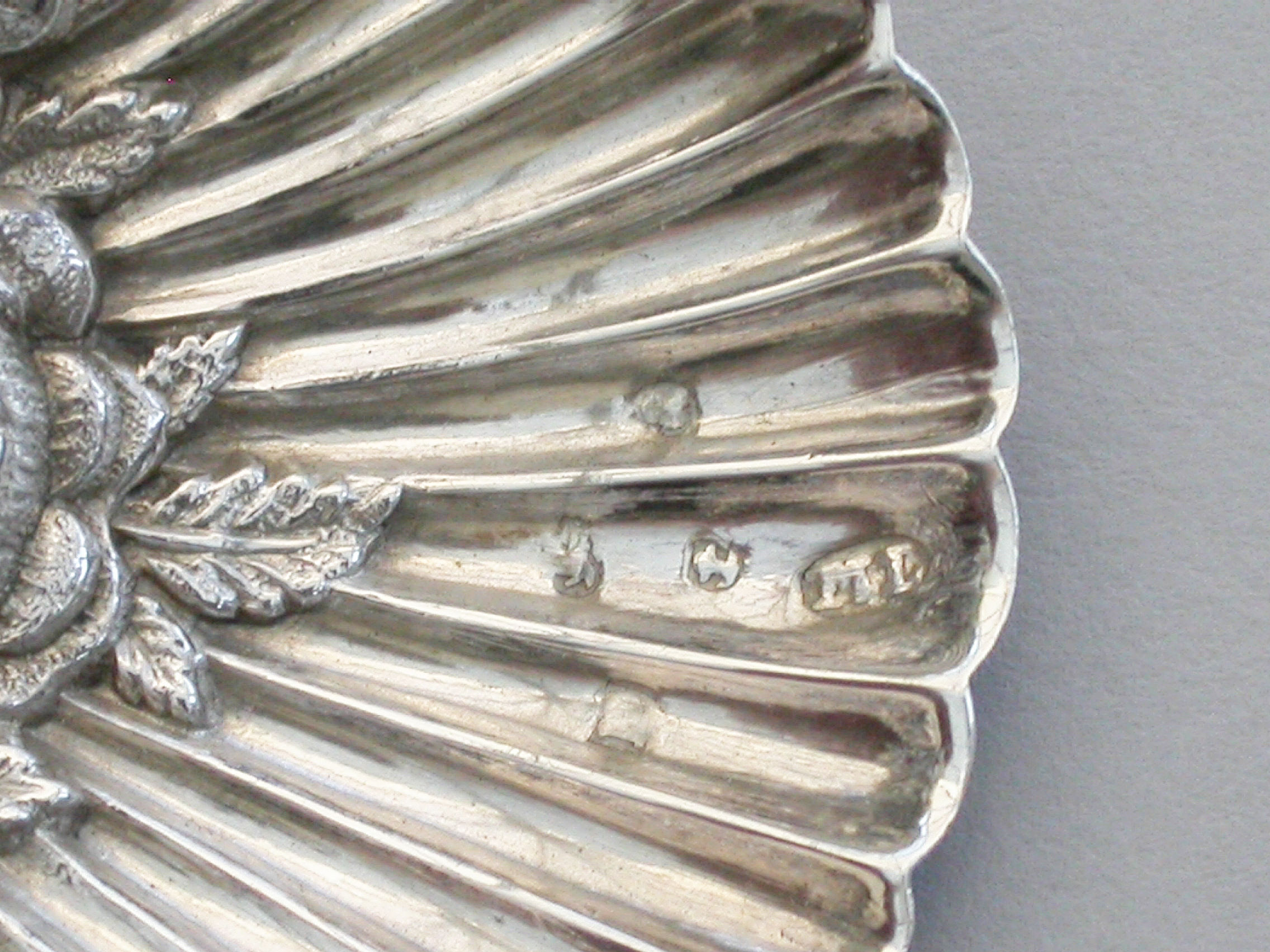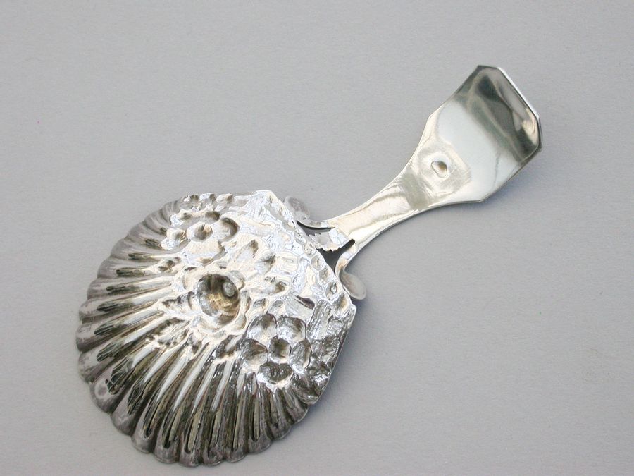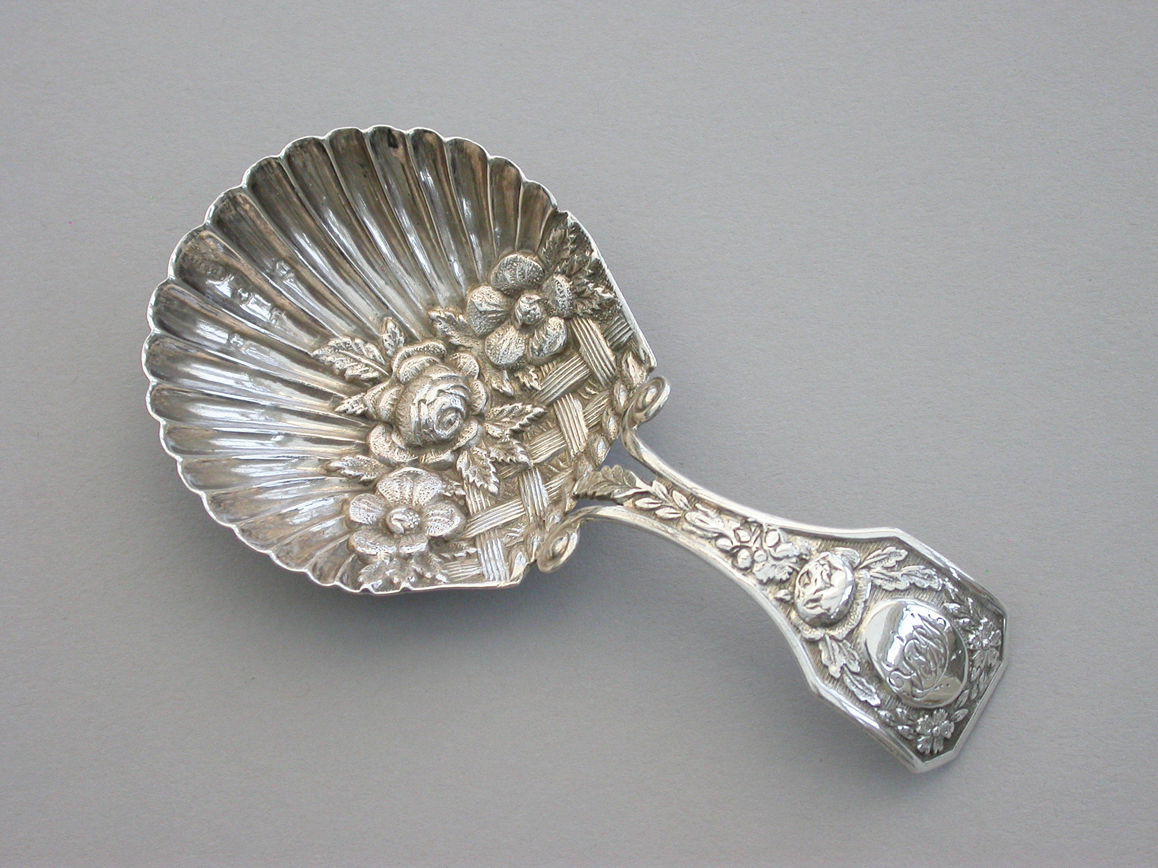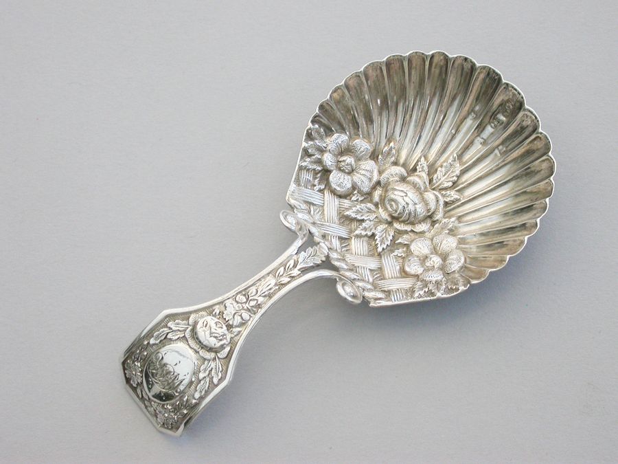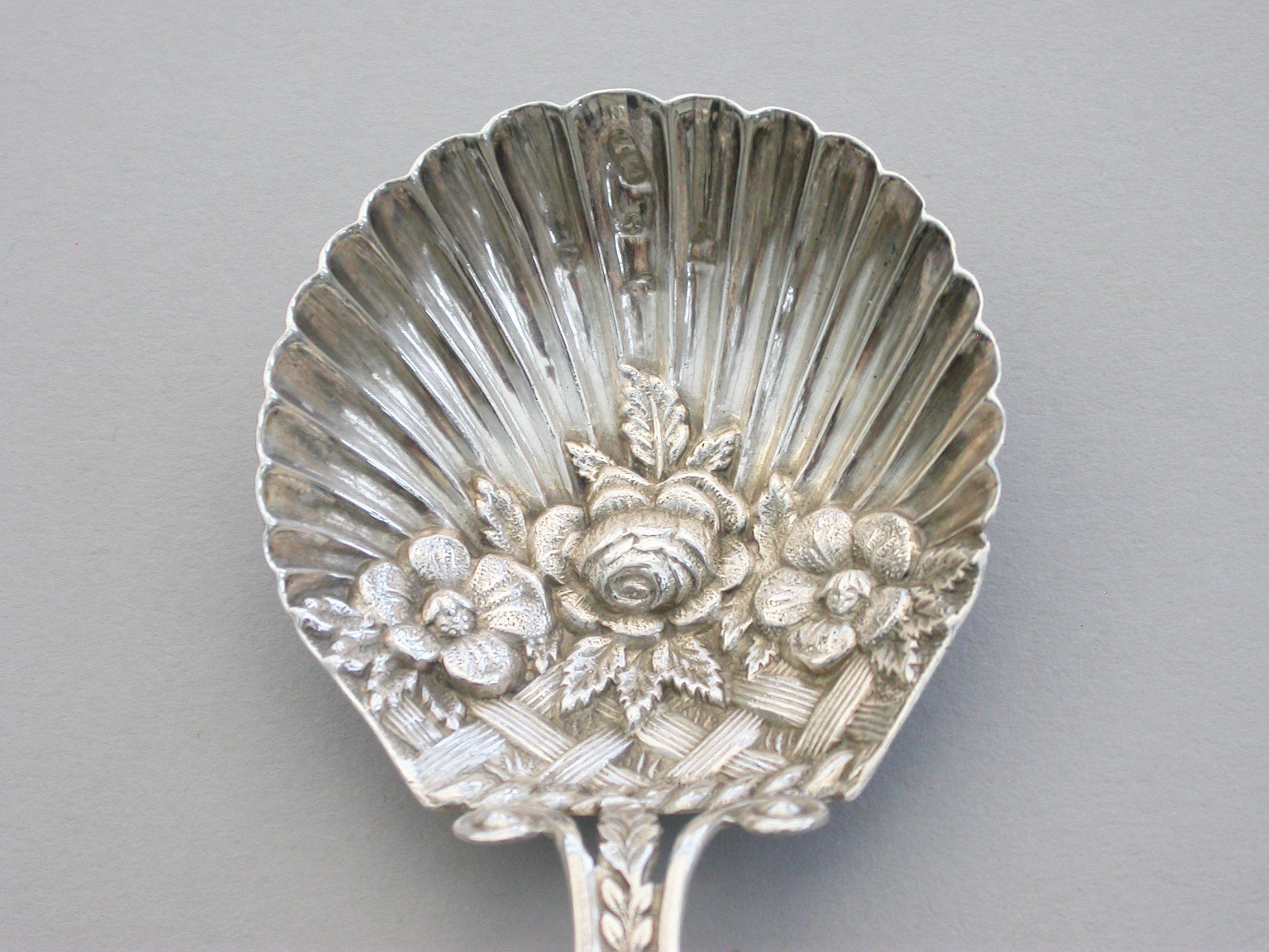 A rare George III silver Caddy Spoon, the shell bowl chased and embossed with a finely detailed basket of flowers, the bi-furcated handle chased with foliate fronds and a flower head. A cartouche engraved with contemporary initials.