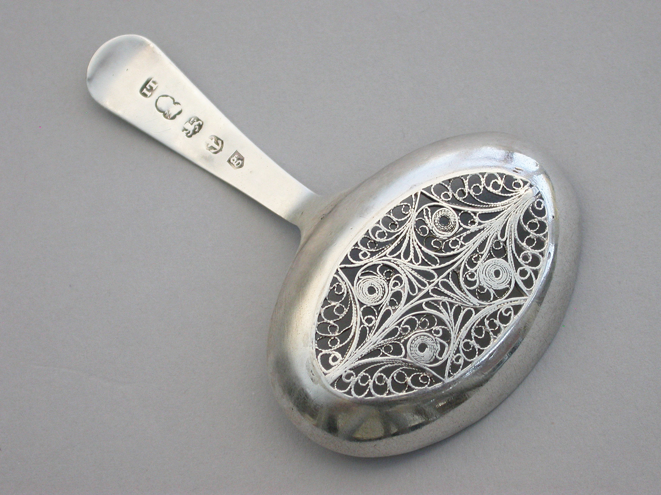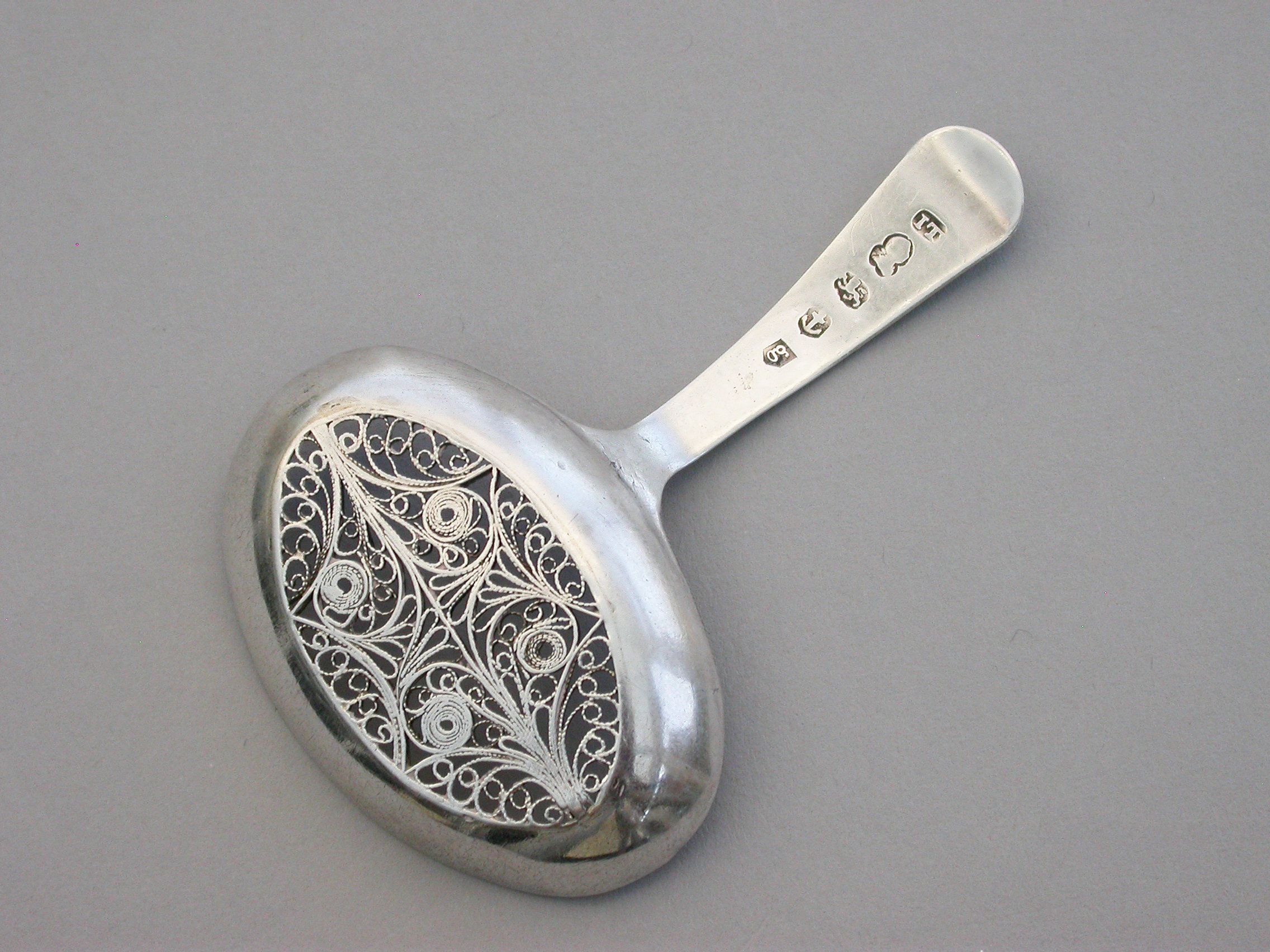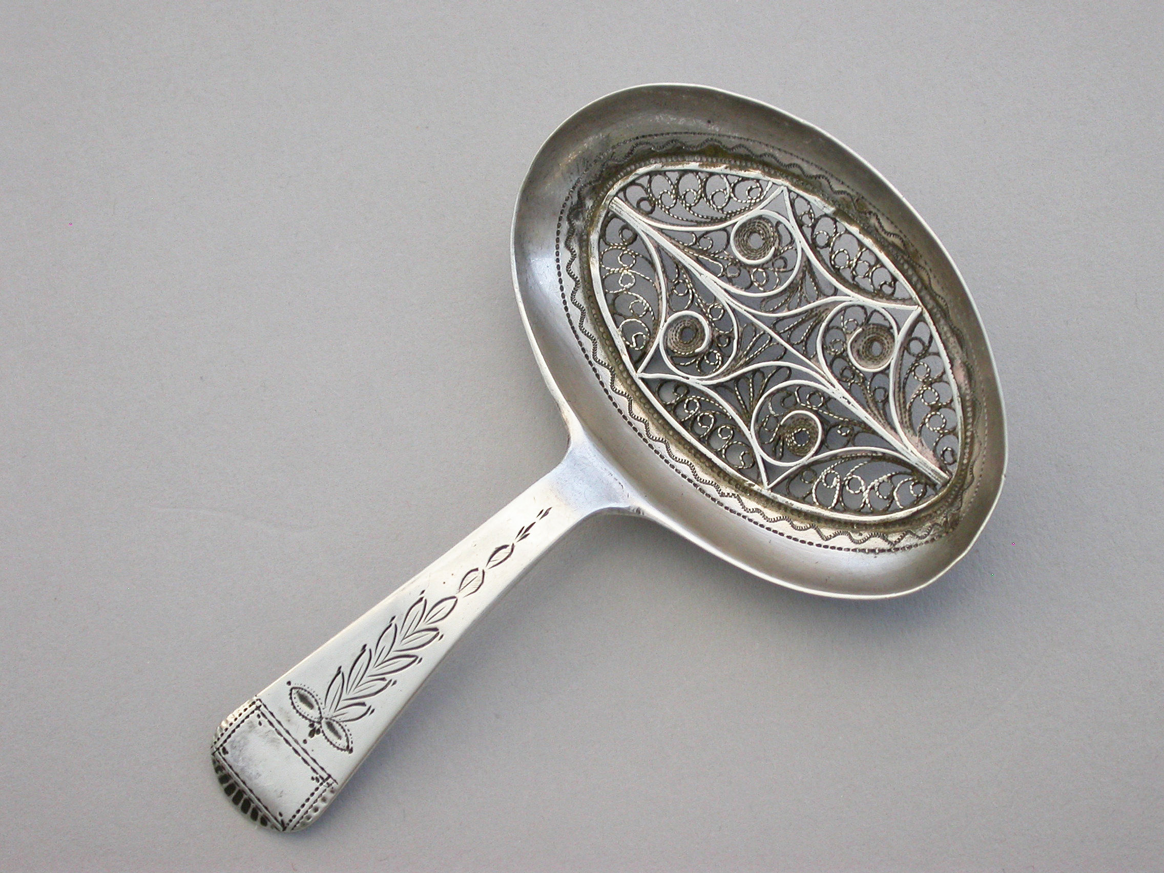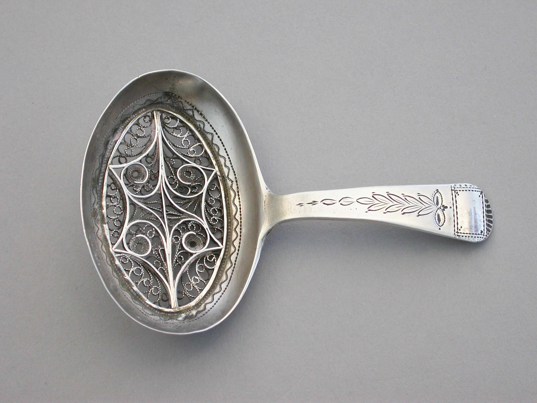 A fine George III silver Caddy Spoon, with bright-cut engraved Old English handle, the oval bowl with intricate filigree insert.