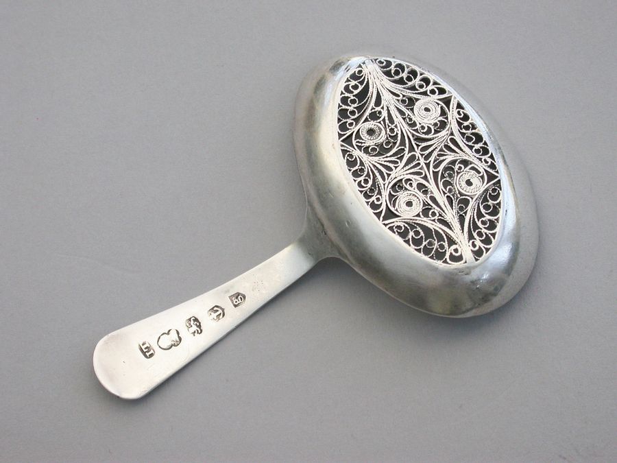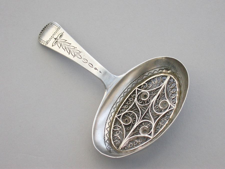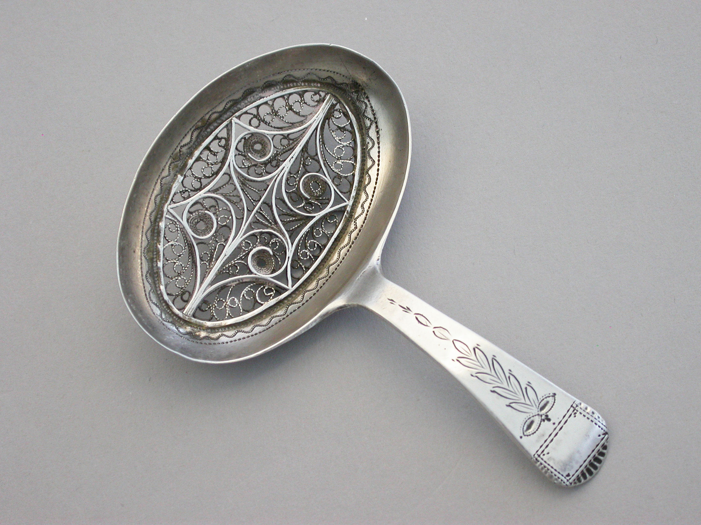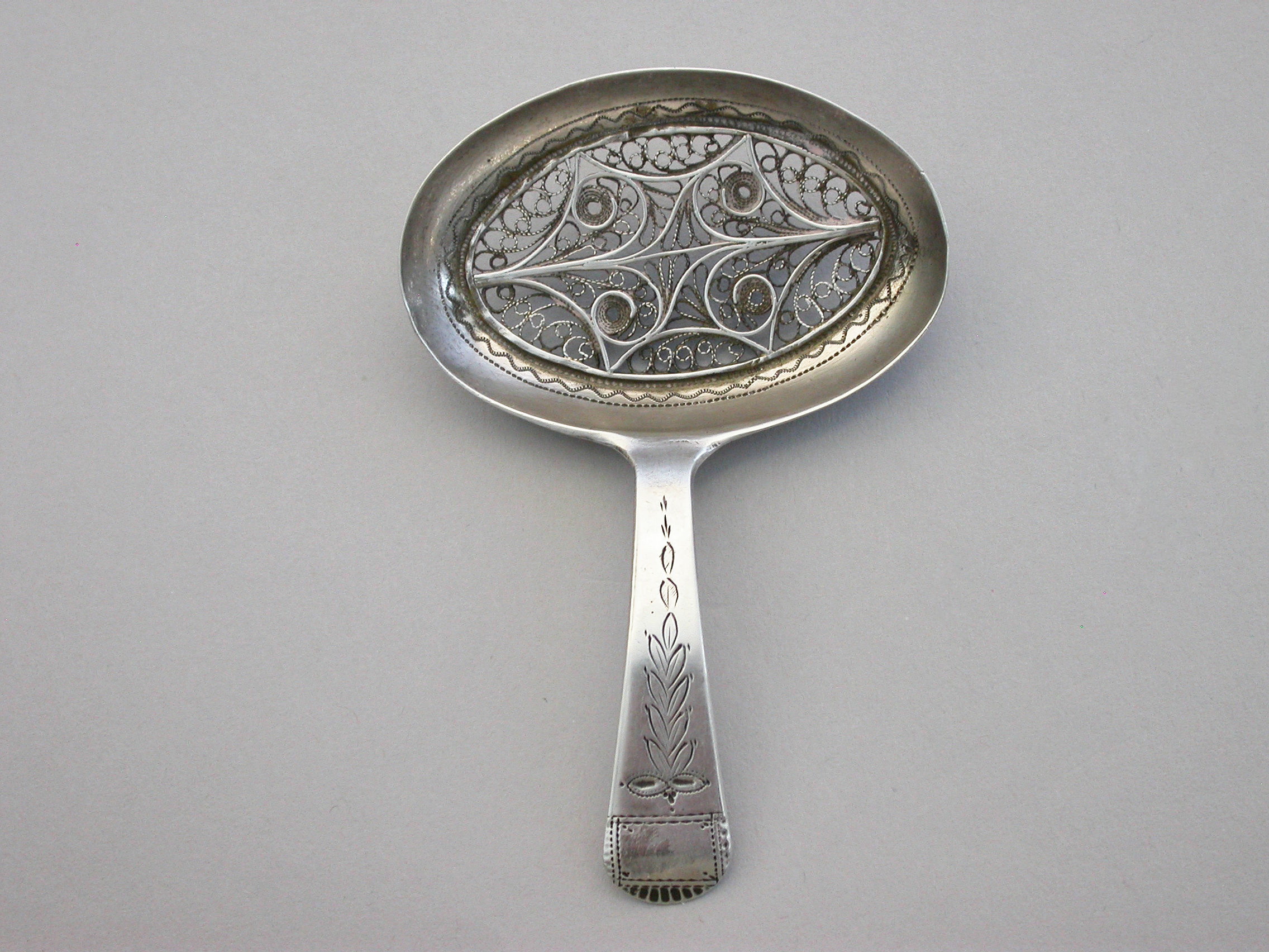 A fine George III silver Caddy Spoon, with bright-cut engraved Old English handle, the oval bowl with intricate filigree insert.
