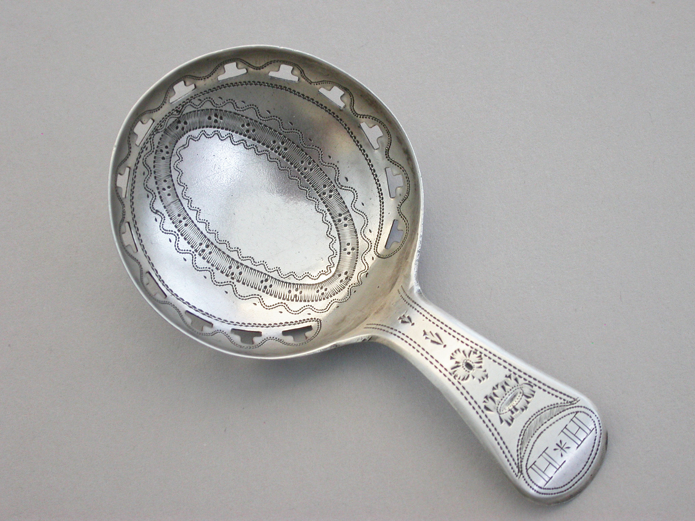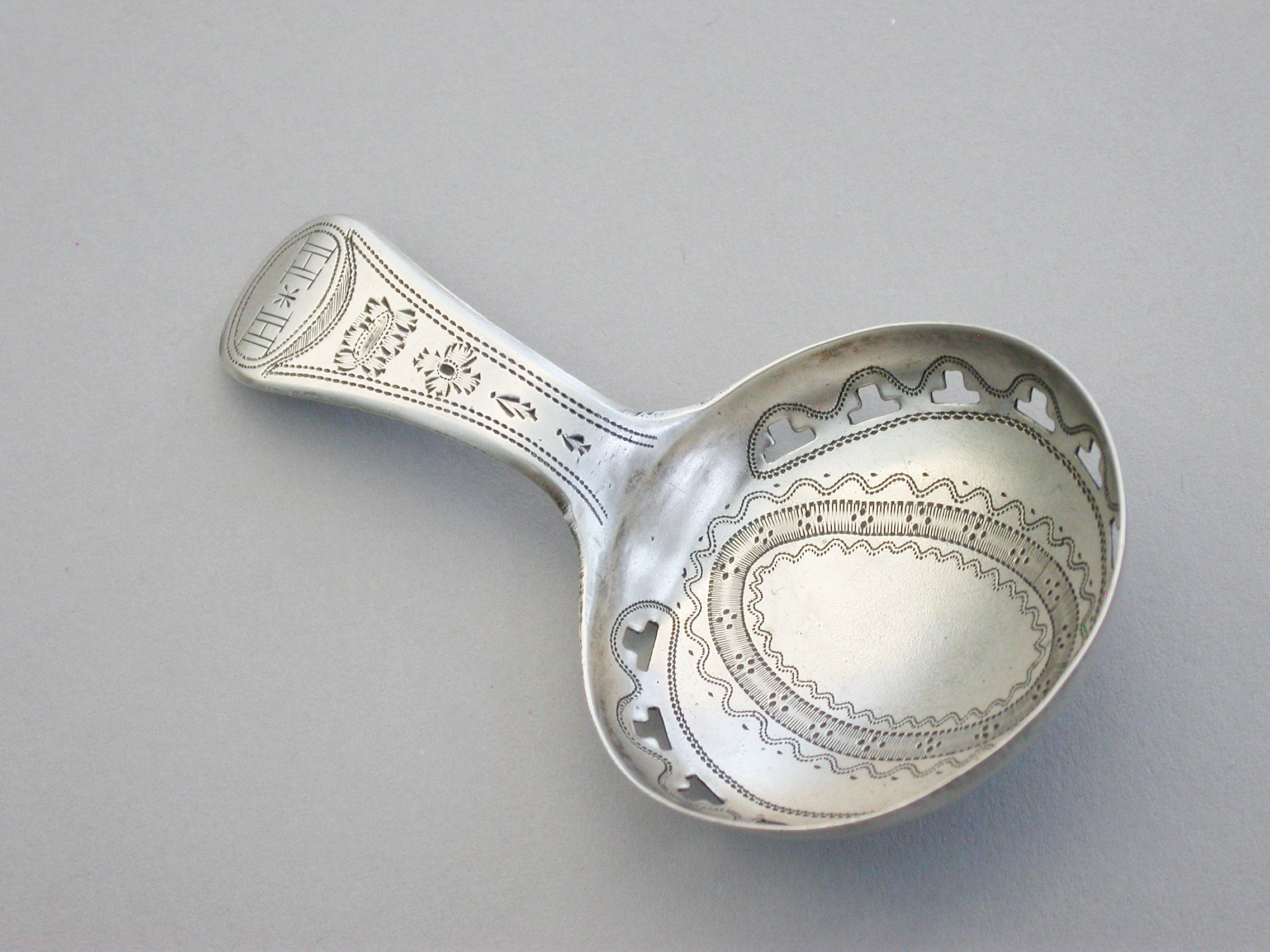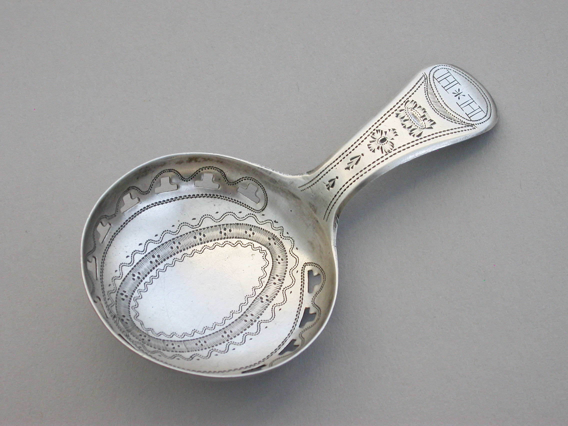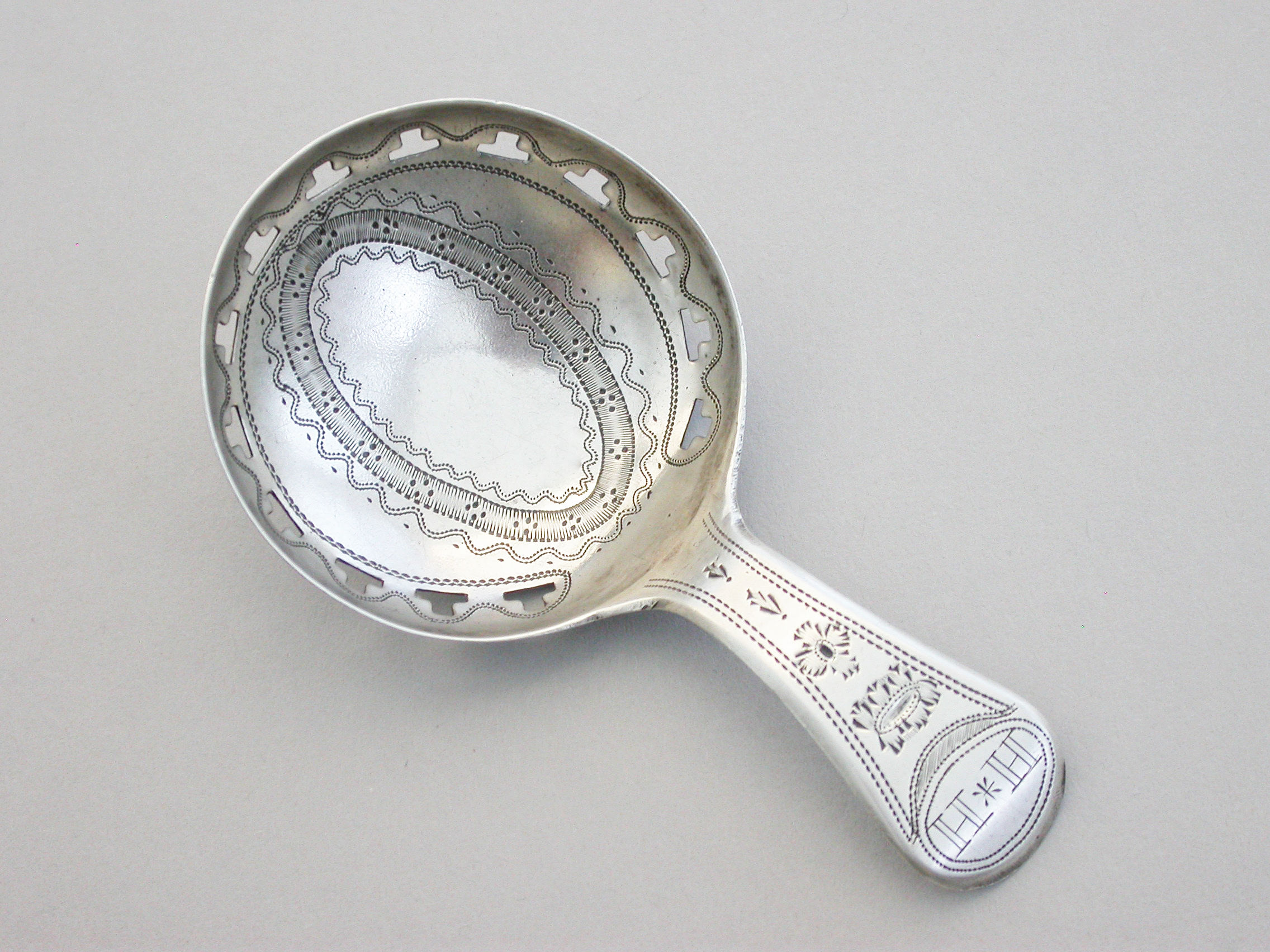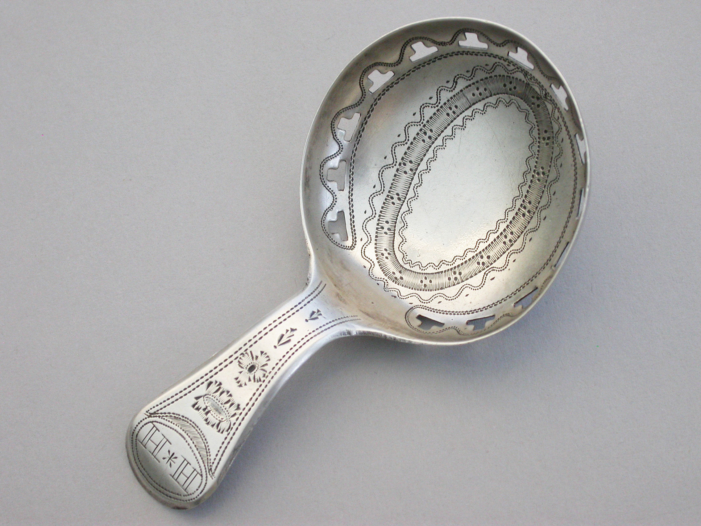 A good George III silver Caddy Spoon with bright-cut engraved Old English handle, the circular bowl pierced with a band of 'T' motifs and bright-cut and prick-dot engraved decoration.