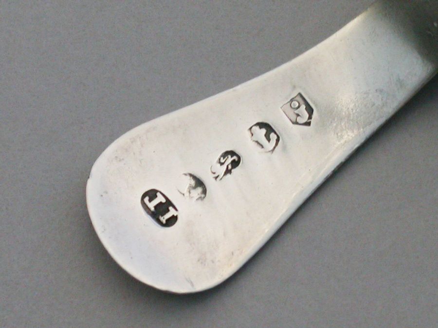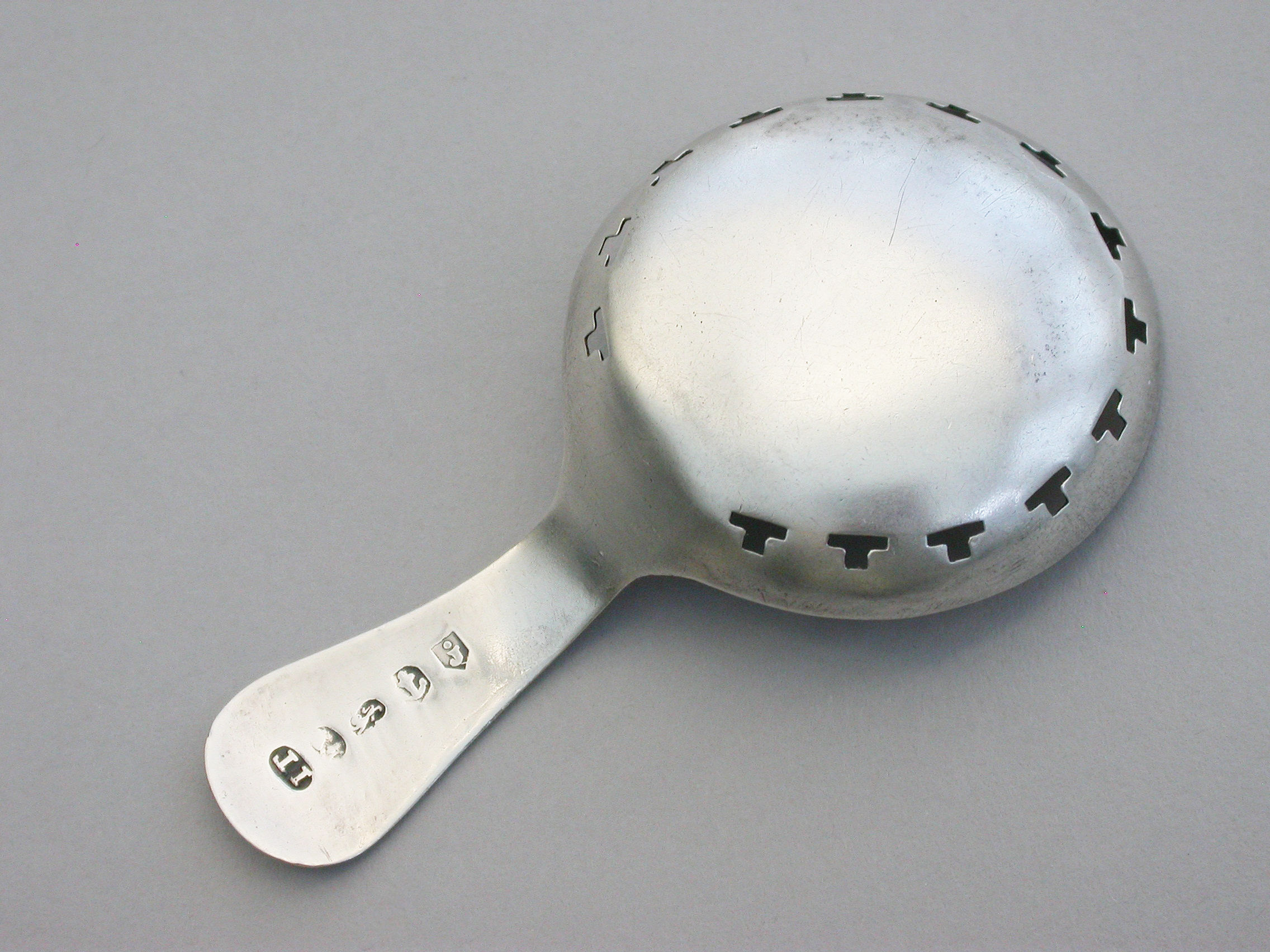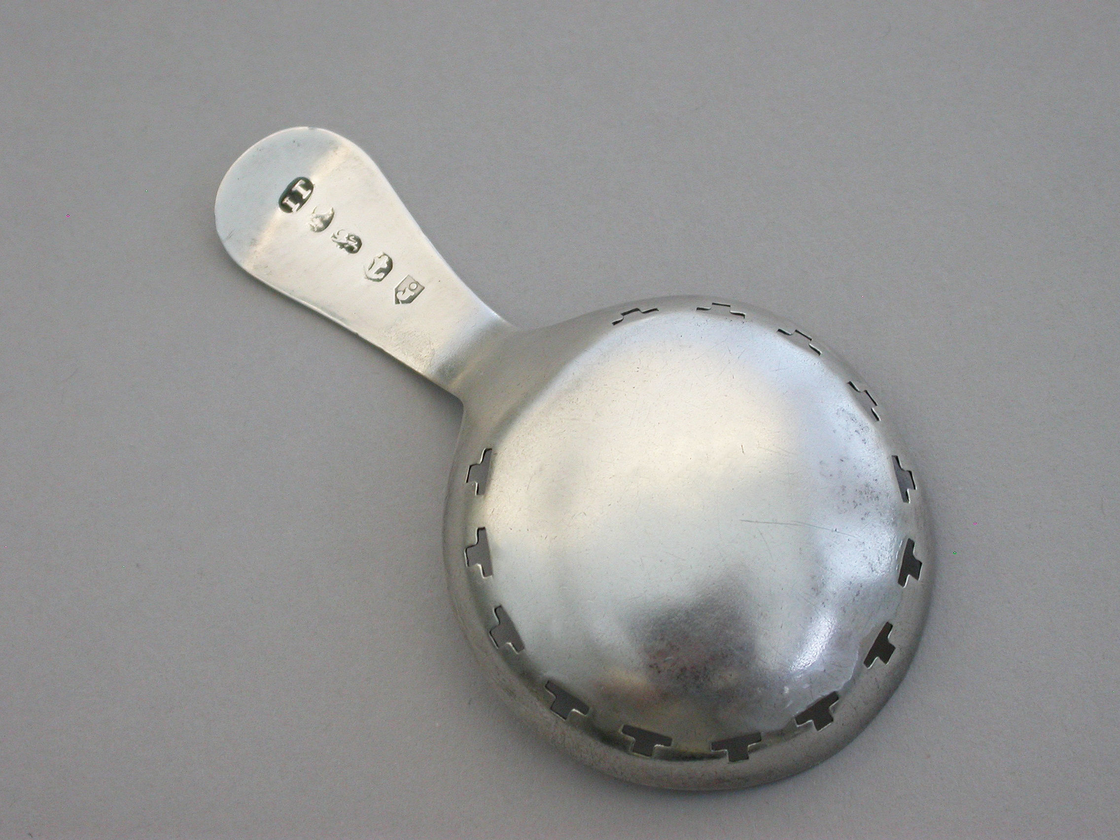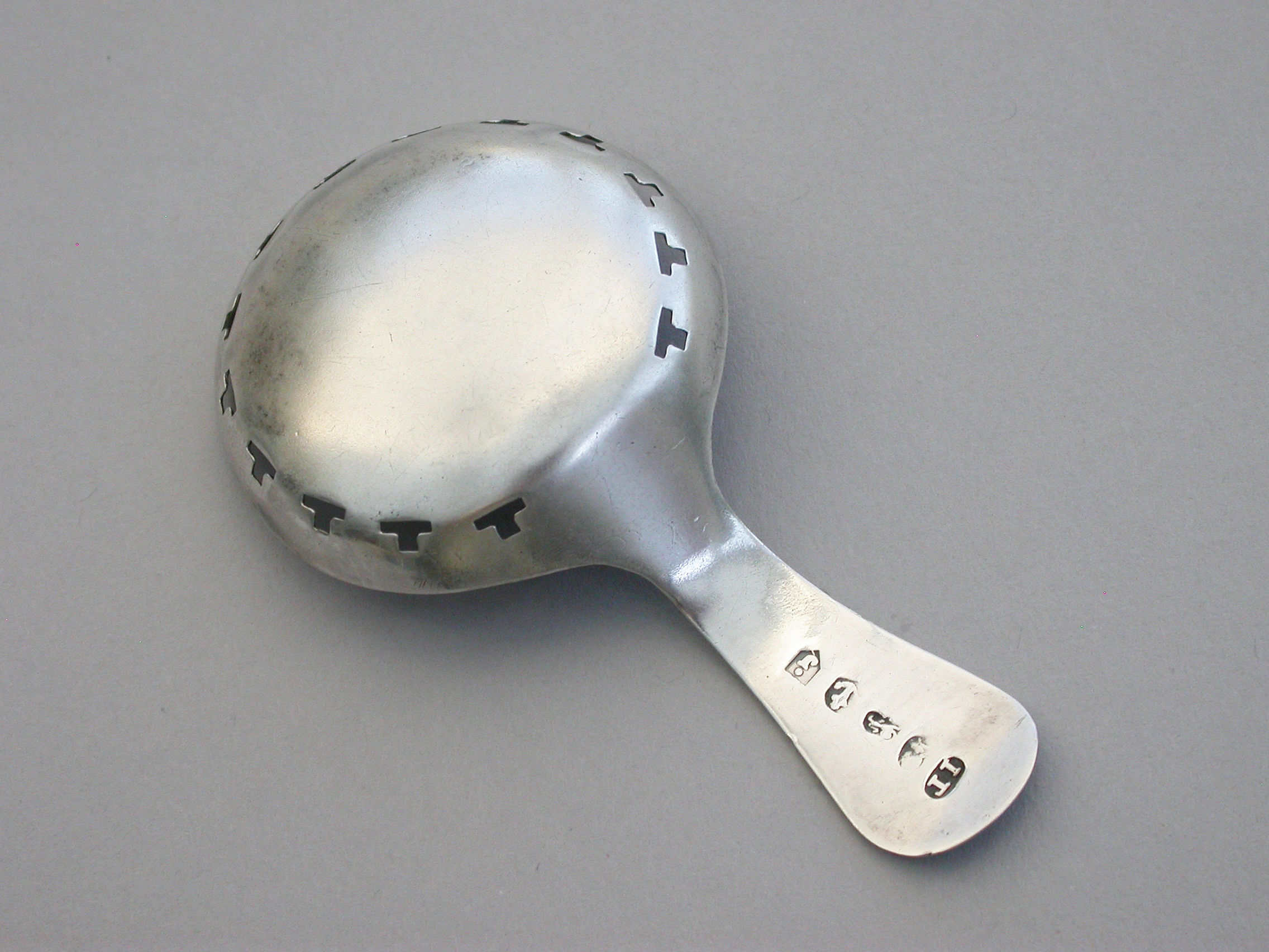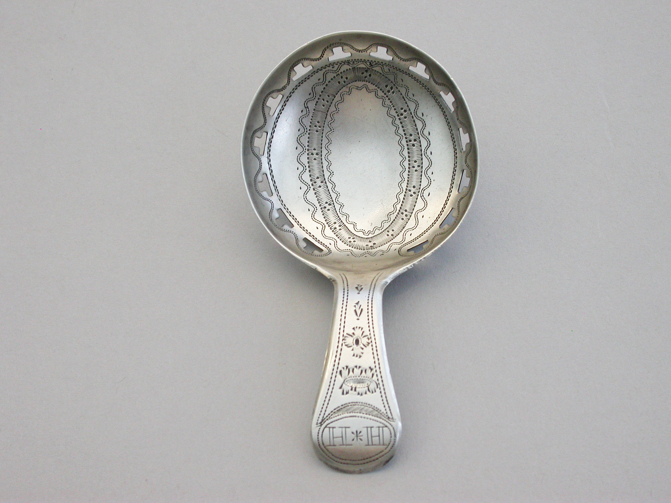 A good George III silver Caddy Spoon with bright-cut engraved Old English handle, the circular bowl pierced with a band of 'T' motifs and bright-cut and prick-dot engraved decoration.