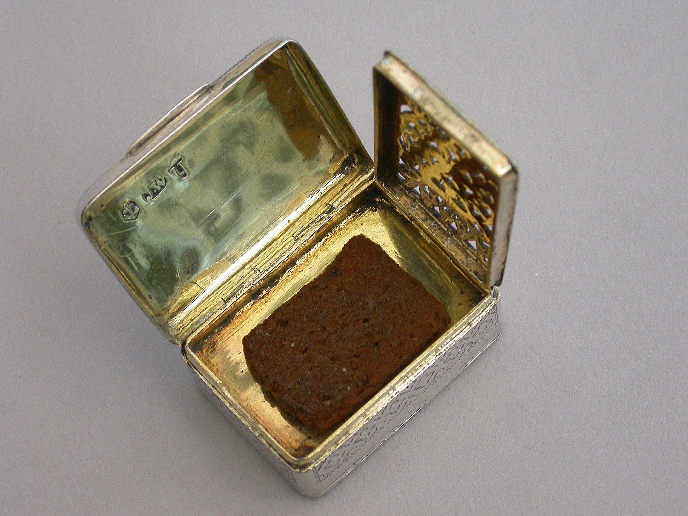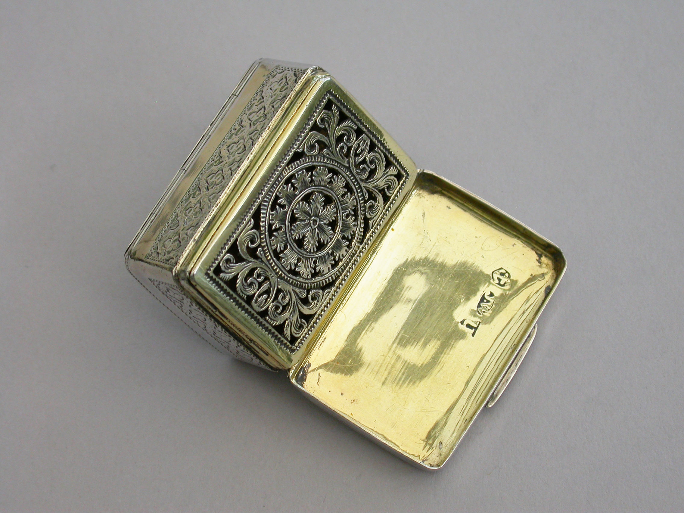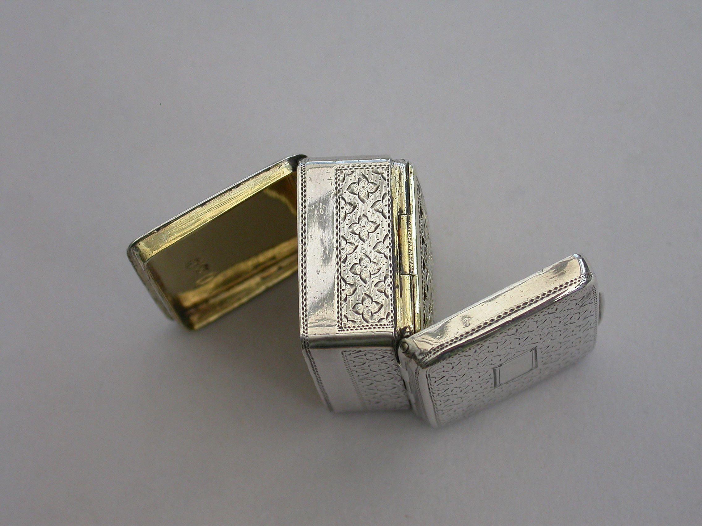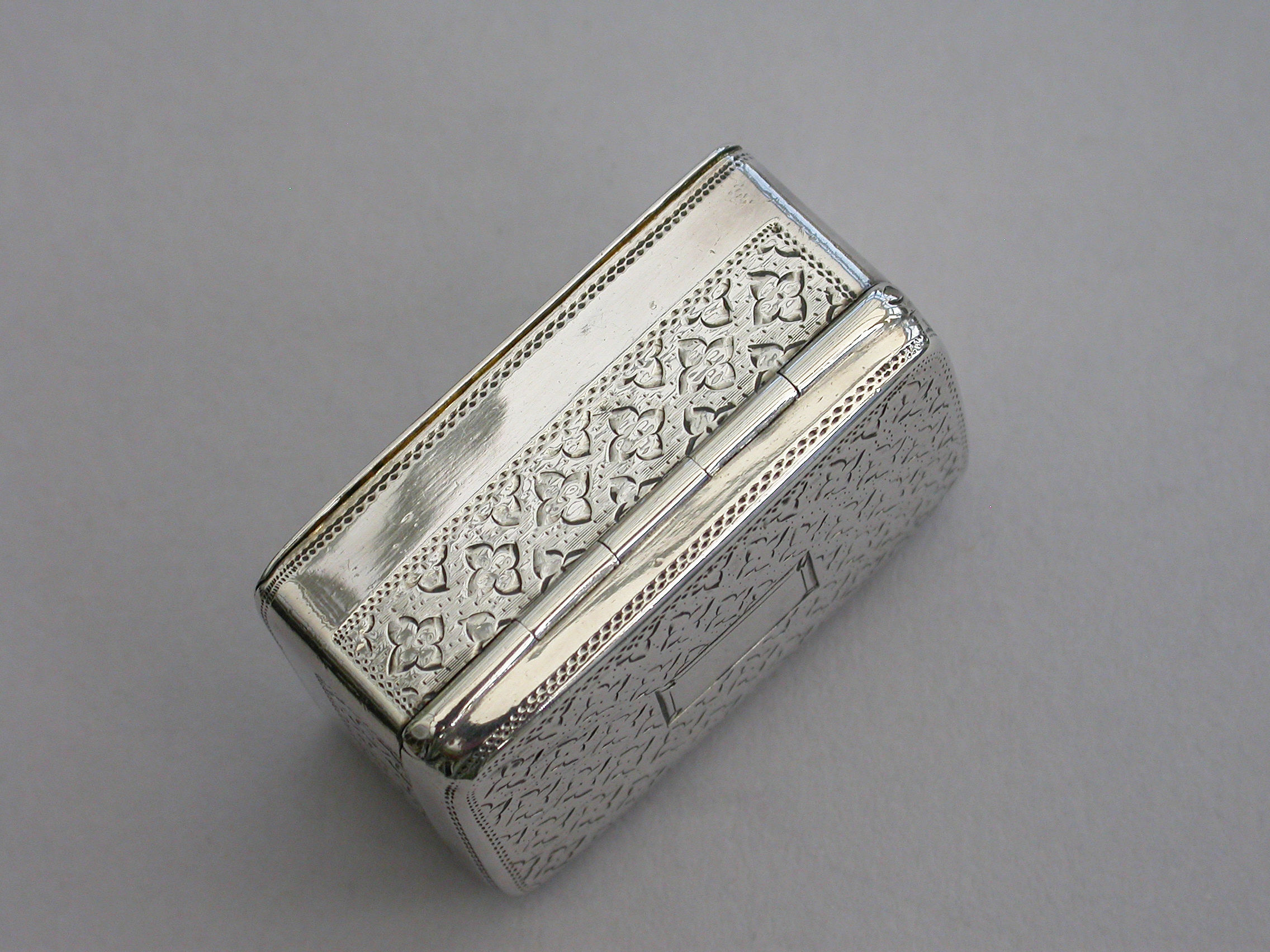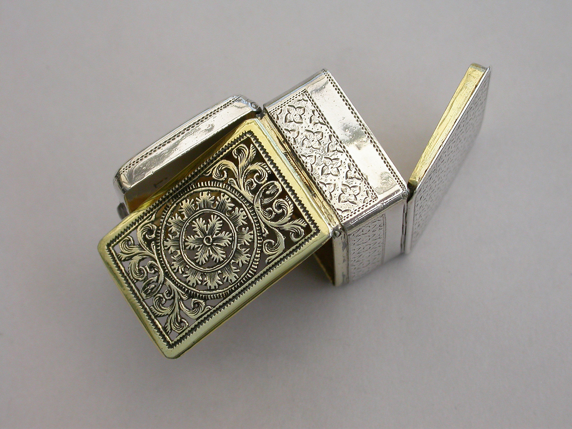 A rare George III silver combination Vinaigrette and Snuff or Cachous Box, of deep rectangular form with bright-cut engraved flower head decoration, a vacant rectangular cartouche to the lid. The silver gilt grille pierced with a central flower head.