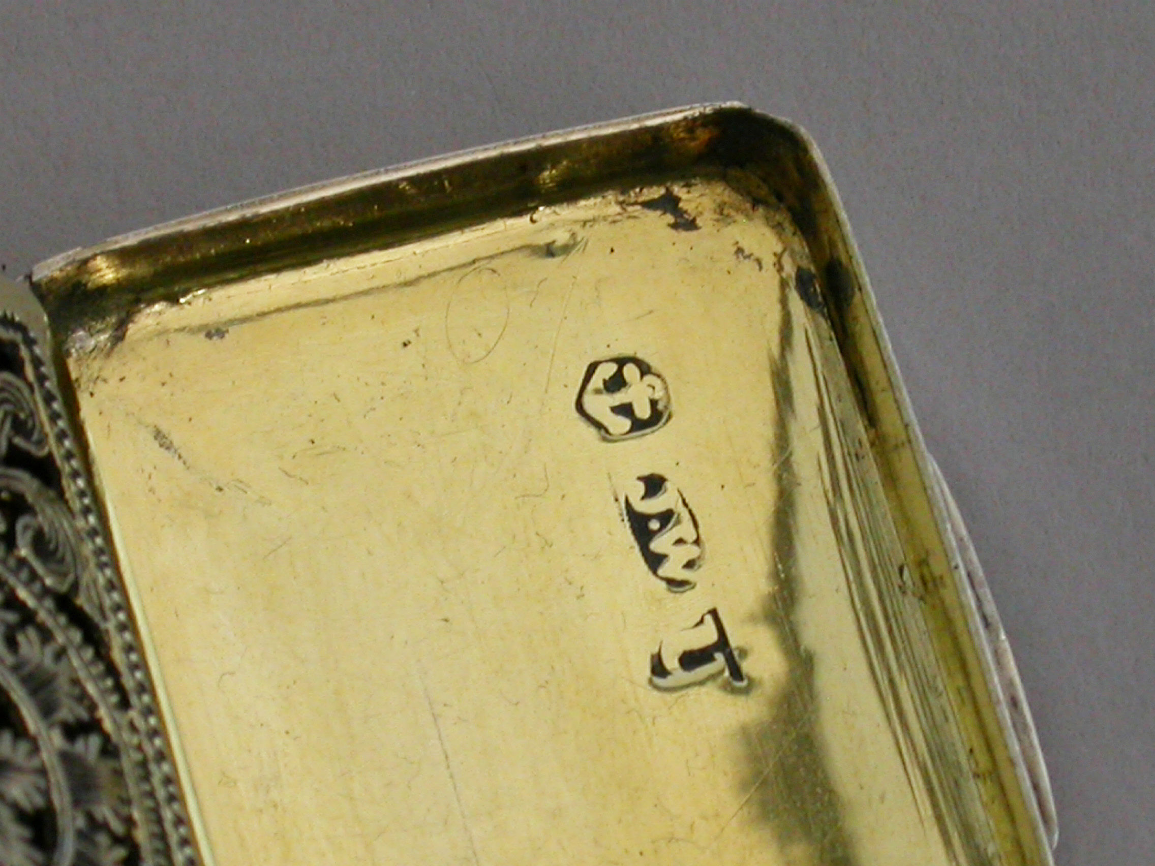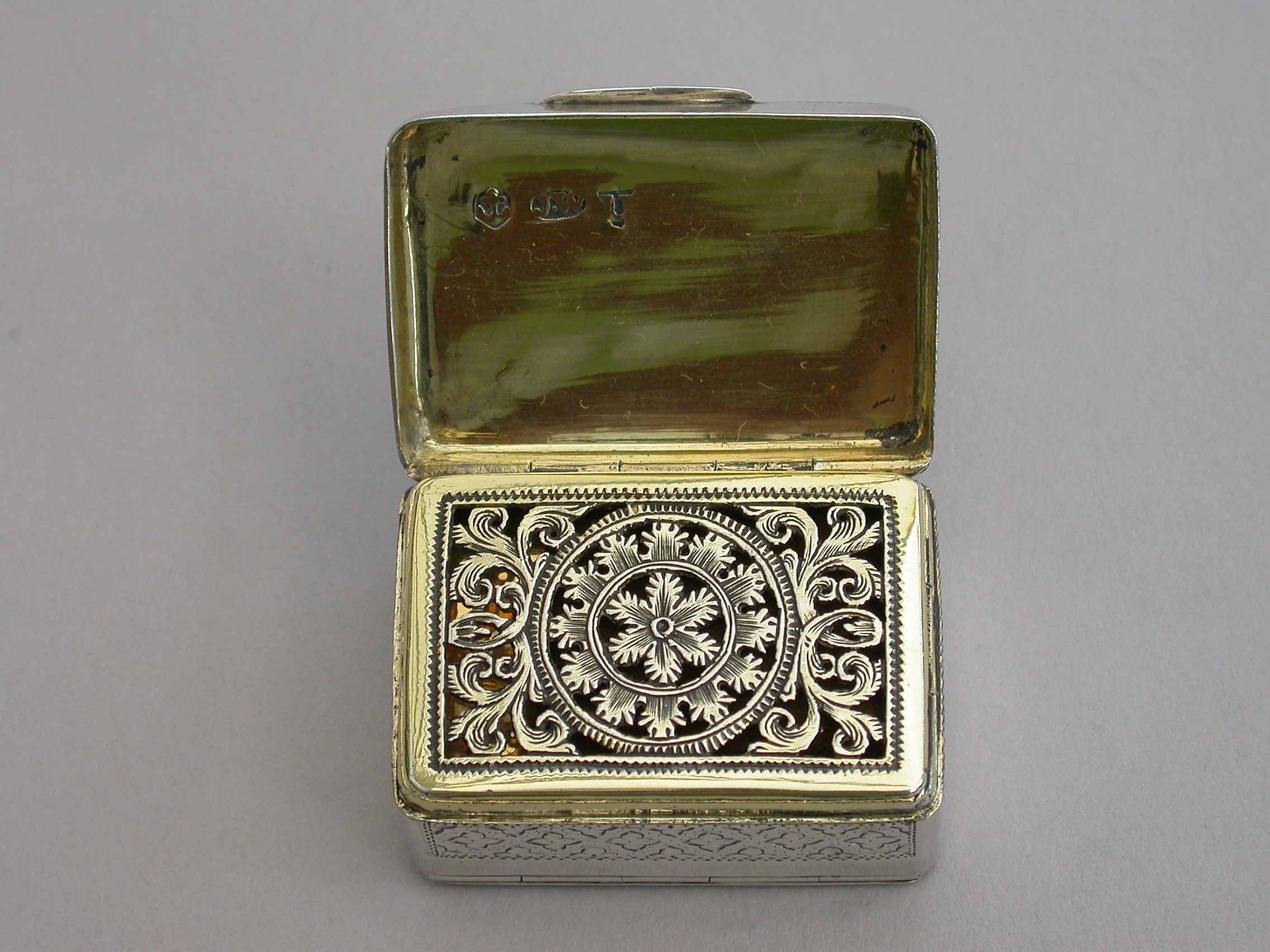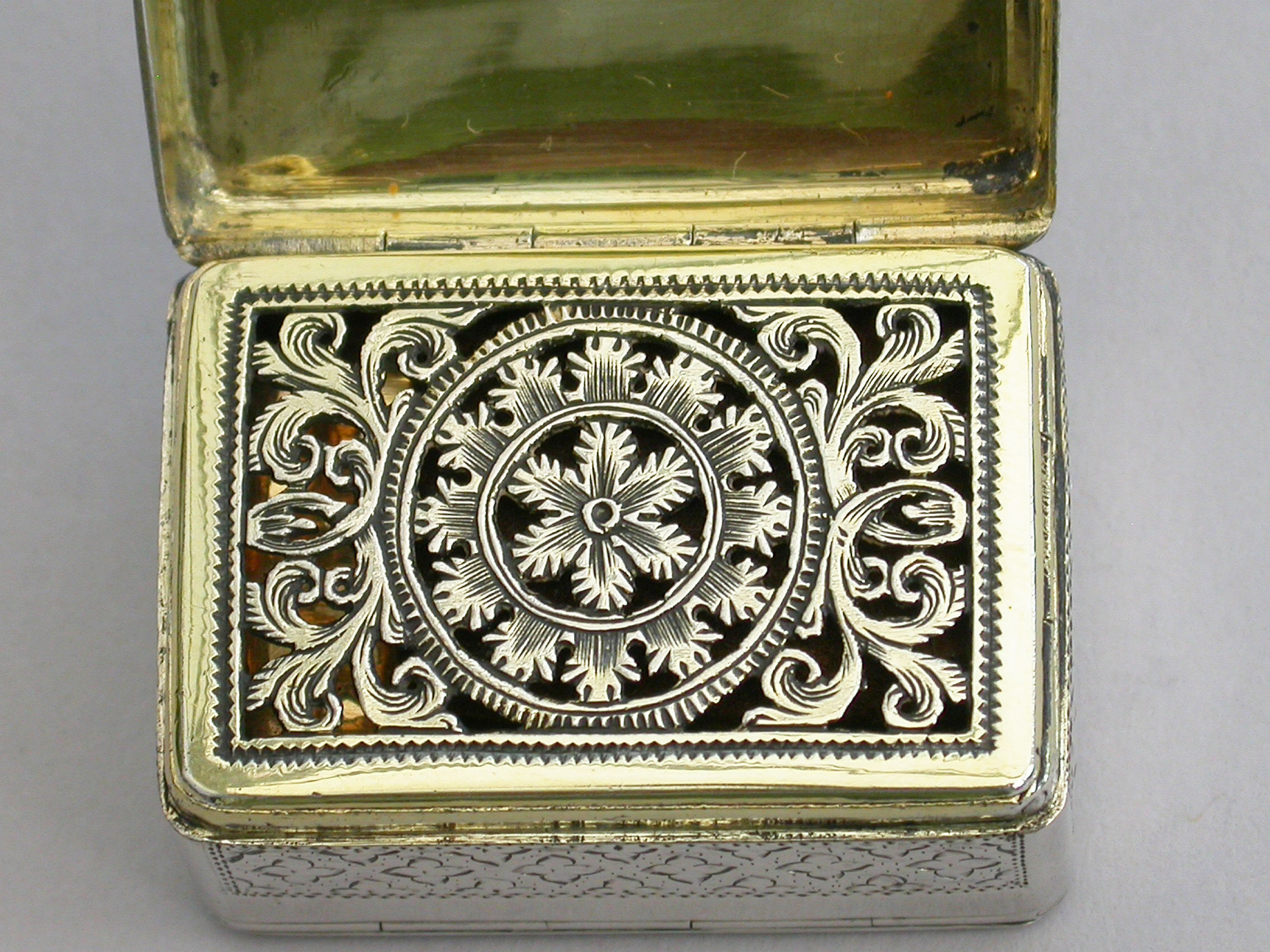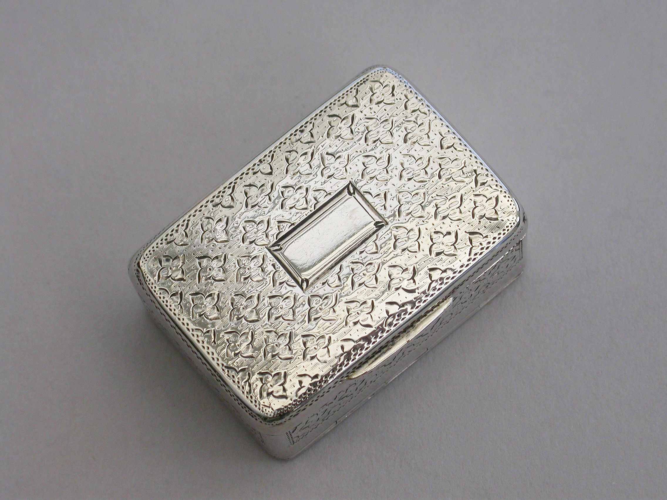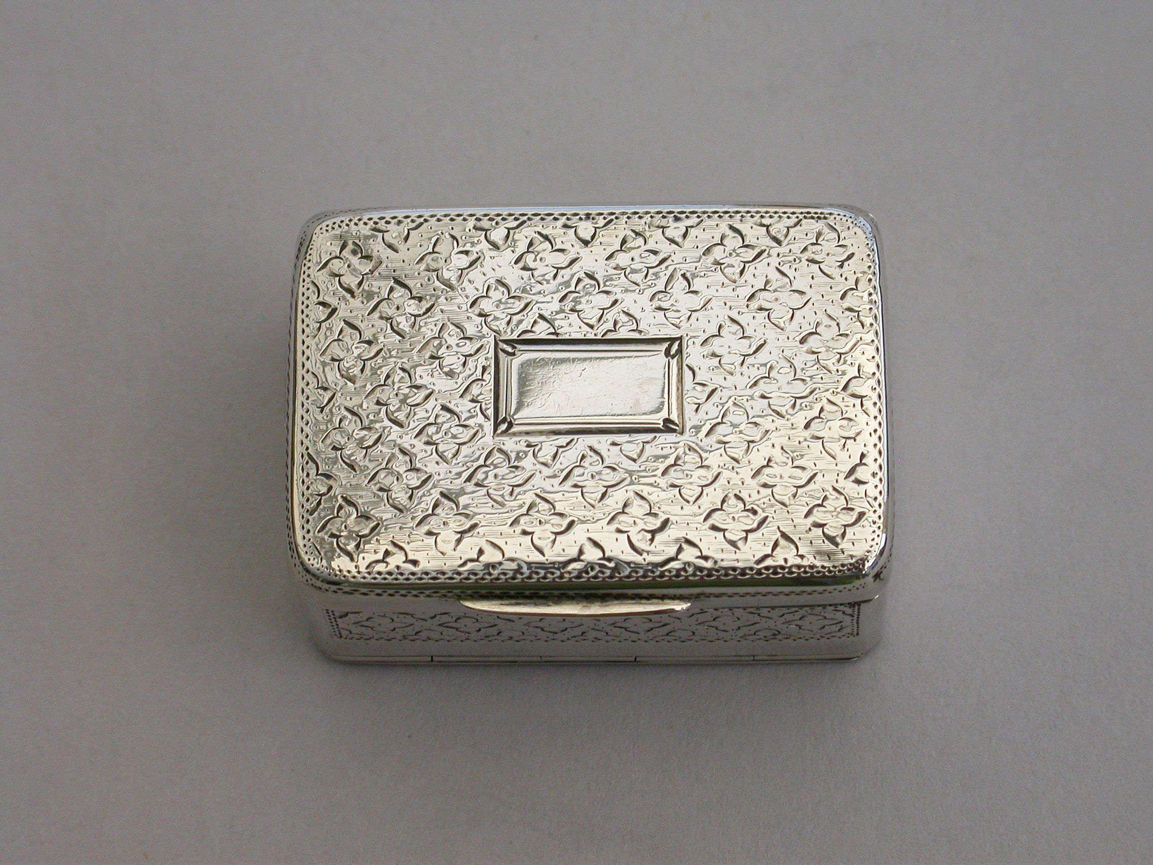 A rare George III silver combination Vinaigrette and Snuff or Cachous Box, of deep rectangular form with bright-cut engraved flower head decoration, a vacant rectangular cartouche to the lid. The silver gilt grille pierced with a central flower head.