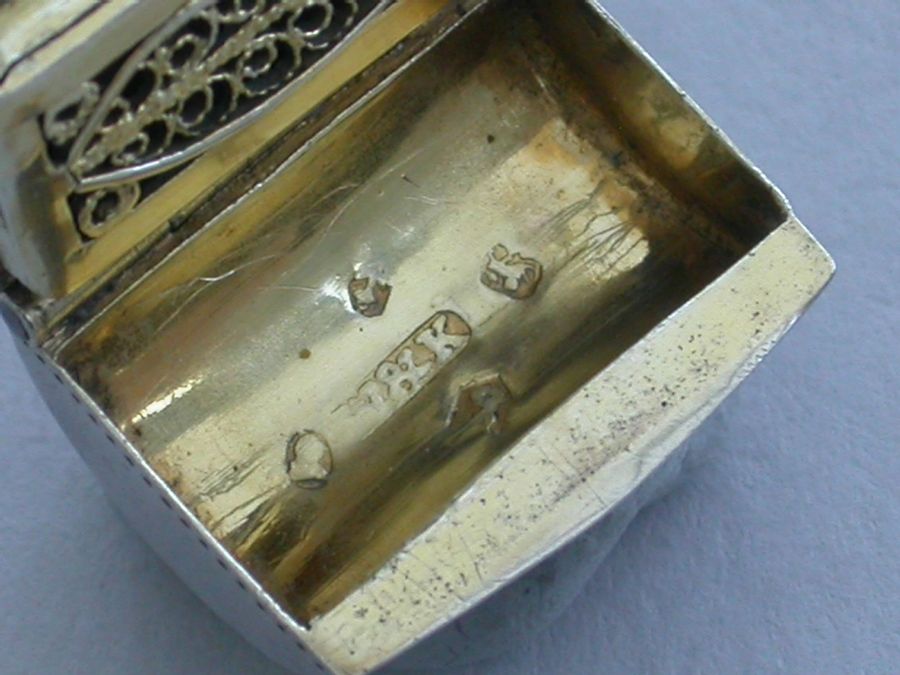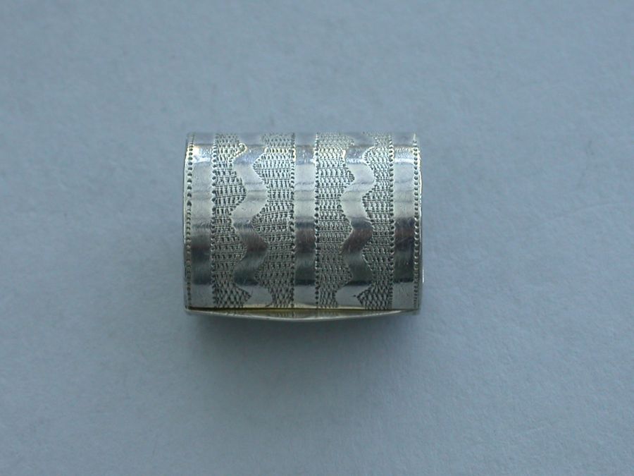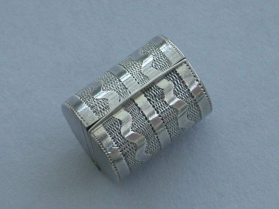 A rare George III silver Vinaigrette of cylindrical drum shape, bright-cut engraved with bands of wavy decoration. Pierced silver gilt filigree grille.