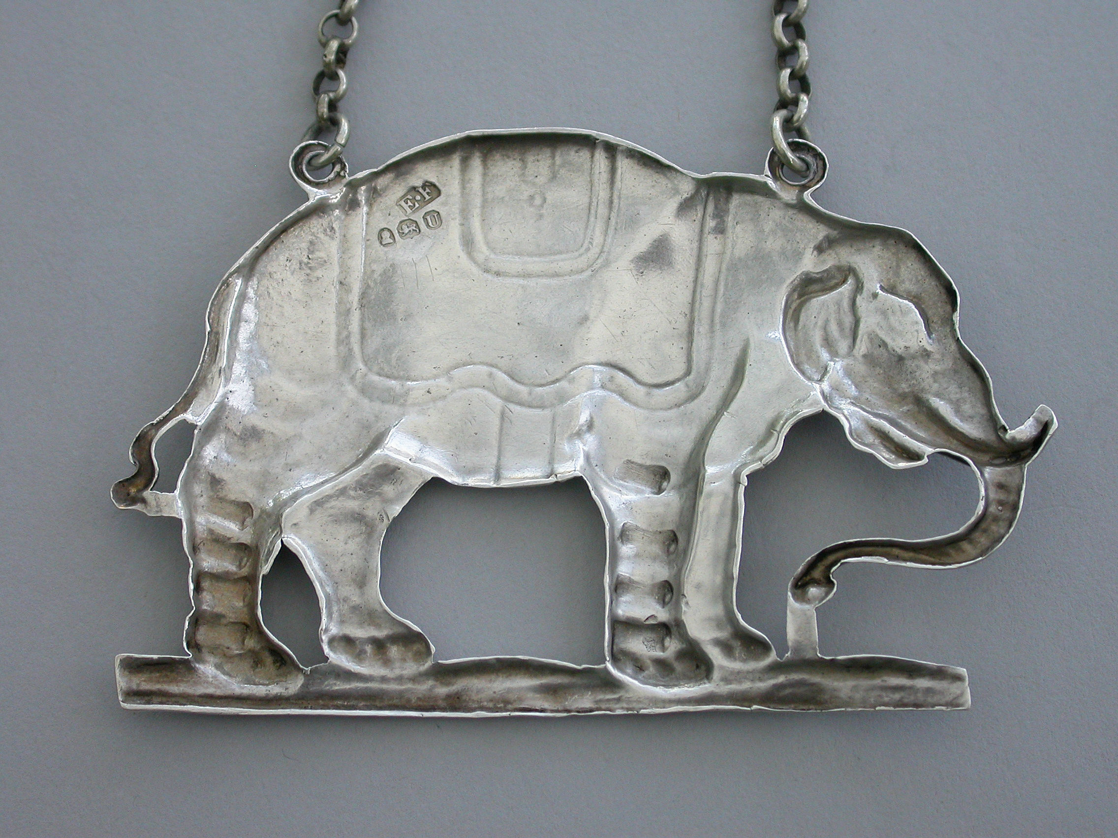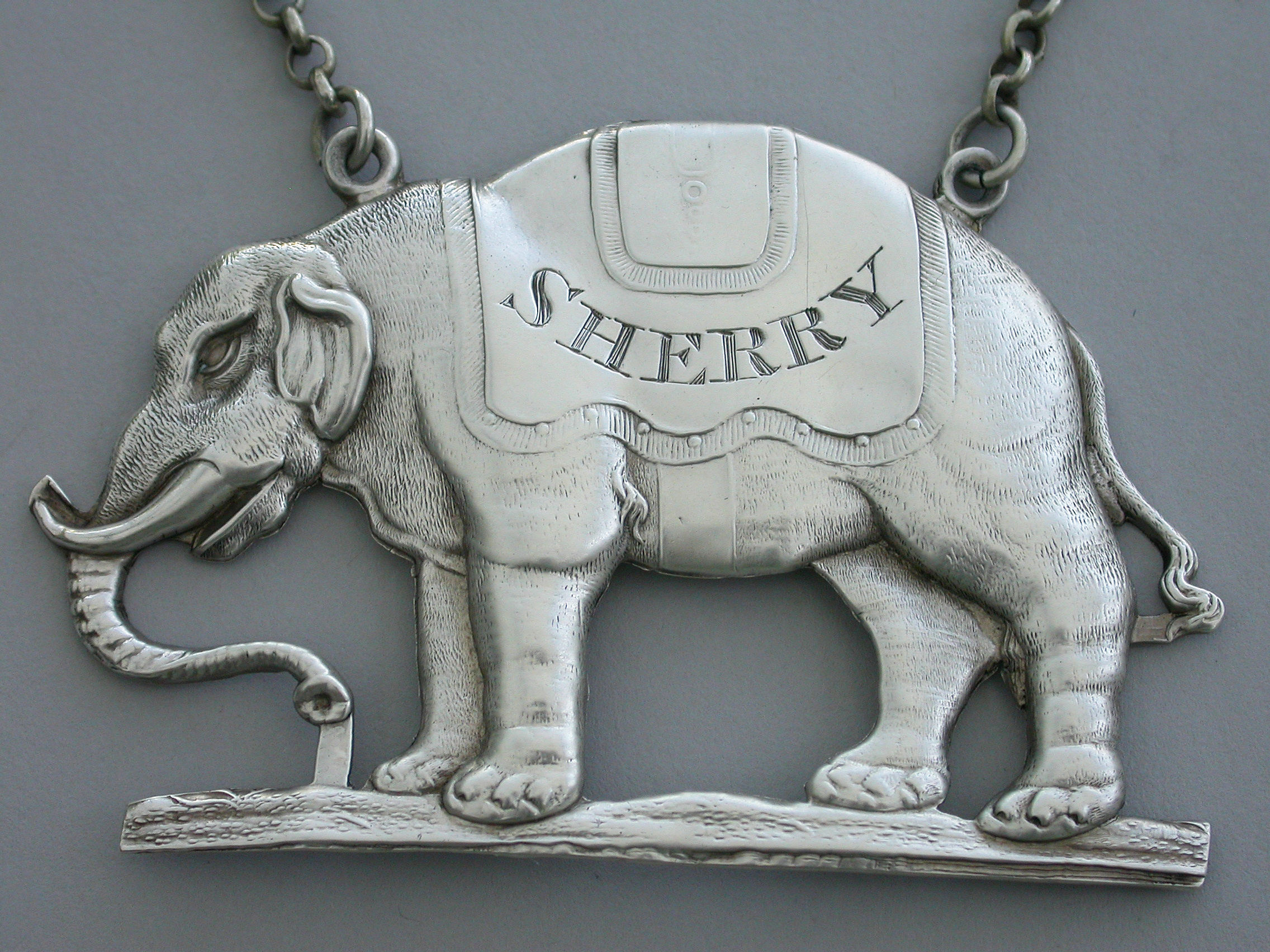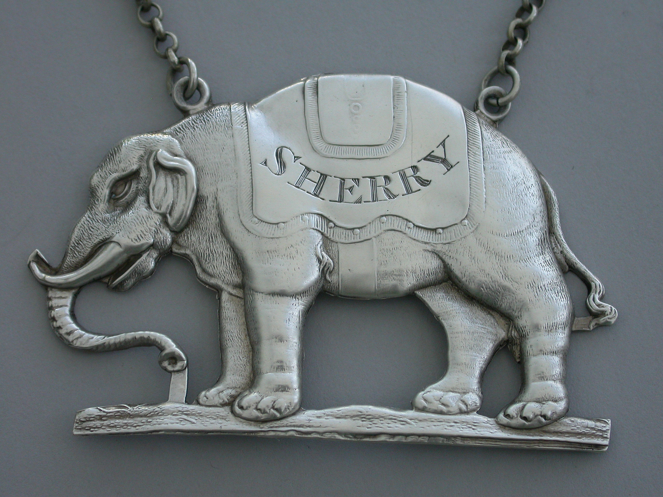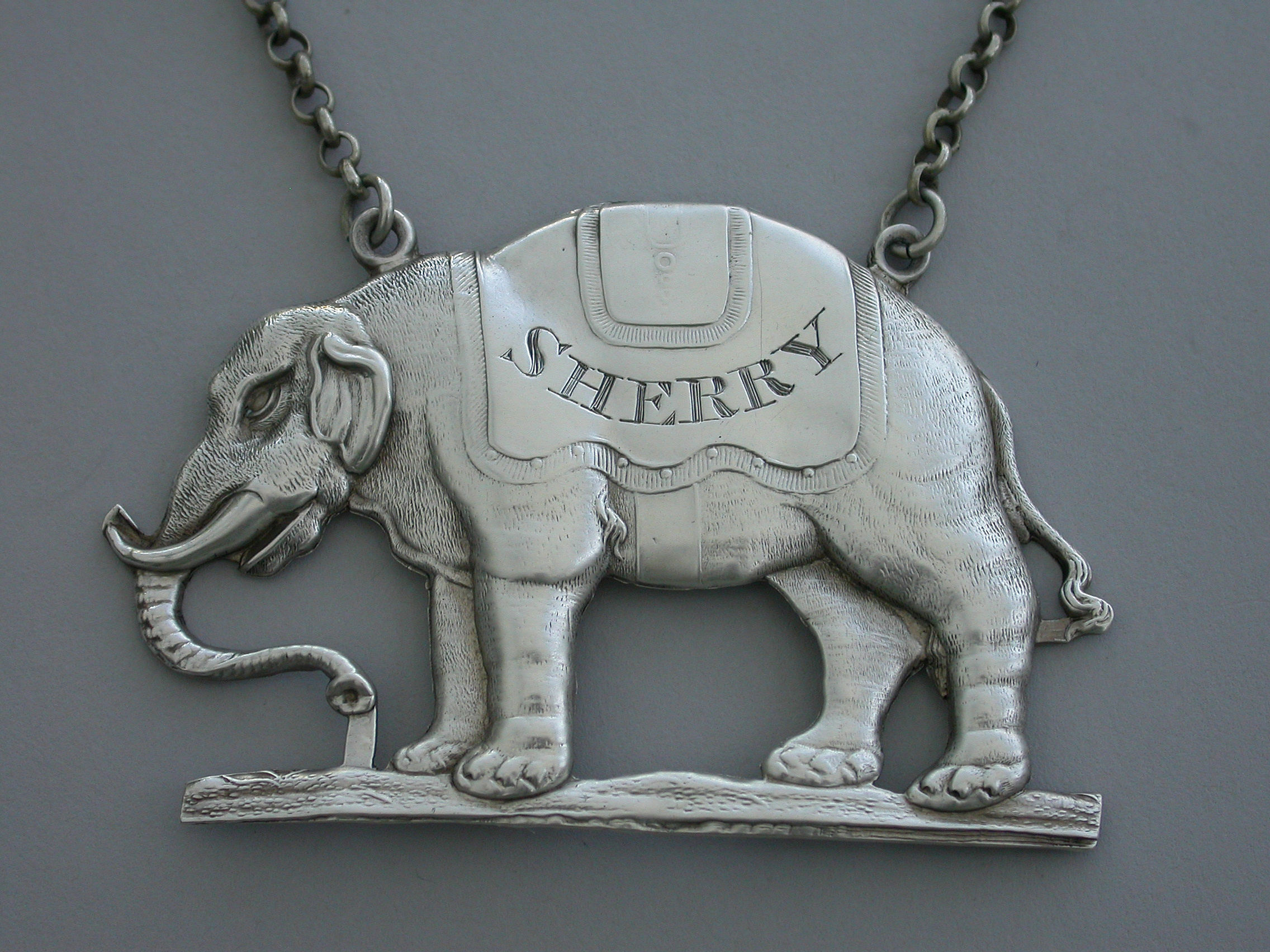An extremely rare large George III die-stamped silver Wine Label made in the form of a standing Indian elephant wearing a caparison engraved for Sherry.