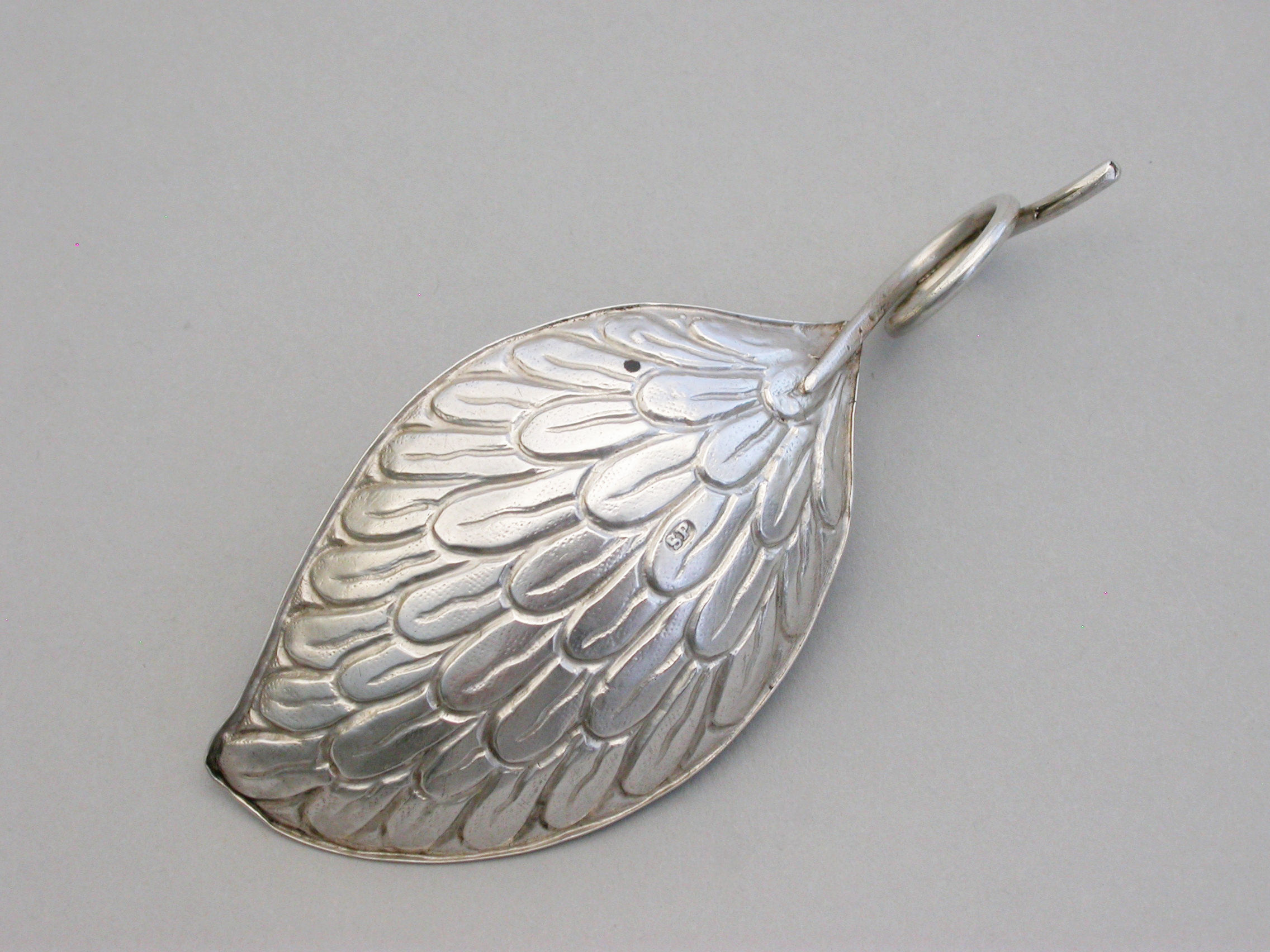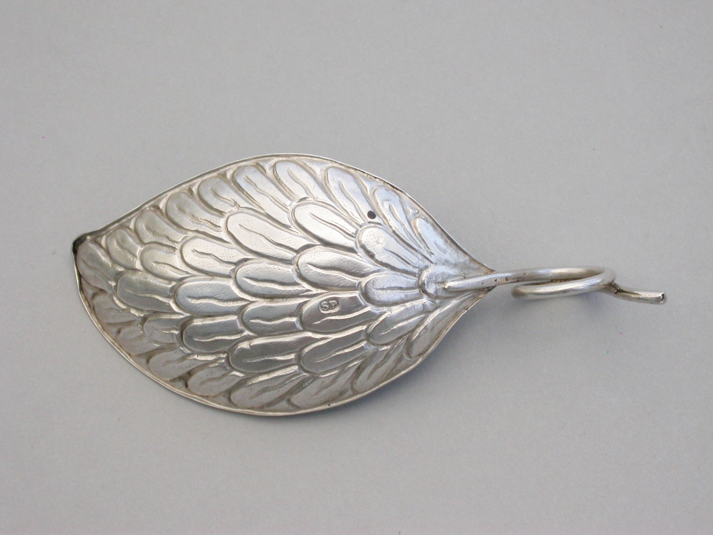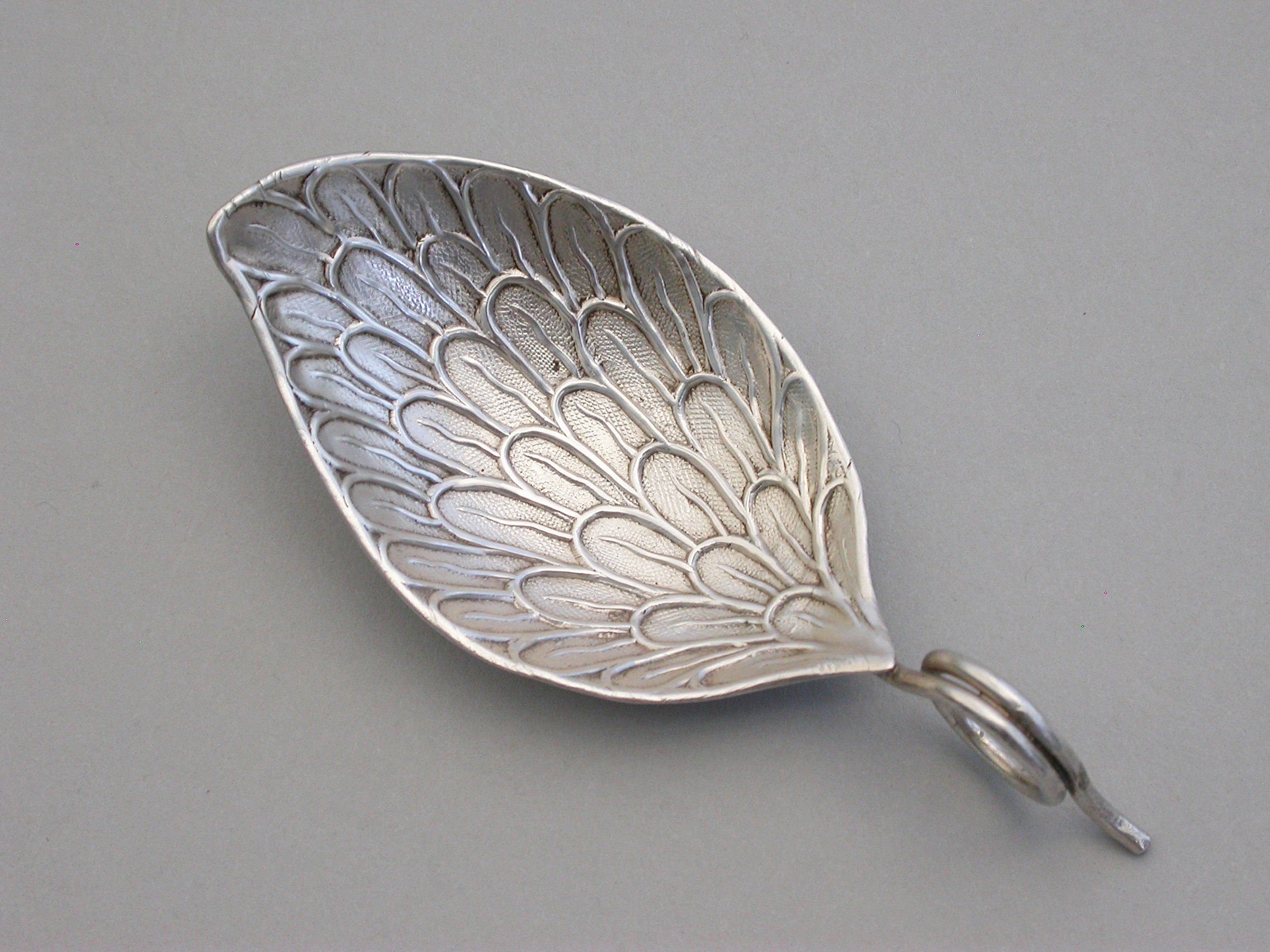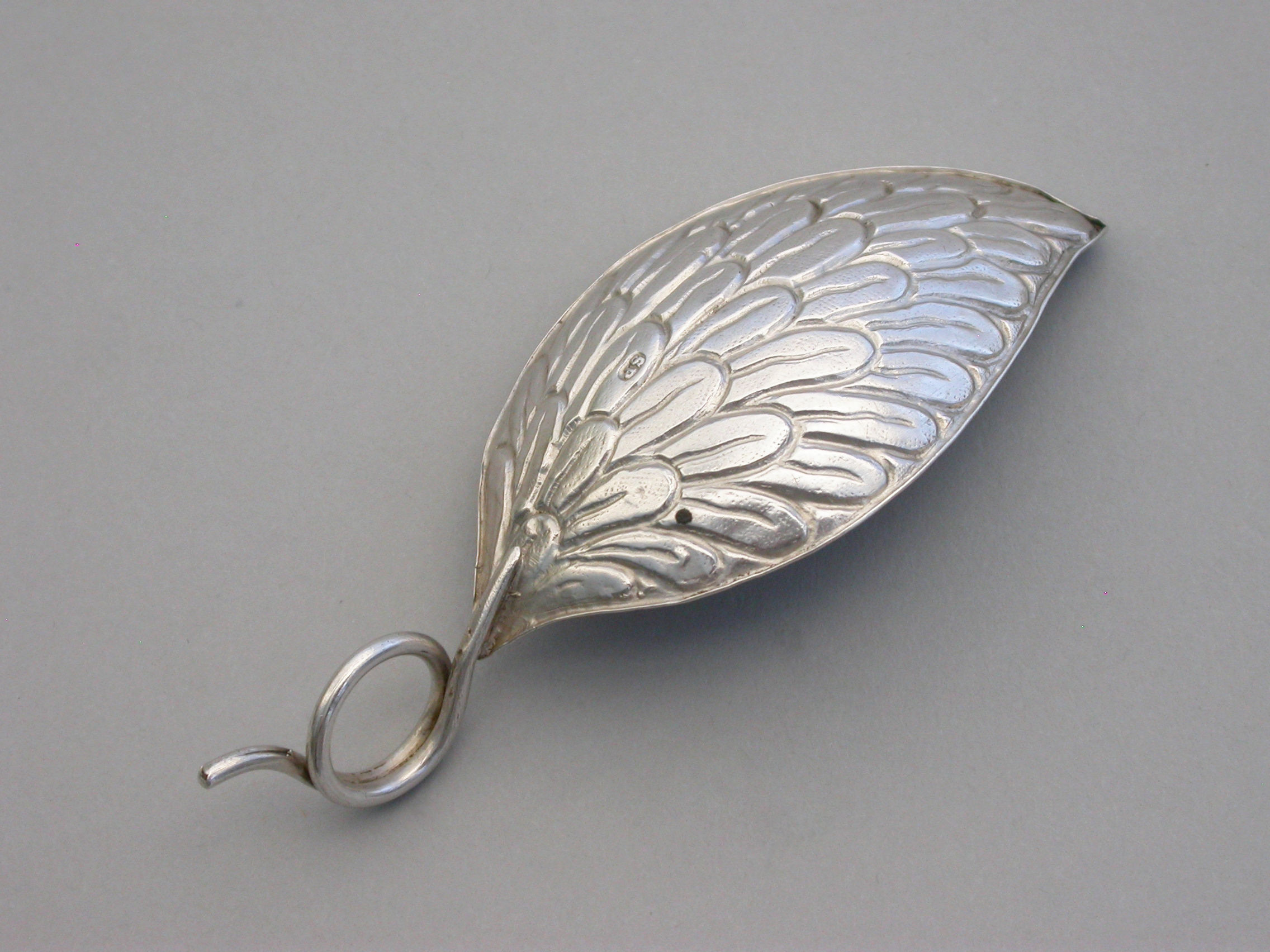 A George III die-stamped silver Caddy Spoon made in the form of a feather with twisted wire ring handle.