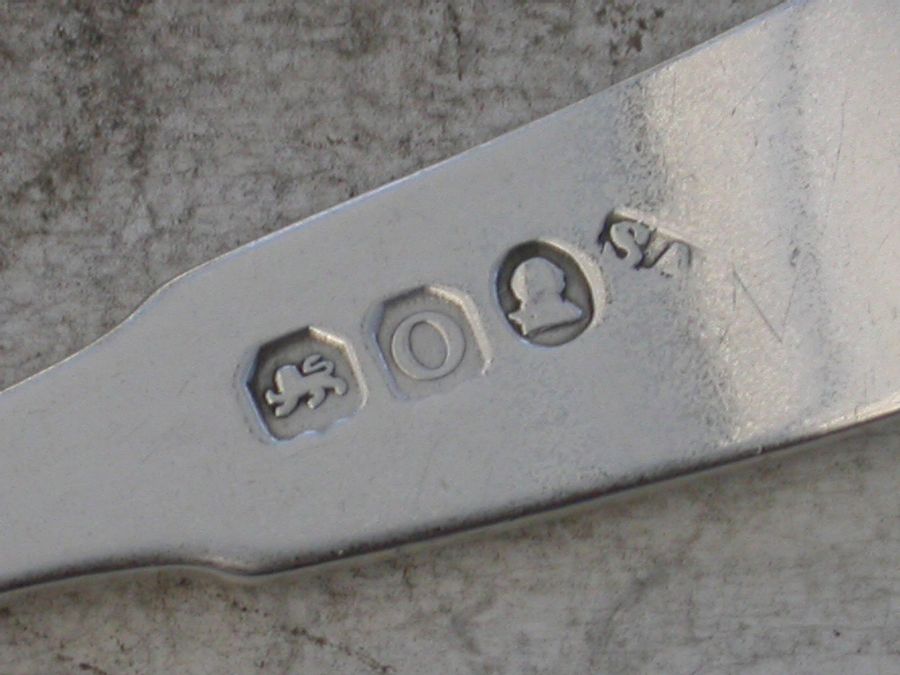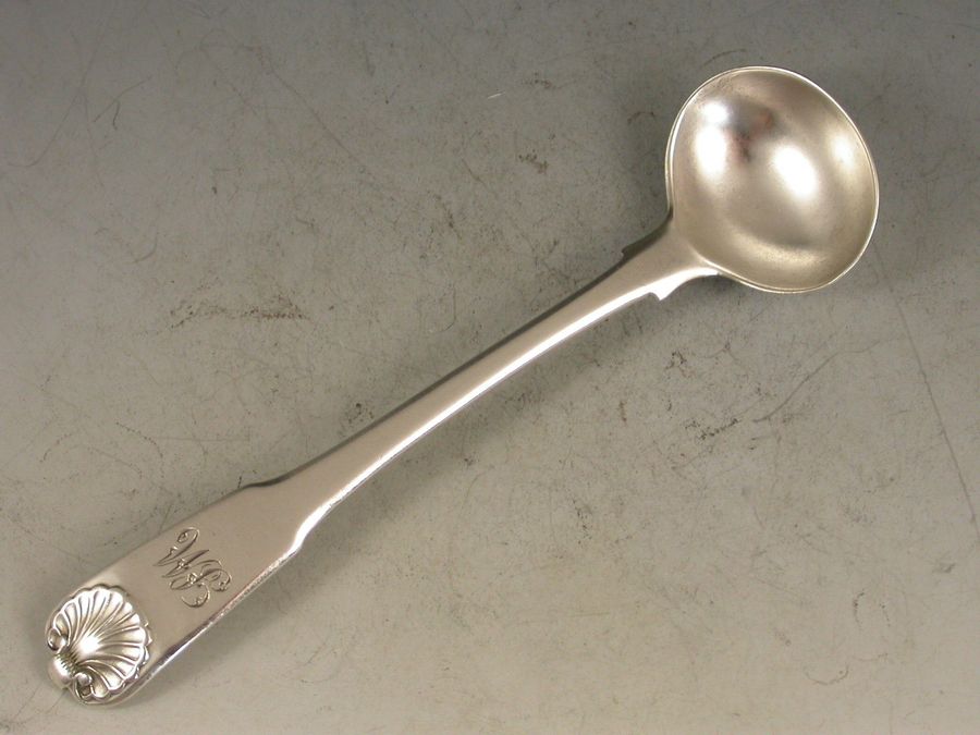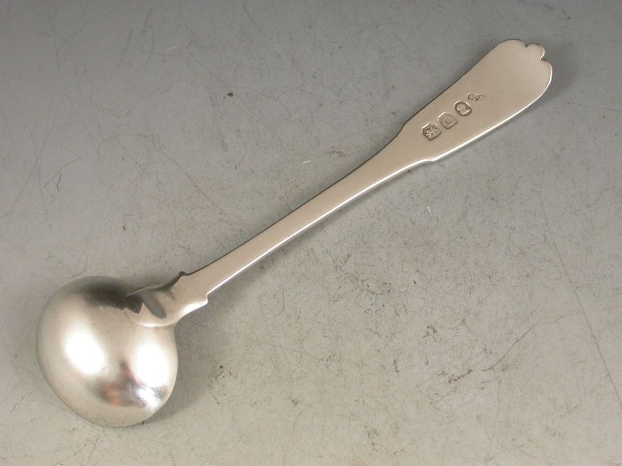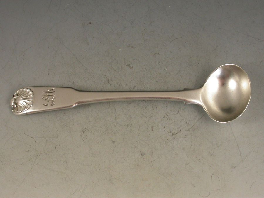 A good George III silver fiddle and shell pattern Salt Spoon with slightly unusual 'pip' to the top of the shell. The handle engraved with contemporary script initials.