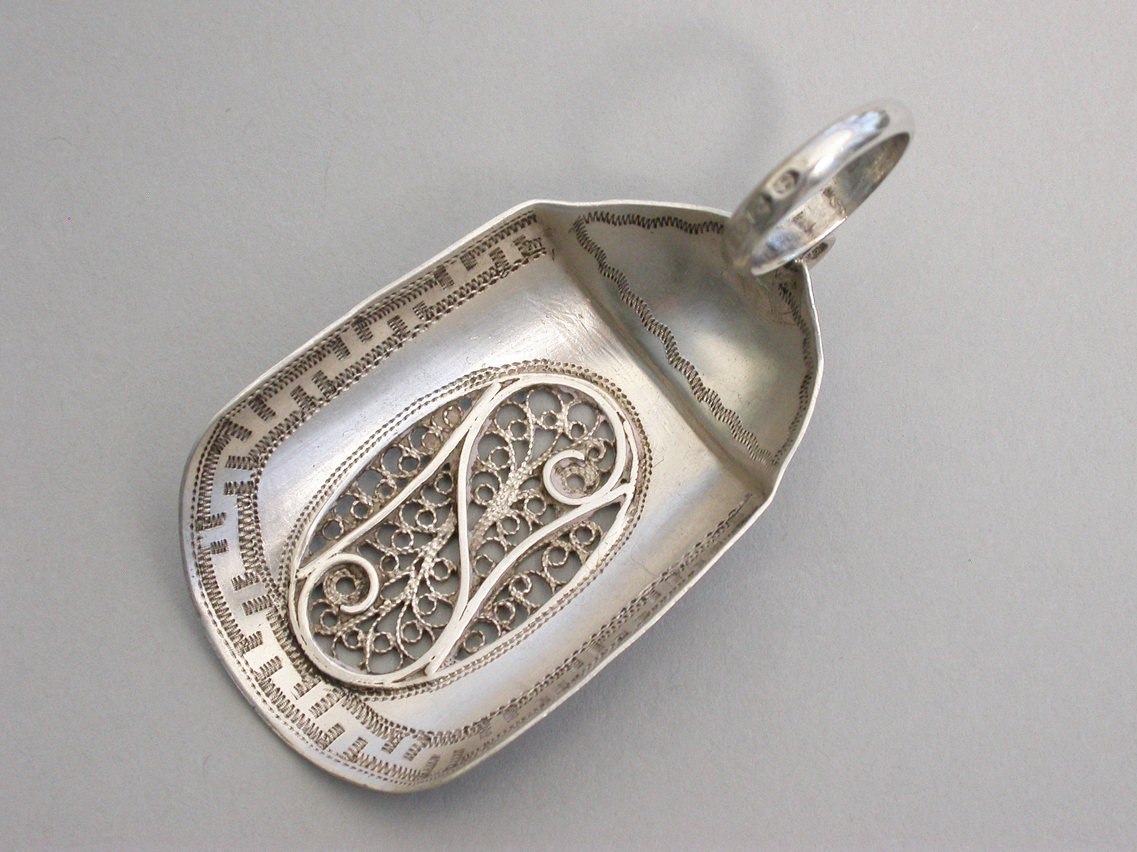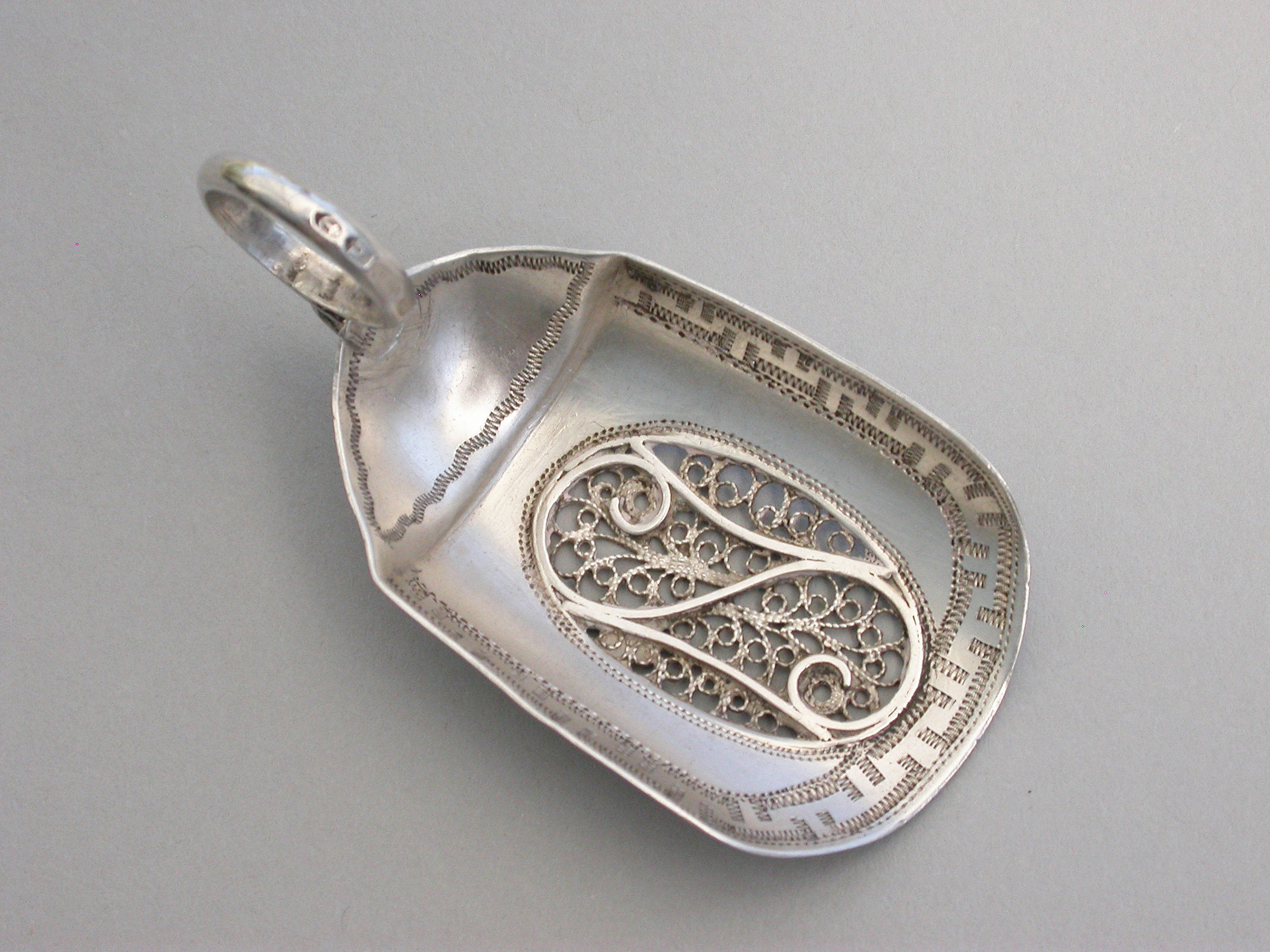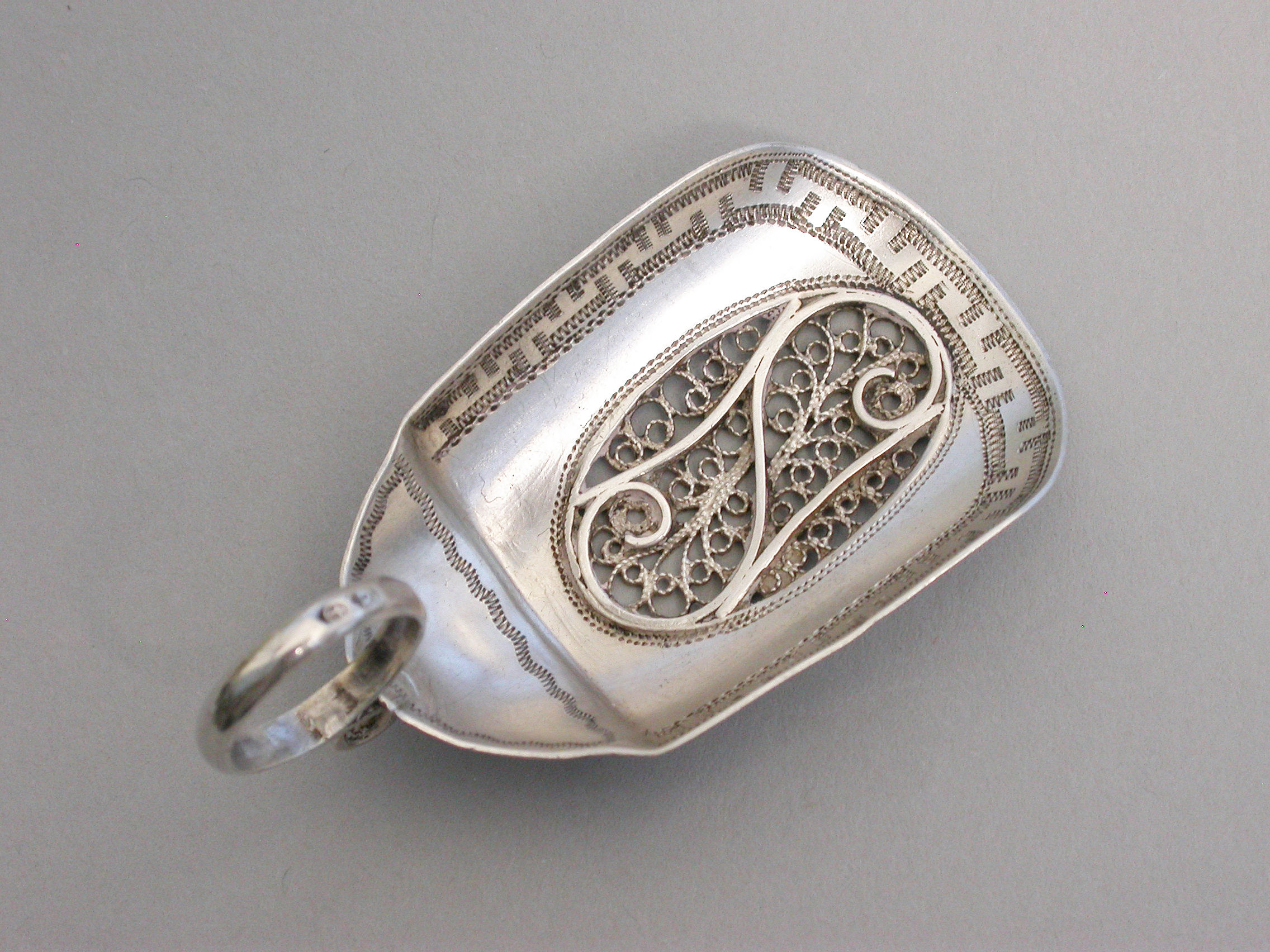 A good George III silver Caddy Spoon, the scoop shaped bowl with inset filigree panel and decorated with a band of prick-dot engraved decoration. Loop handle.