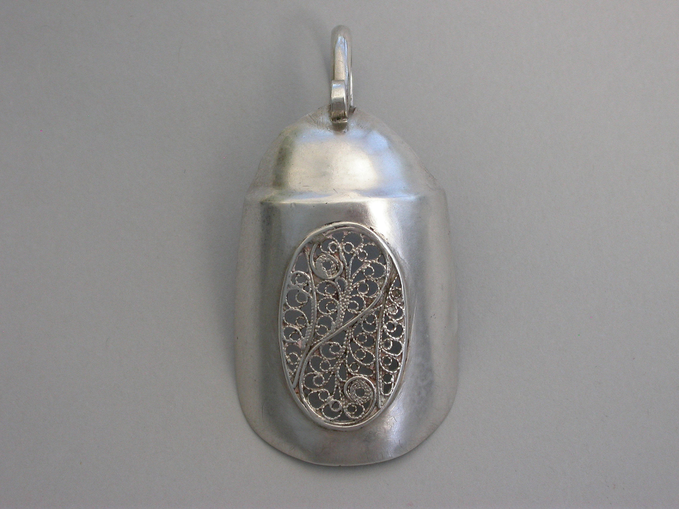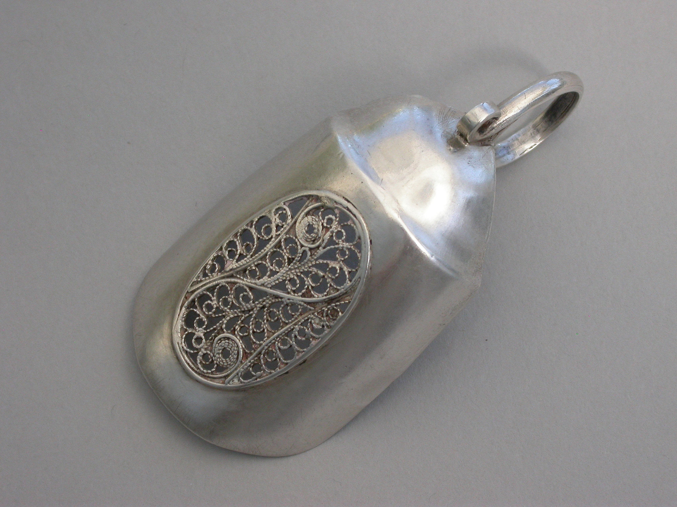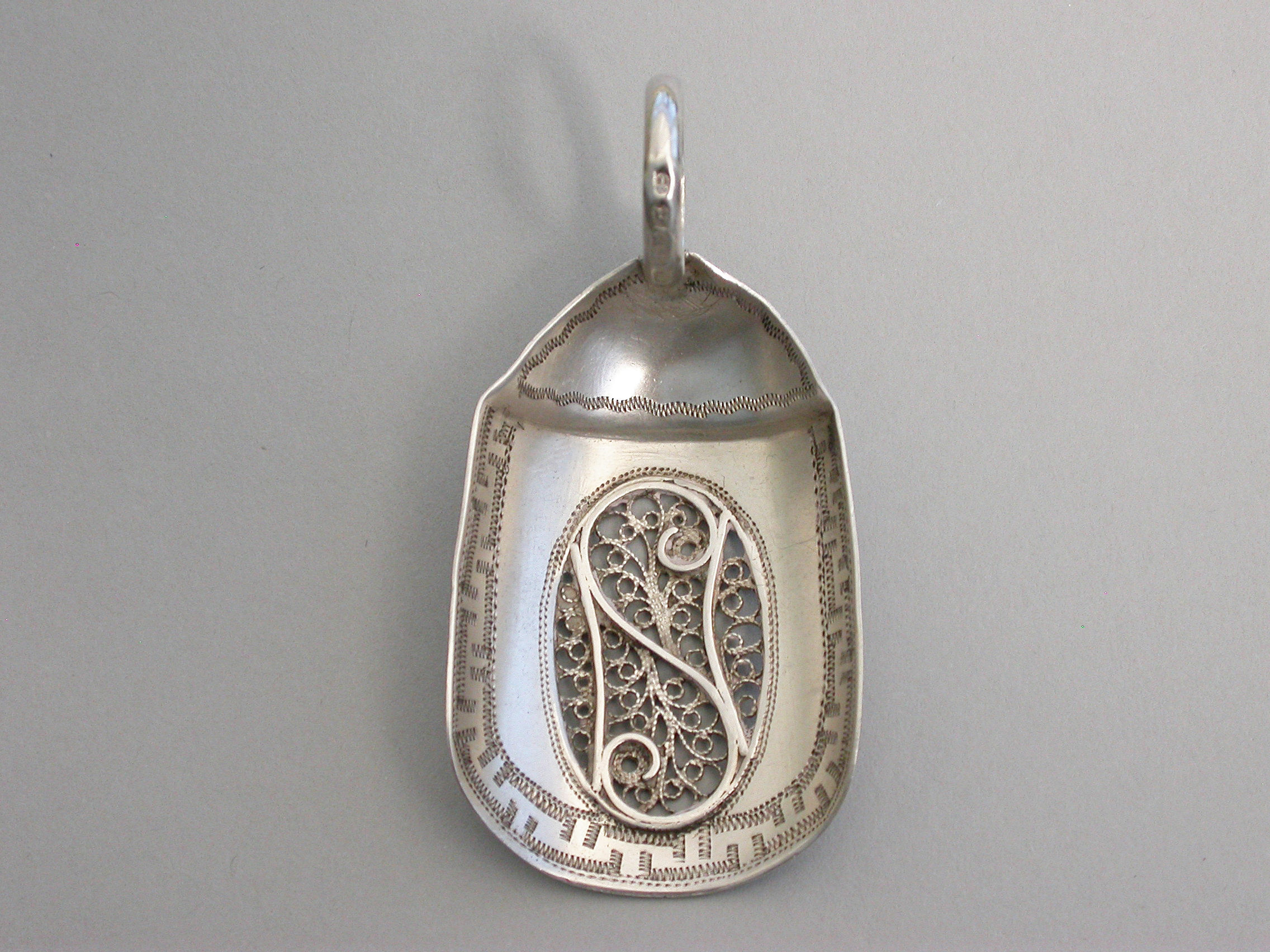 A good George III silver Caddy Spoon, the scoop shaped bowl with inset filigree panel and decorated with a band of prick-dot engraved decoration. Loop handle.