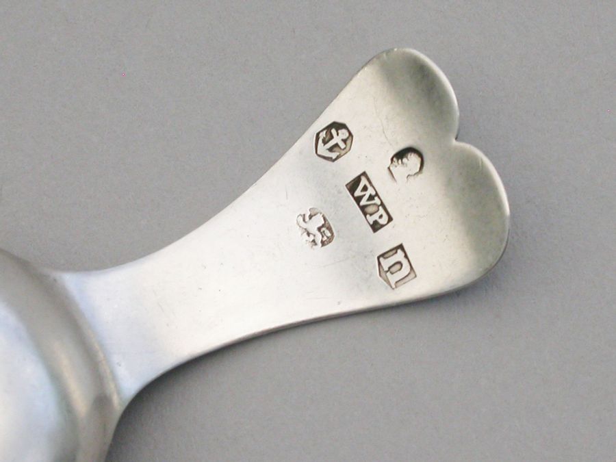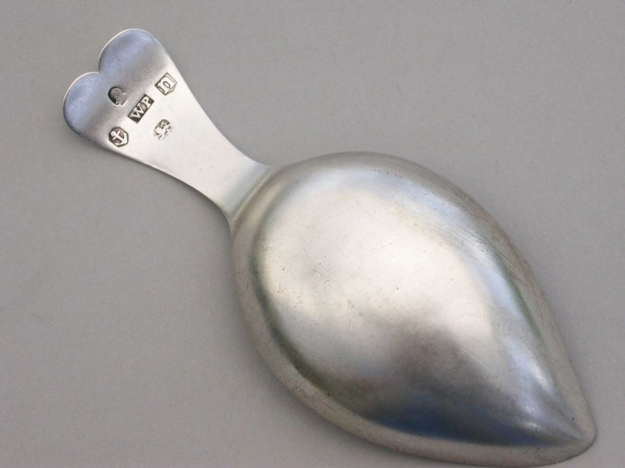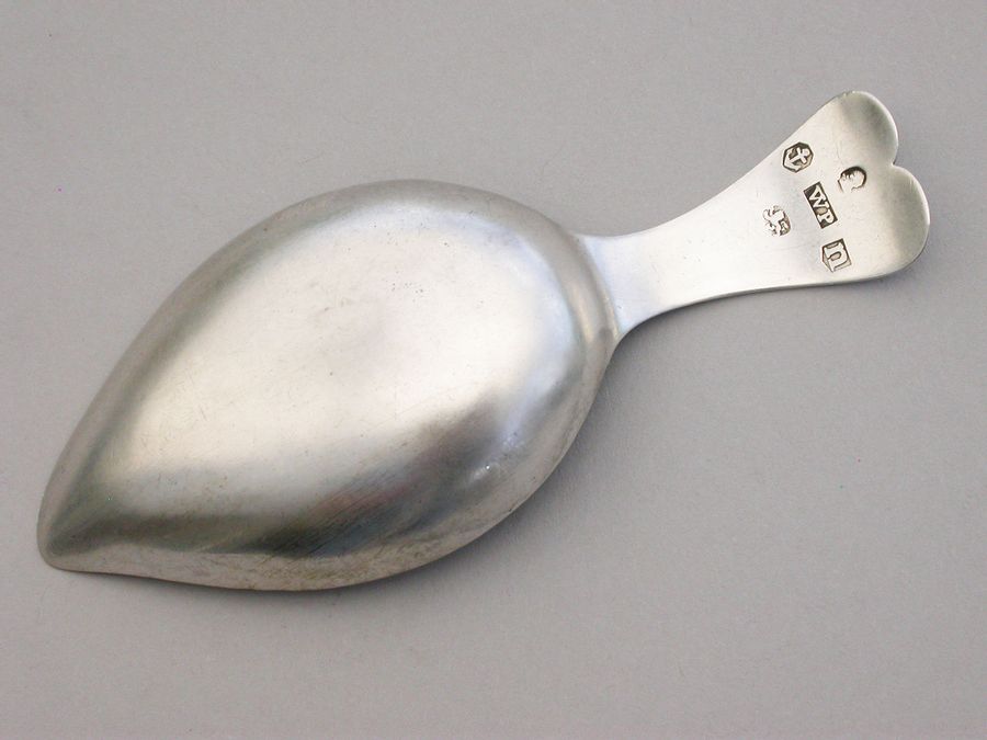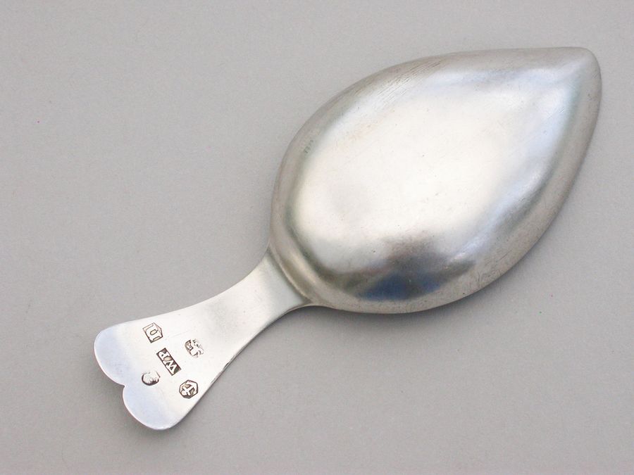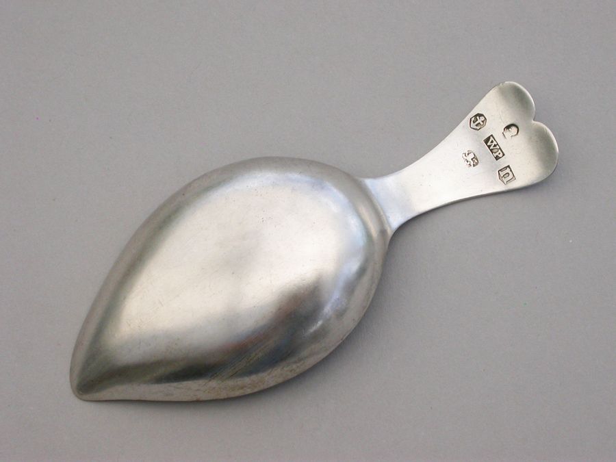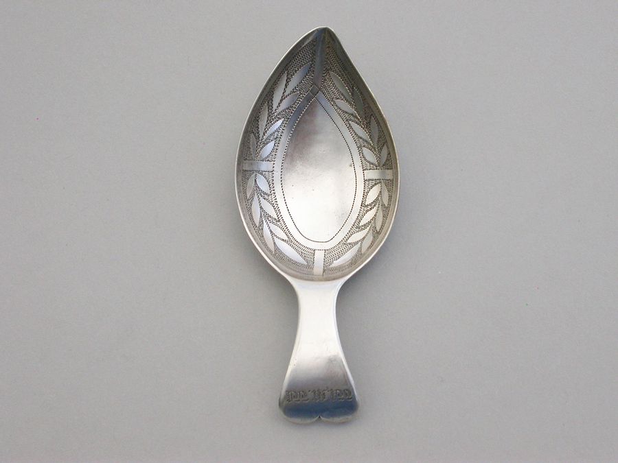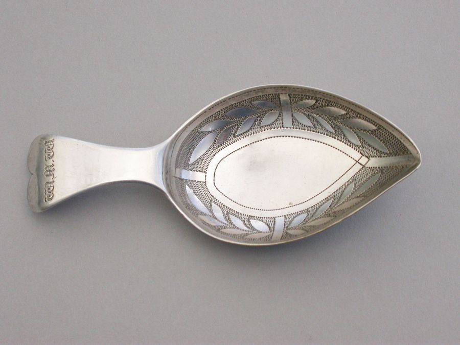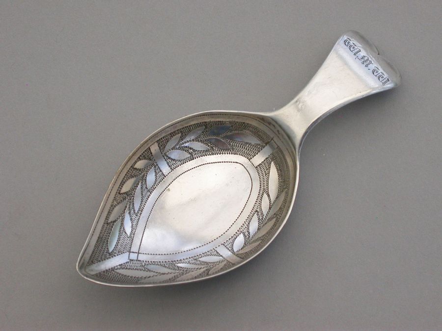 A fine George III silver Caddy Spoon with fishtail handle and bright-cut engraved leaf shaped bowl.