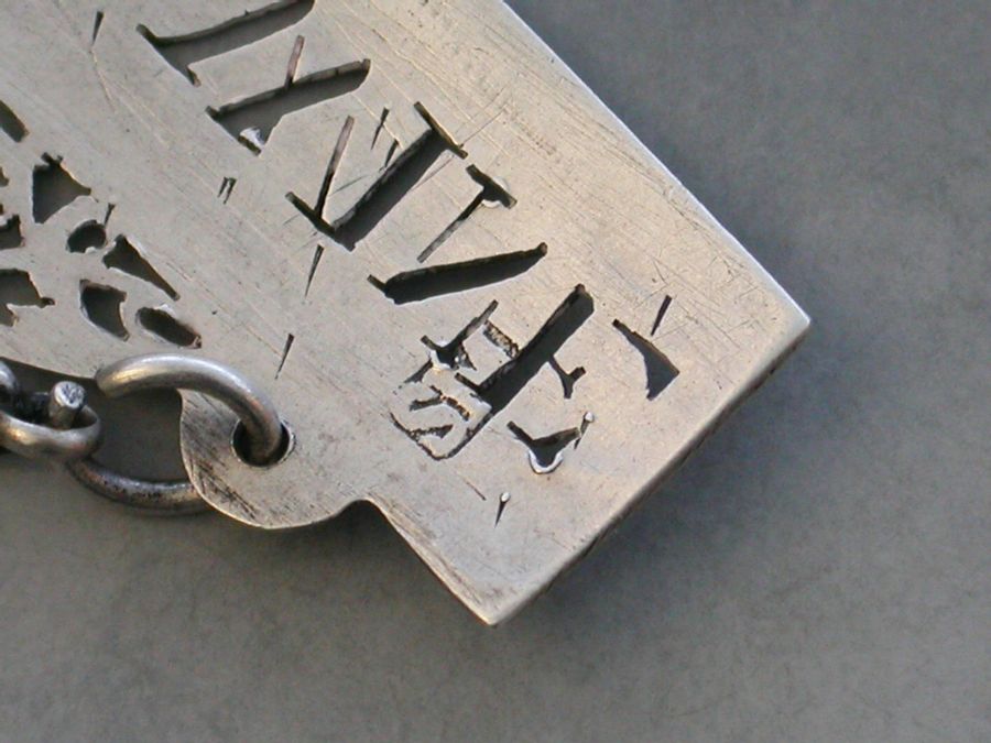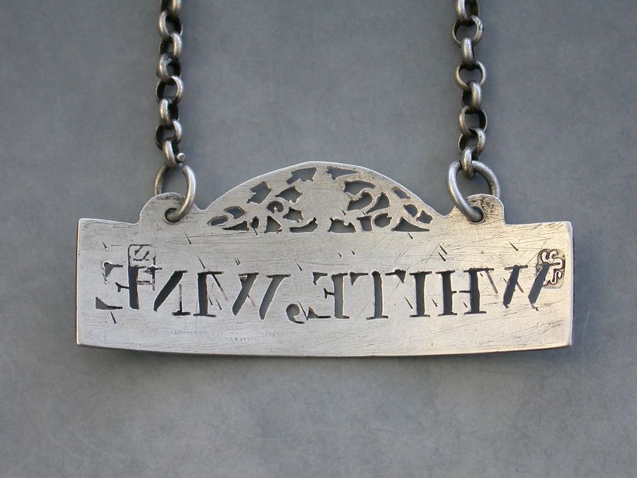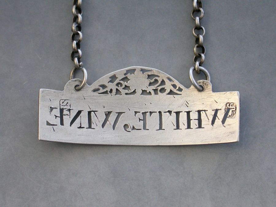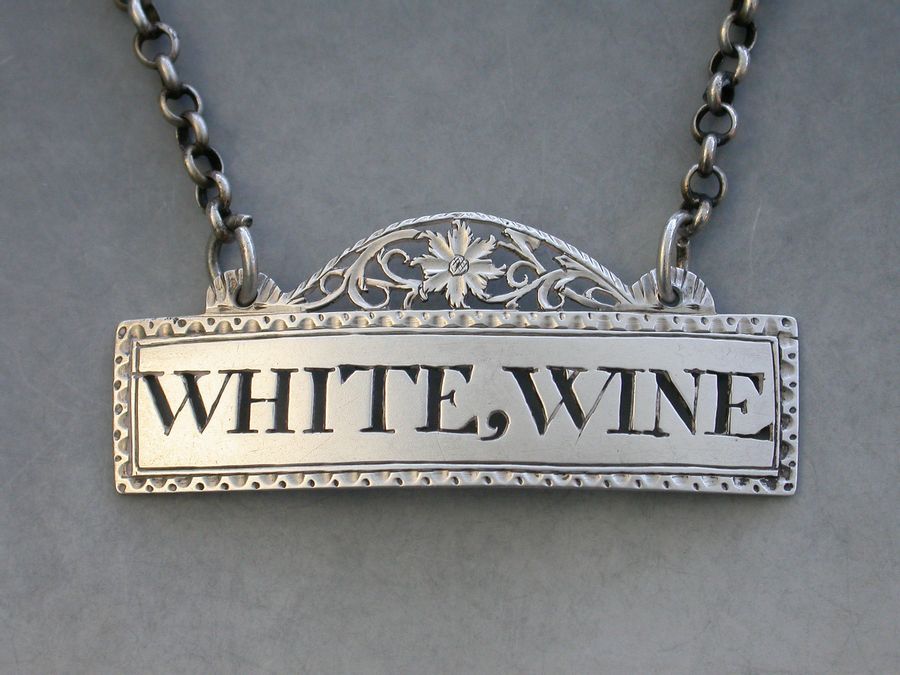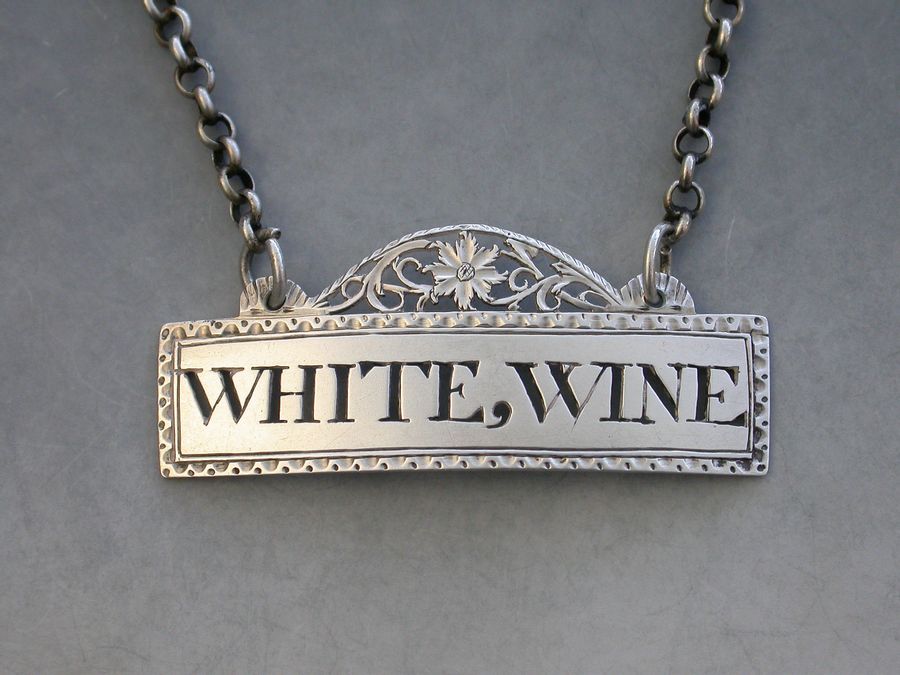 George III Silver Fret Domed Rectangular Wine Label 'White (comma) Wine'