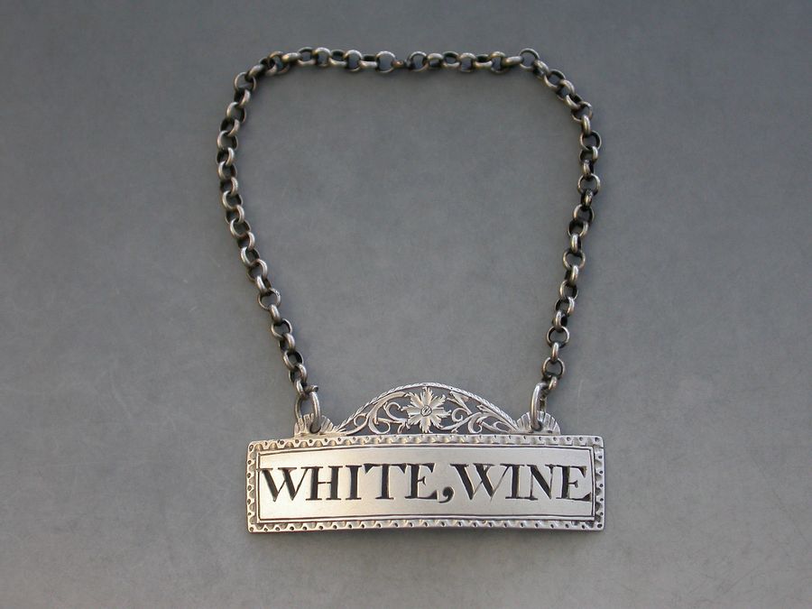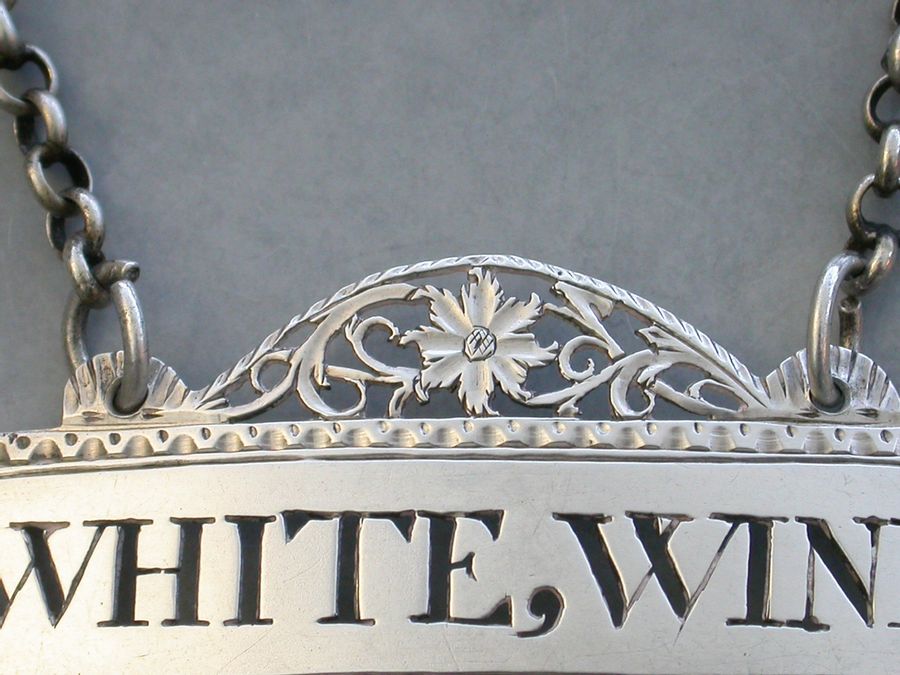 A fine George III silver Wine Label of rectangular form with bright-cut engraved border, the fret domed surmount pierced with scrolls and a flower head, the nameplate pierced for White,(comma) Wine.