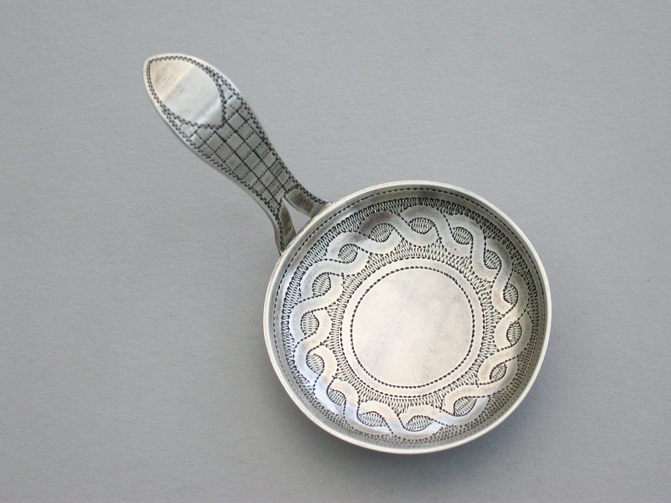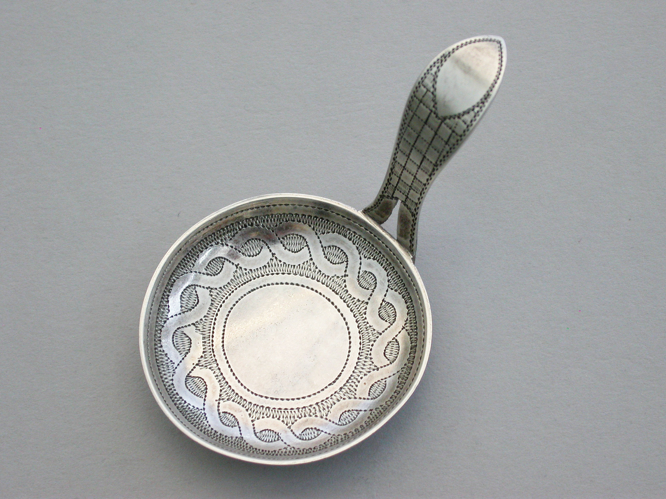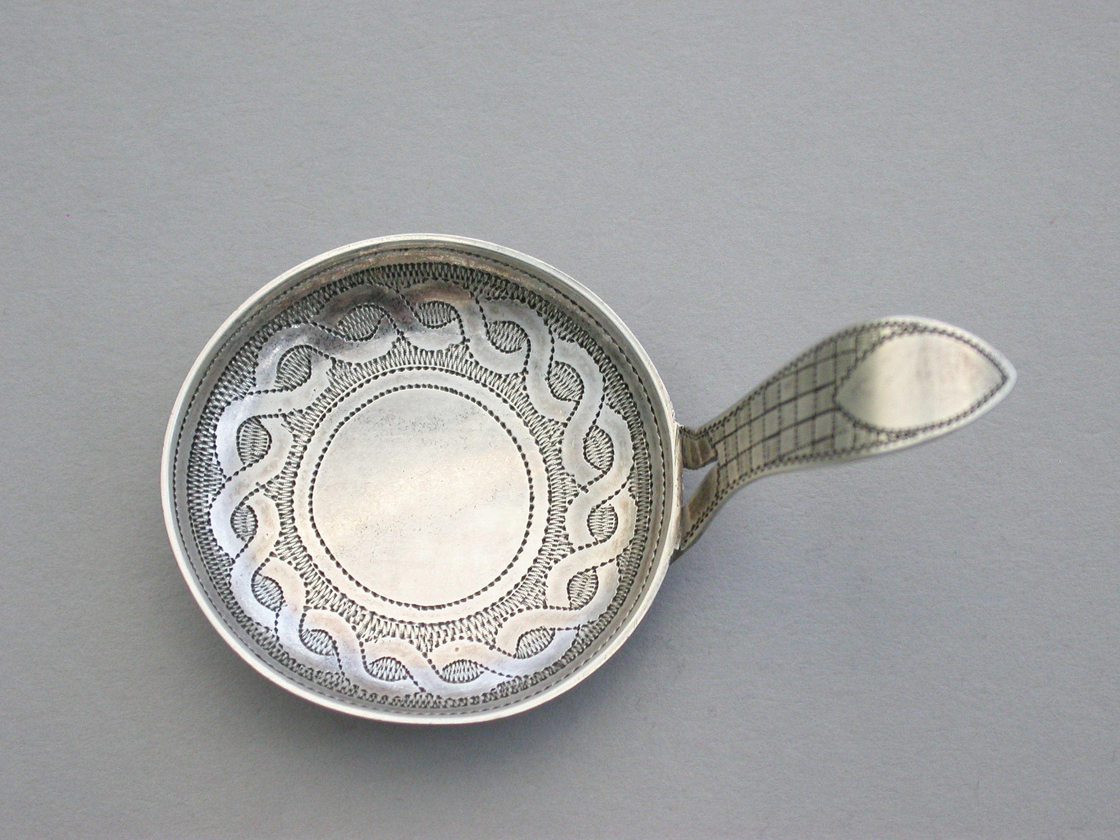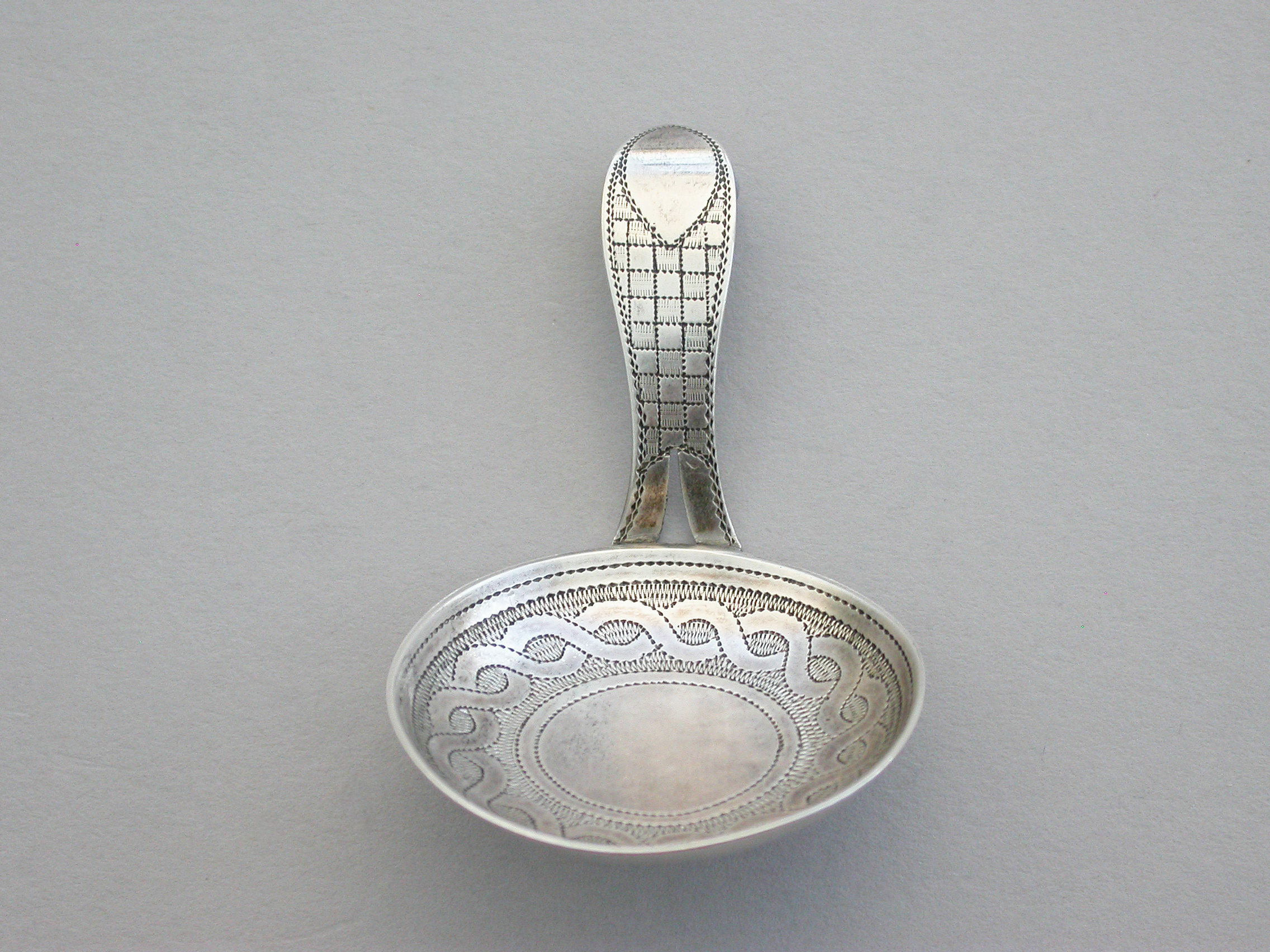 A rare George III silver Caddy Spoon of small size and of 'frying pan' form, the bi-furcated pointed Old English handle and bowl with bright-cut and prick-dot engraved decoration. The base of the bowl engraved with contemporary script initials.