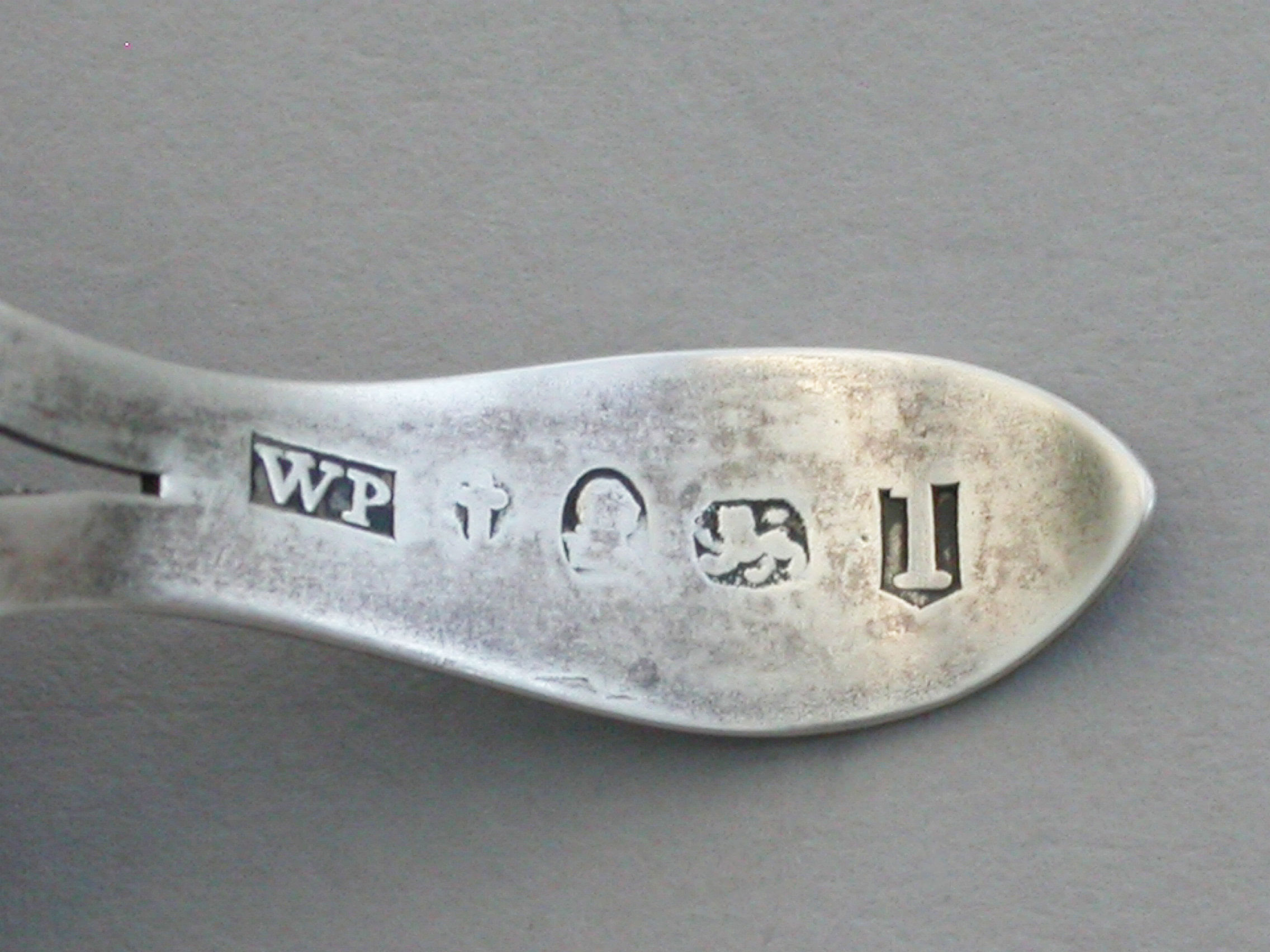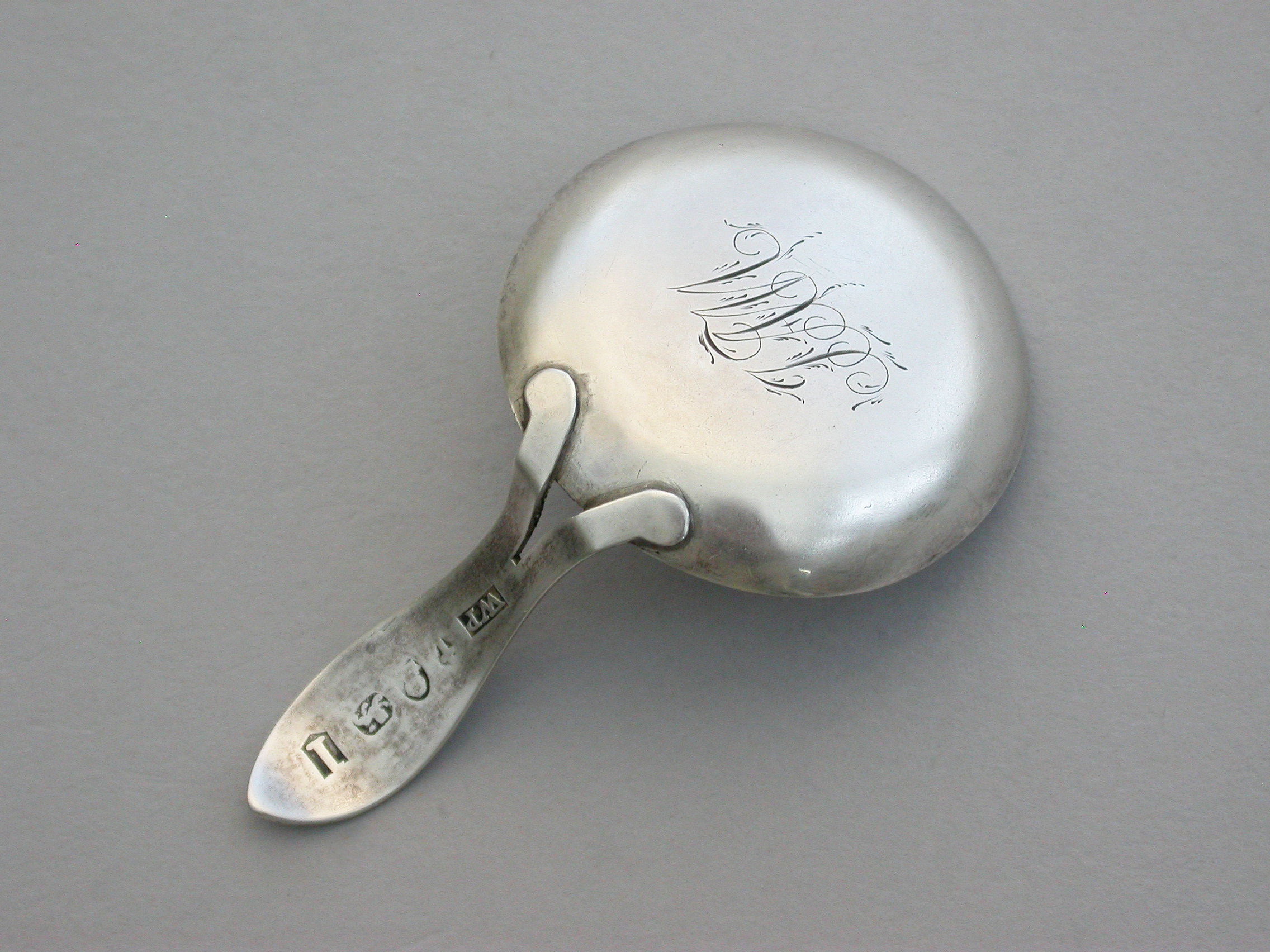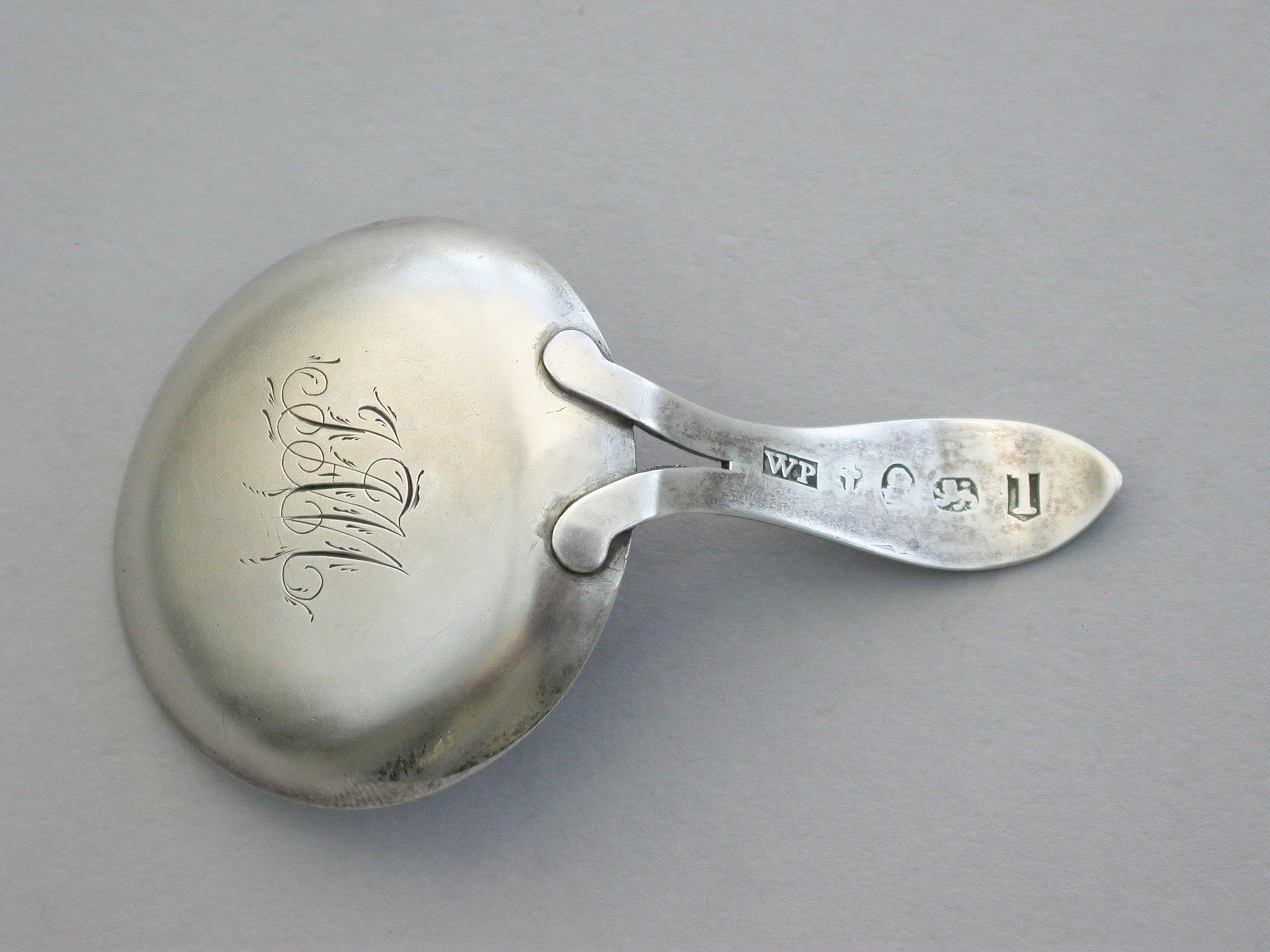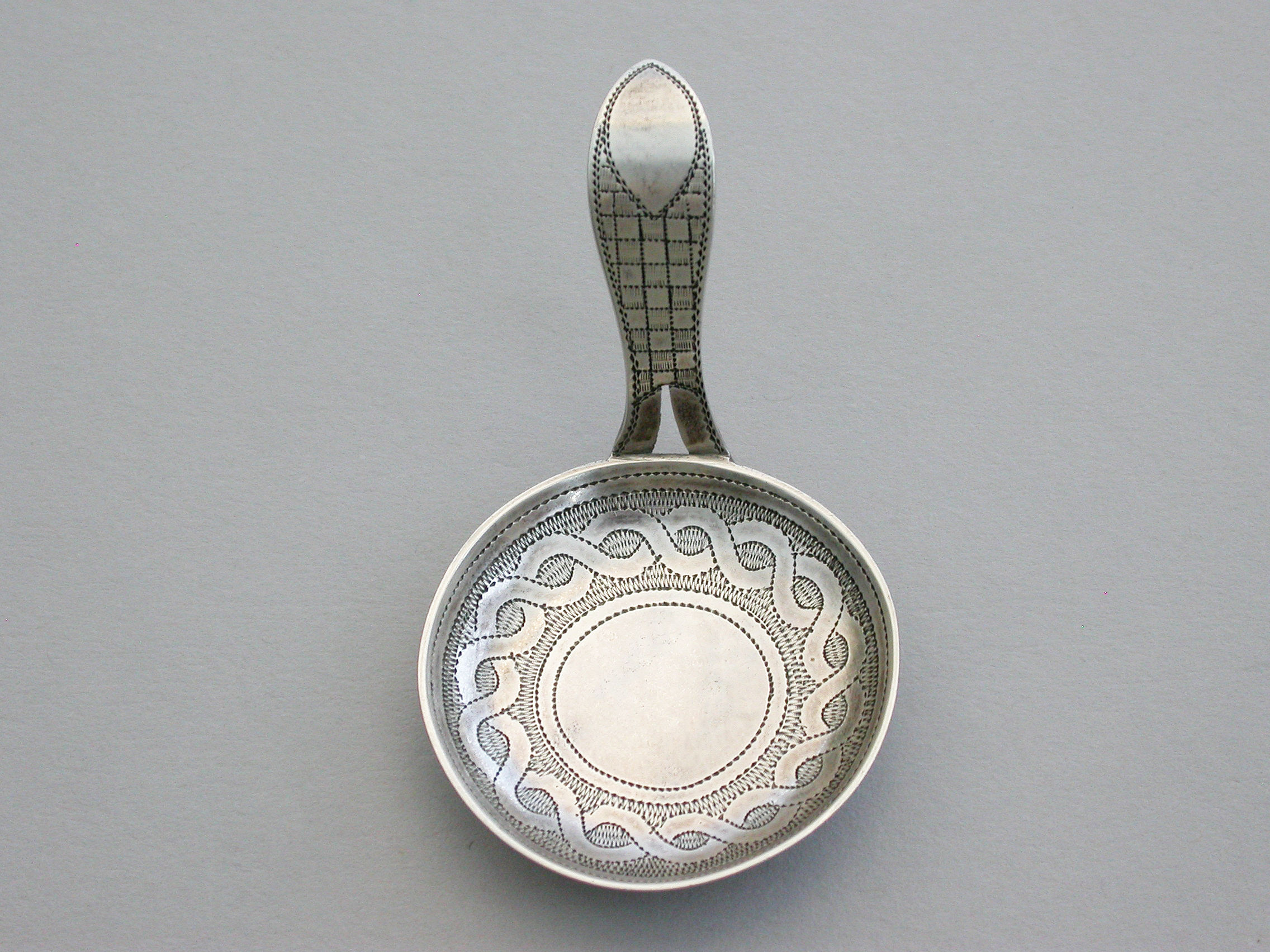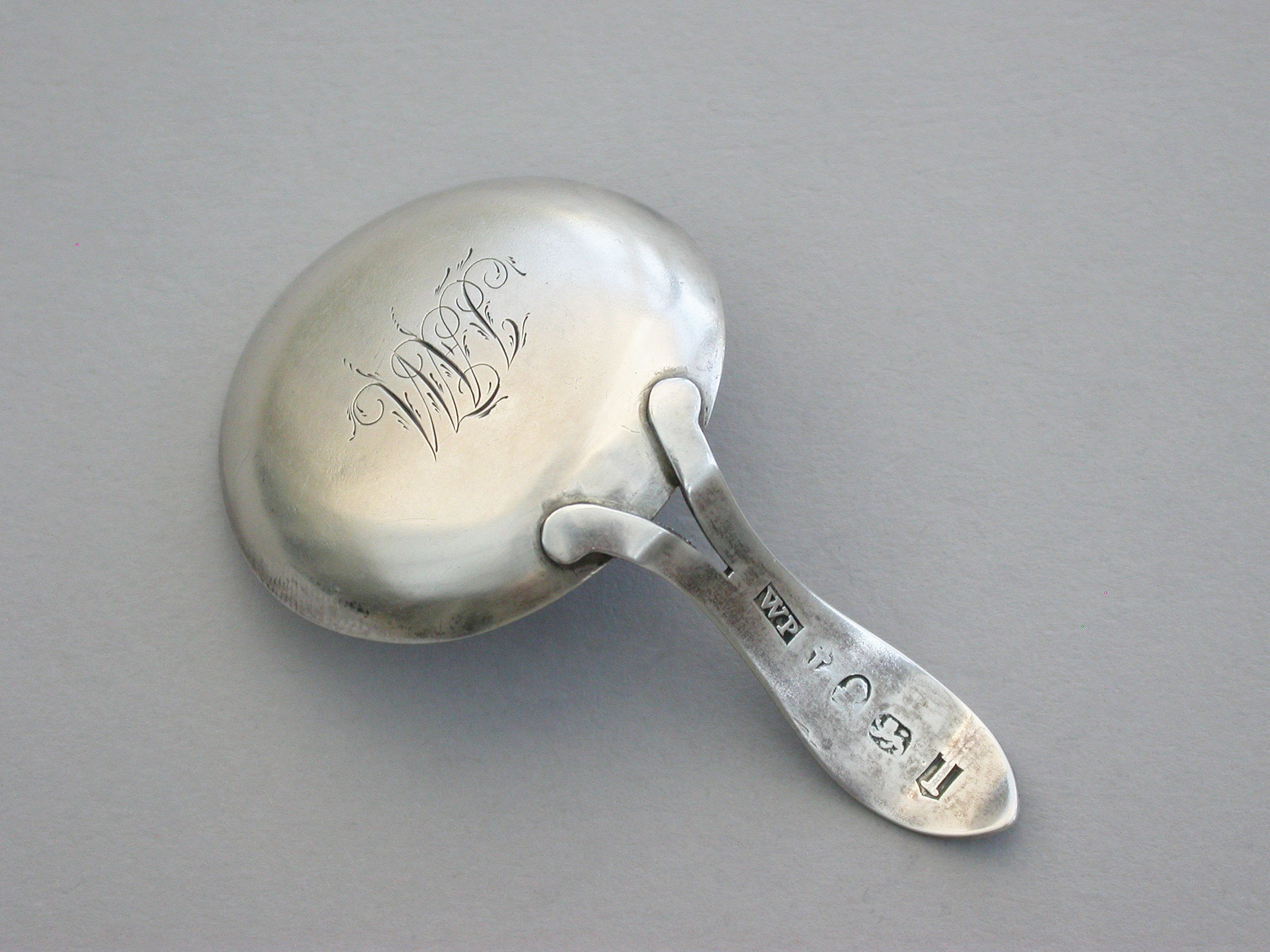 A rare George III silver Caddy Spoon of small size and of 'frying pan' form, the bi-furcated pointed Old English handle and bowl with bright-cut and prick-dot engraved decoration. The base of the bowl engraved with contemporary script initials.