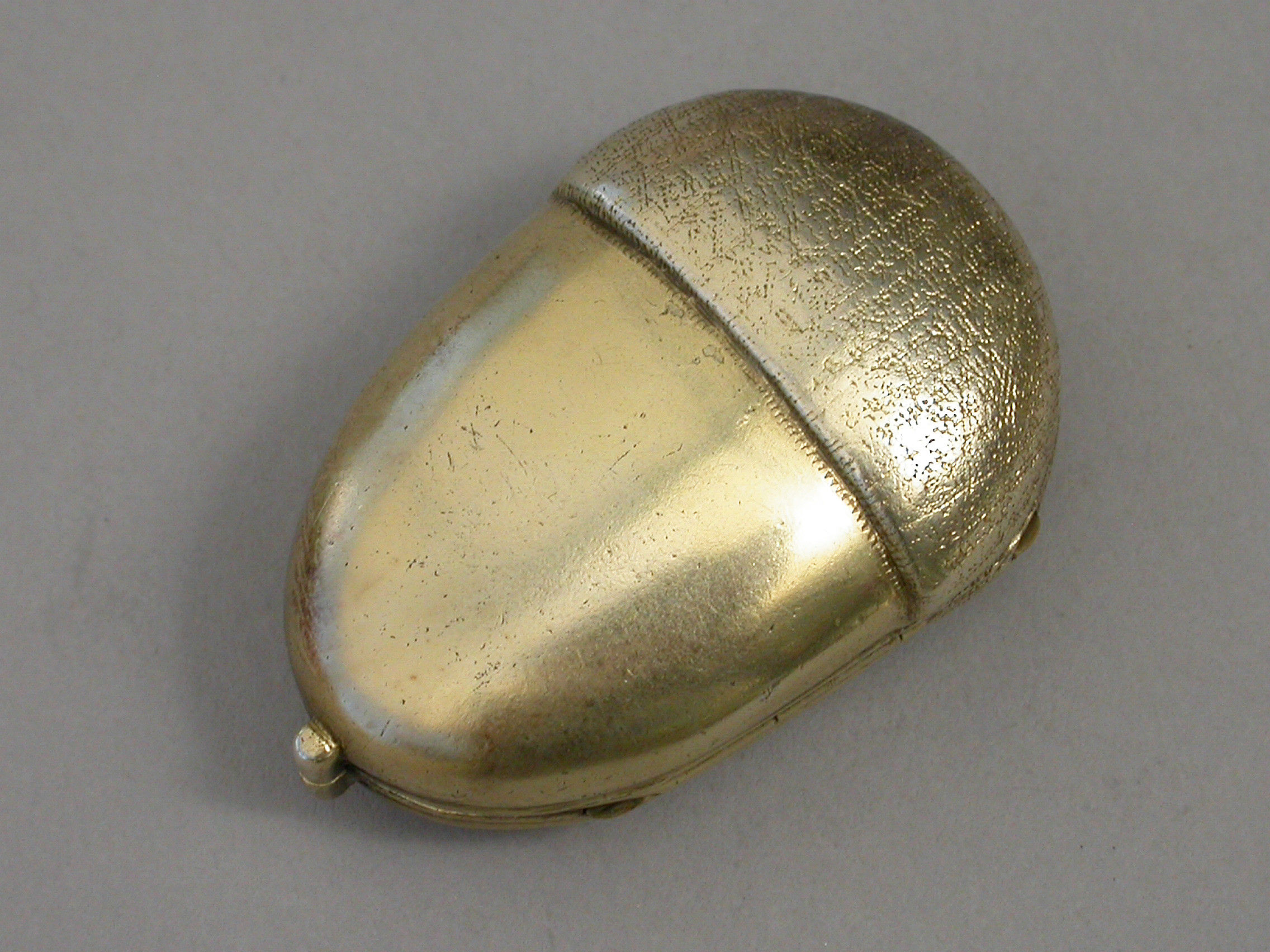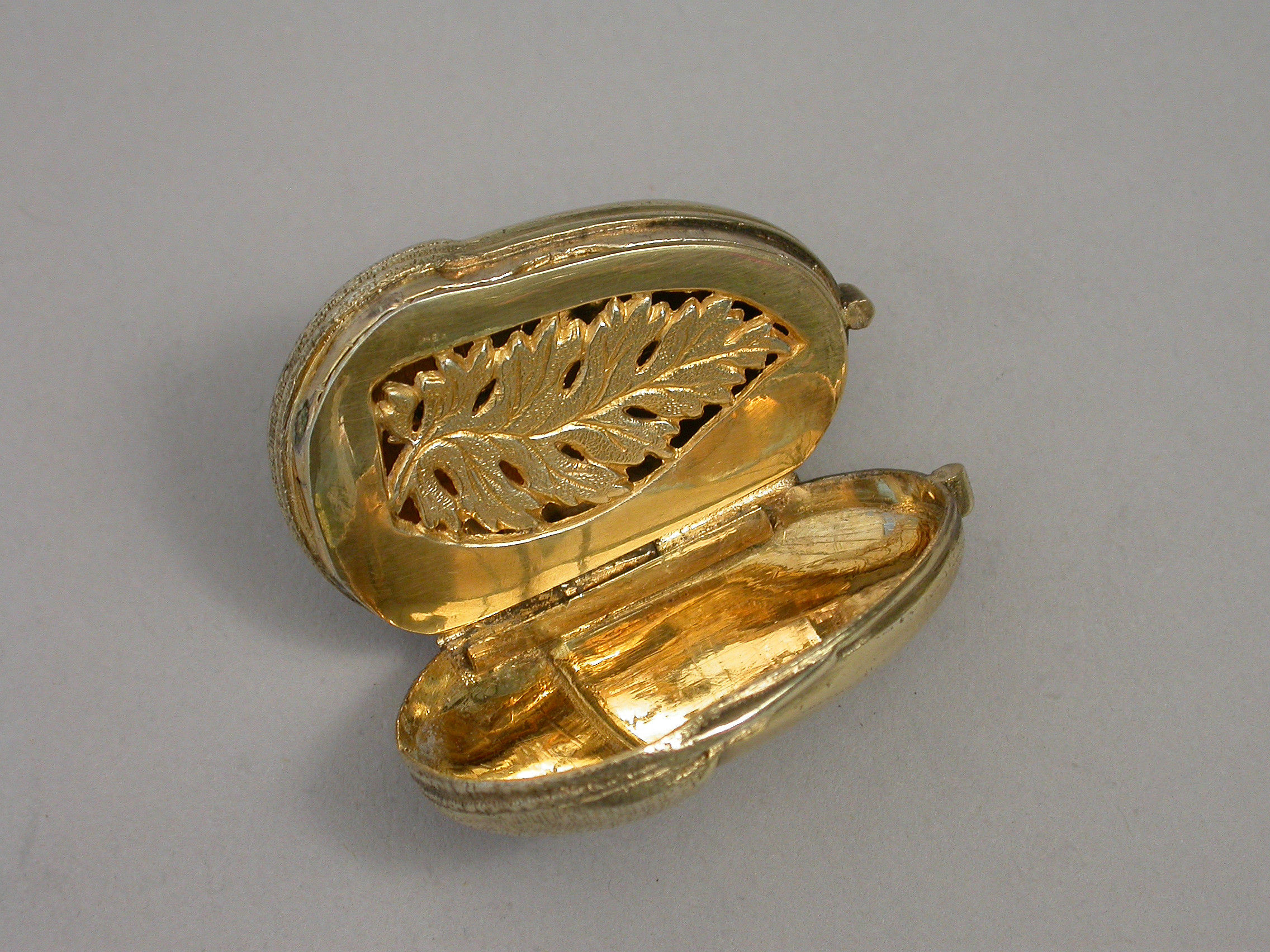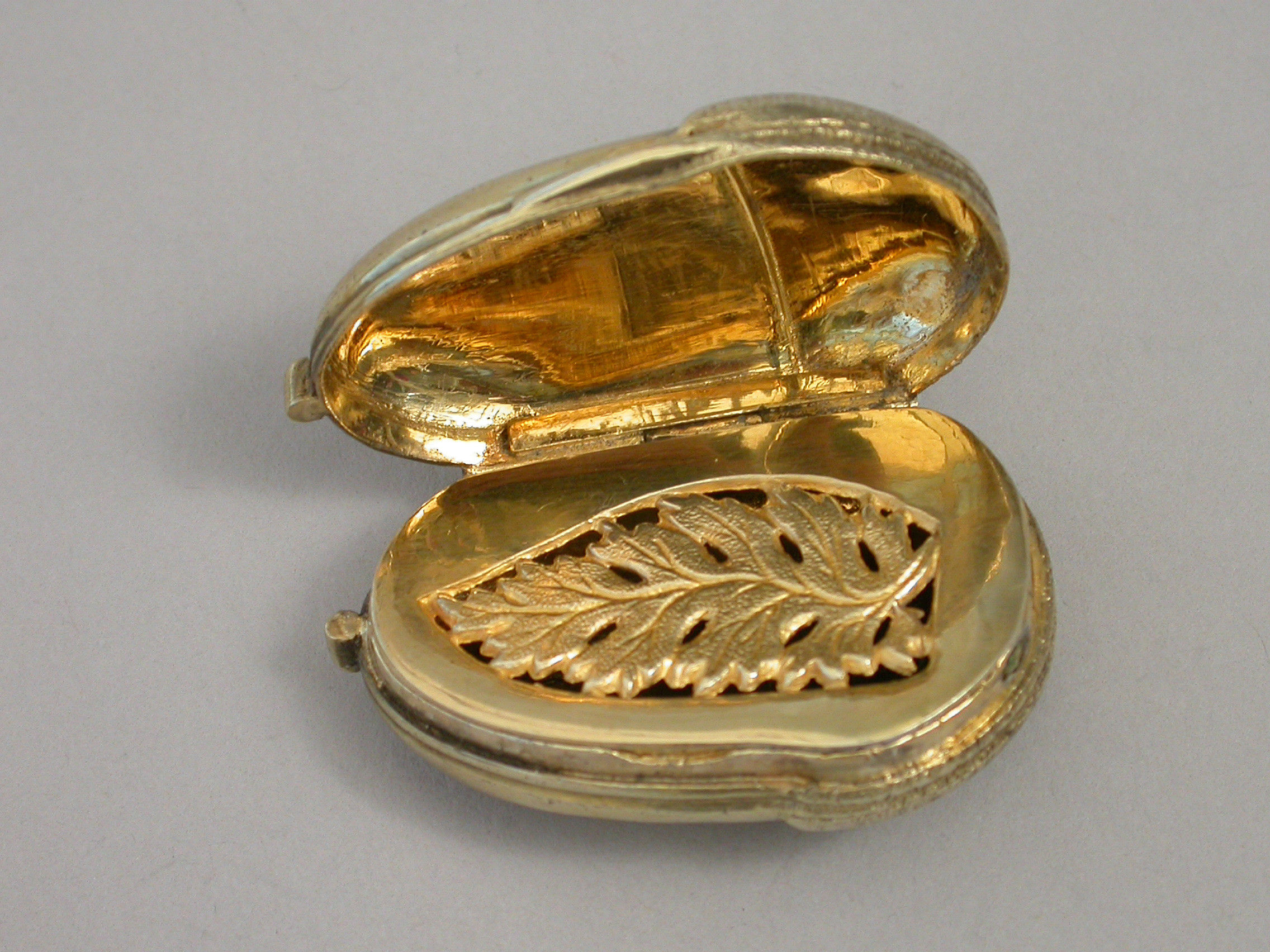 A rare George III silver gilt Vinaigrette made in the form of an Acorn, with matt engraved patterned cup, the silver gilt grille pierced with a single fern leaf.
