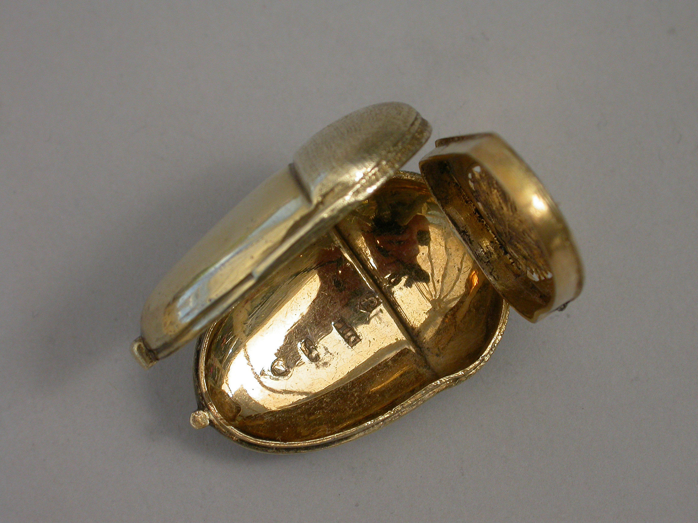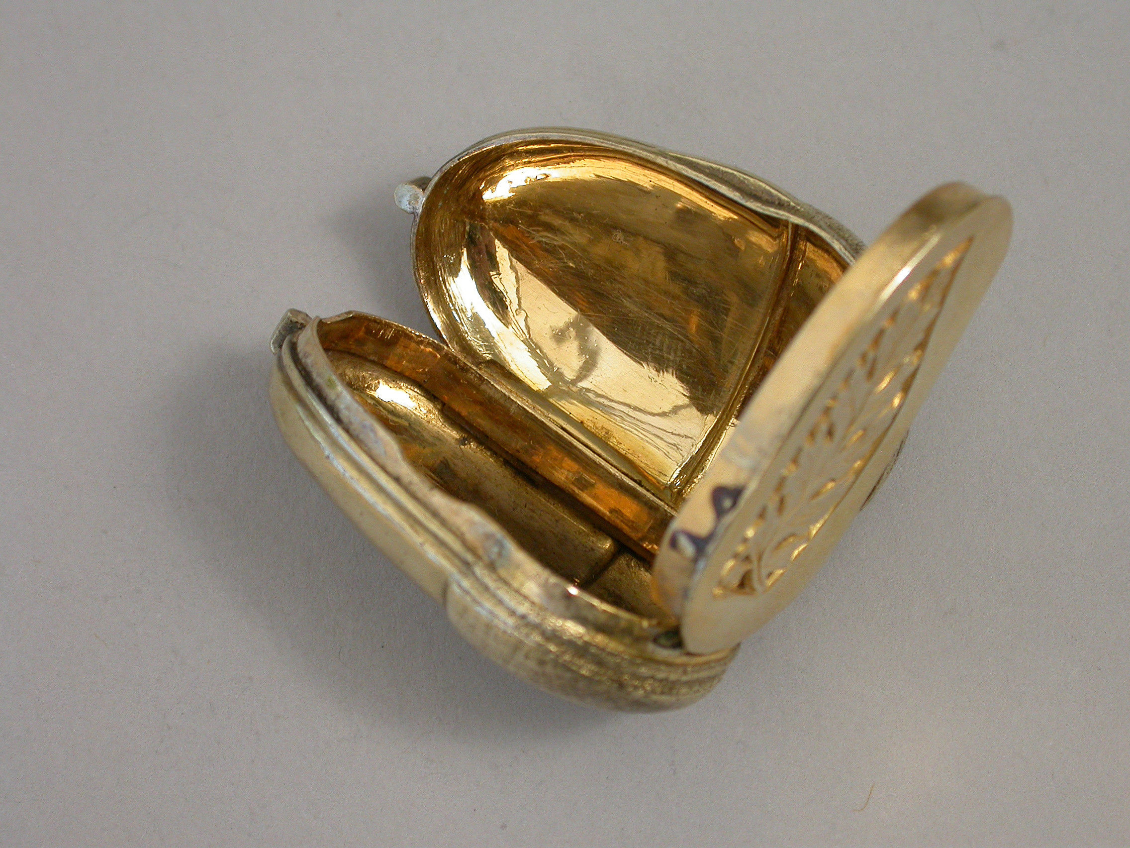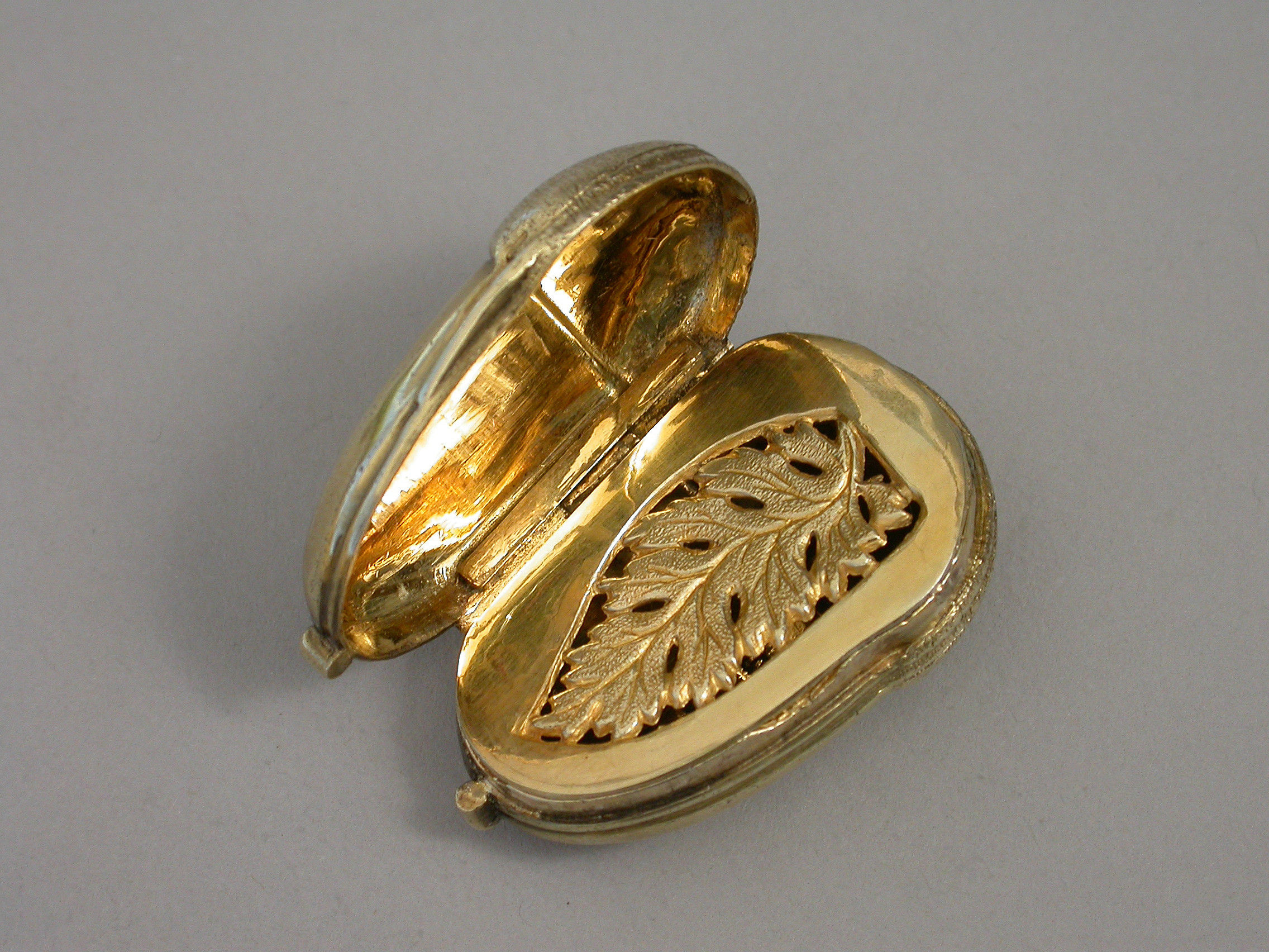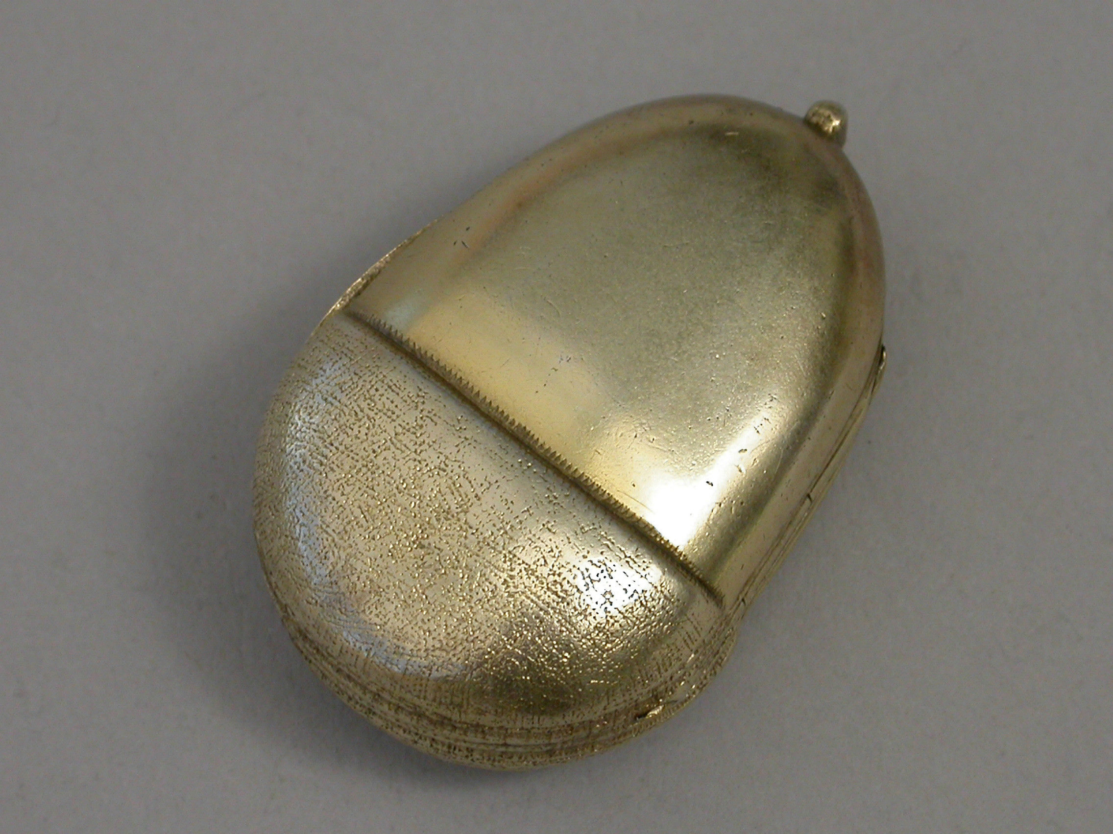 A rare George III silver gilt Vinaigrette made in the form of an Acorn, with matt engraved patterned cup, the silver gilt grille pierced with a single fern leaf.