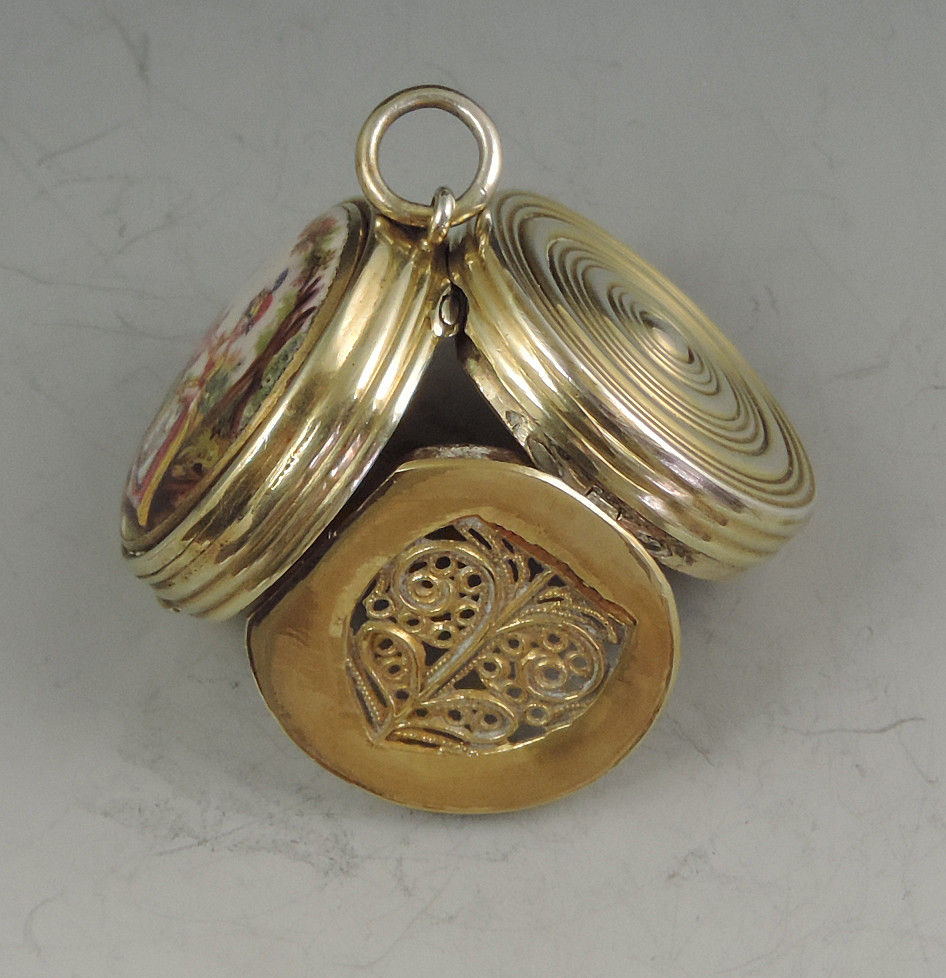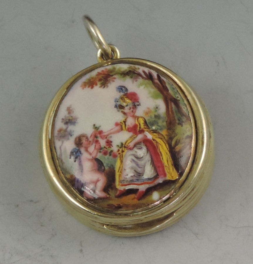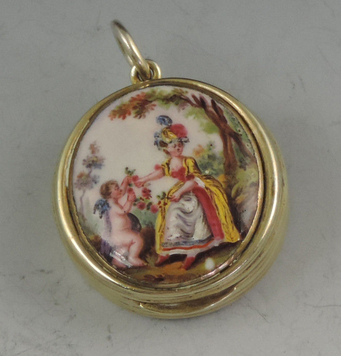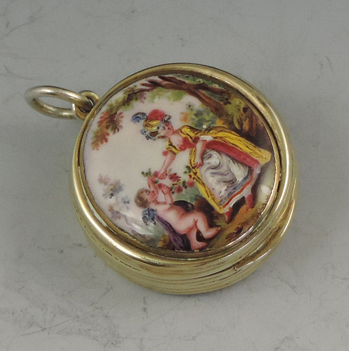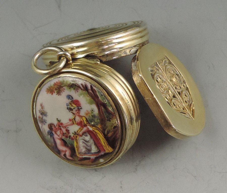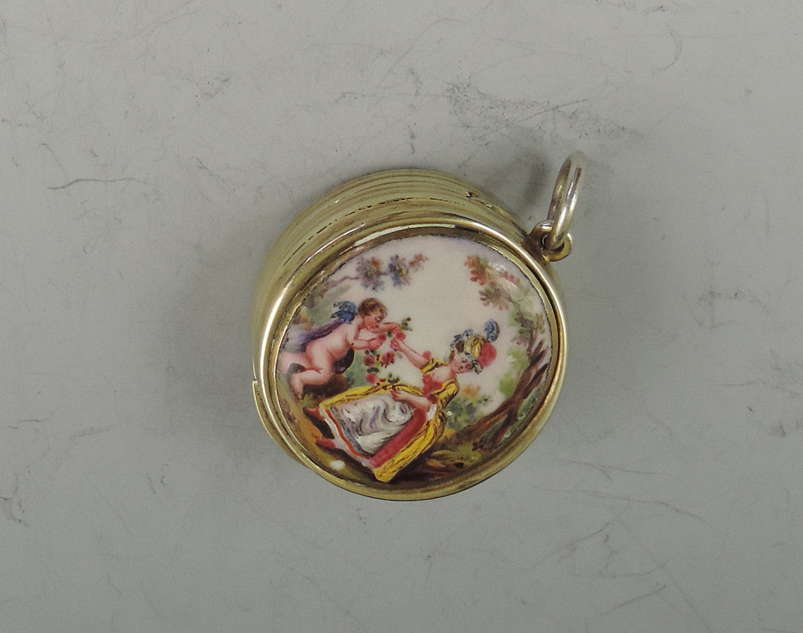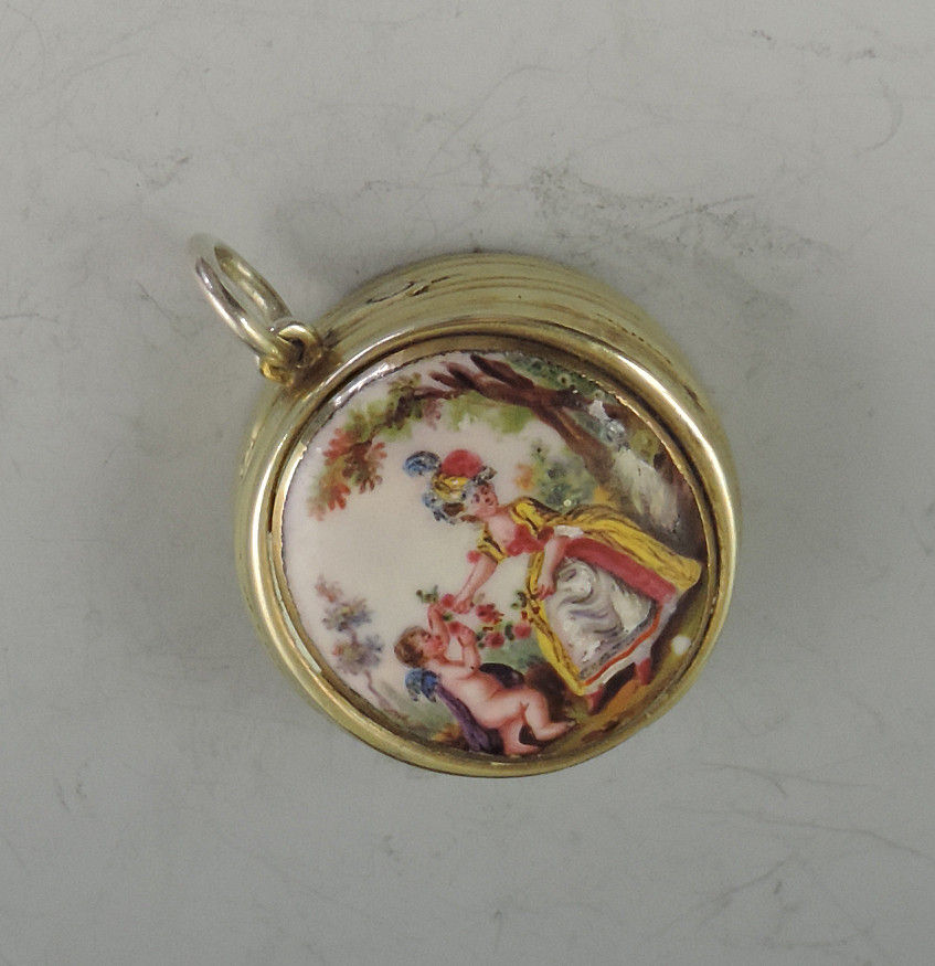 An extremely fine and rare George III silver gilt Vinaigrette of circular form with attached suspension ring, the base and sides with reeded decoration, the lid inset with an enamel panel depicting a lady and a cherub in a garden scene. The silver gilt interior with finely pierced filigree grille