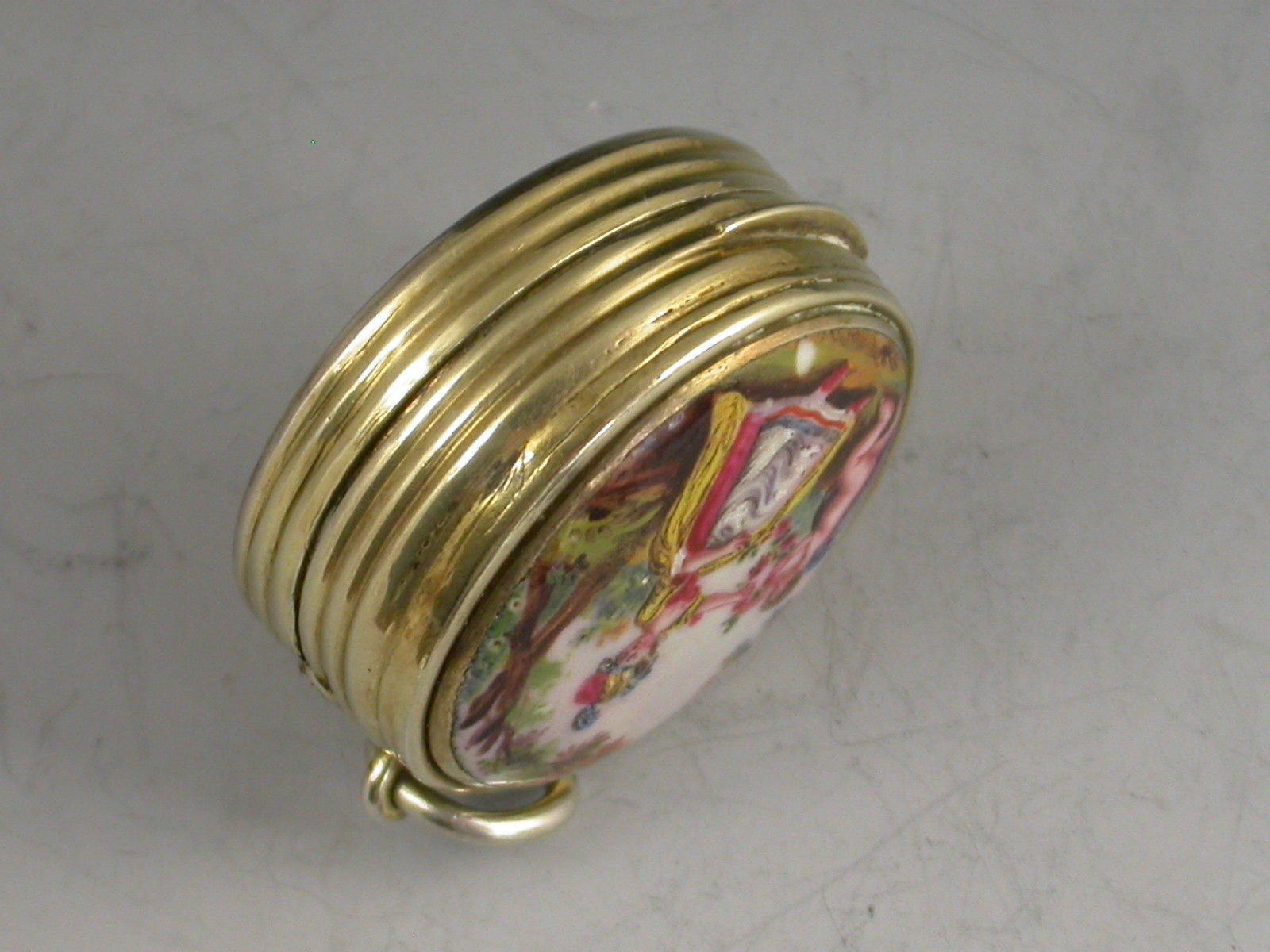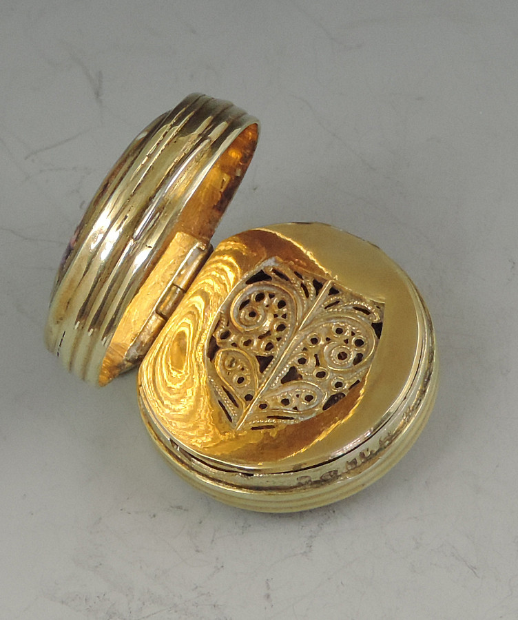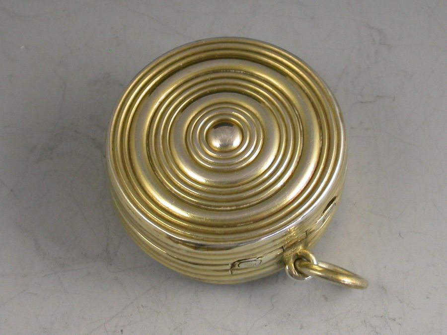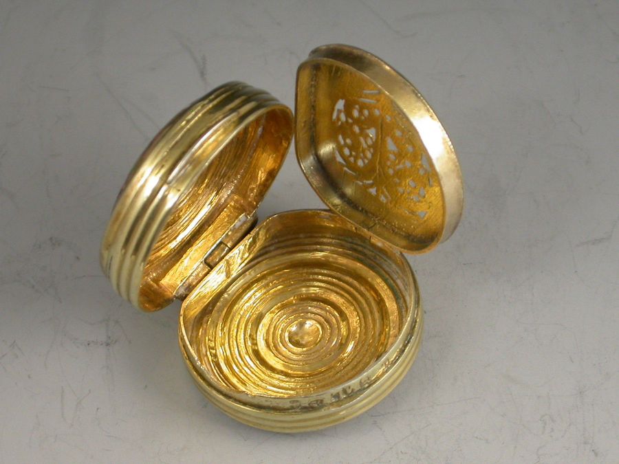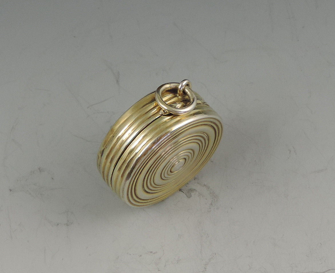 An extremely fine and rare George III silver gilt Vinaigrette of circular form with attached suspension ring, the base and sides with reeded decoration, the lid inset with an enamel panel depicting a lady and a cherub in a garden scene. The silver gilt interior with finely pierced filigree grille