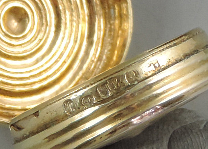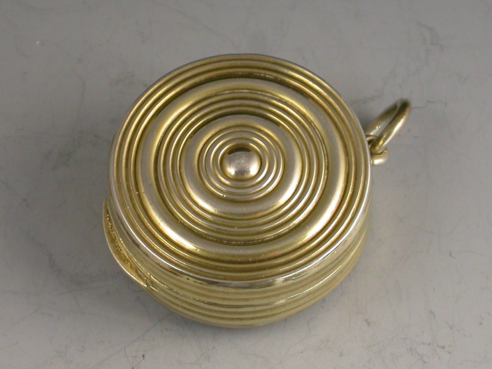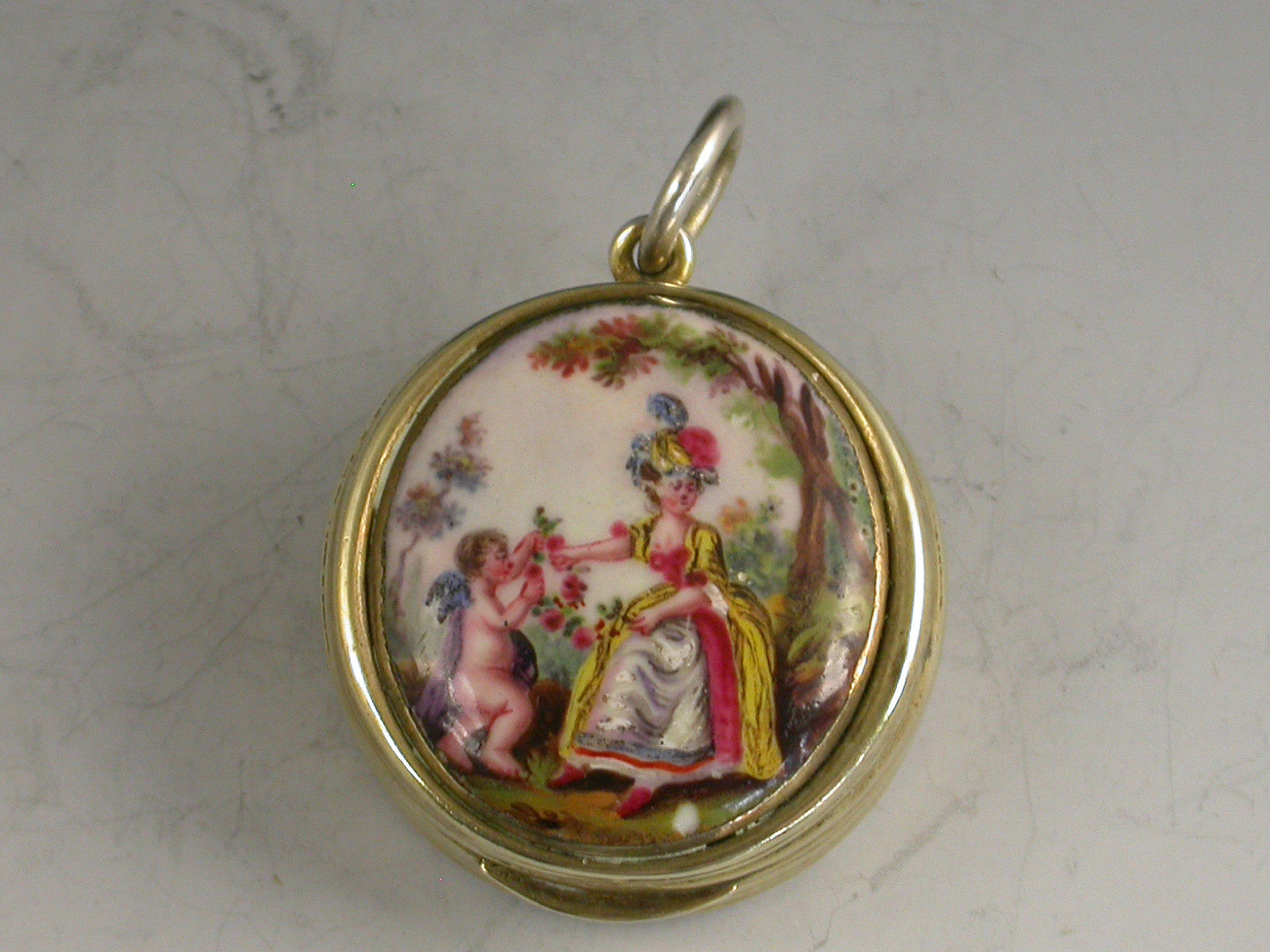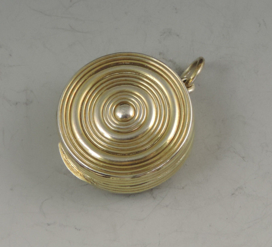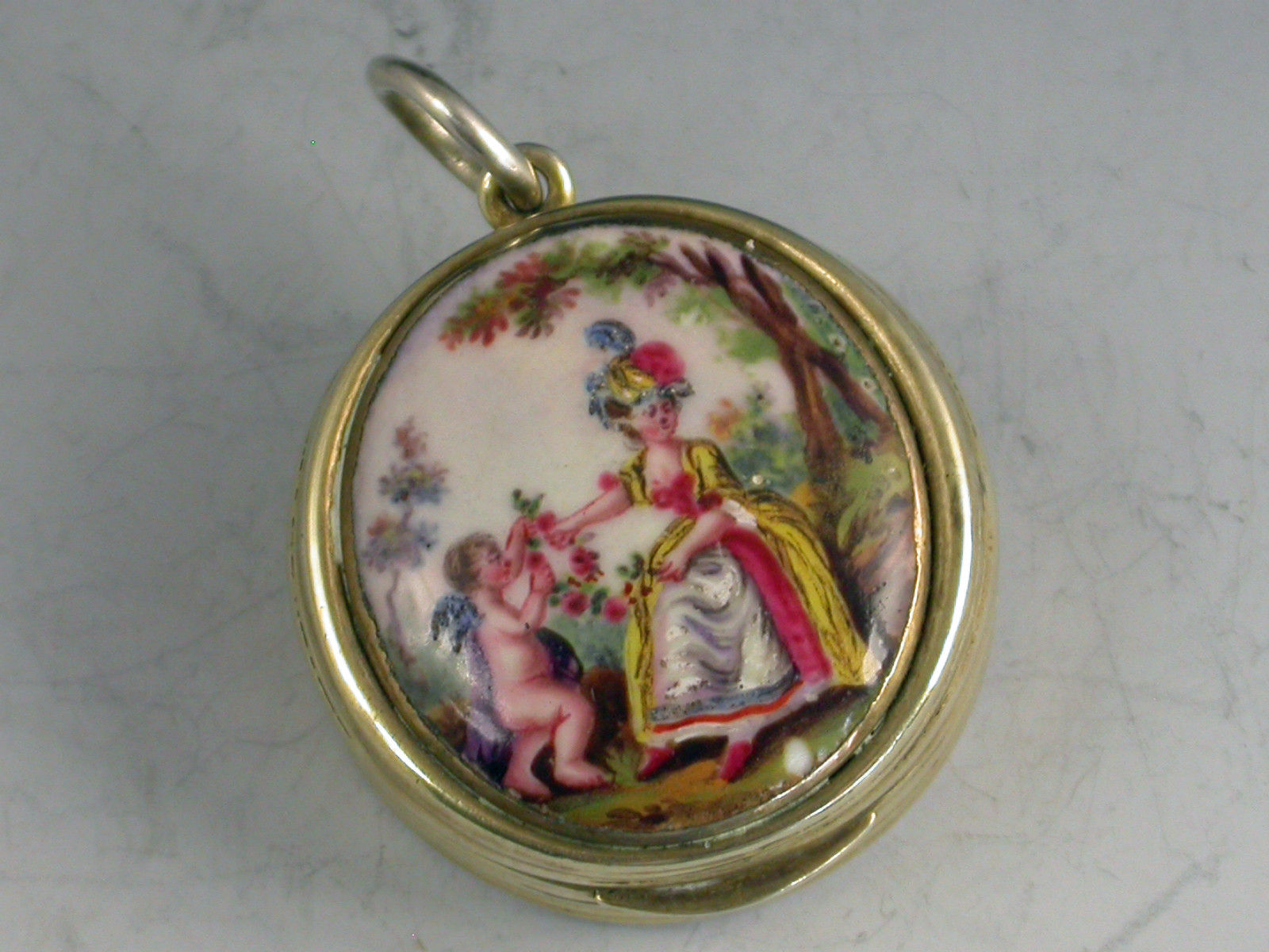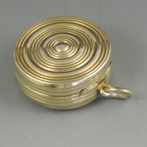 An extremely fine and rare George III silver gilt Vinaigrette of circular form with attached suspension ring, the base and sides with reeded decoration, the lid inset with an enamel panel depicting a lady and a cherub in a garden scene. The silver gilt interior with finely pierced filigree grille