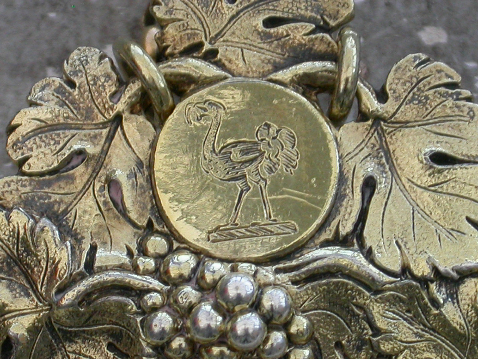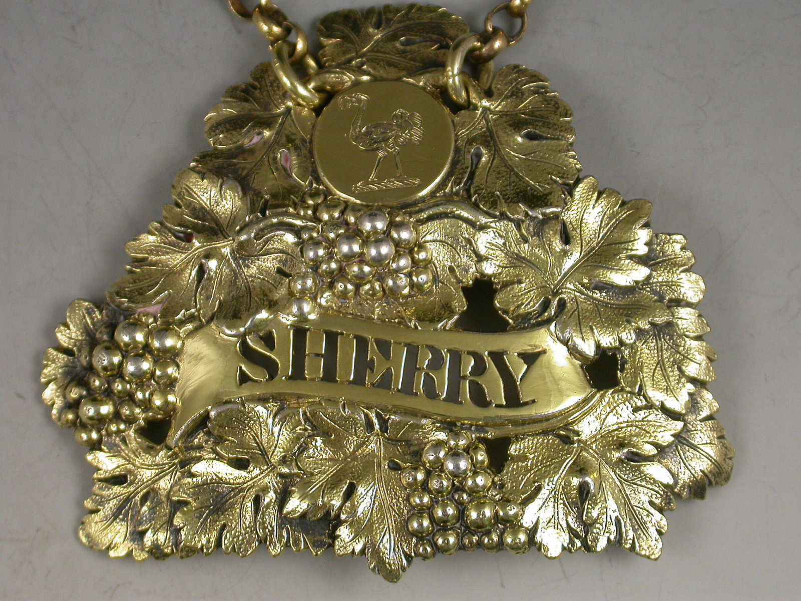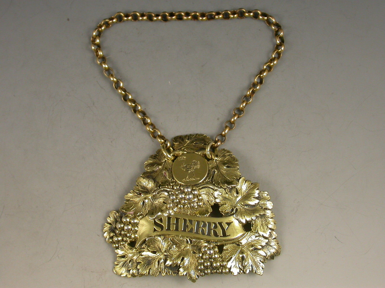 A fine quality George III cast silver gilt Armorial Wine Label of shaped triangular form and made up from vine leaves and grapes surrounding a scrolled name plate pierced for Sherry. A circular cartouche to the top centre engraved with the crest of The Coke Family of Holkham Hall, Norfolk. (An Ostrich holding a horseshoe in its beak).