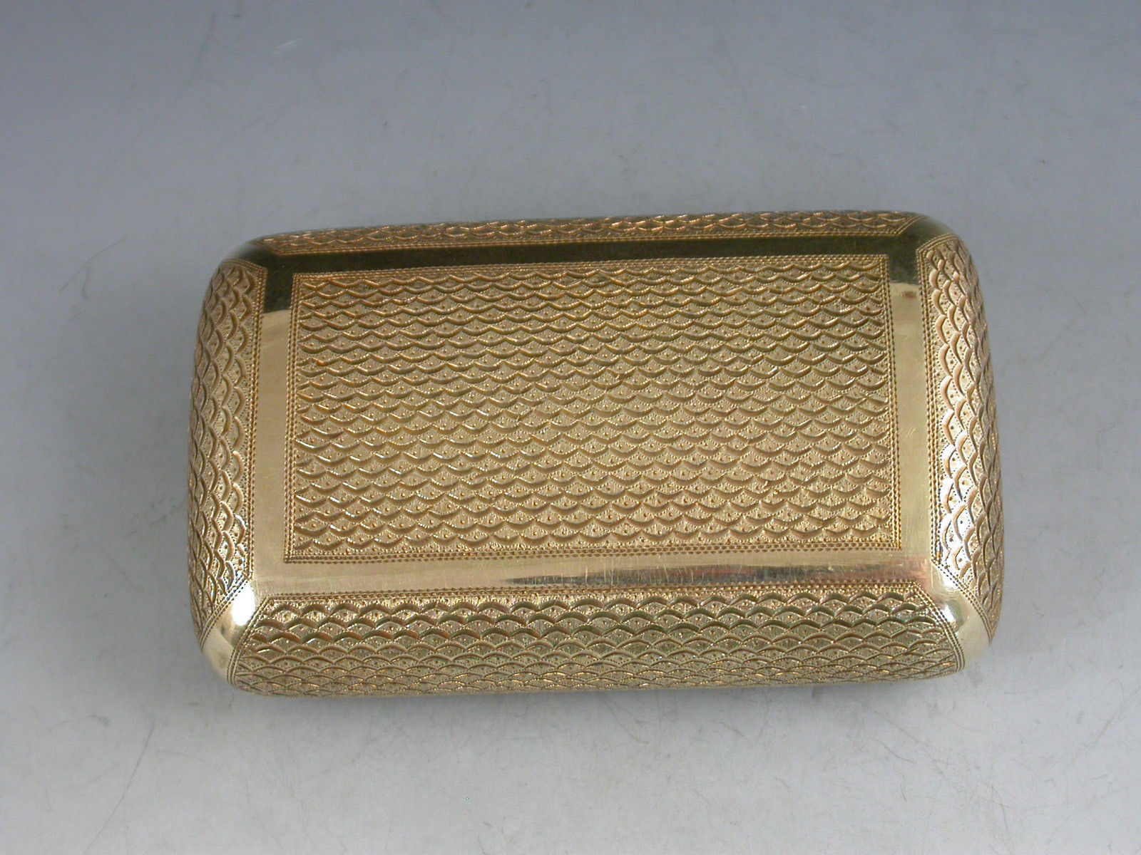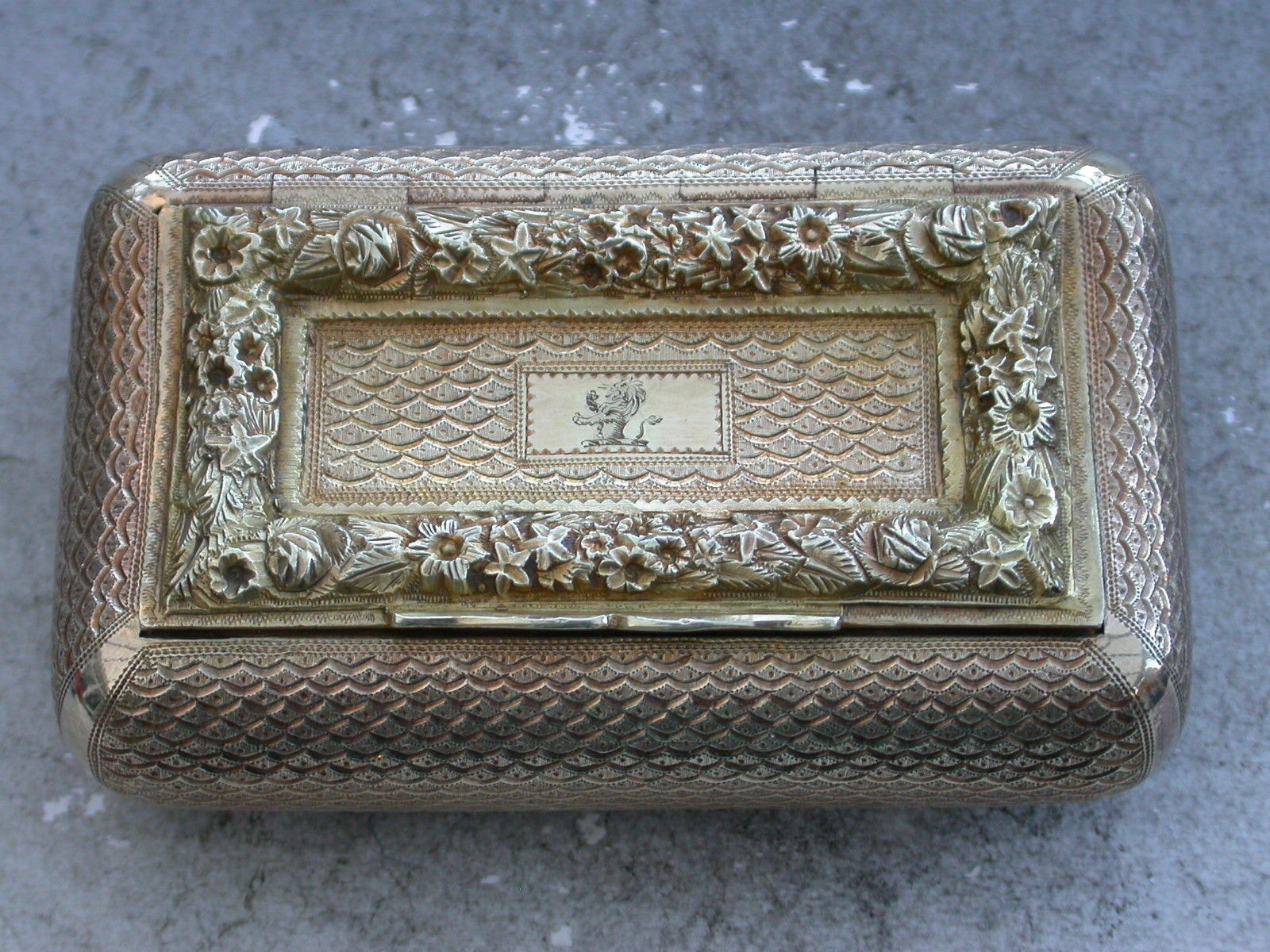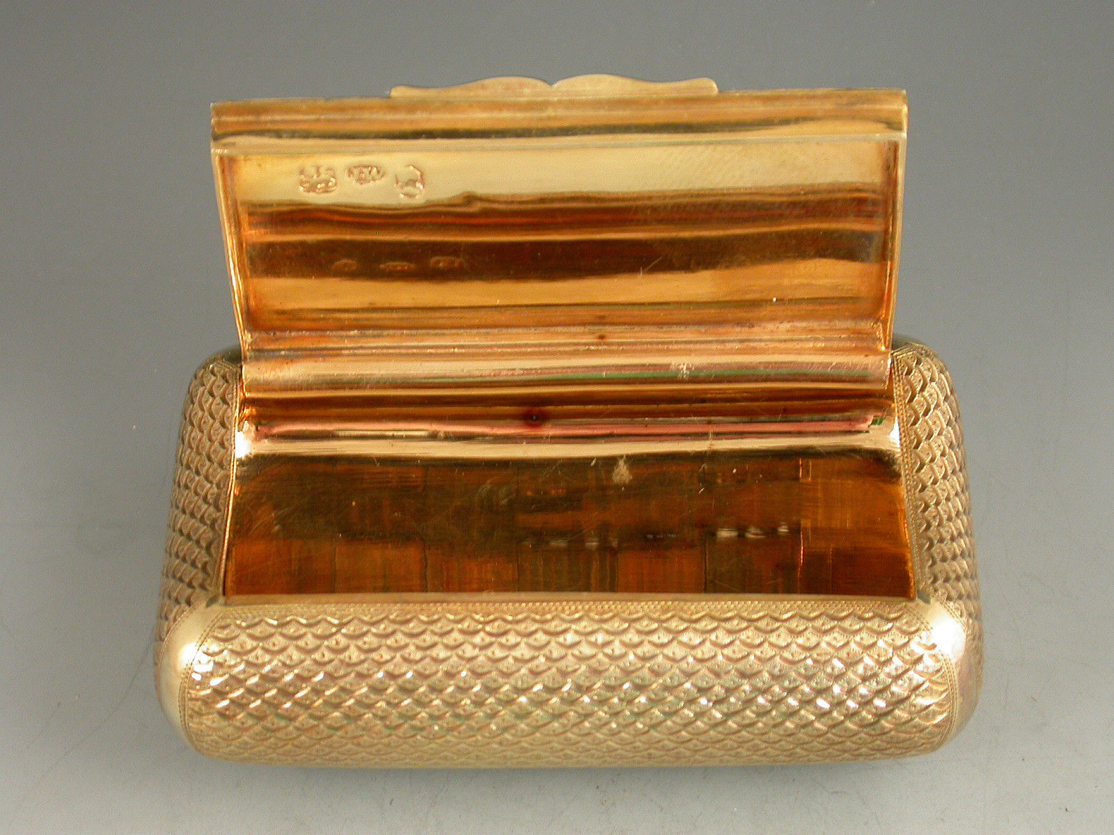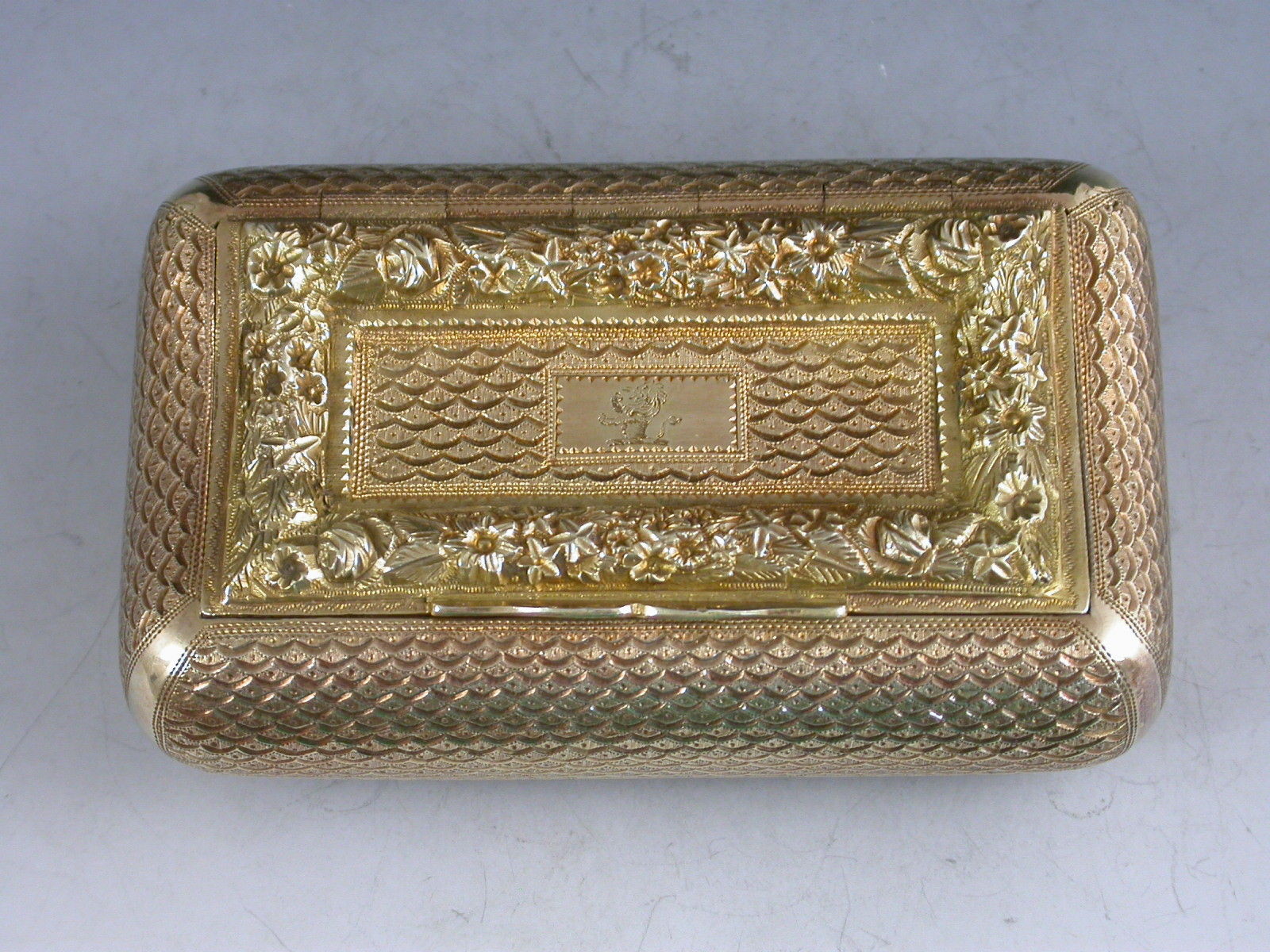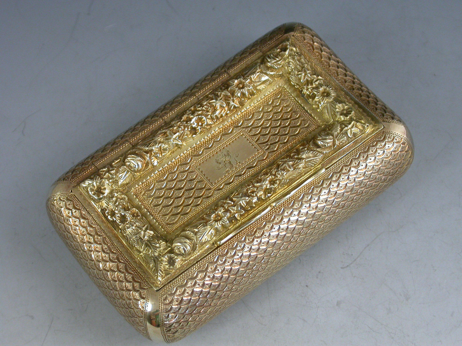 A very nice quality George III silver gilt Snuff Box of curved rectangular form with rounded corners, decorated with overlapping scales, the hinged lid with chased and raised border of flower heads and centered by a rectangular cartouche engraved with a crest depicting a demi lion rampant.