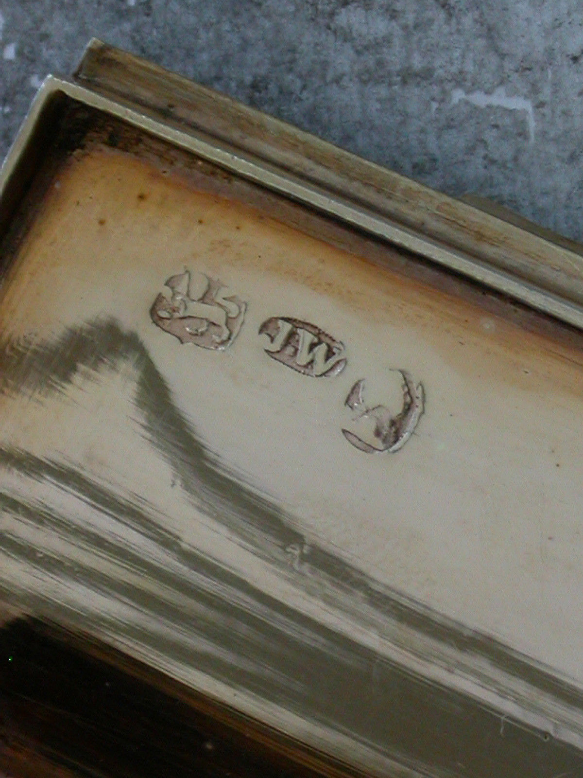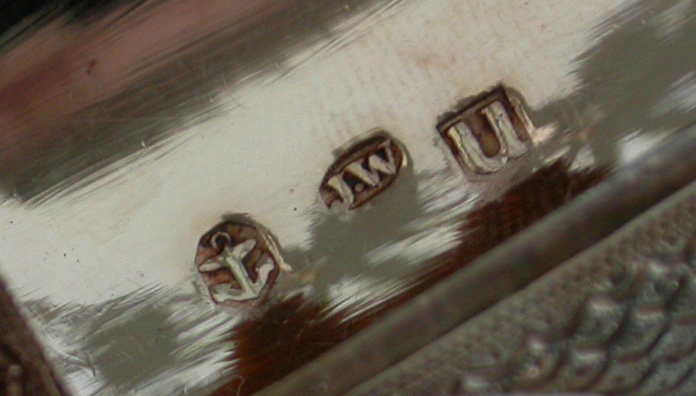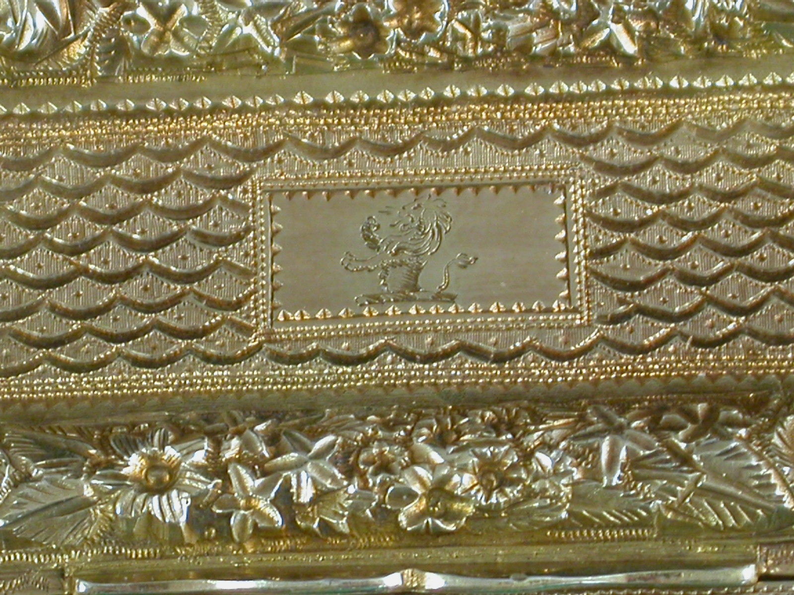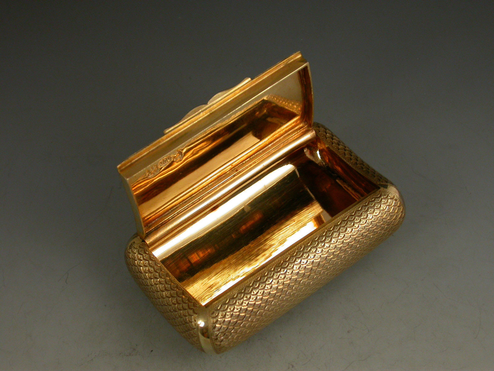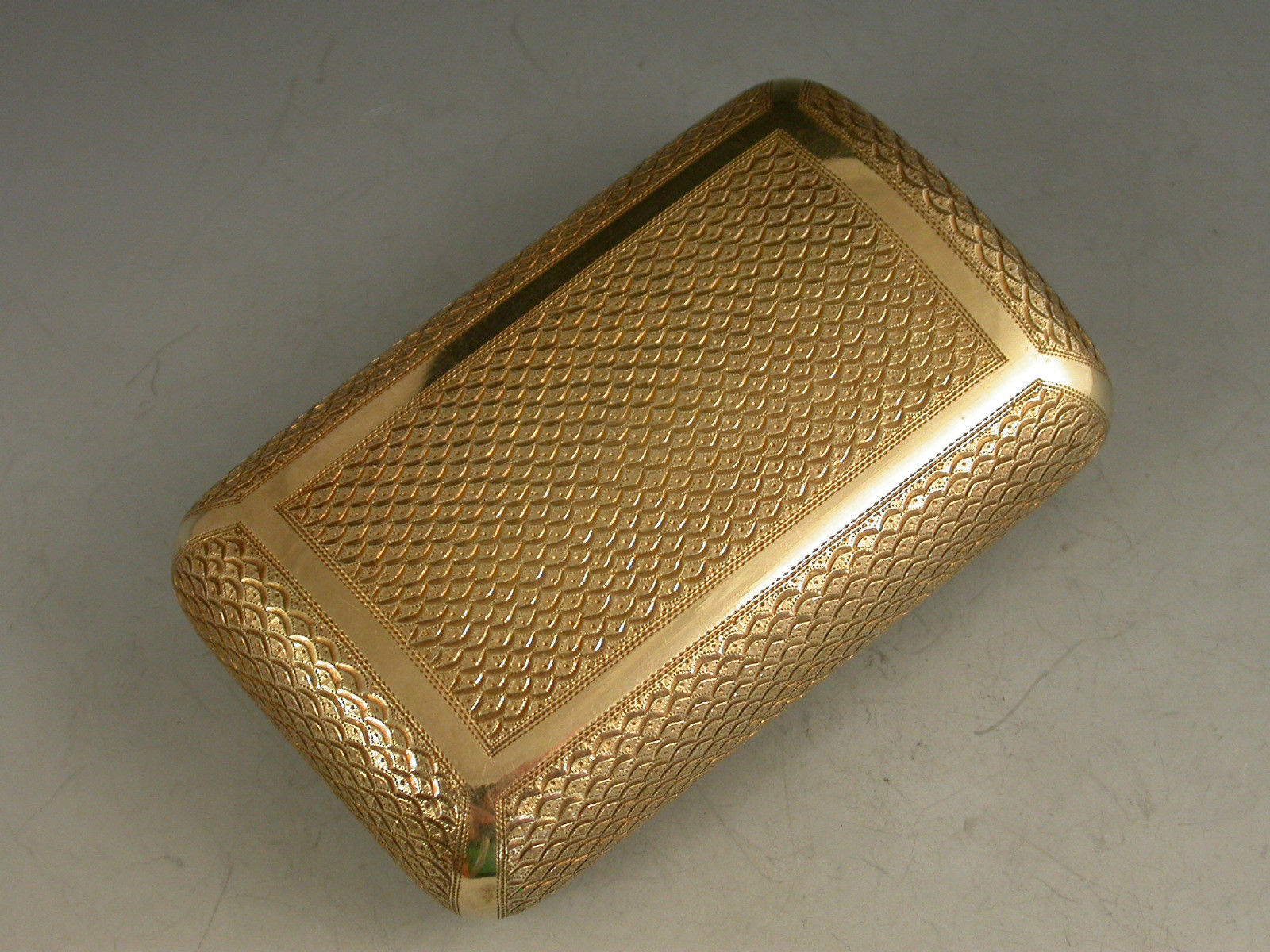 A very nice quality George III silver gilt Snuff Box of curved rectangular form with rounded corners, decorated with overlapping scales, the hinged lid with chased and raised border of flower heads and centered by a rectangular cartouche engraved with a crest depicting a demi lion rampant.