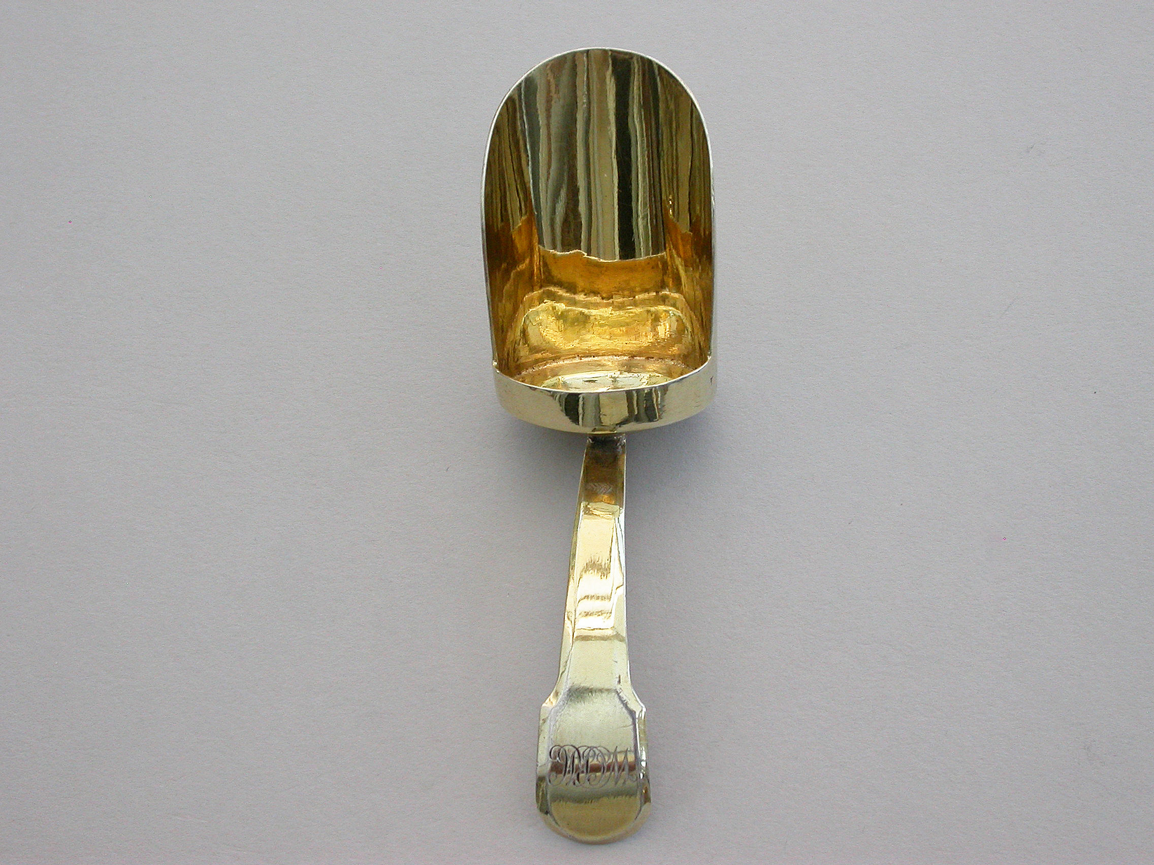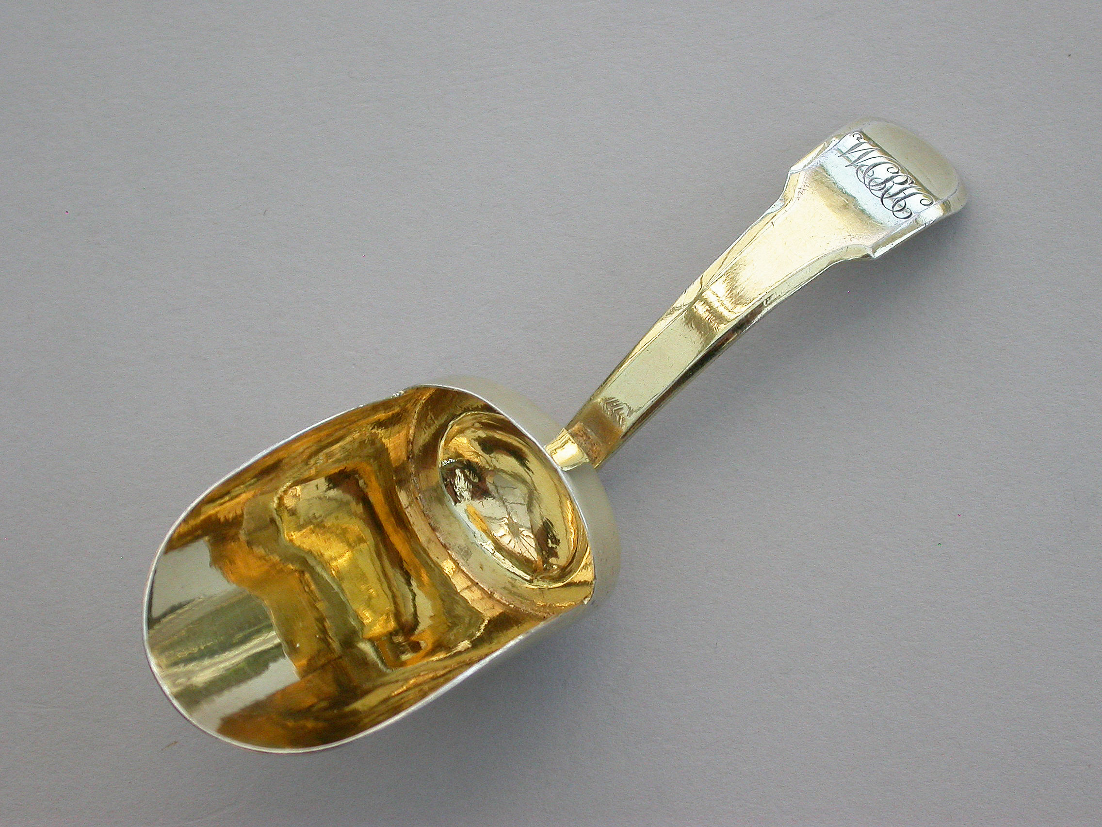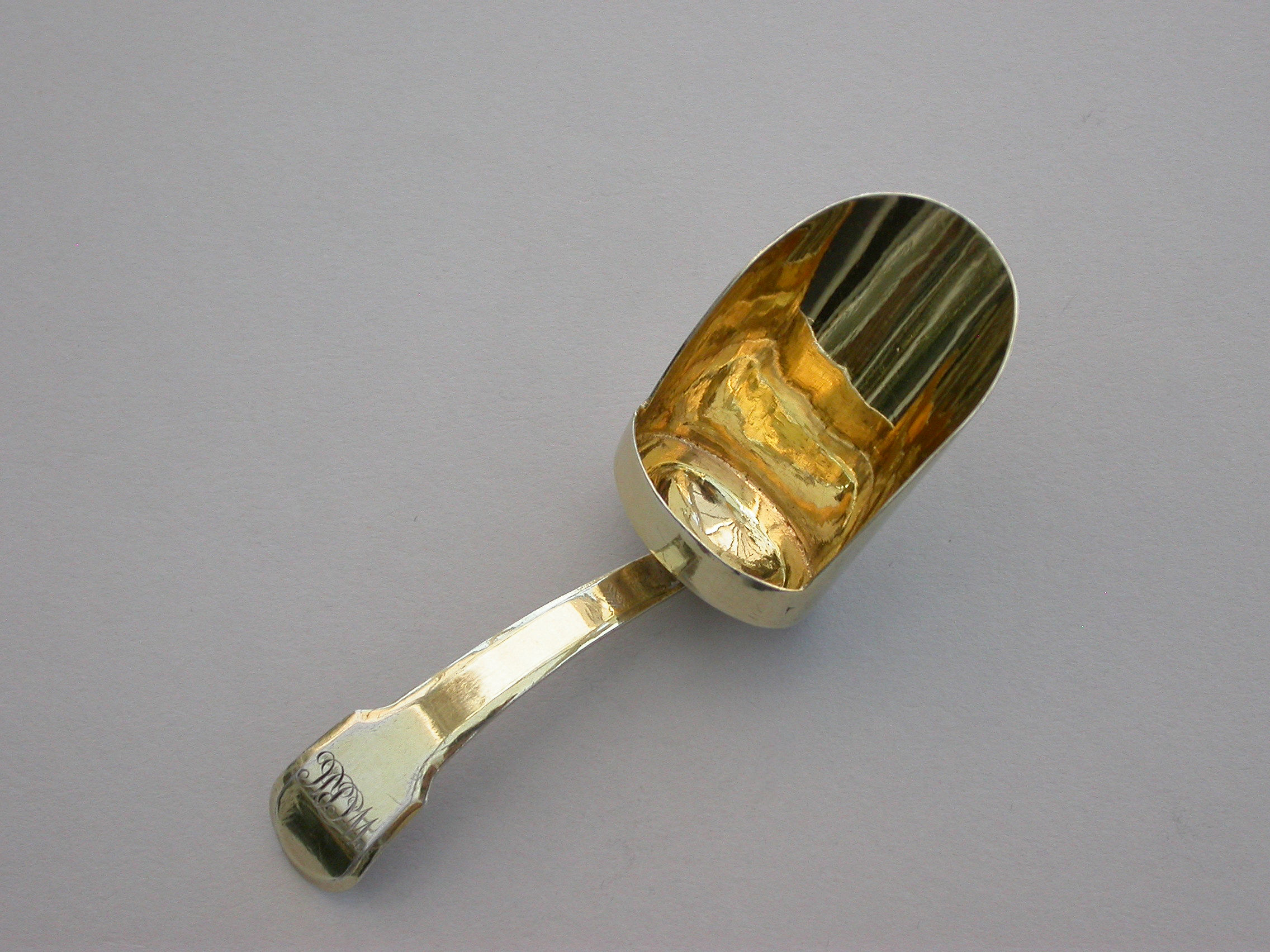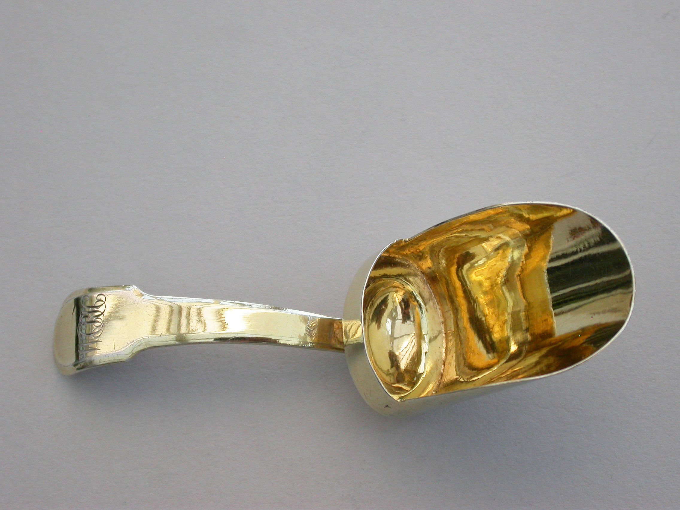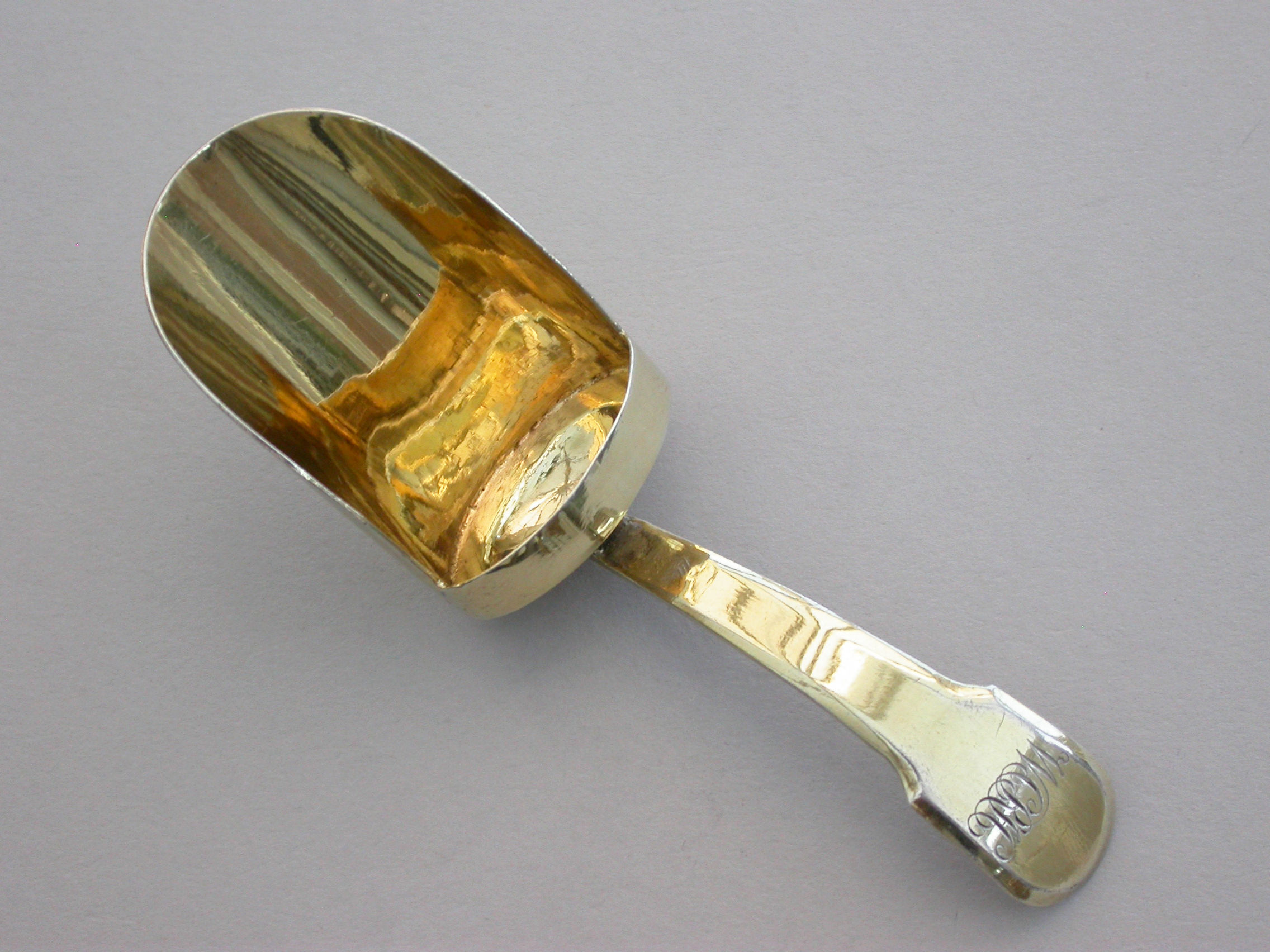 A good quality George III London made silver gilt Caddy Spoon with scoop shaped bowl and fiddle pattern handle, engraved with contemporary initials.
