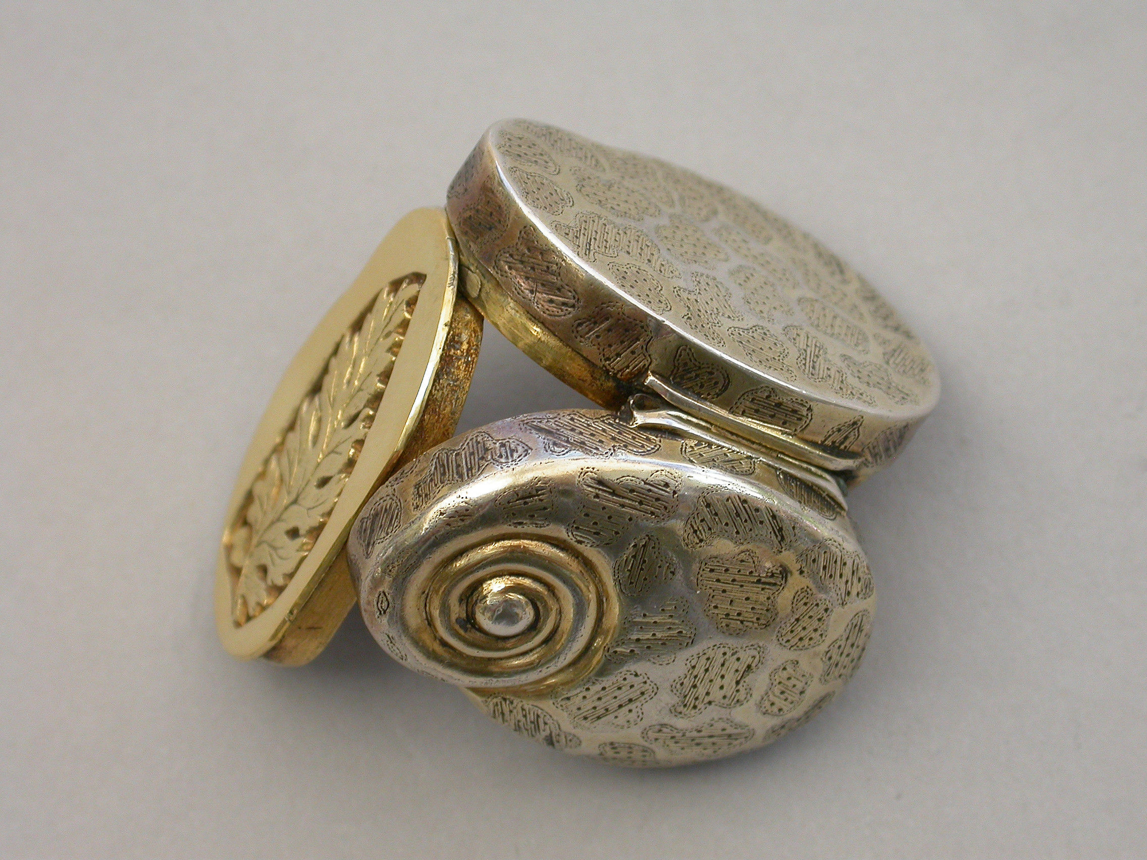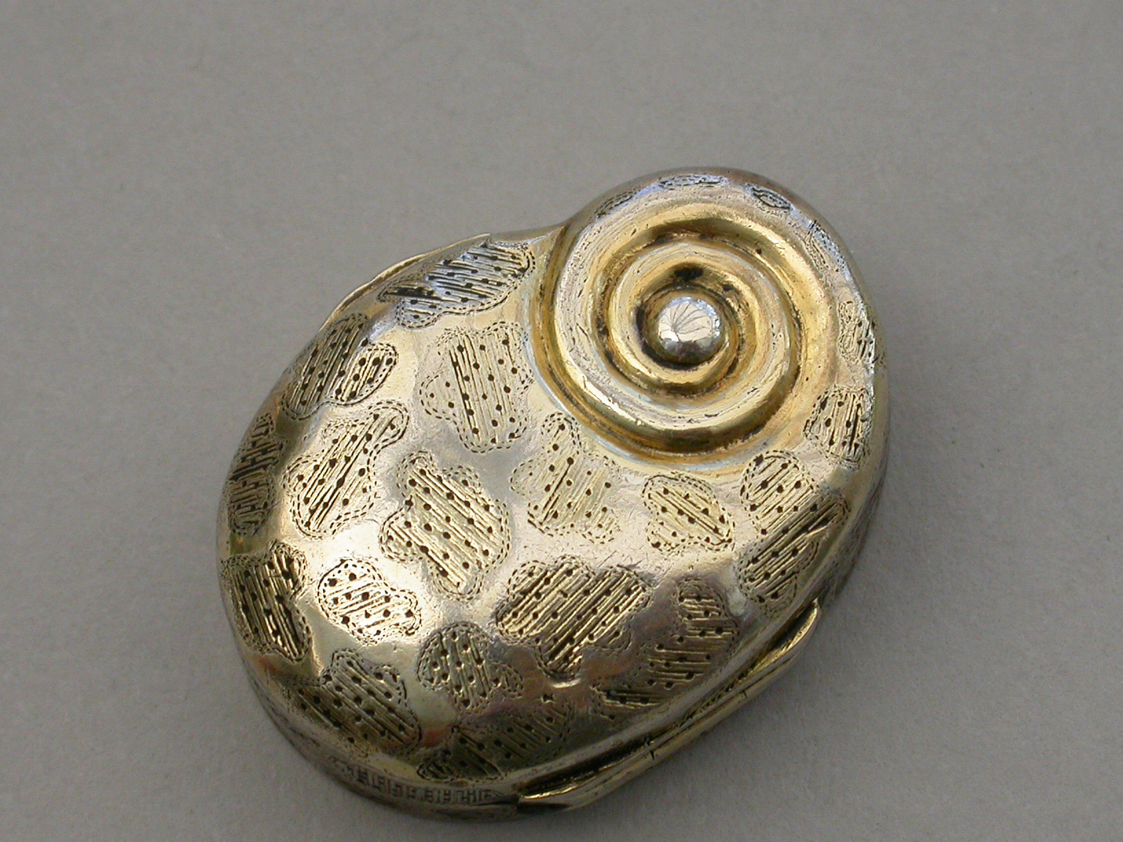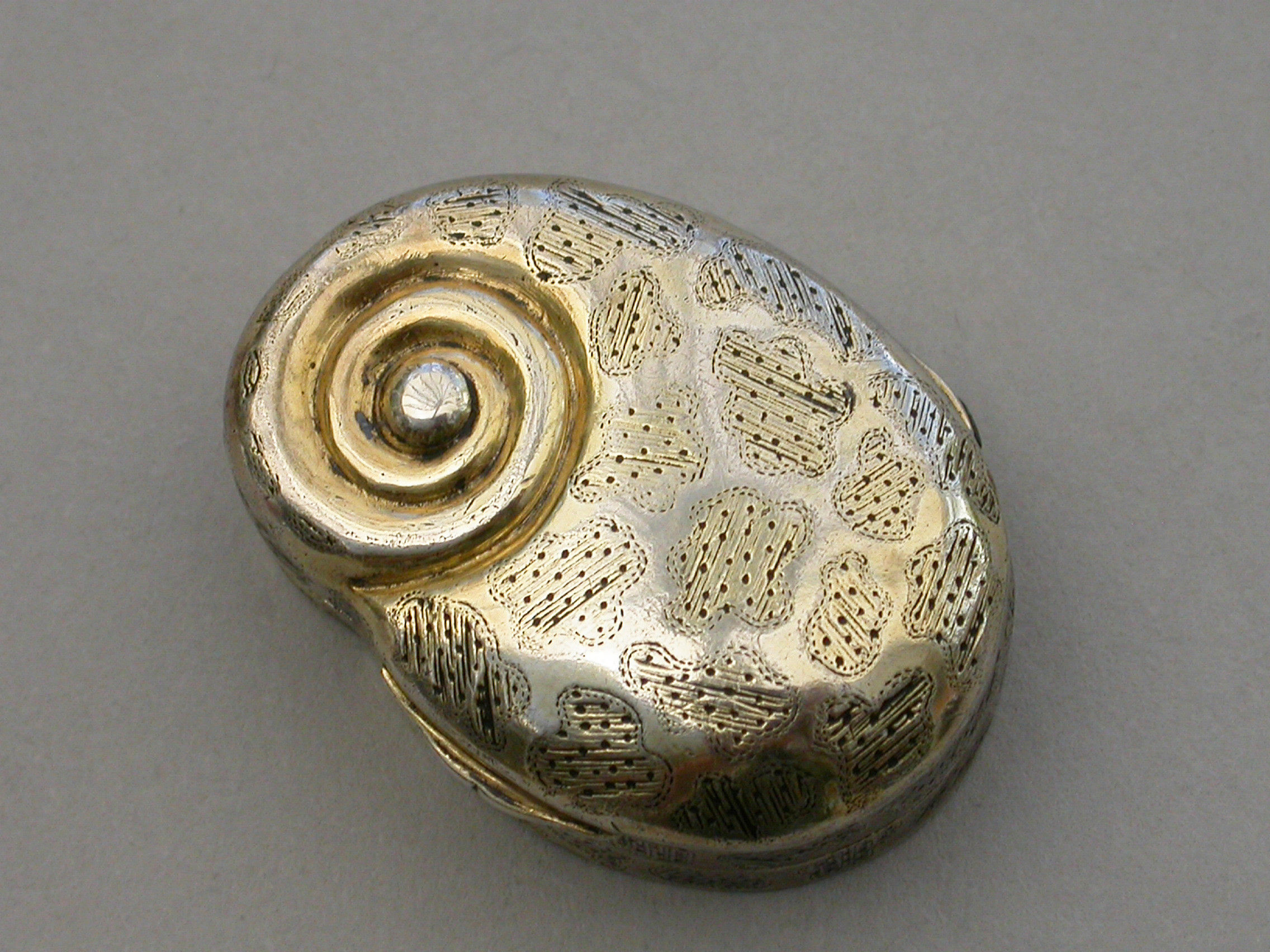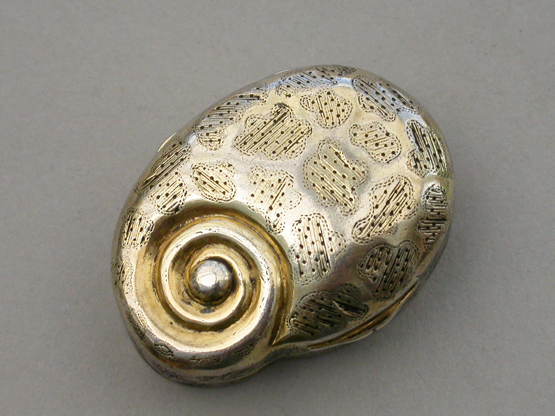 A rare George III silver gilt Vinaigrette made in the form of a snail, with bright-cut and prick-dot seaweed or amoeba type decoration, the silver gilt grille pierced with a single fern.