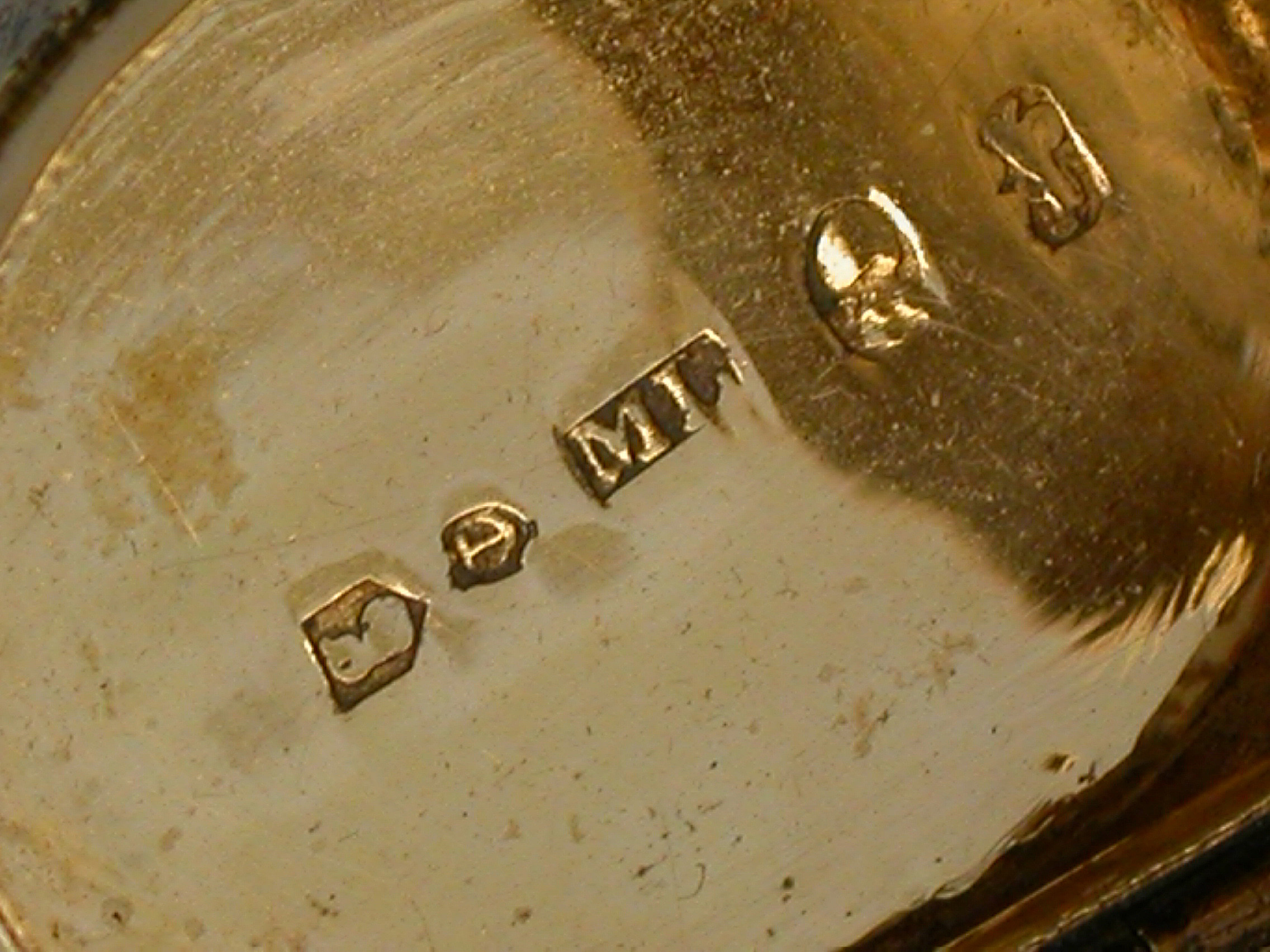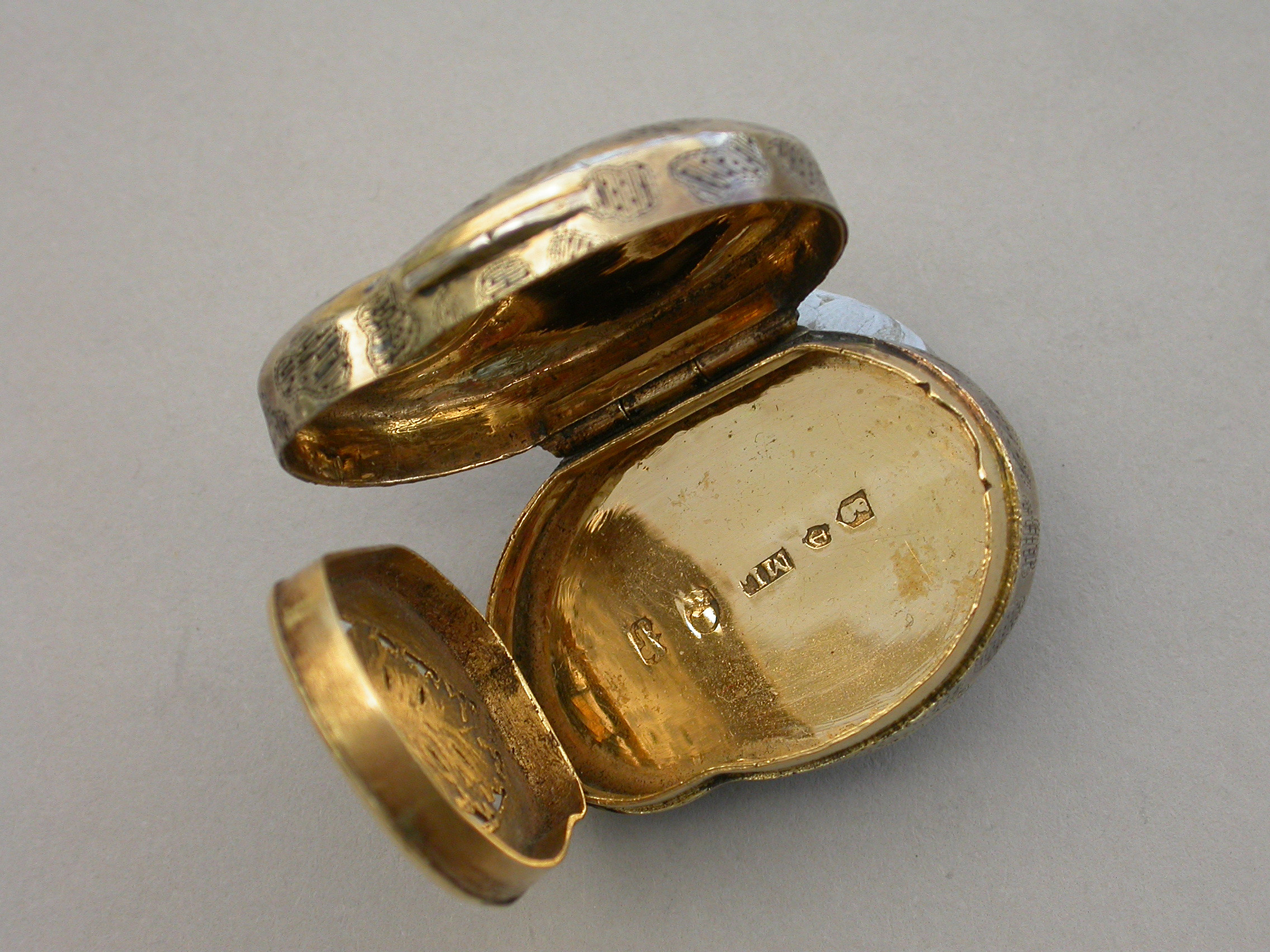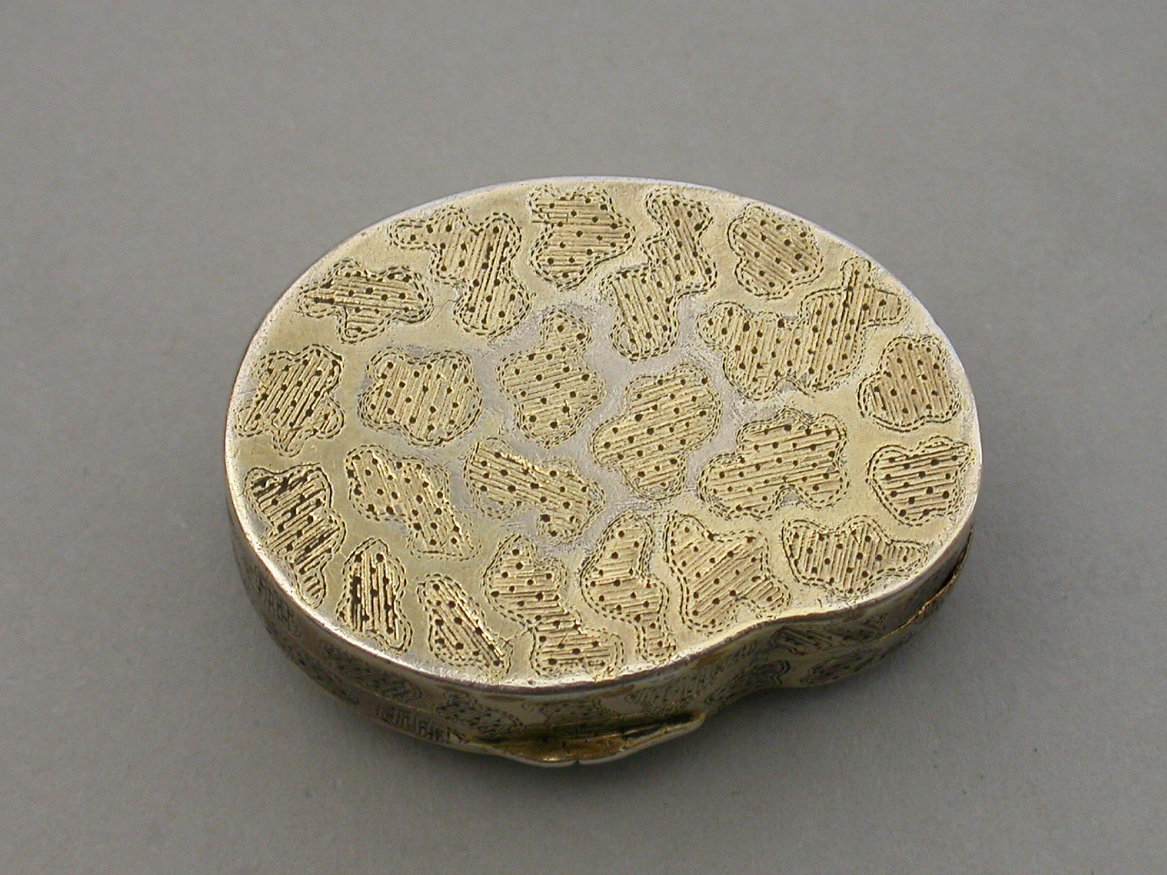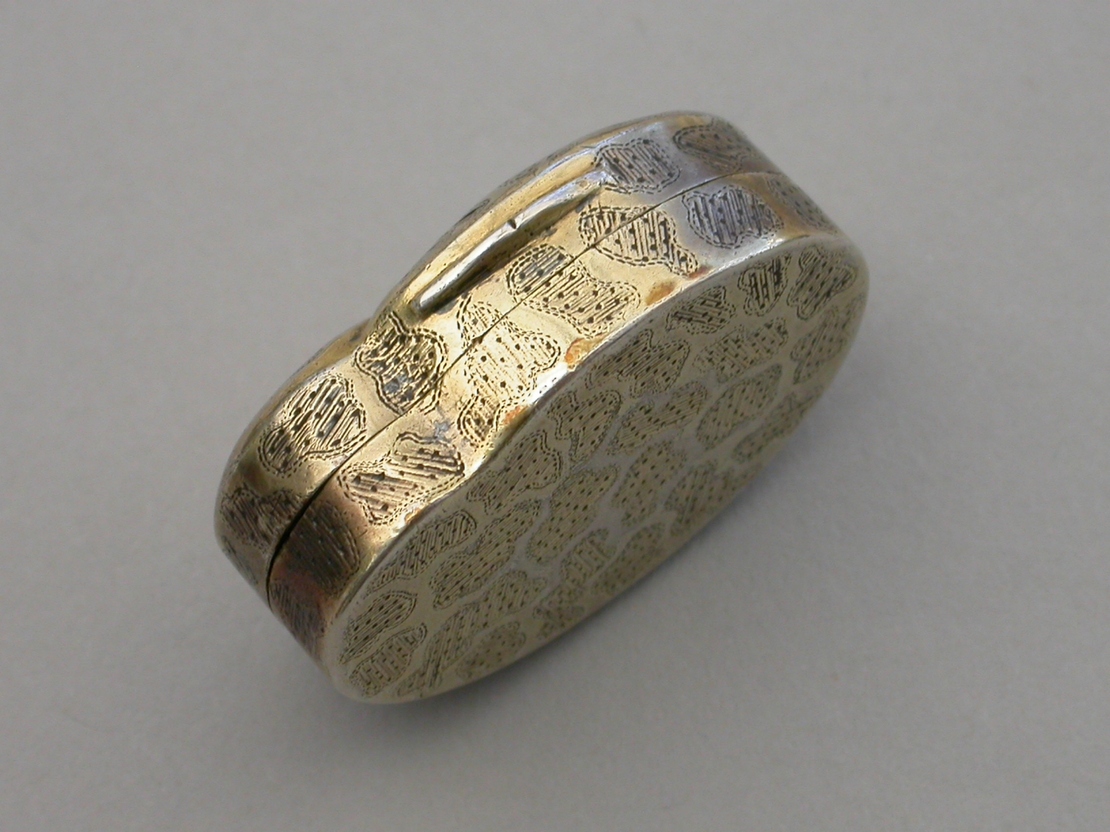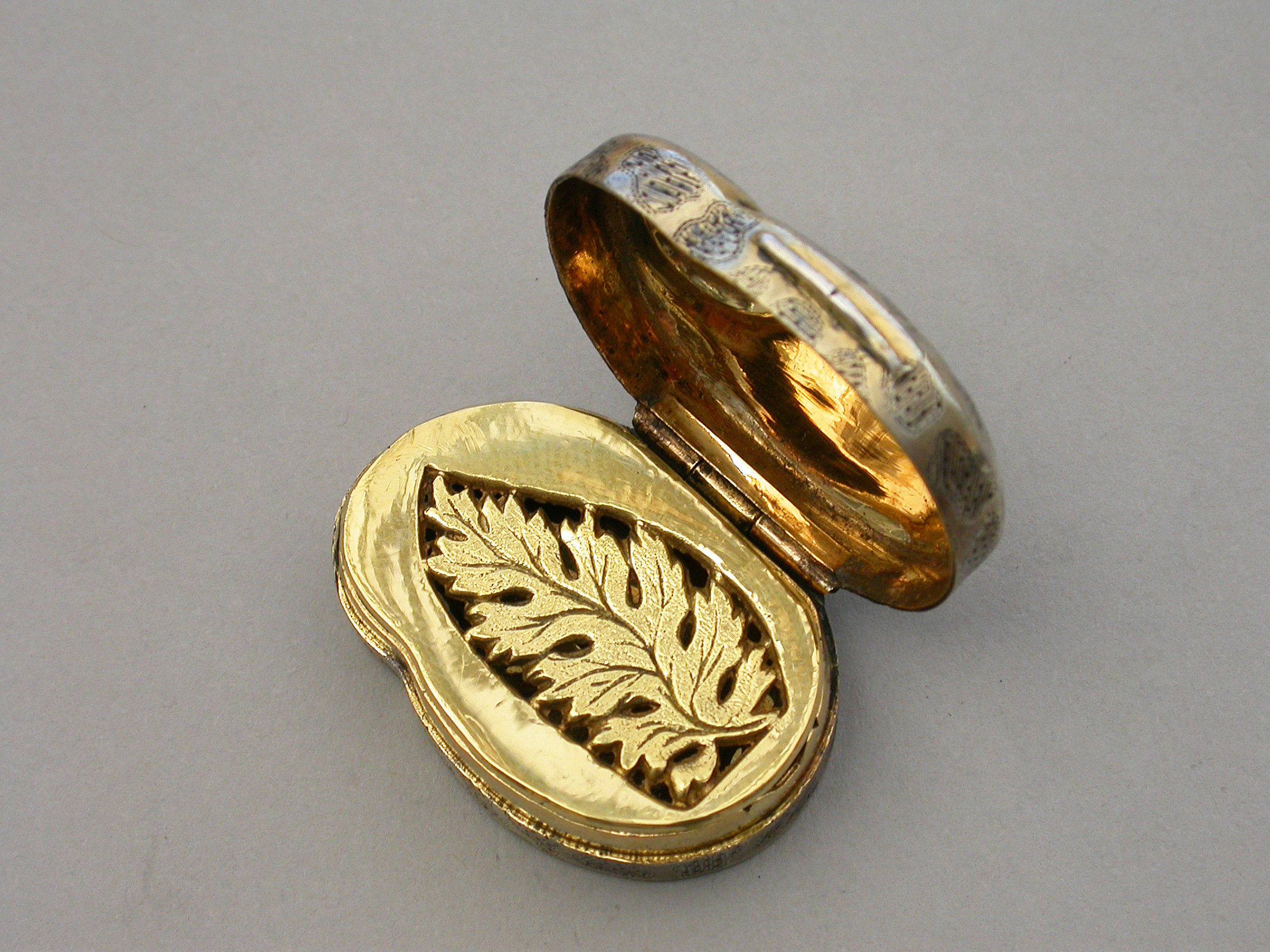 A rare George III silver gilt Vinaigrette made in the form of a snail, with bright-cut and prick-dot seaweed or amoeba type decoration, the silver gilt grille pierced with a single fern.