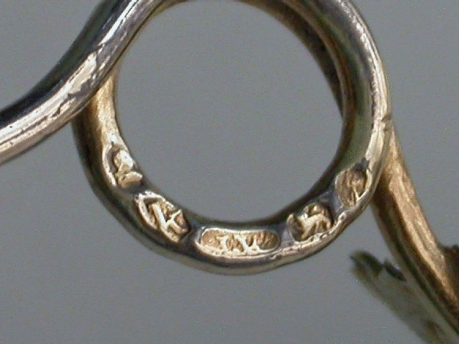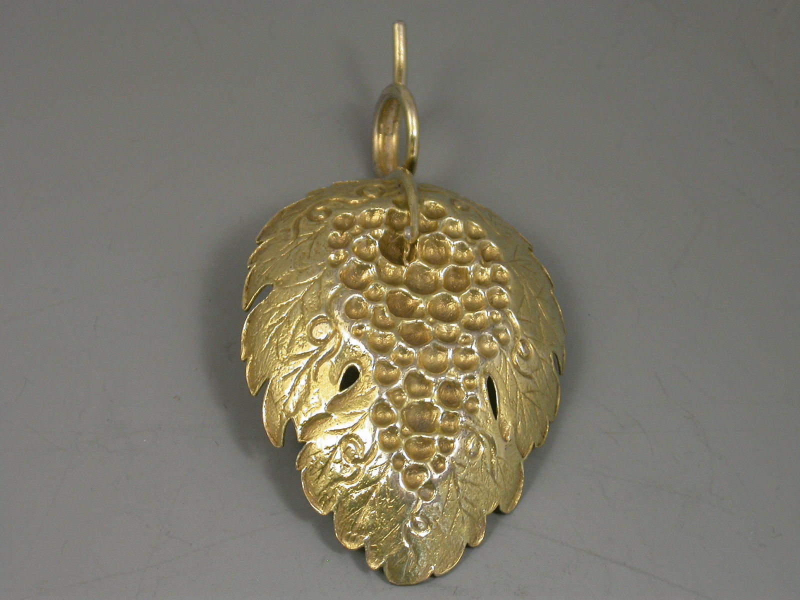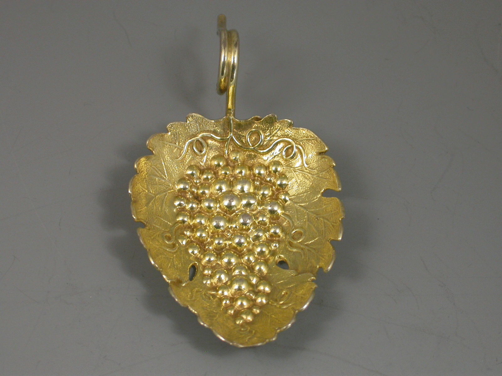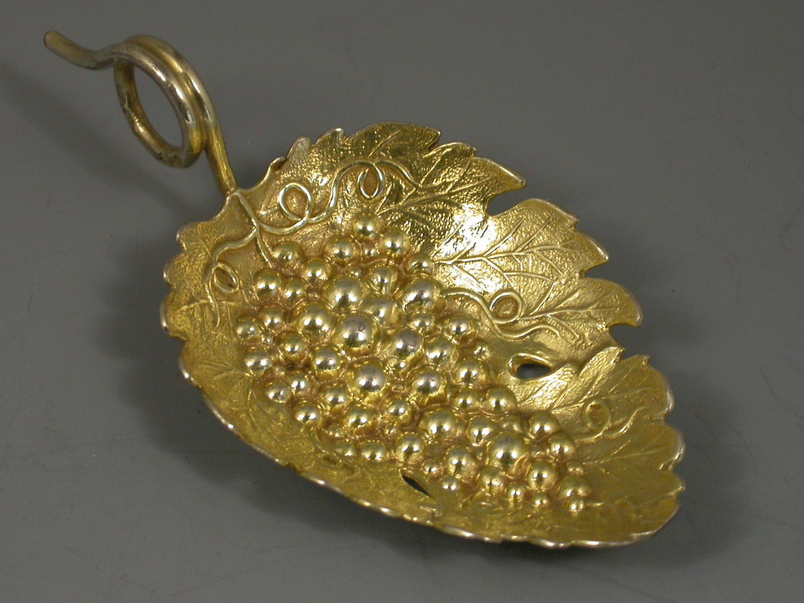 A good George III silver gilt Caddy Spoon, the die-stamped bowl in the form of a vine leaf with embosssed bunch of grapes, twisted twig handle.