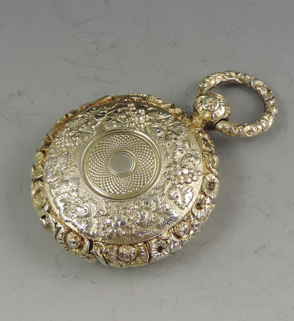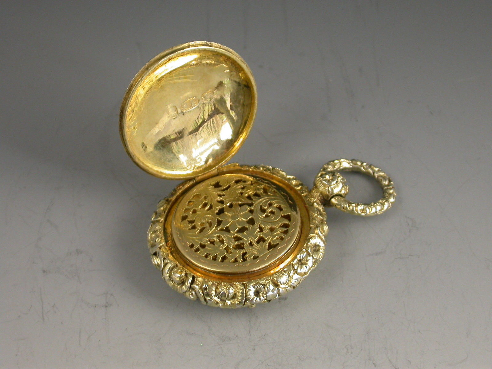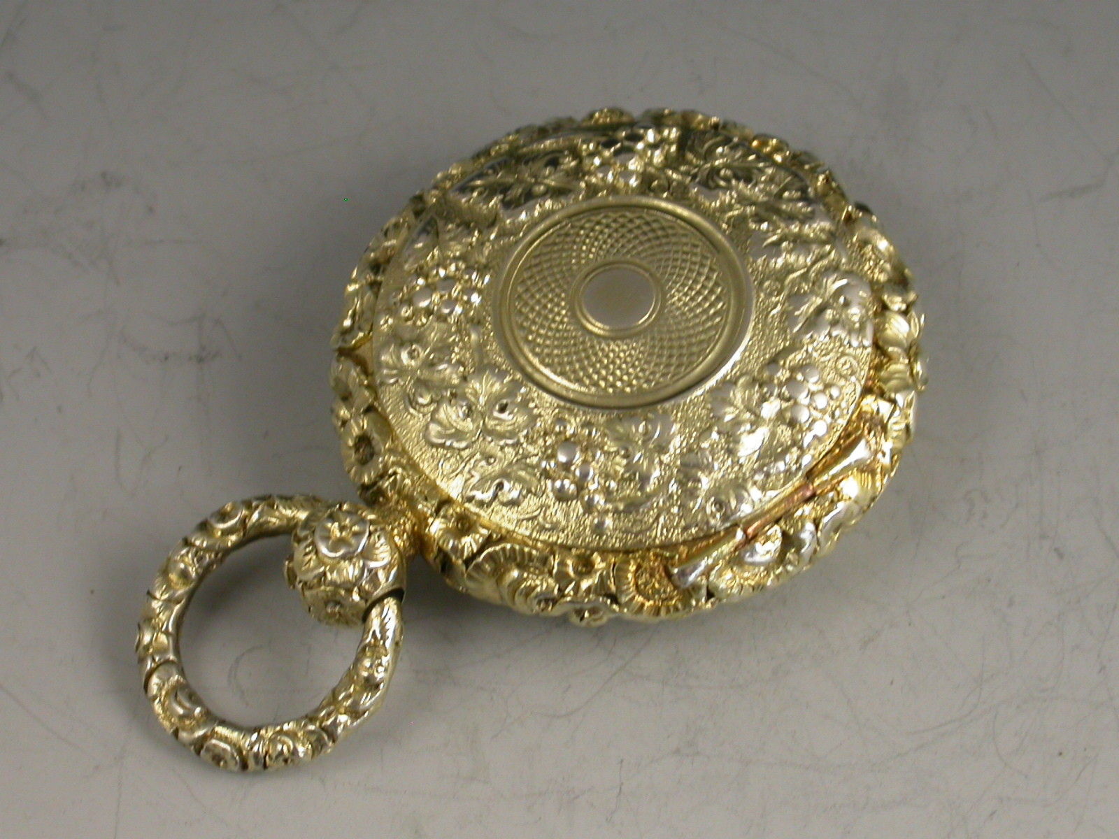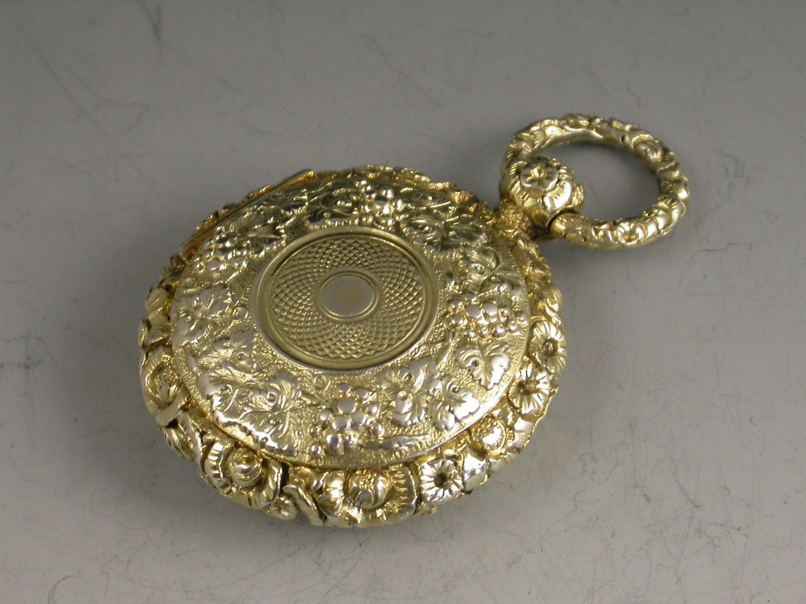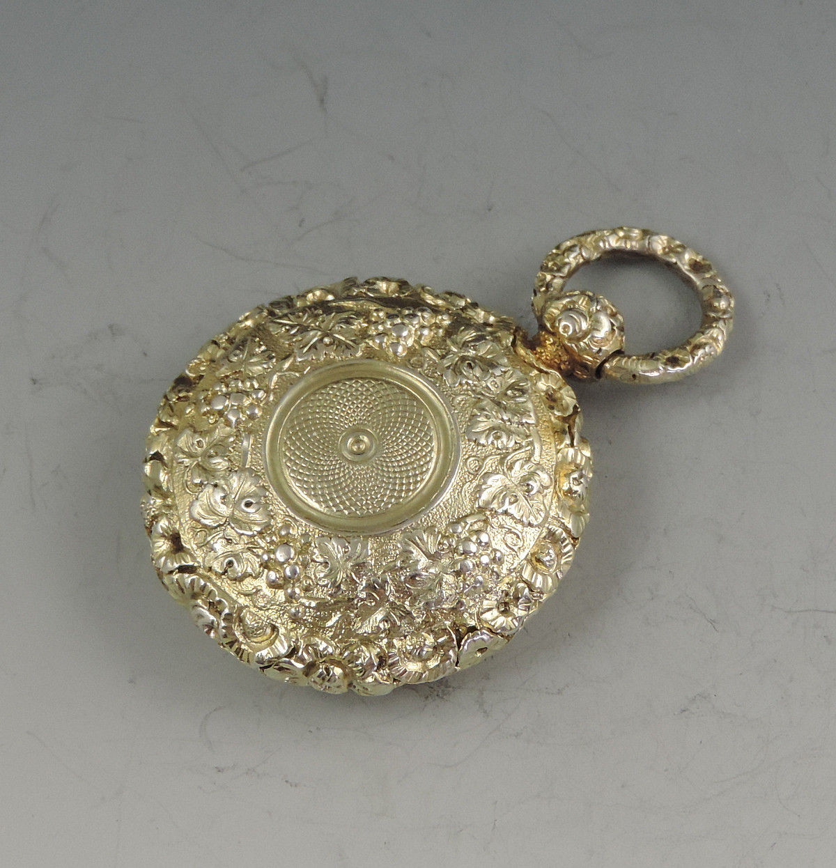 A very fine quality George III silver gilt Vinaigrette made in the form of a Pocket Watch with attached suspension ring, the base lid and sides profusely decorated with chased vine leaves, grapes and flower heads on a matt background with engine turned discs to the centre, the hinged circular lid opening to reveal the silver gilt interior with intricately pierced foliate scroll grille.