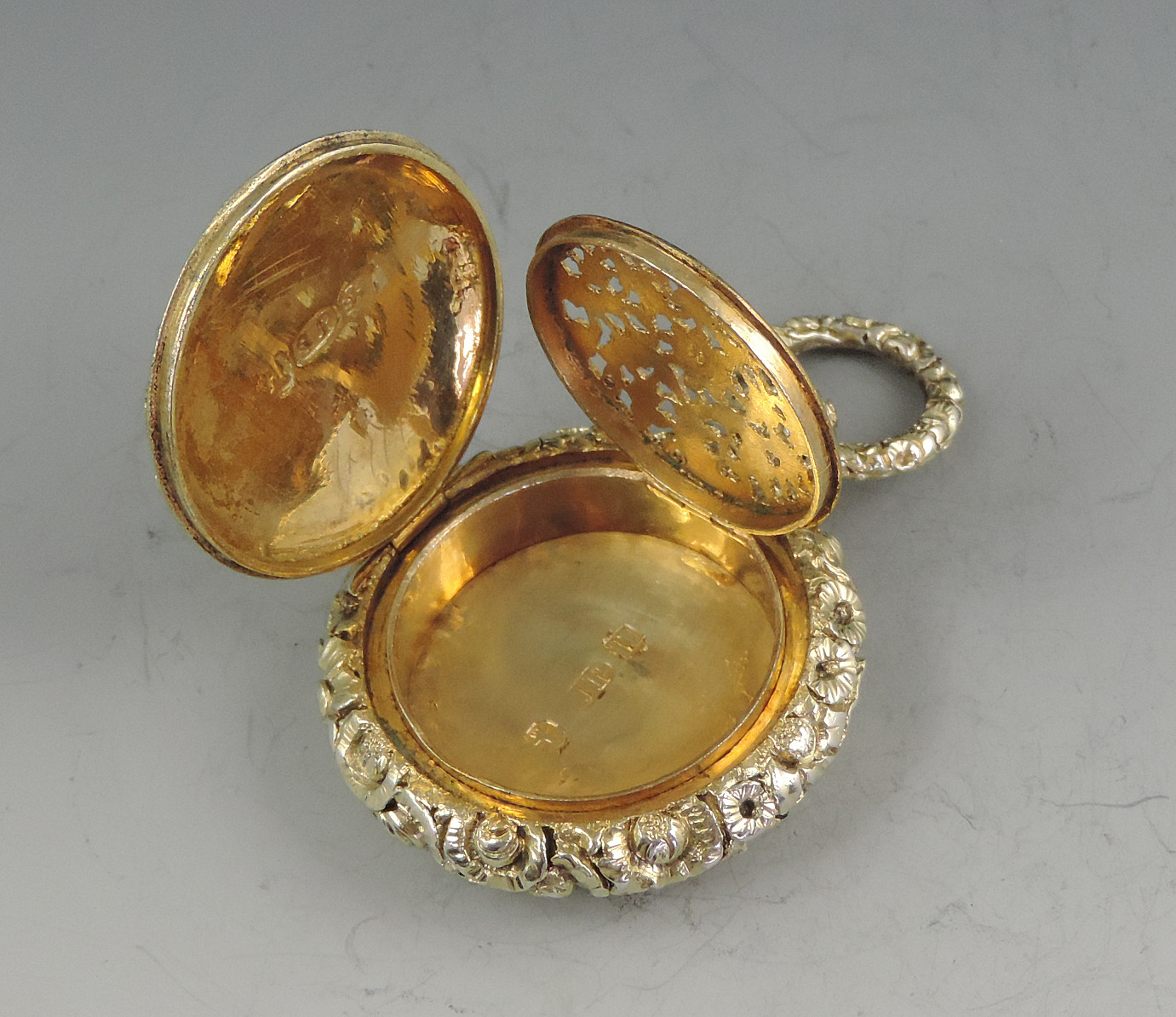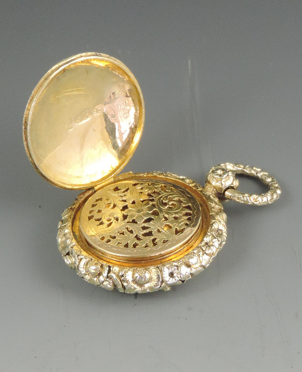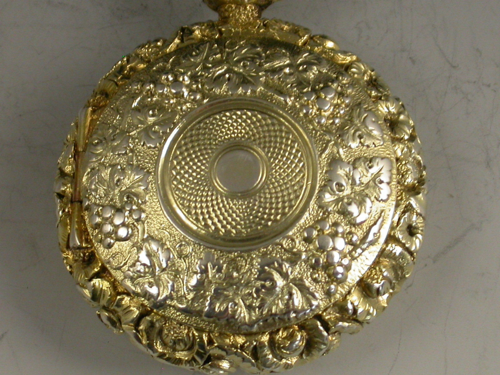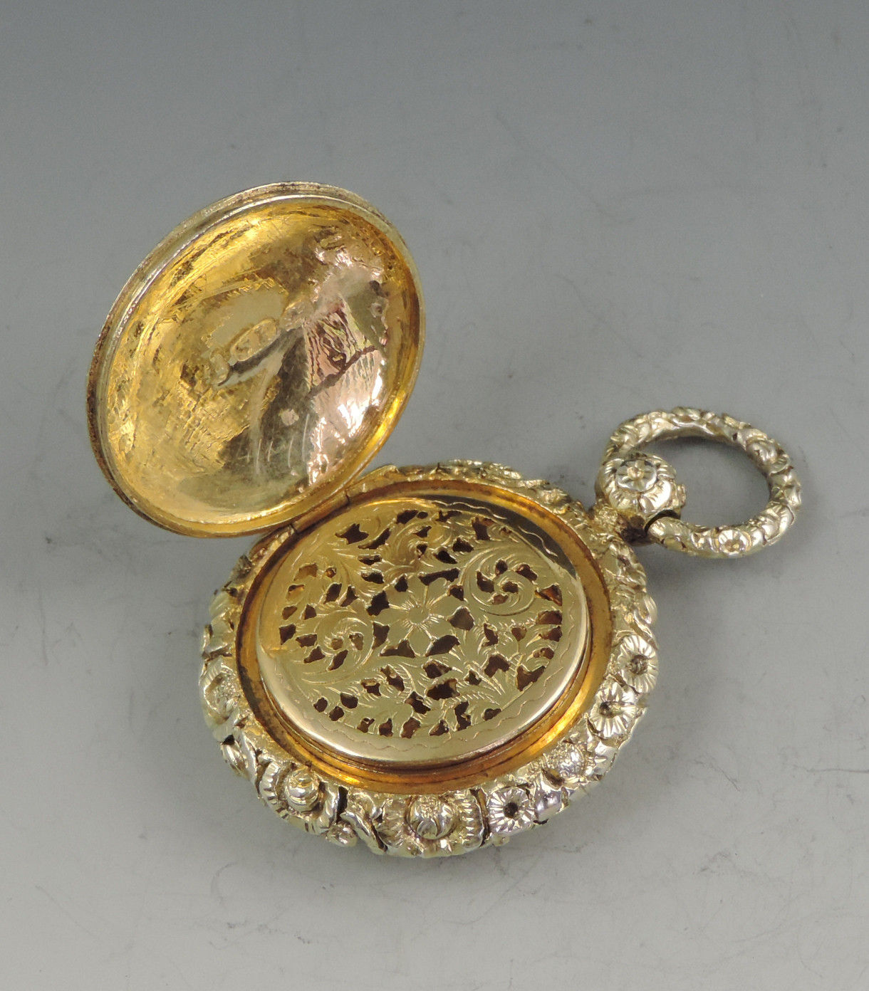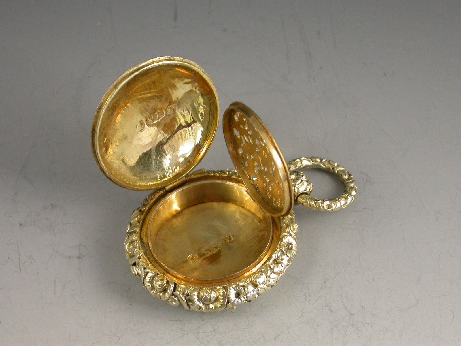 A very fine quality George III silver gilt Vinaigrette made in the form of a Pocket Watch with attached suspension ring, the base lid and sides profusely decorated with chased vine leaves, grapes and flower heads on a matt background with engine turned discs to the centre, the hinged circular lid opening to reveal the silver gilt interior with intricately pierced foliate scroll grille.