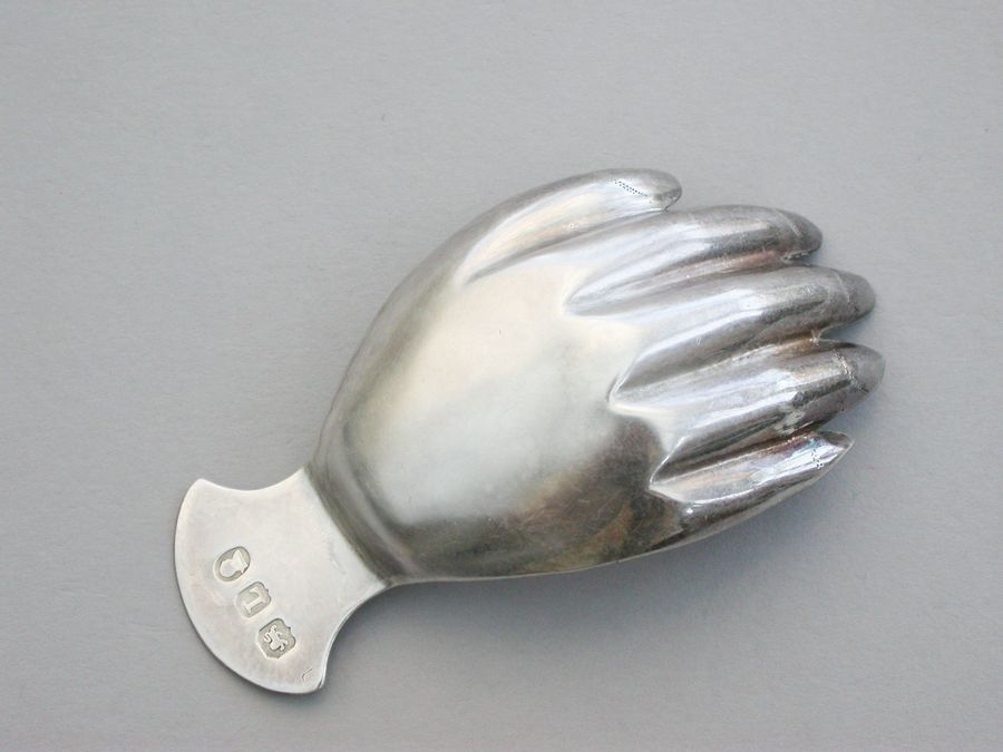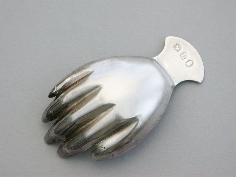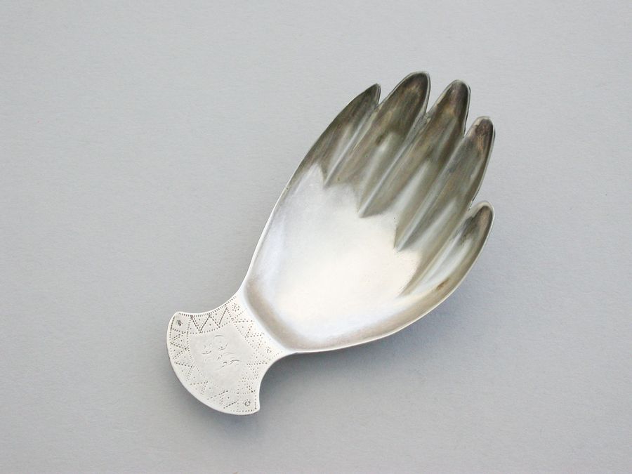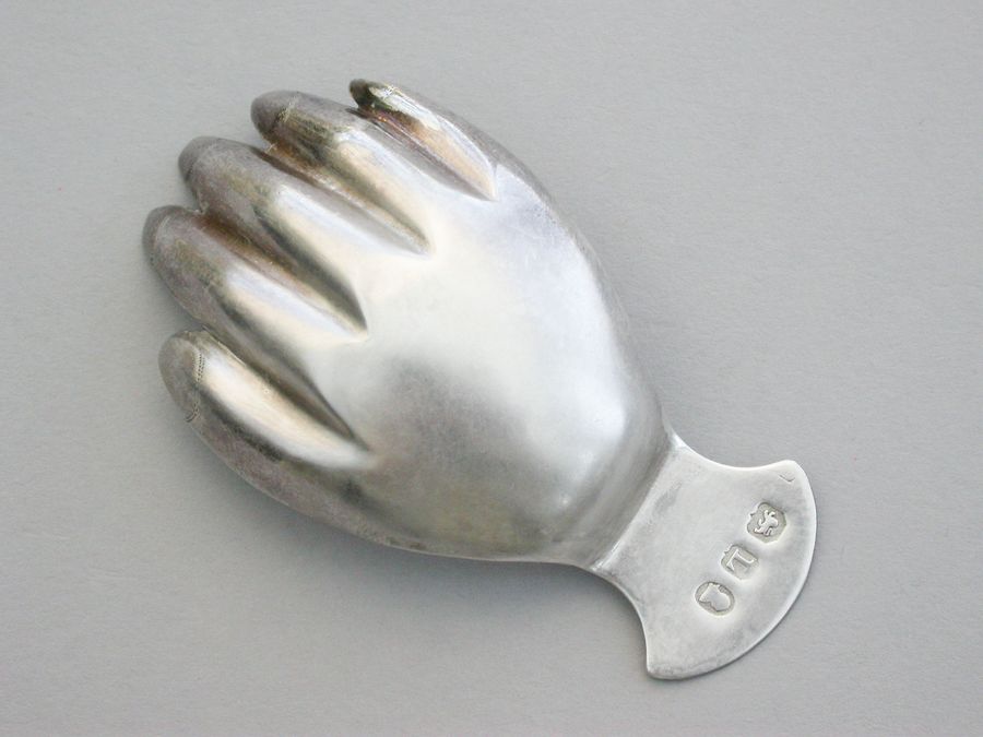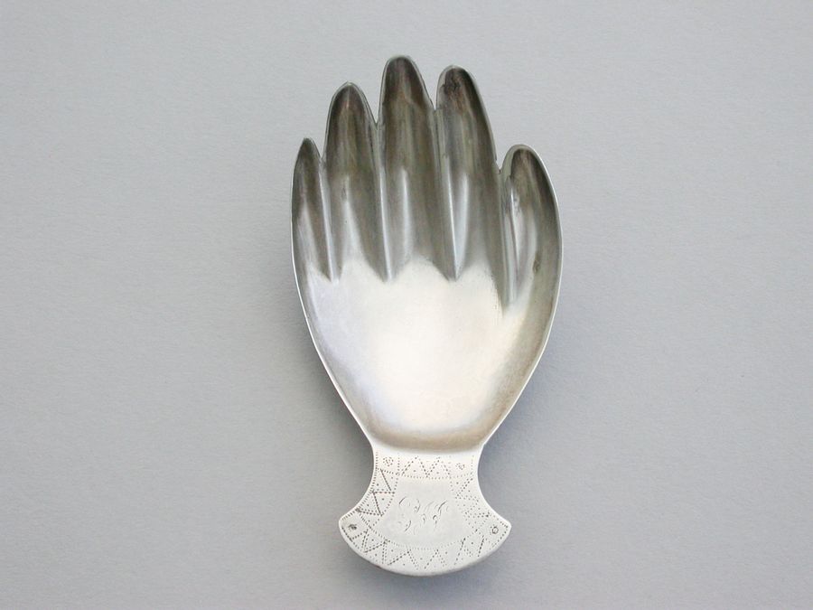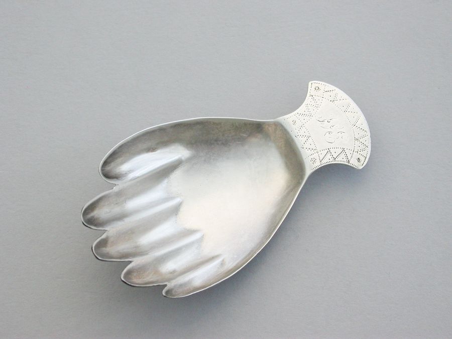 A rare George III silver Caddy Spoon, made in the form of a right hand, the cuff shaped handle with prick-dot engraved decoration and engraved with initials.