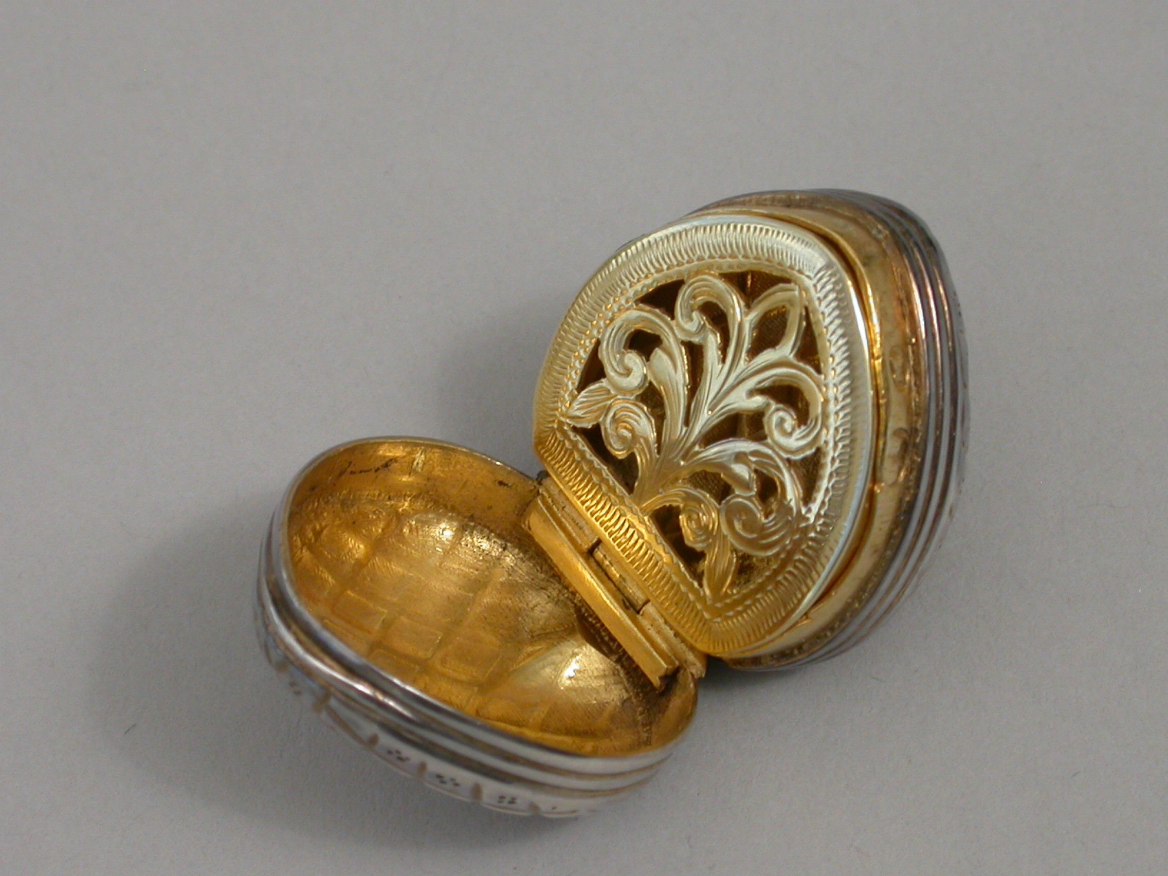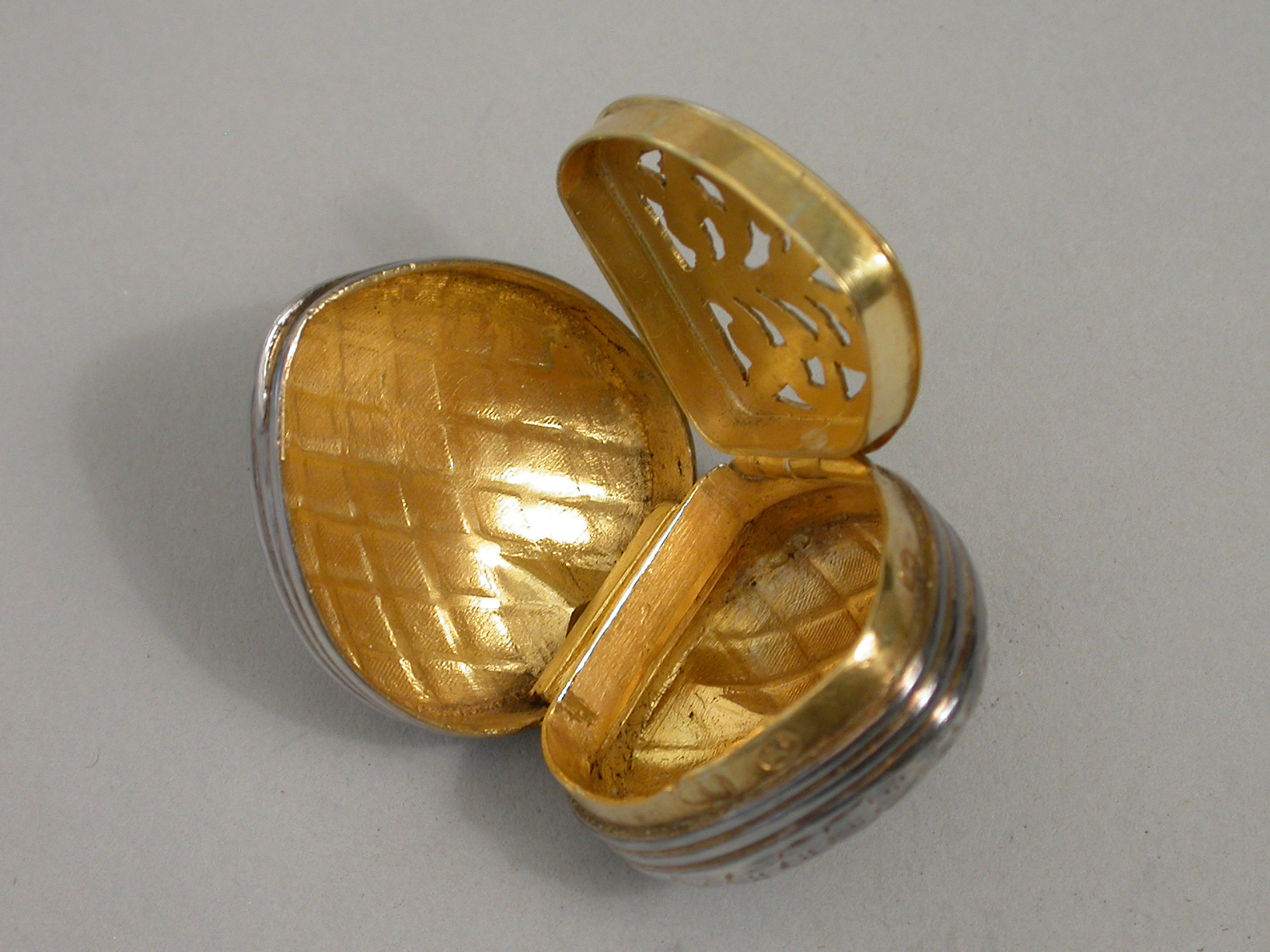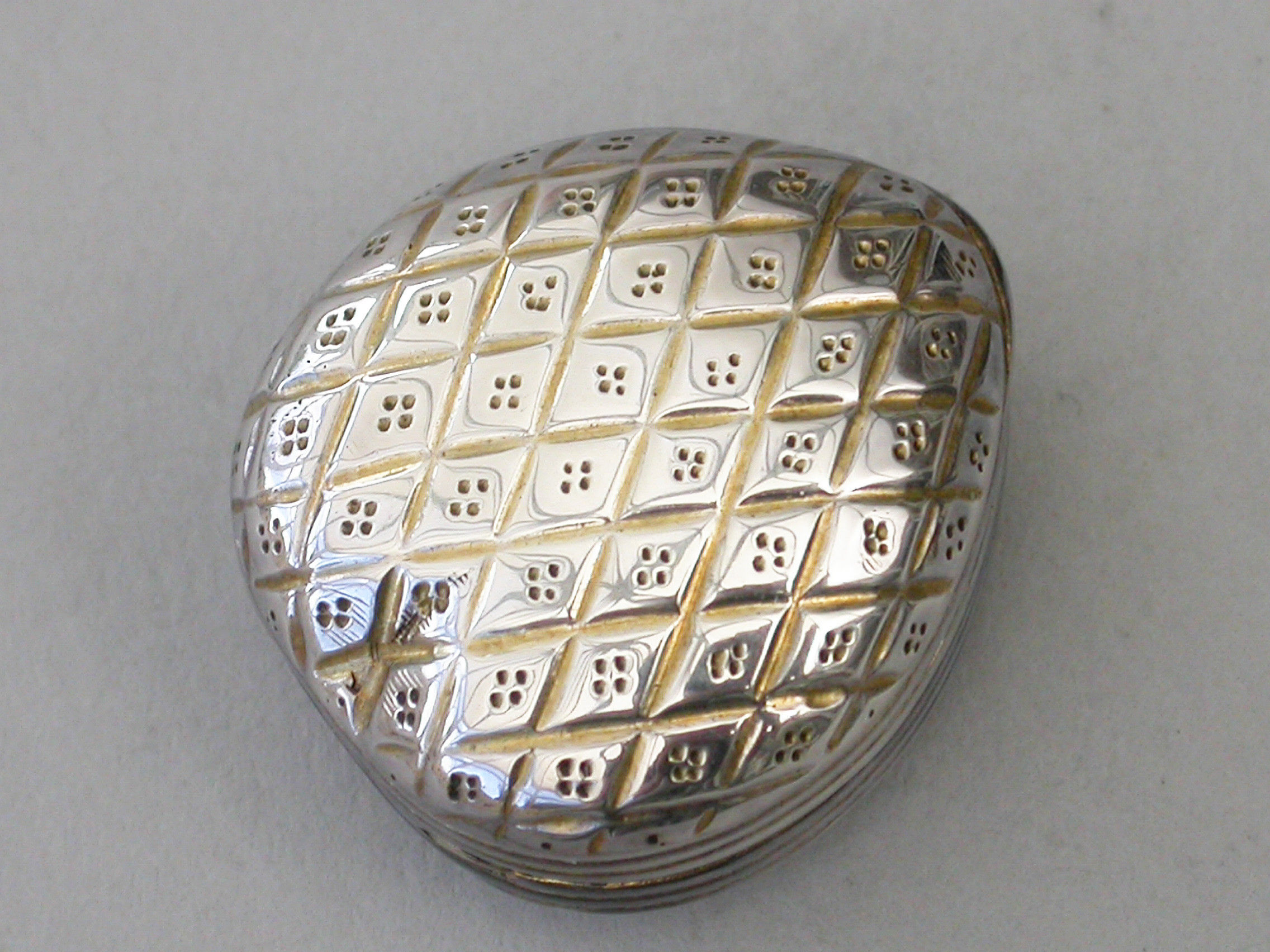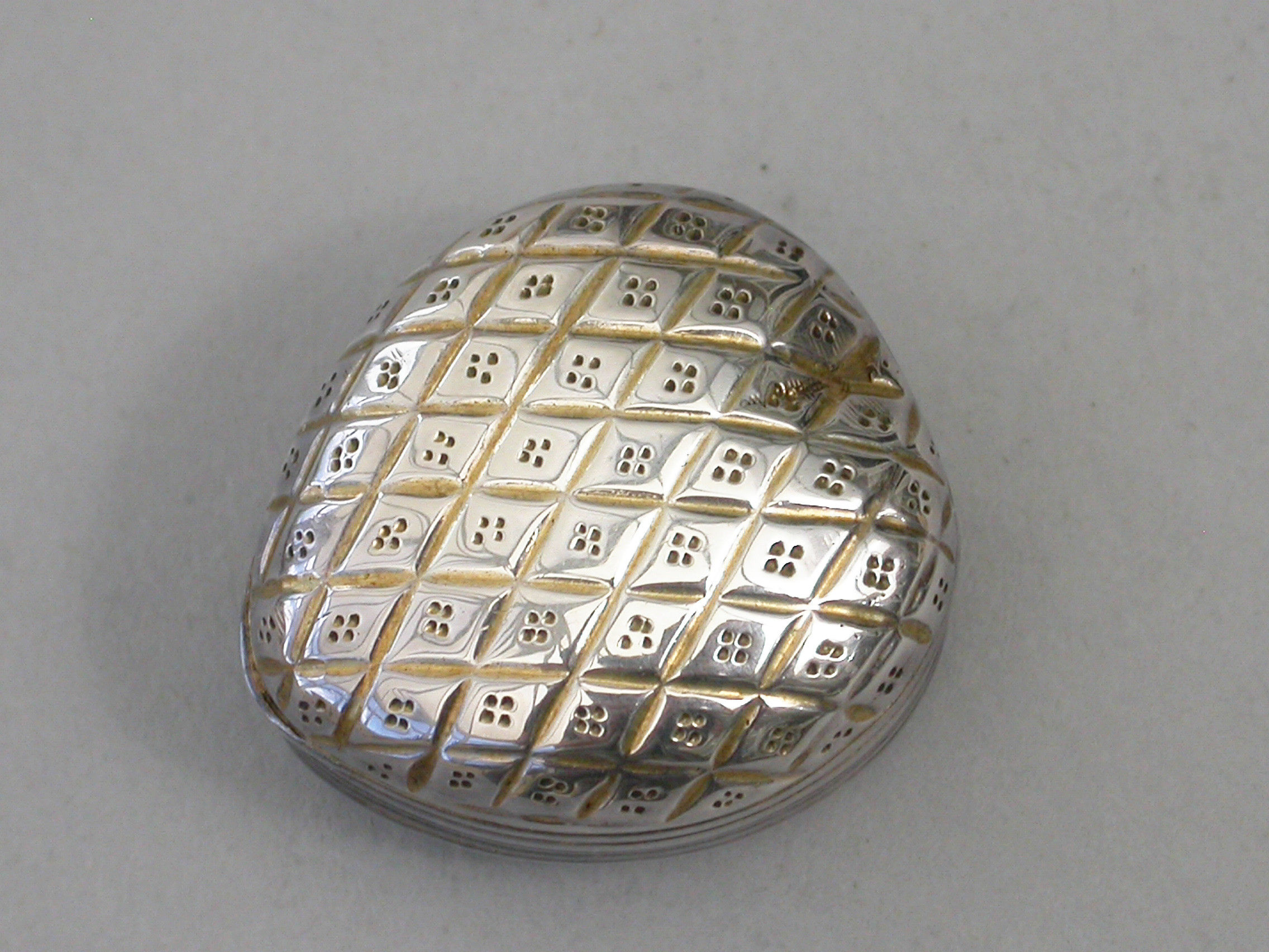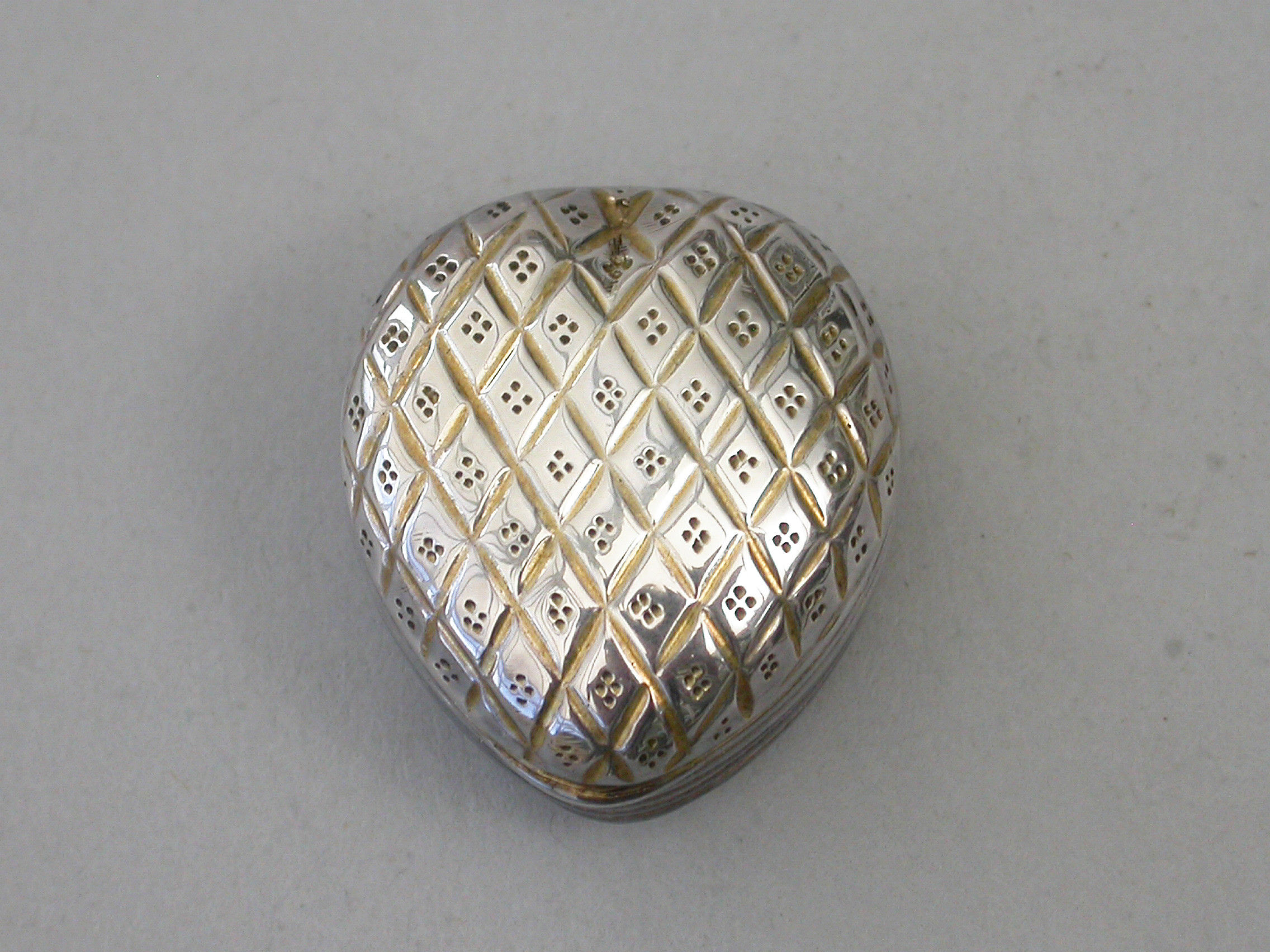 A rare George III silver Vinaigrette of heart shape with reeded rims, the top and bottom engraved with diaper work with a floral motif in the centre, the silver gilt grille pierced with scrolls in an anthemion pattern.