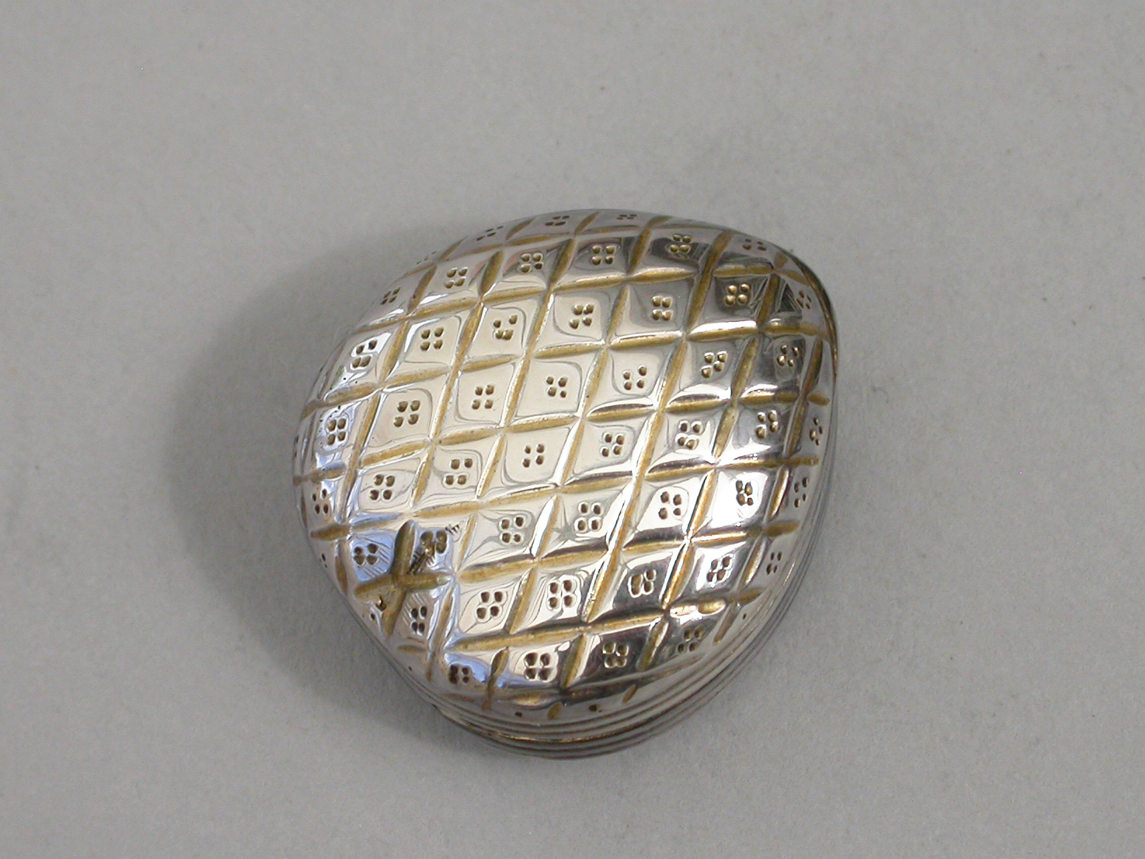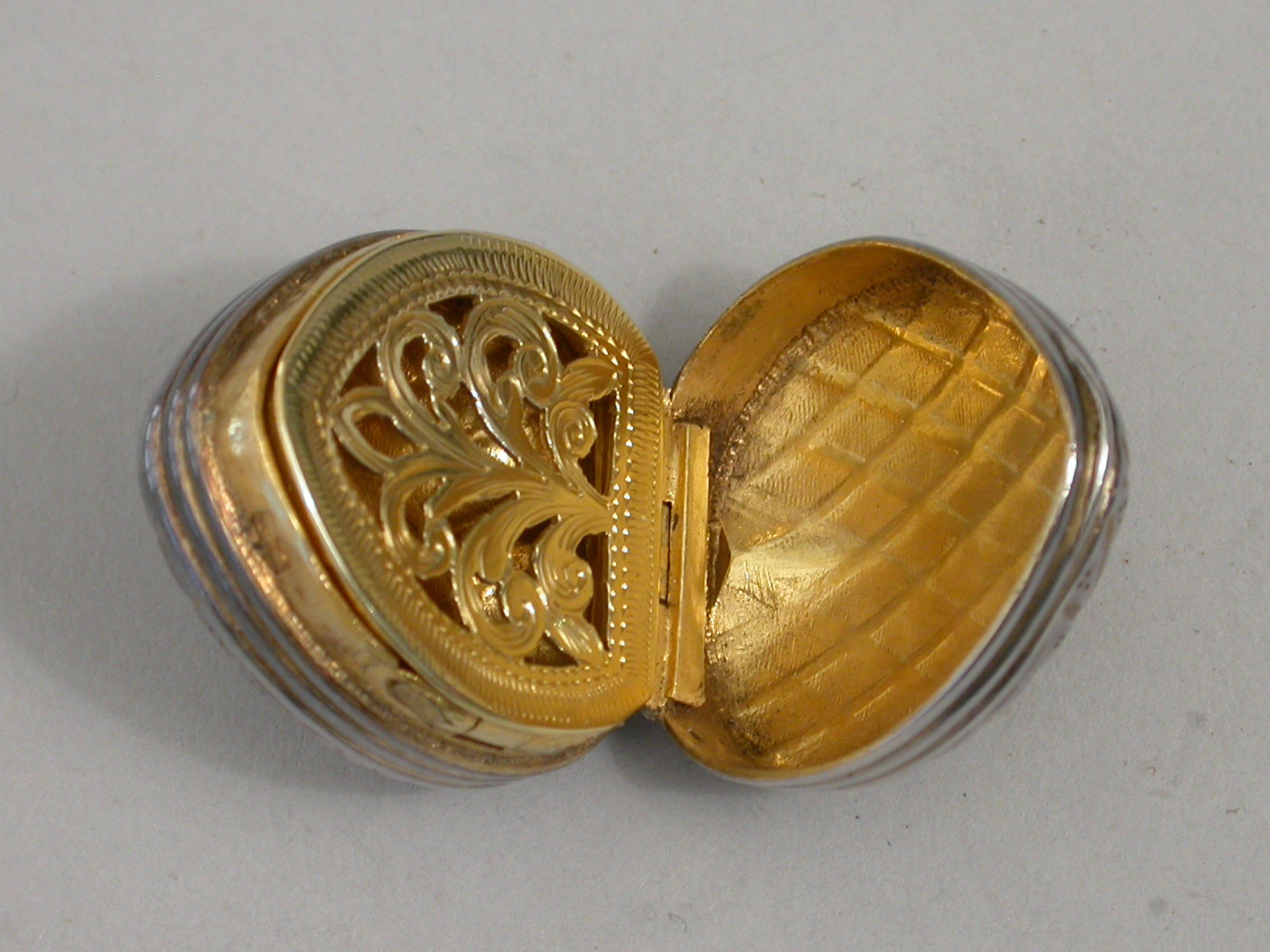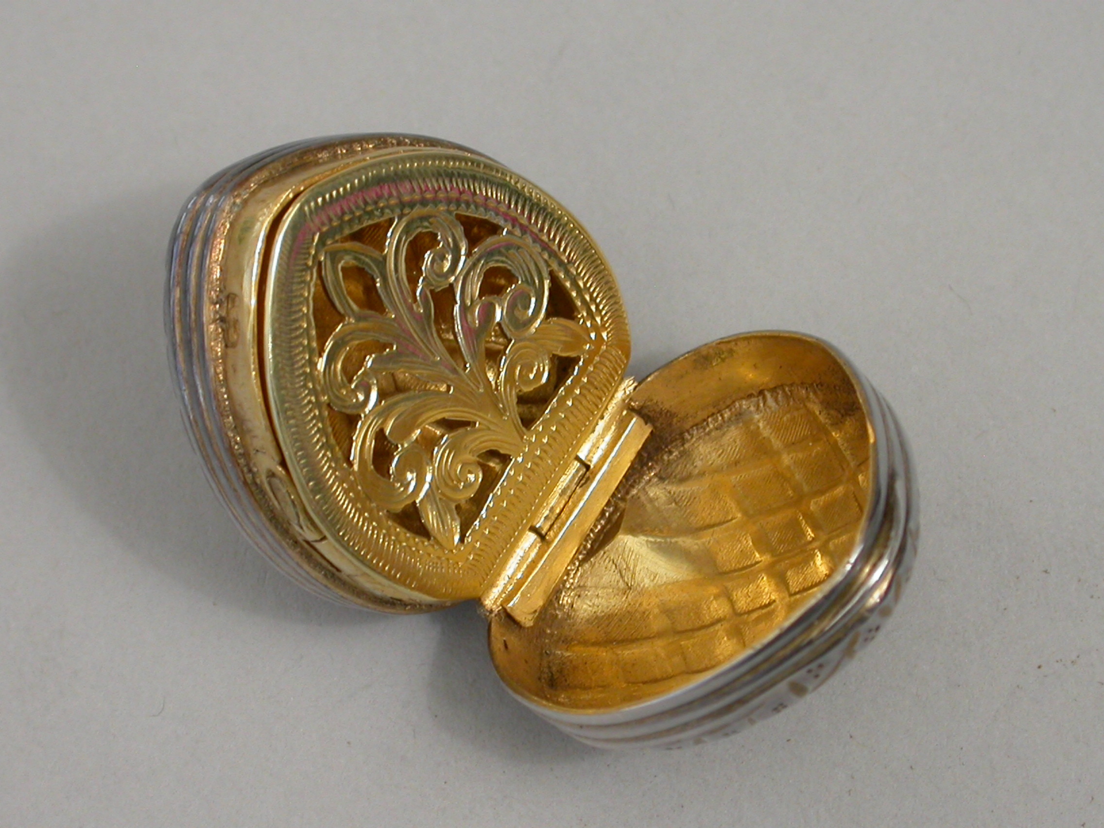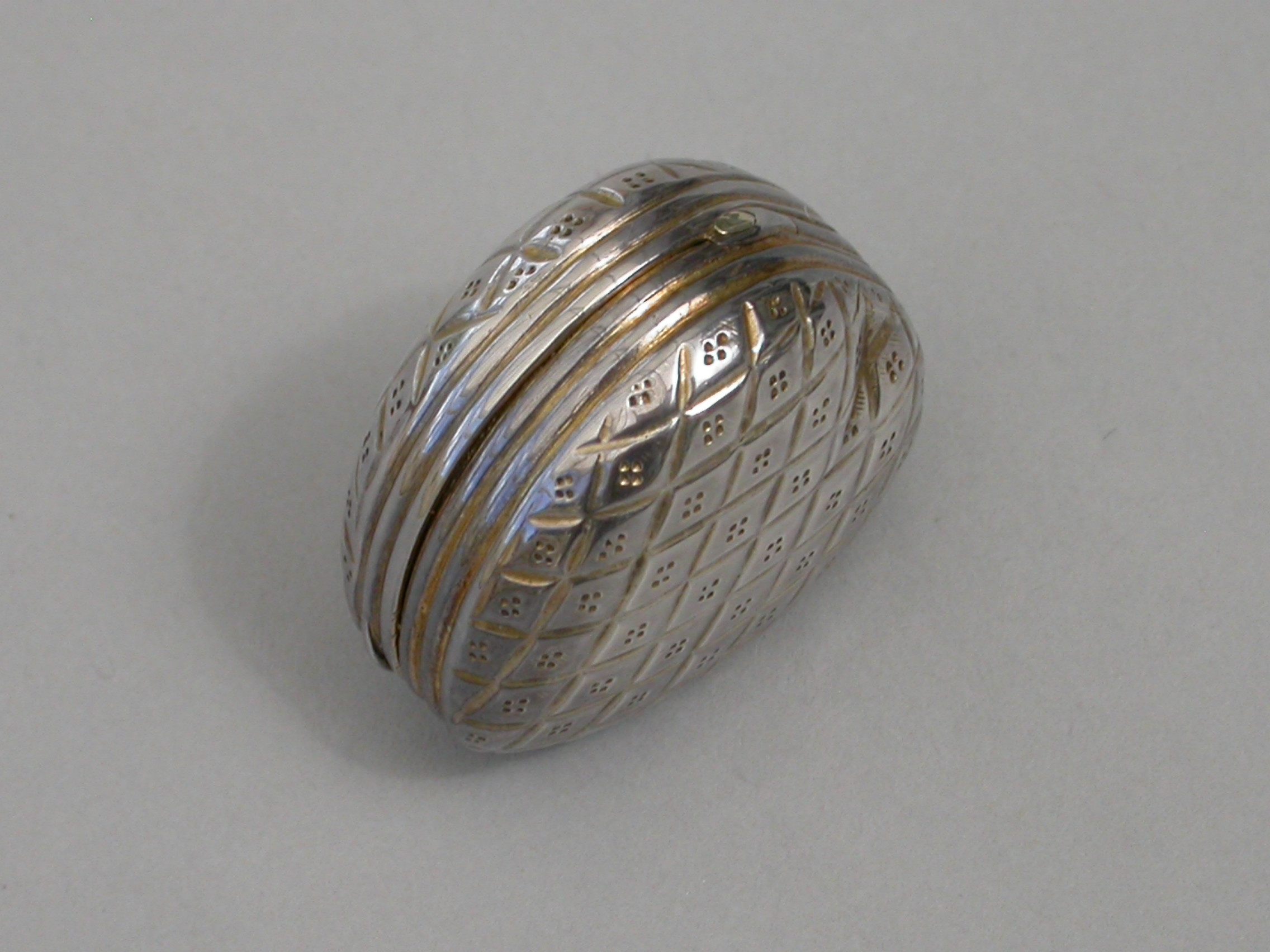 A rare George III silver Vinaigrette of heart shape with reeded rims, the top and bottom engraved with diaper work with a floral motif in the centre, the silver gilt grille pierced with scrolls in an anthemion pattern.