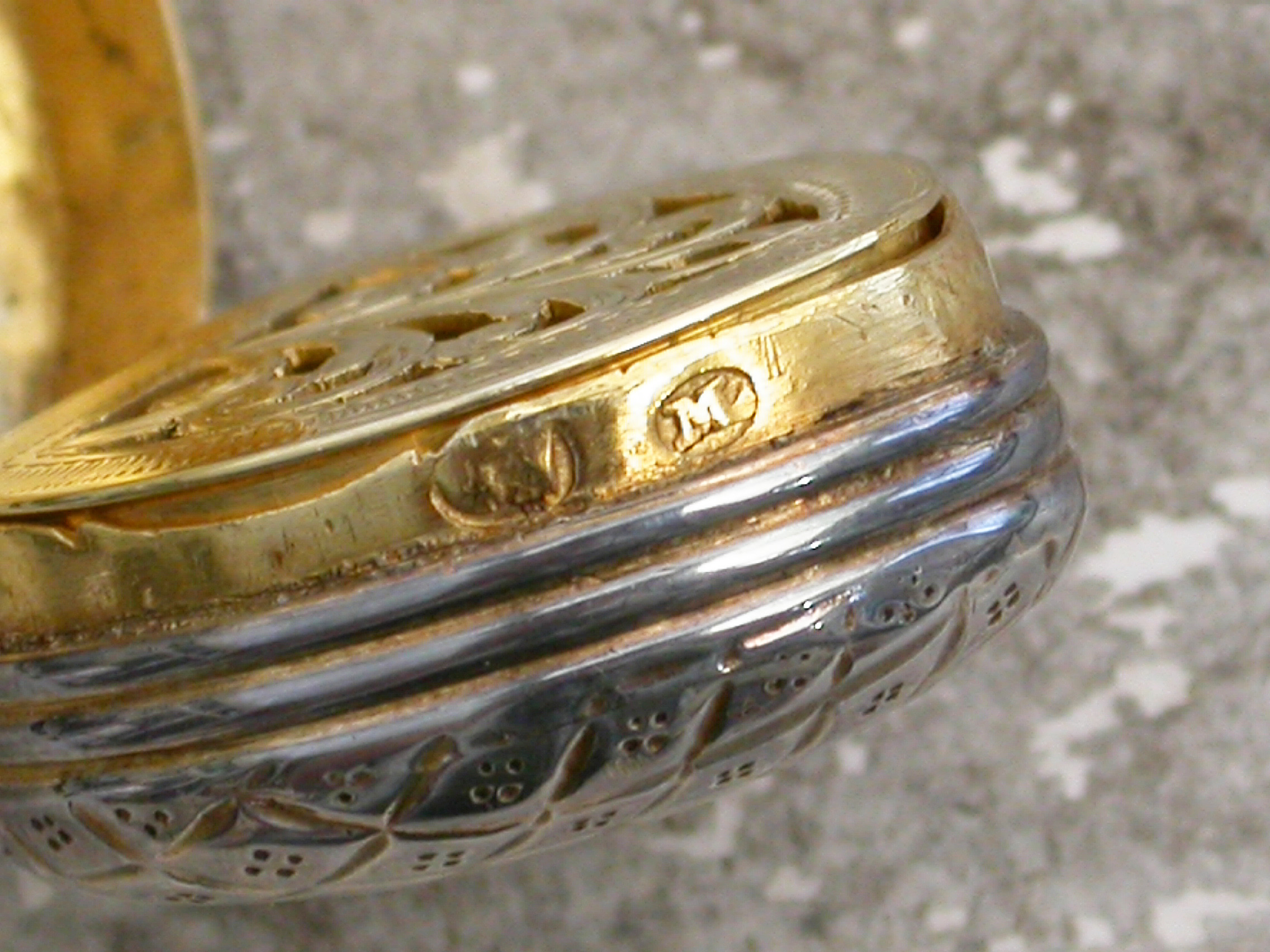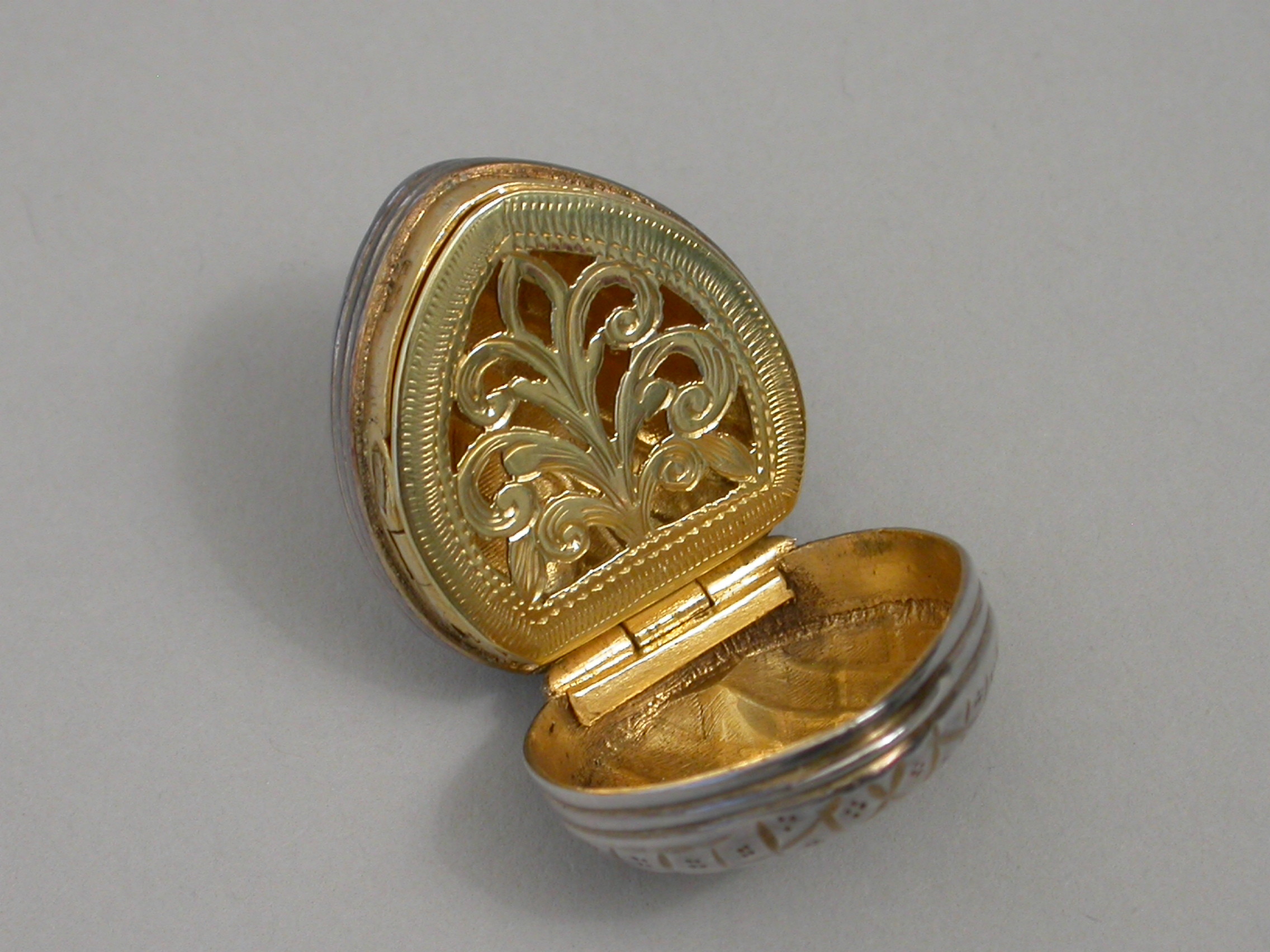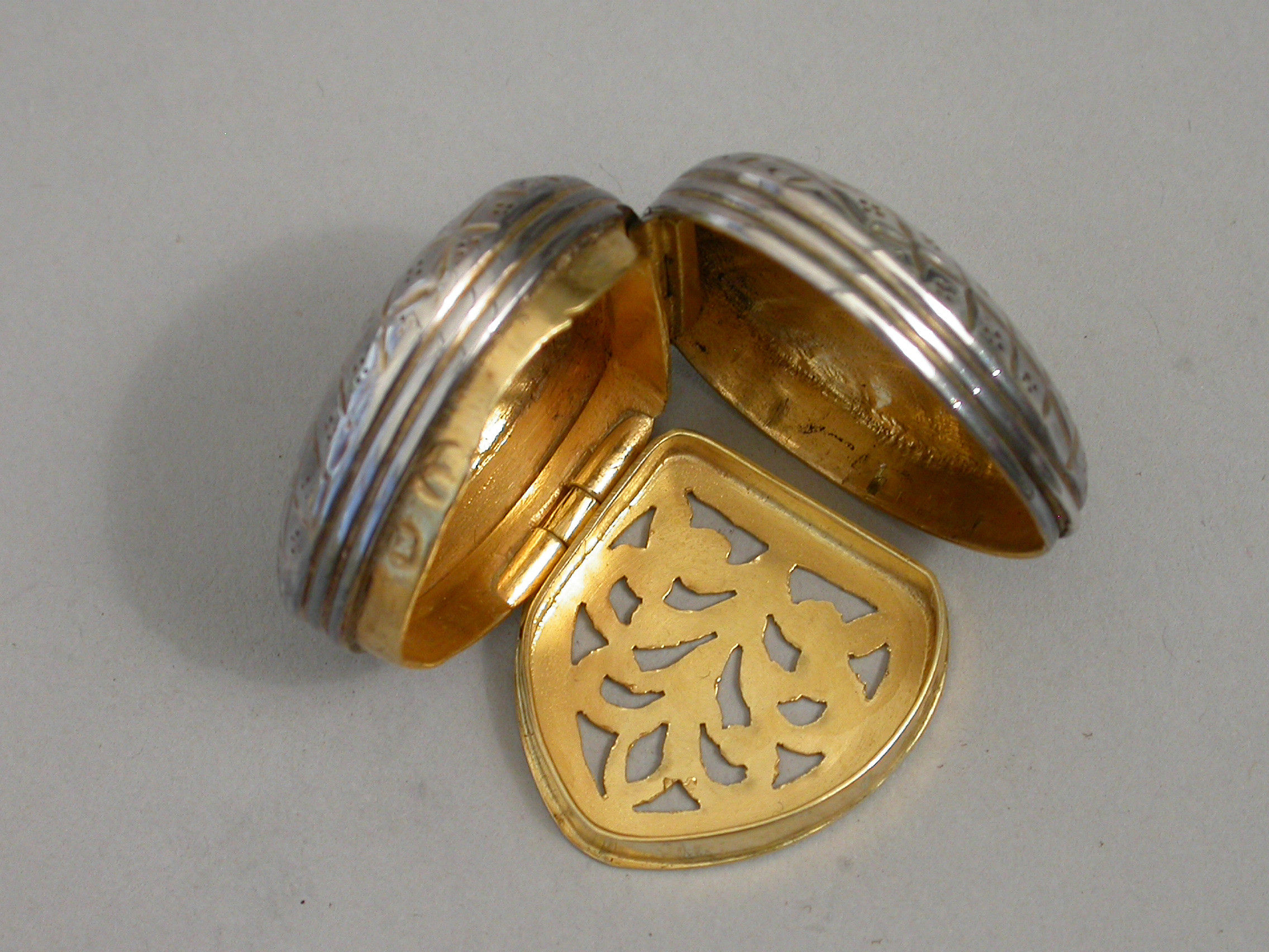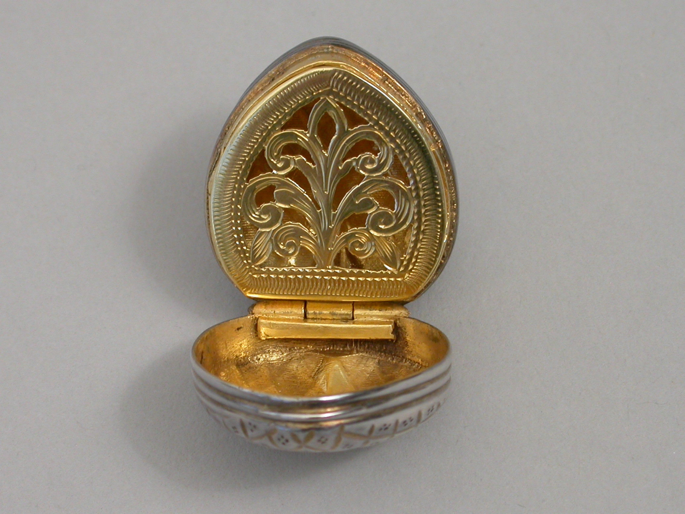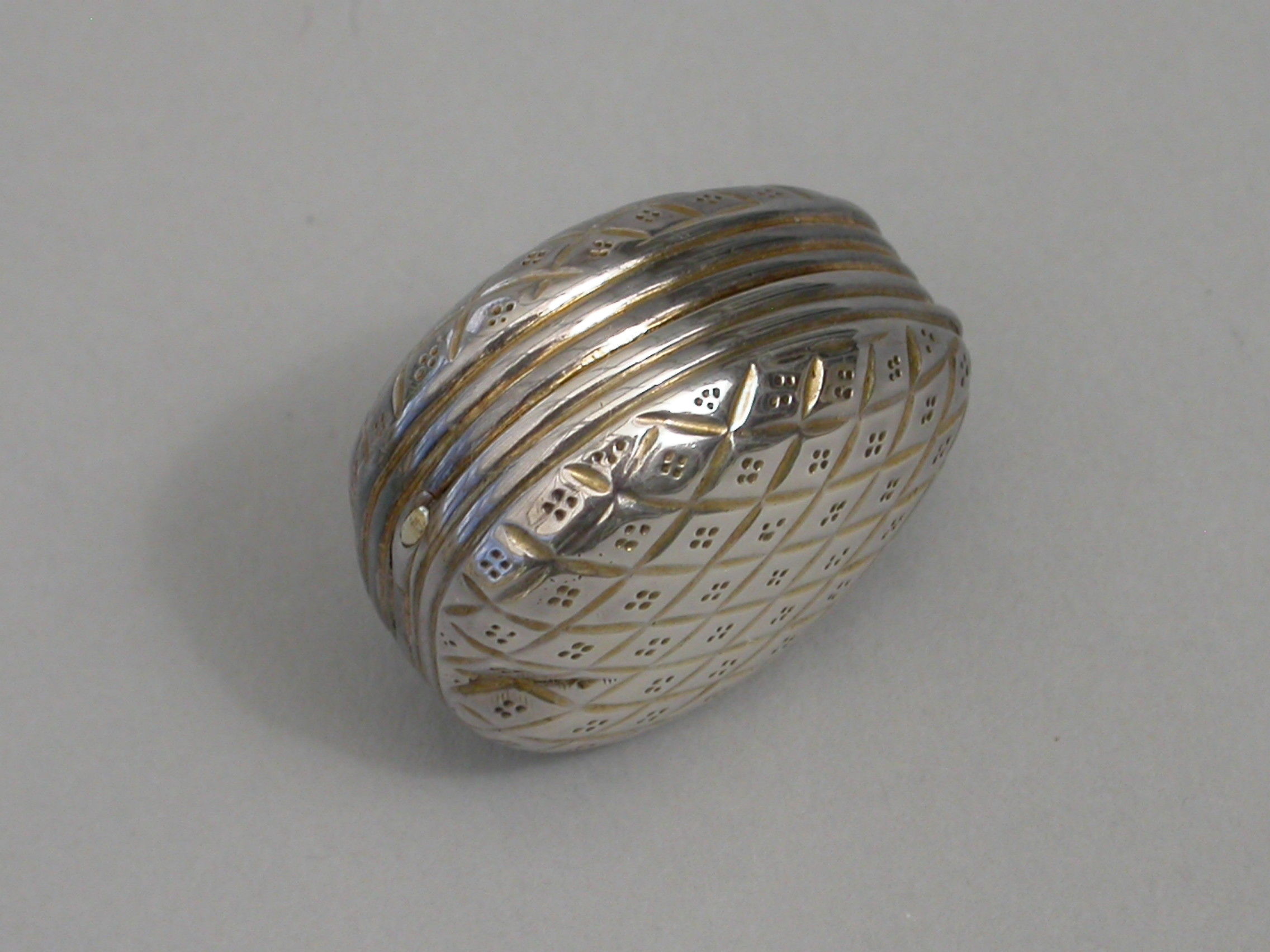 A rare George III silver Vinaigrette of heart shape with reeded rims, the top and bottom engraved with diaper work with a floral motif in the centre, the silver gilt grille pierced with scrolls in an anthemion pattern.