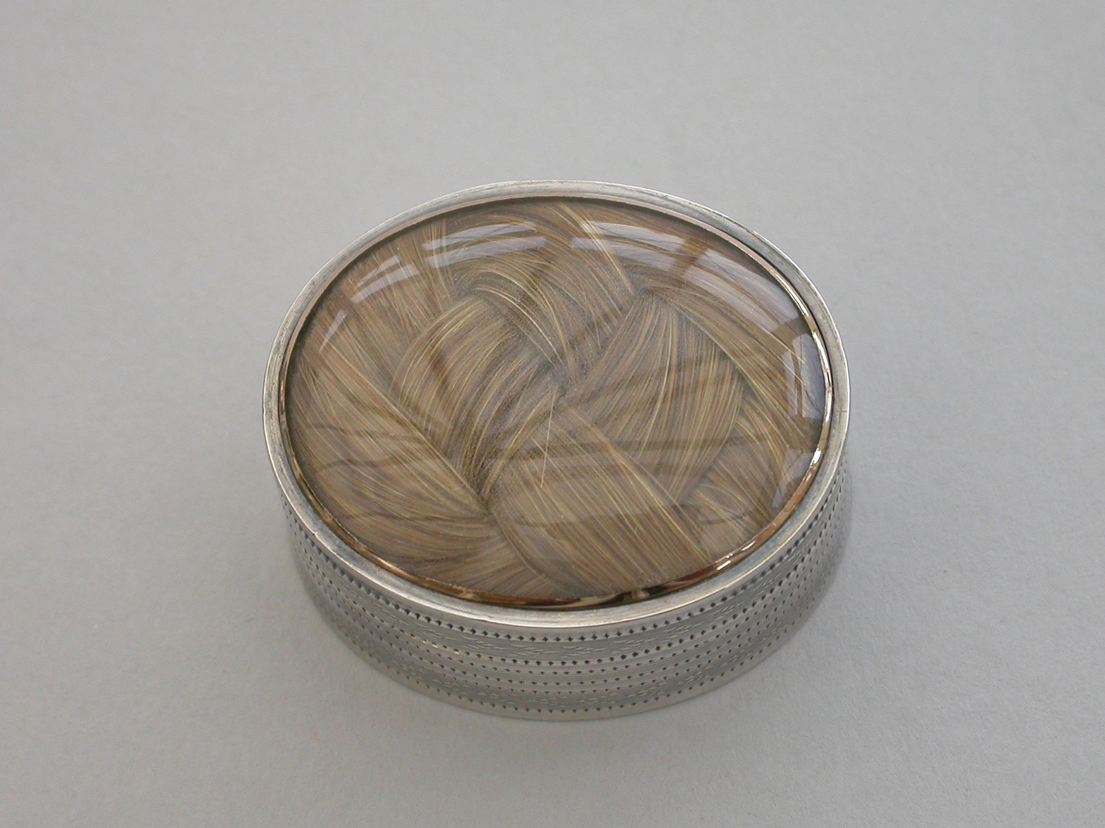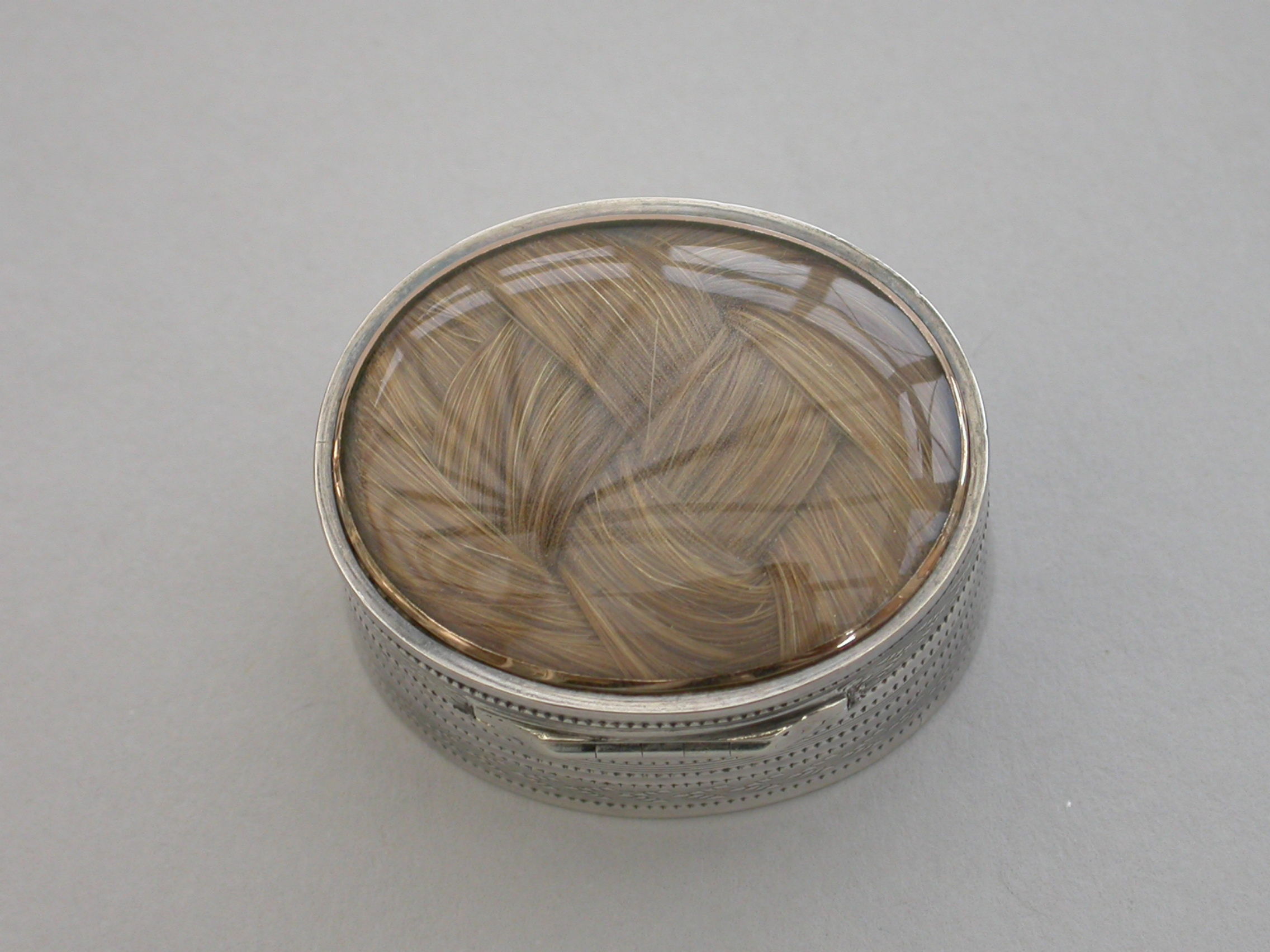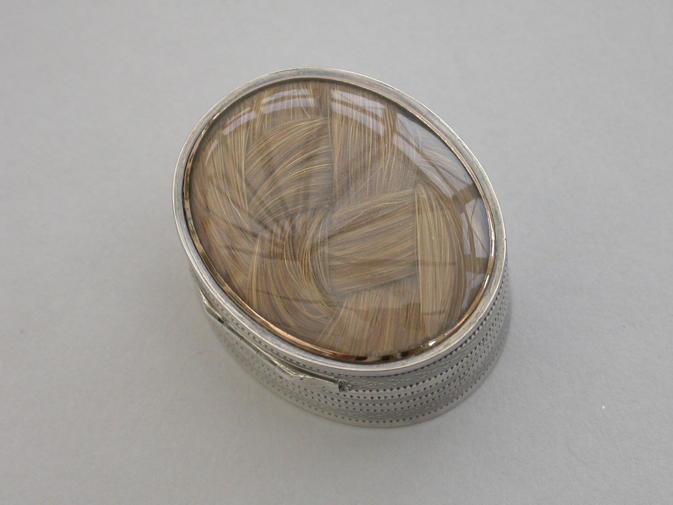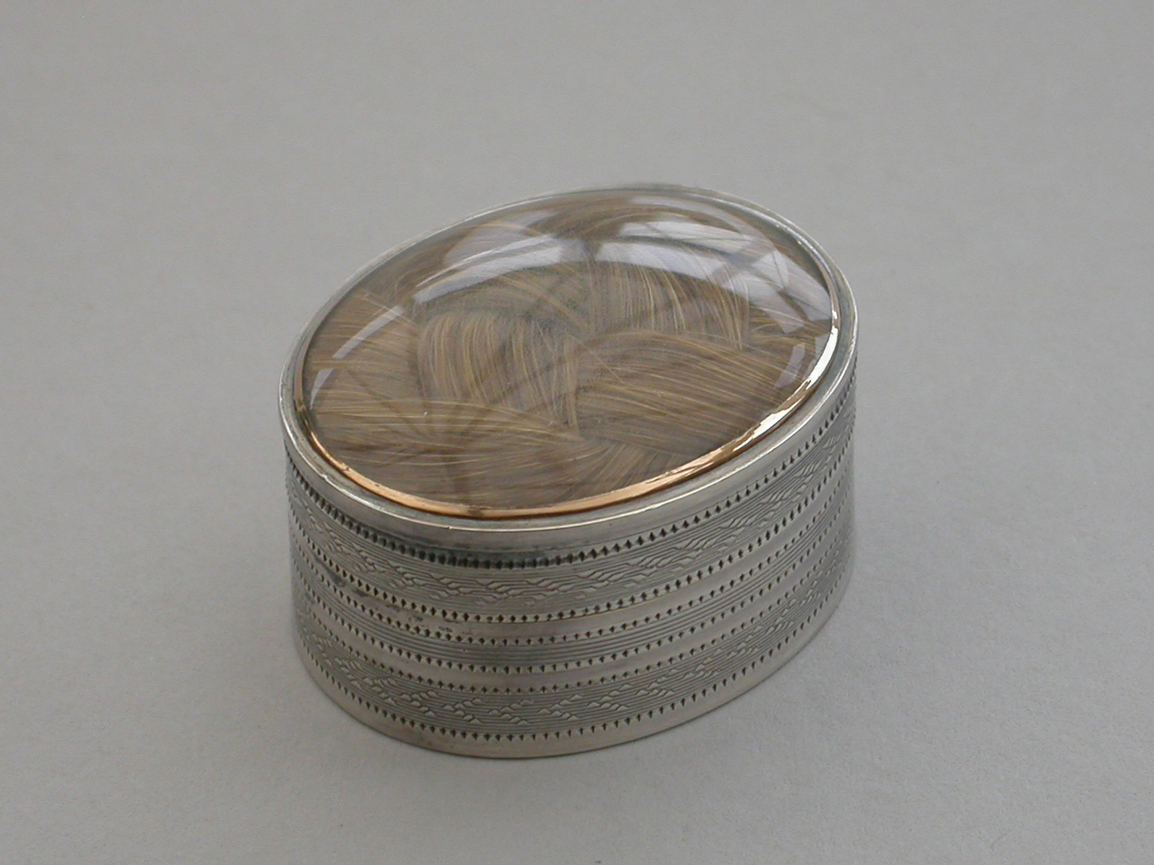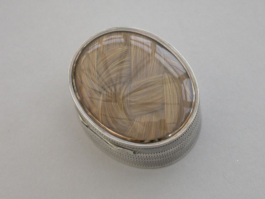 A fine quality George III deep oval silver 'Keepsake' Vinaigrette, the lid with plaited hair in inset gold framed glazed panel, the sides and base engine turned. The silver gilt grille with plain pierced holes.
