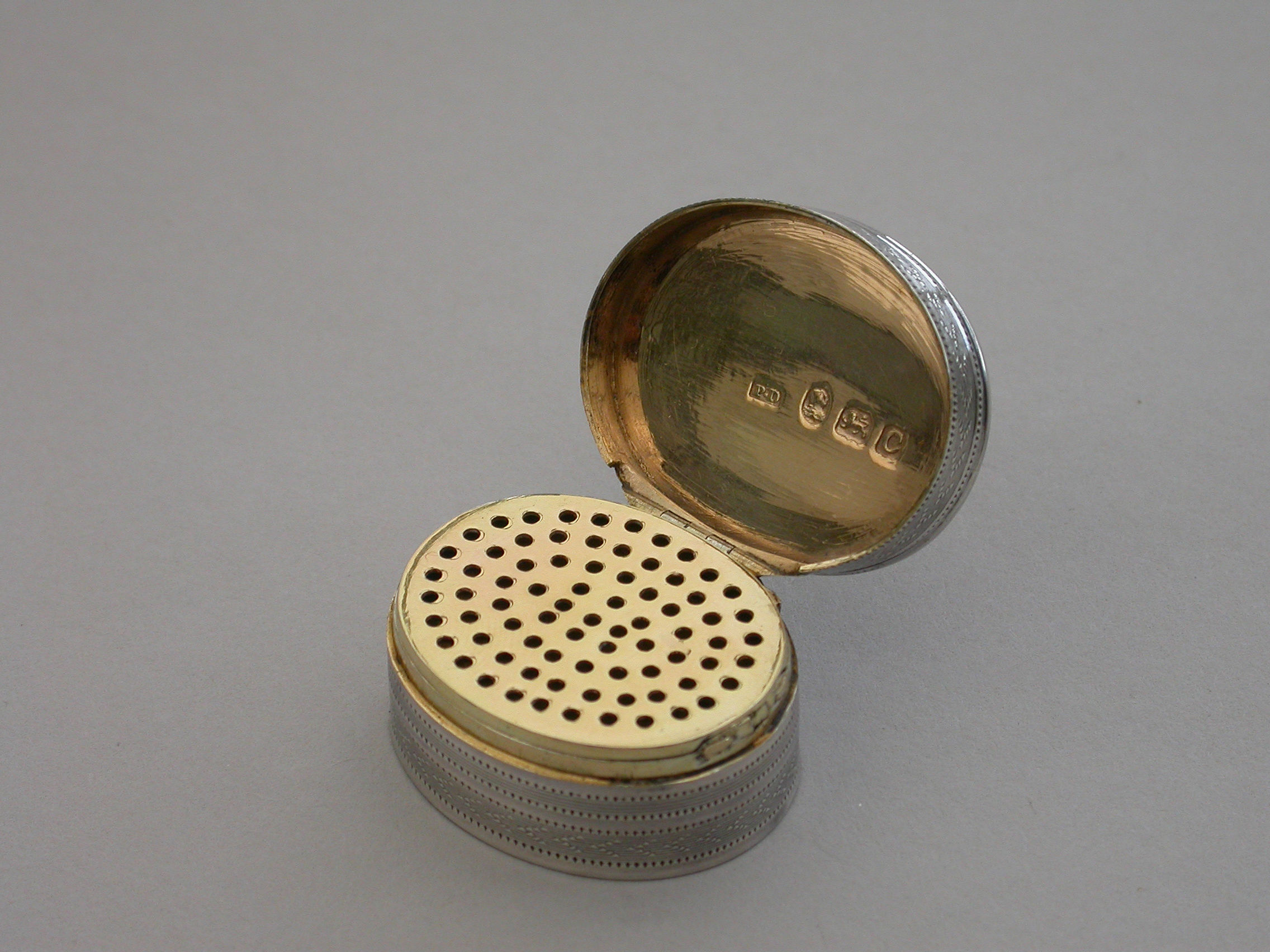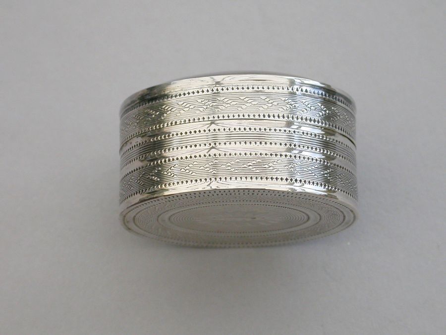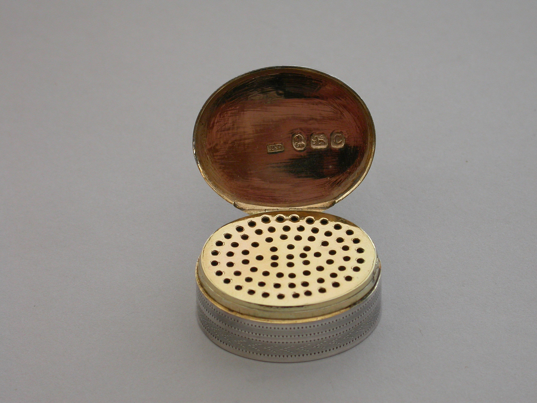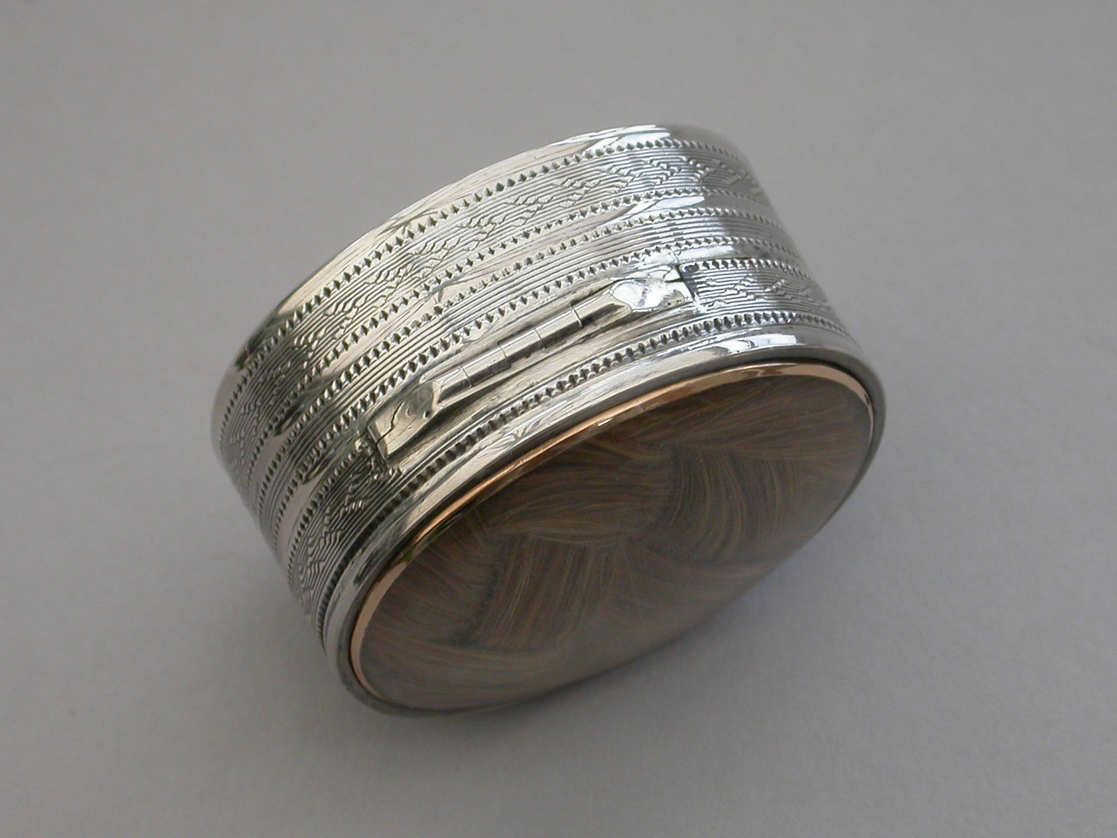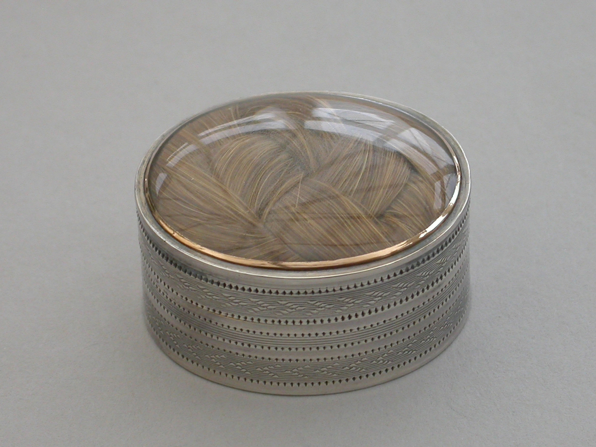 A fine quality George III deep oval silver 'Keepsake' Vinaigrette, the lid with plaited hair in inset gold framed glazed panel, the sides and base engine turned. The silver gilt grille with plain pierced holes.