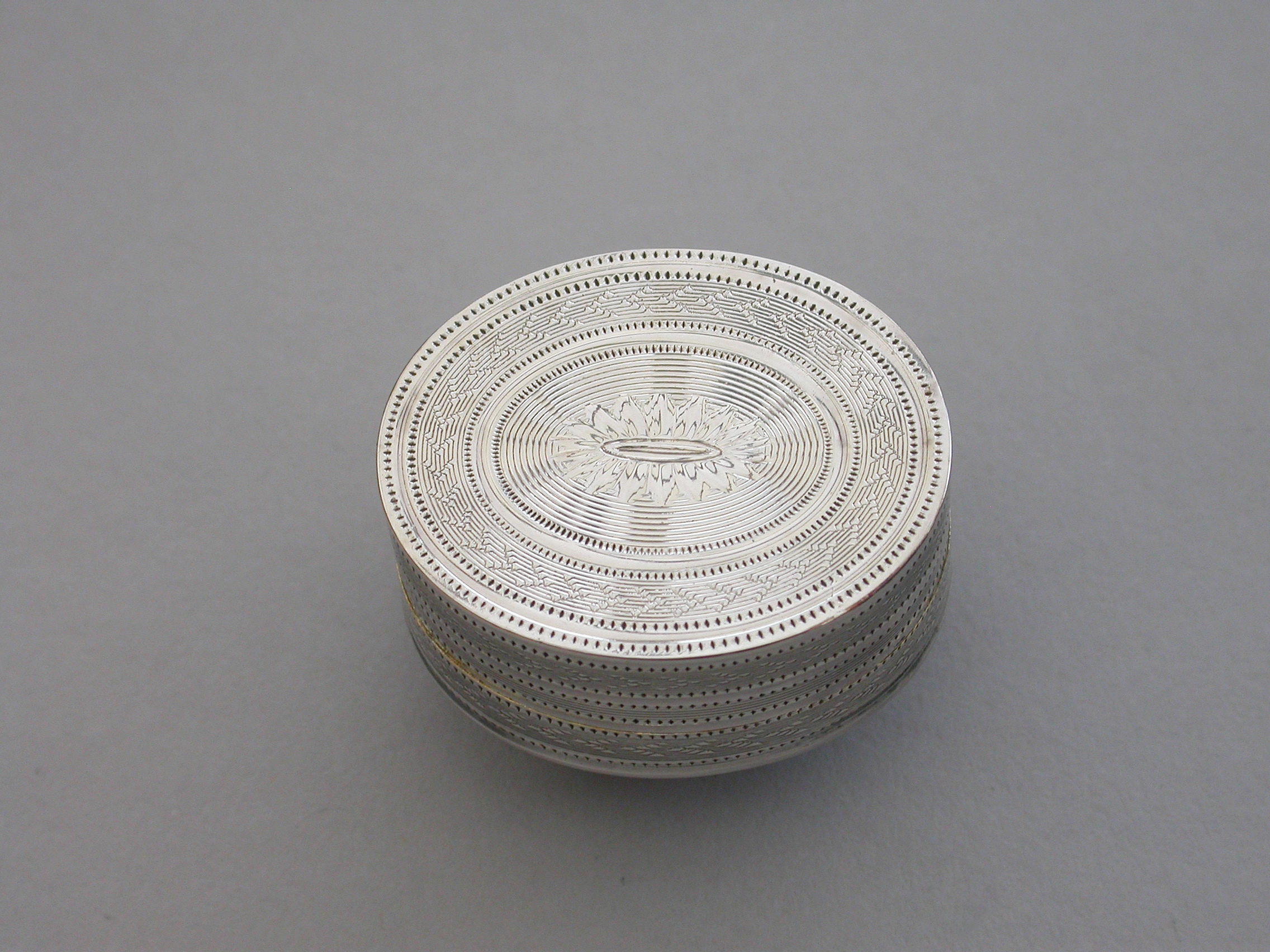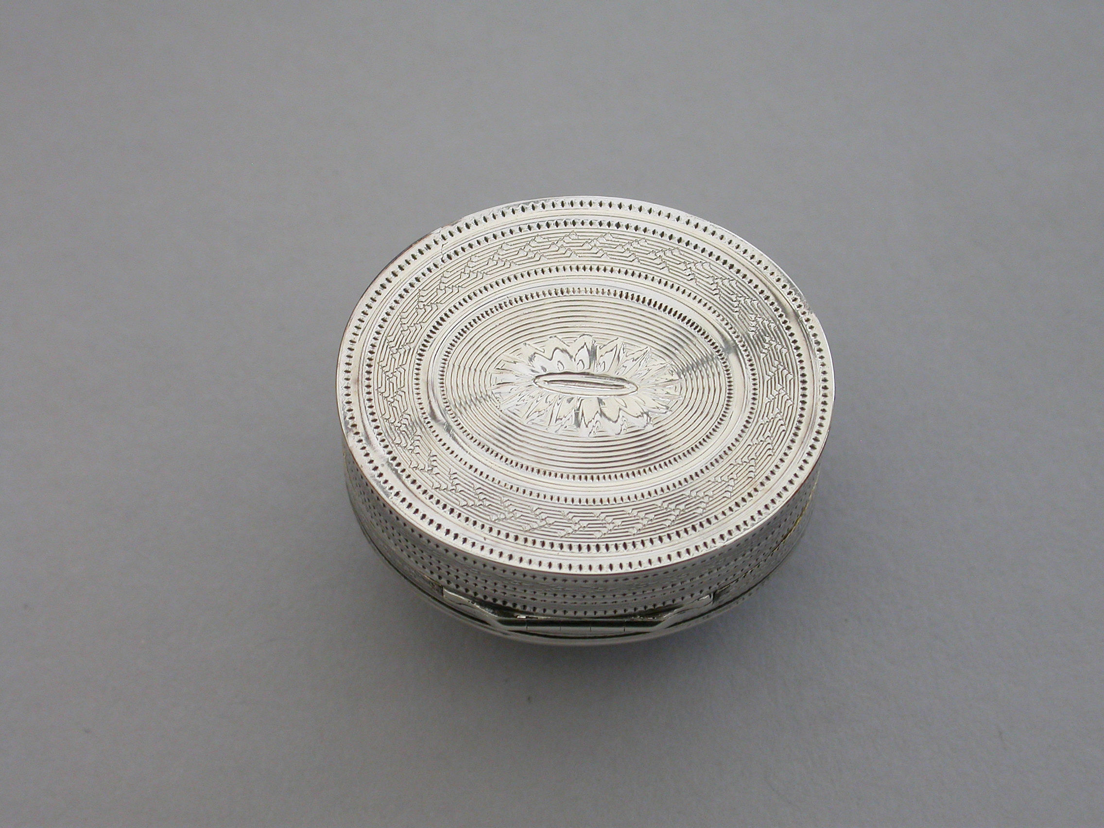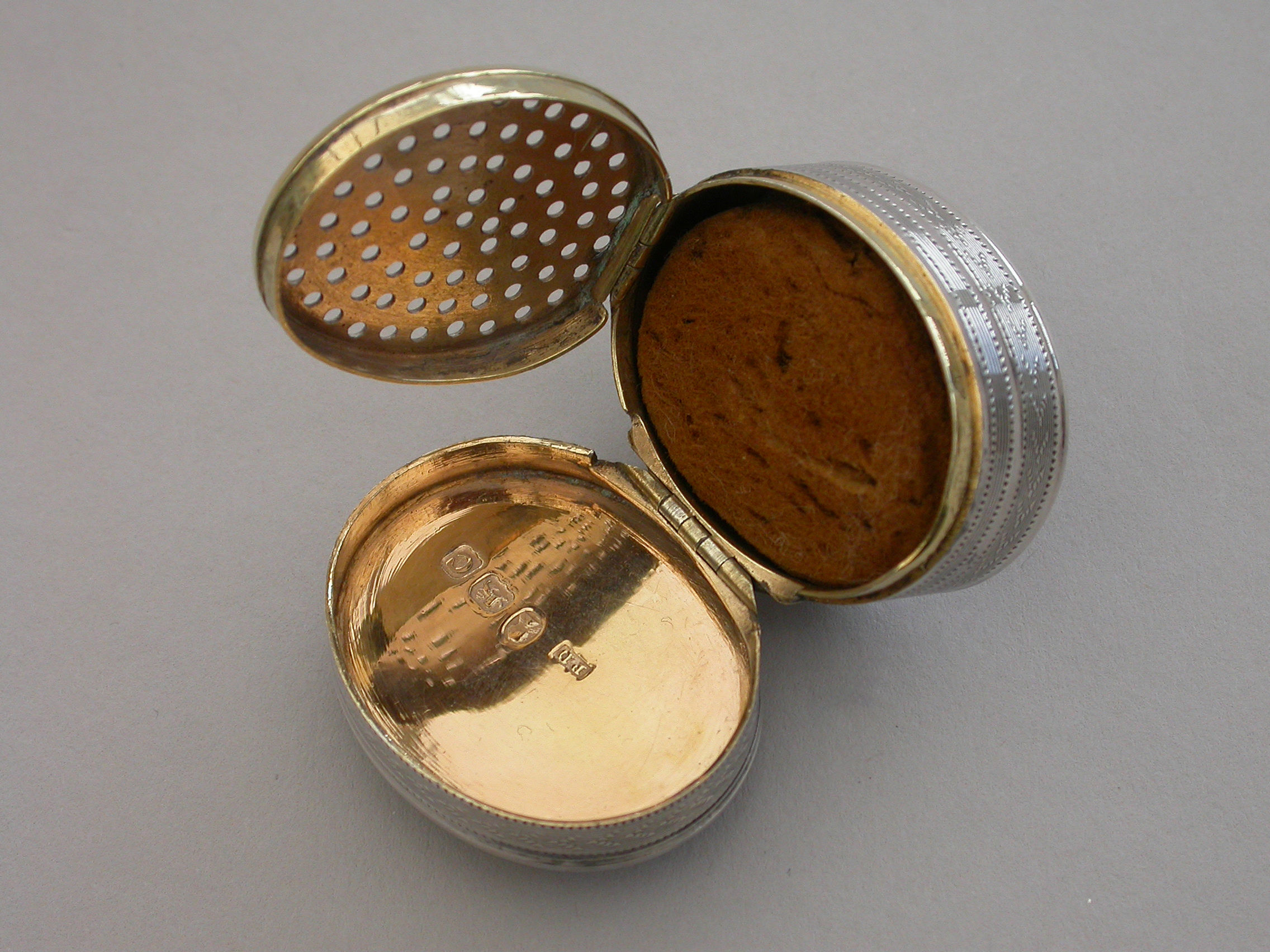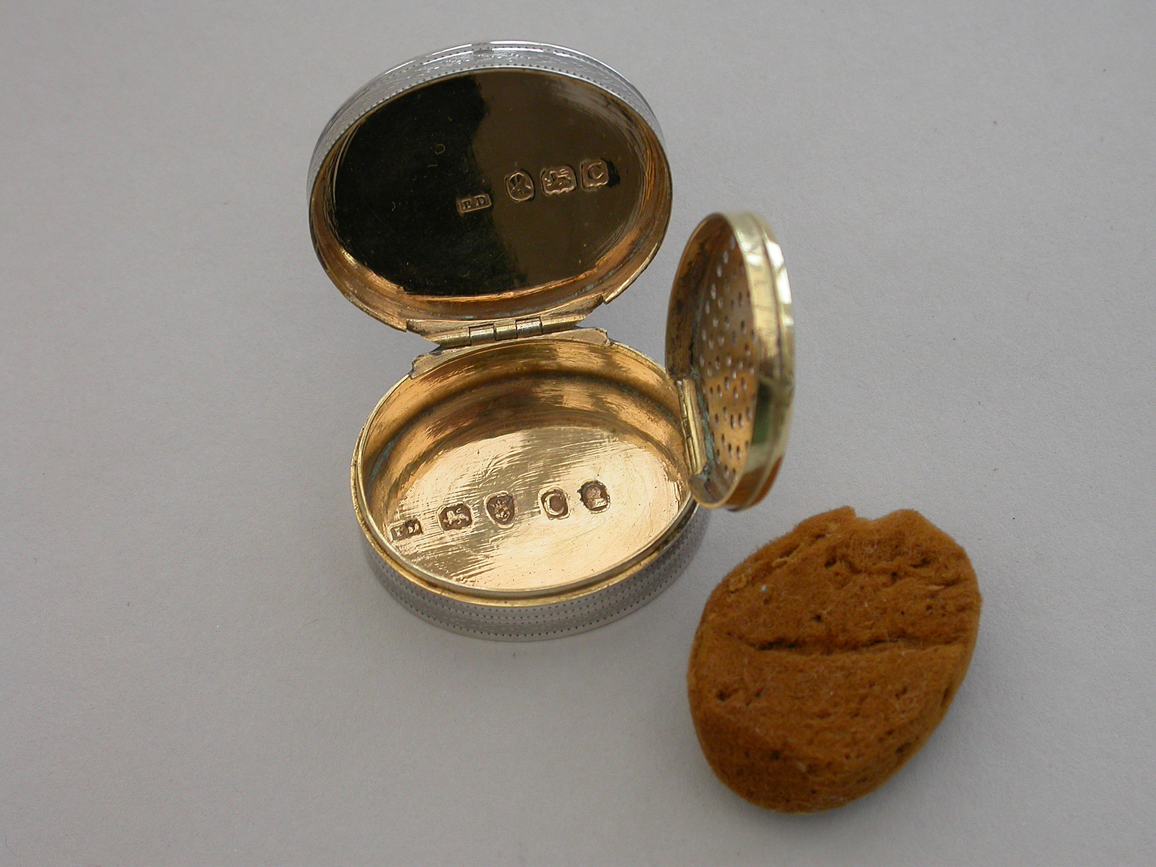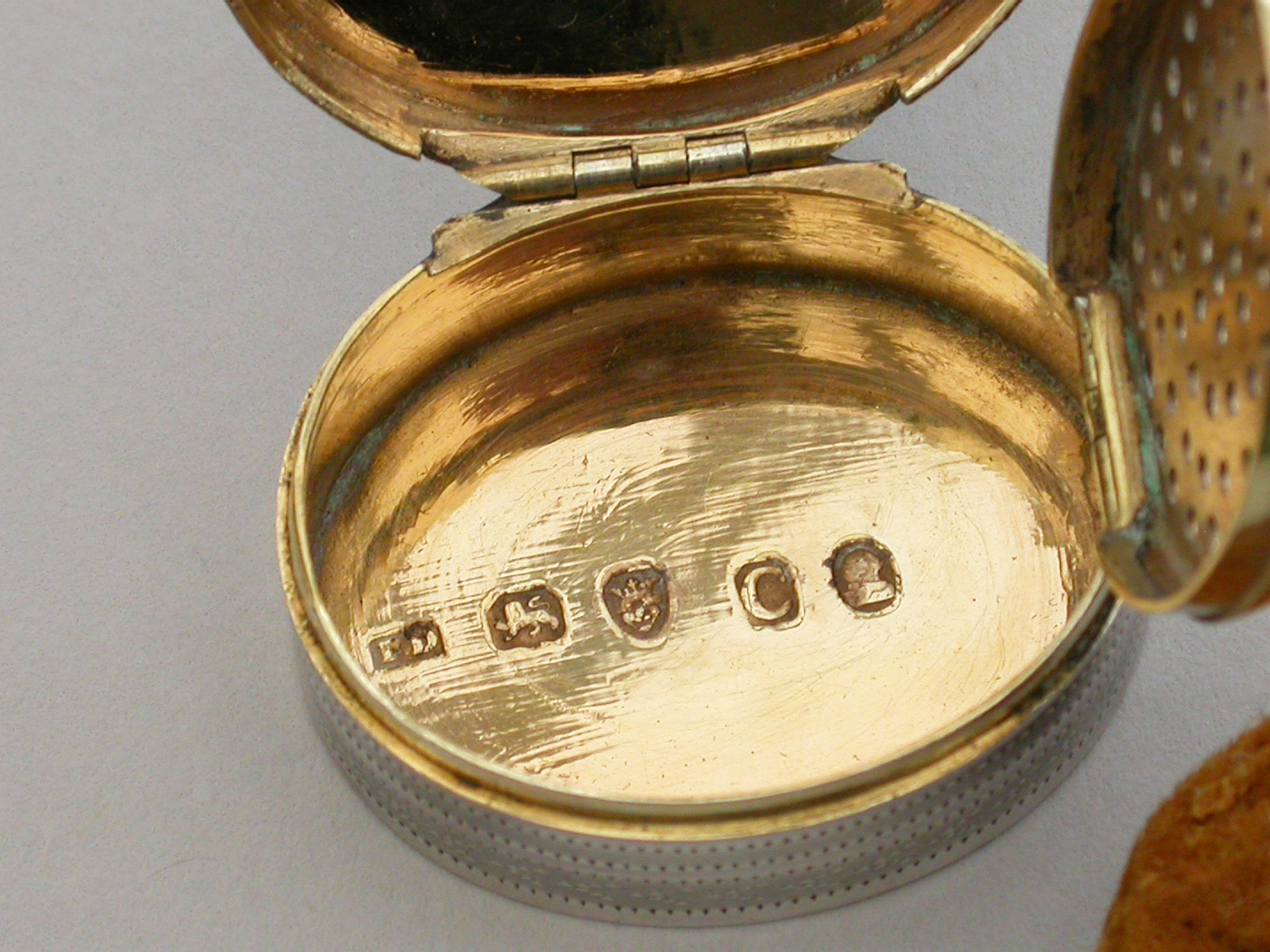 A fine quality George III deep oval silver 'Keepsake' Vinaigrette, the lid with plaited hair in inset gold framed glazed panel, the sides and base engine turned. The silver gilt grille with plain pierced holes.